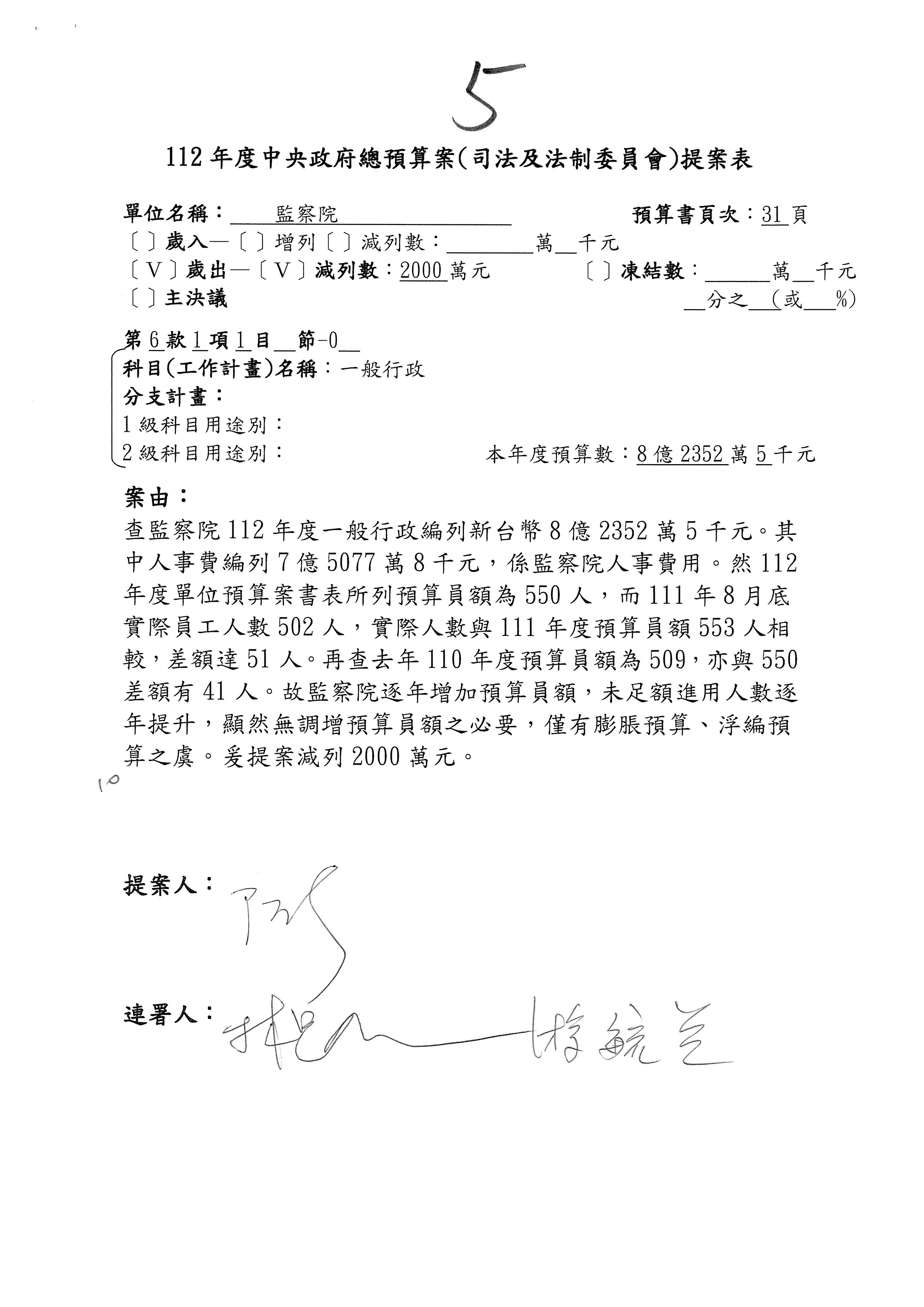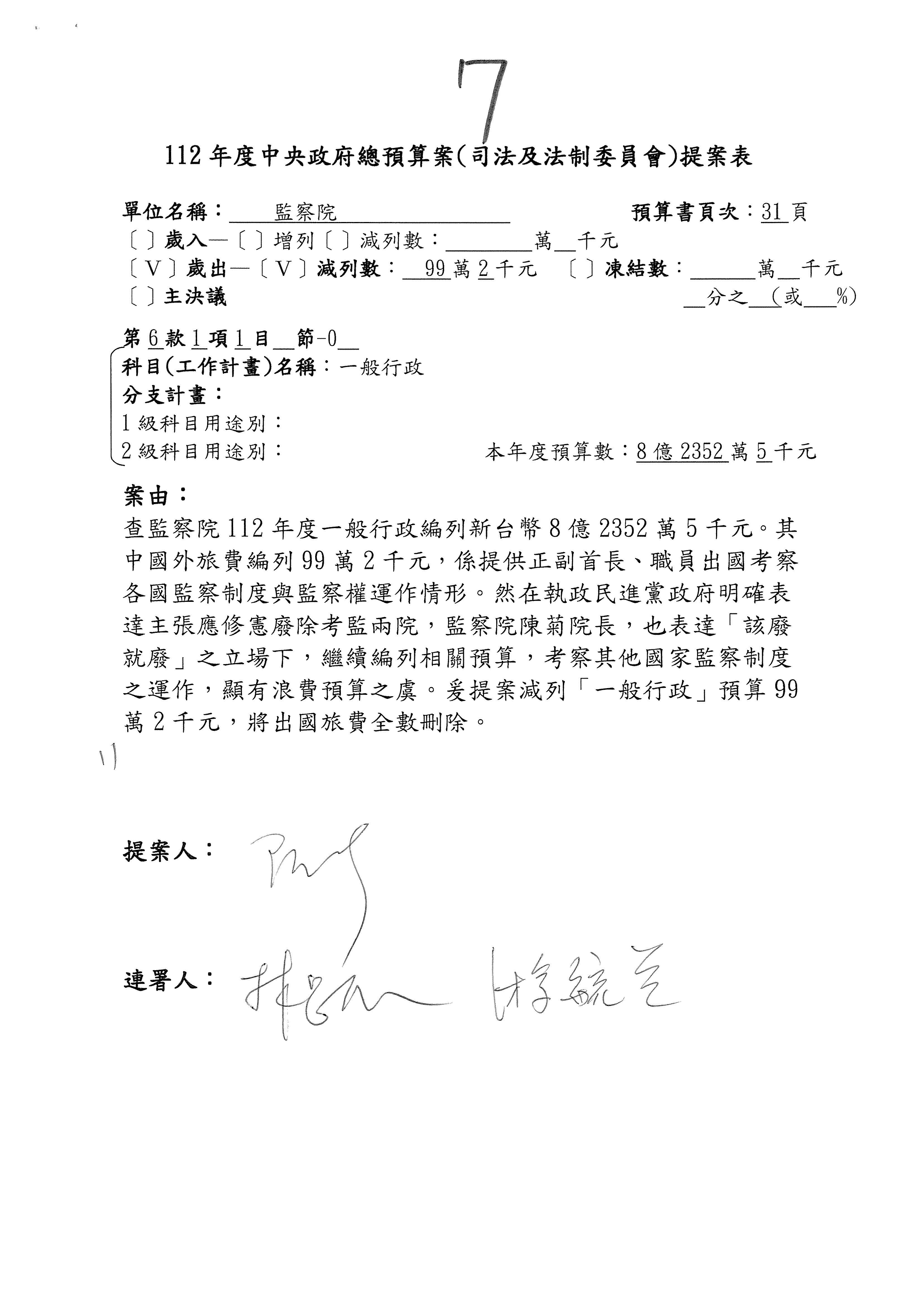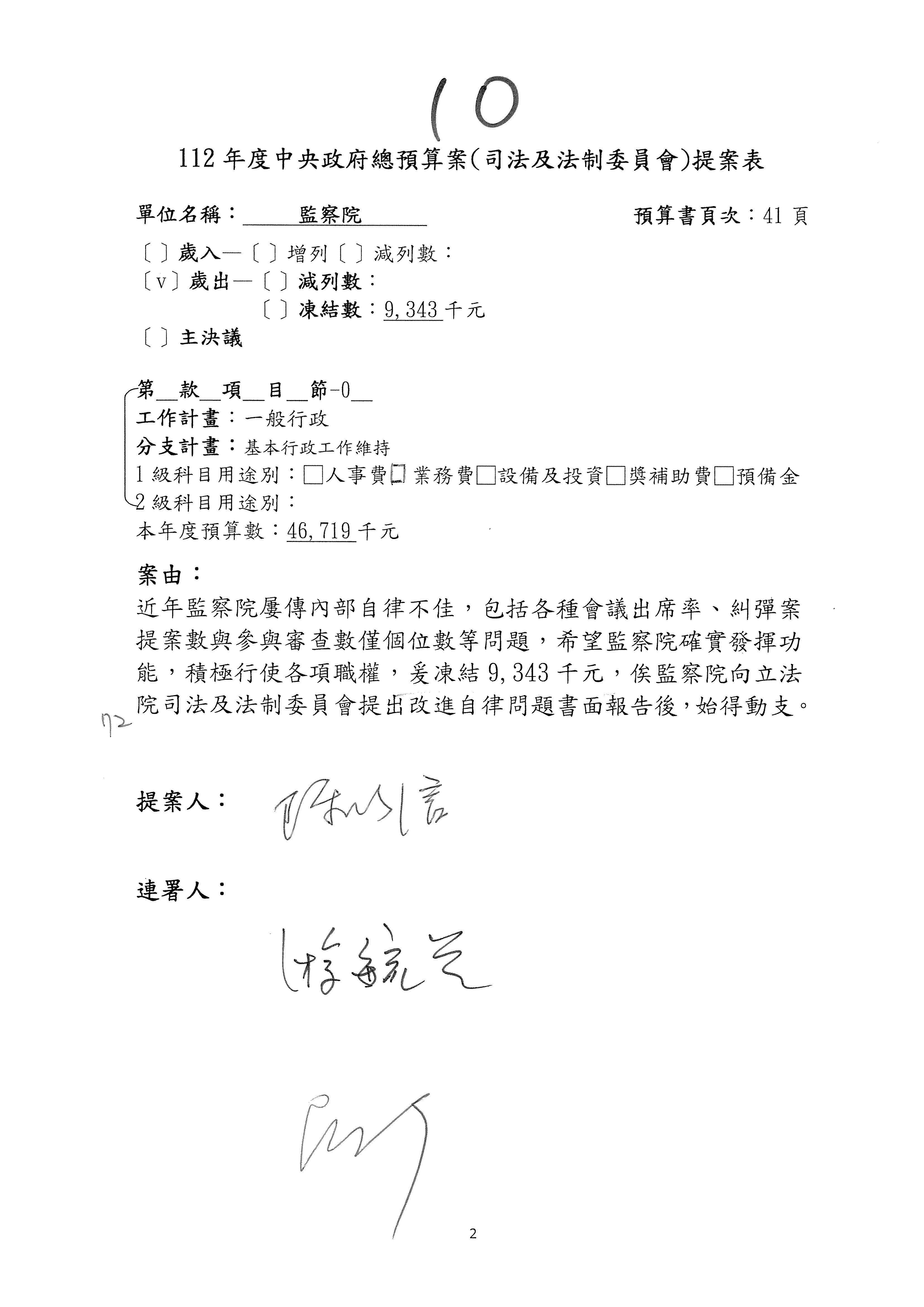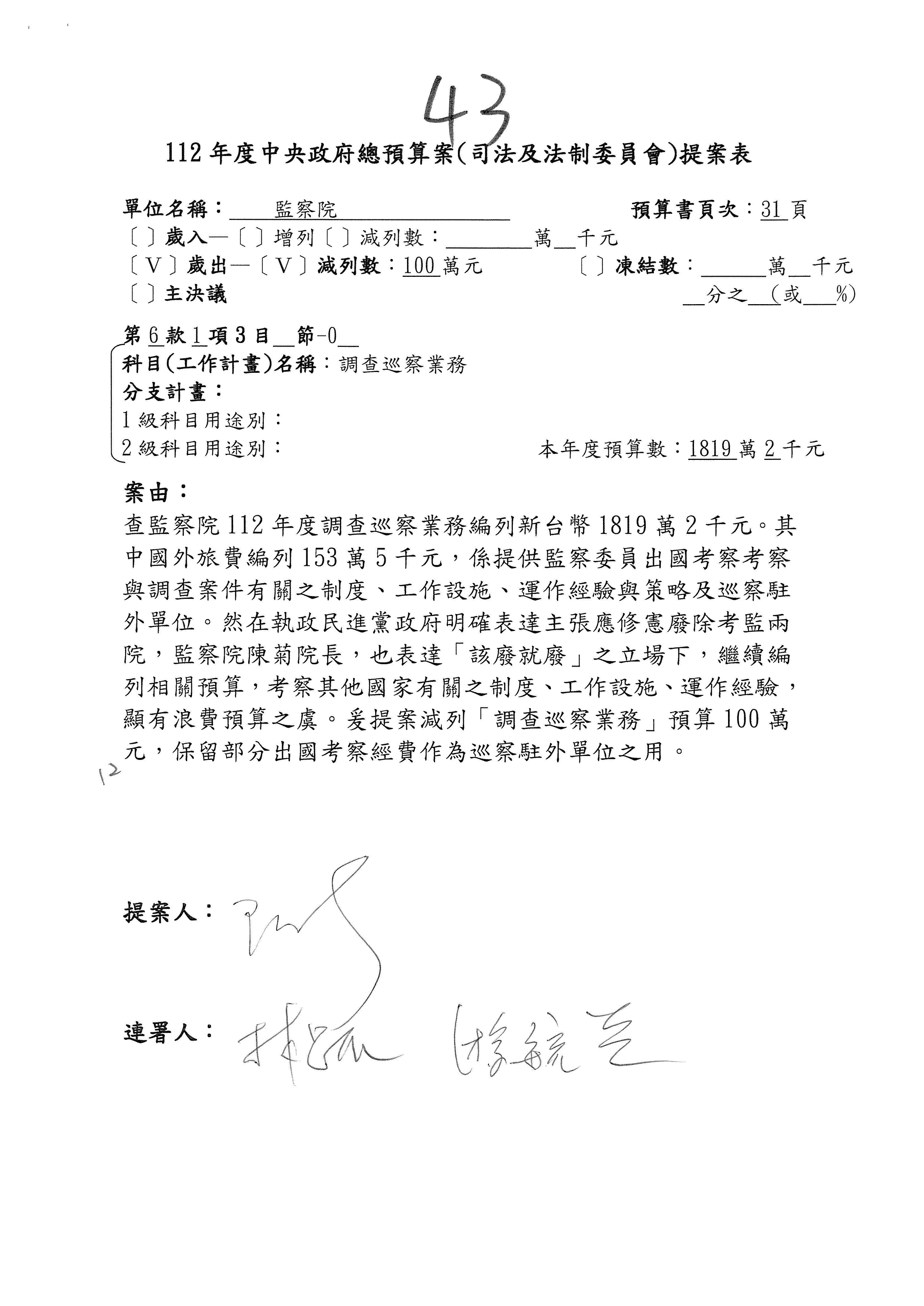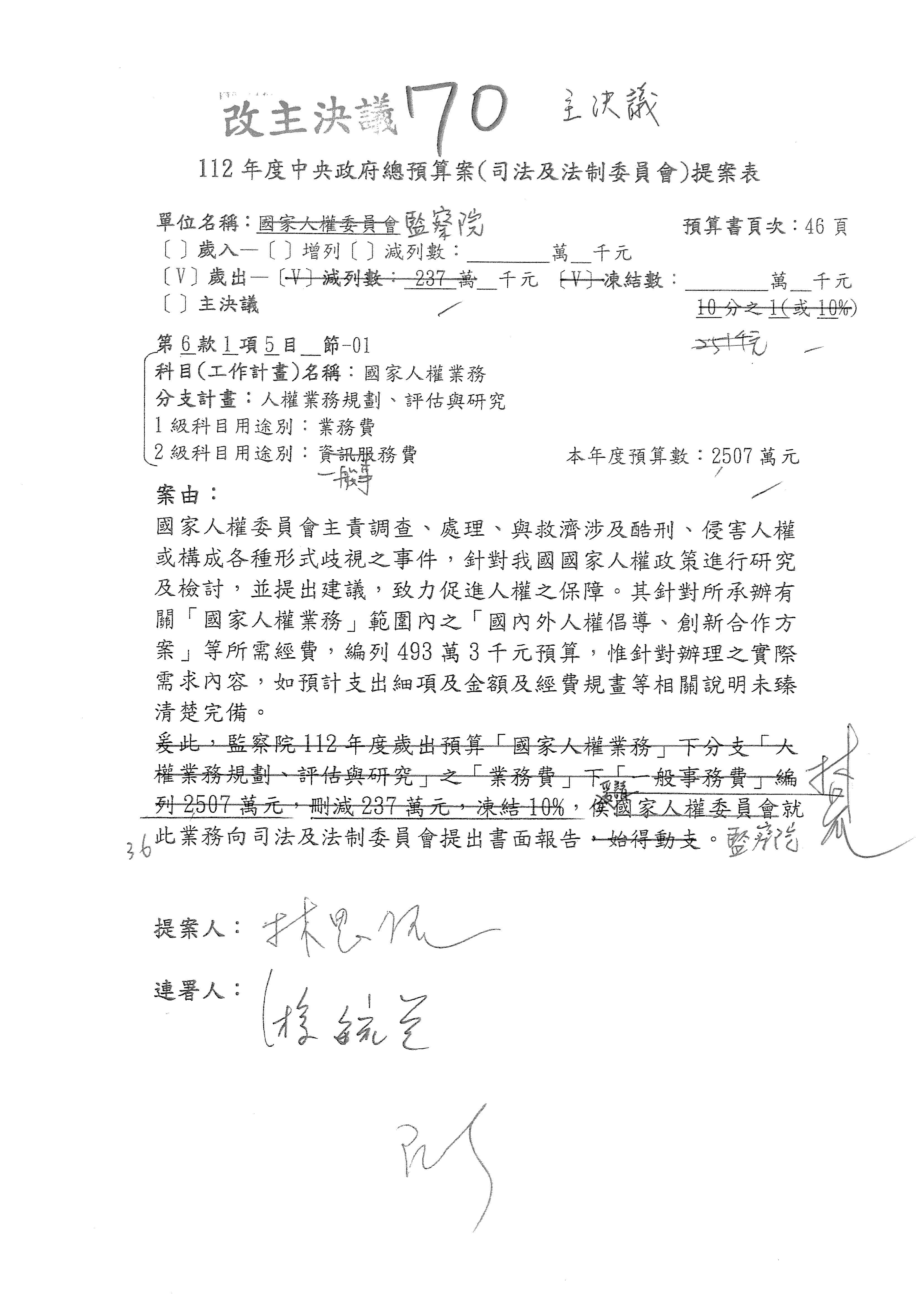 現在處理討論事項第一案─繼續審查112年度中央政府總預算案關於監察院主管收支部分,在處理之前,請議事人員一併宣讀討論事項第一案預算案之全部預算數及委員提案,請宣讀。