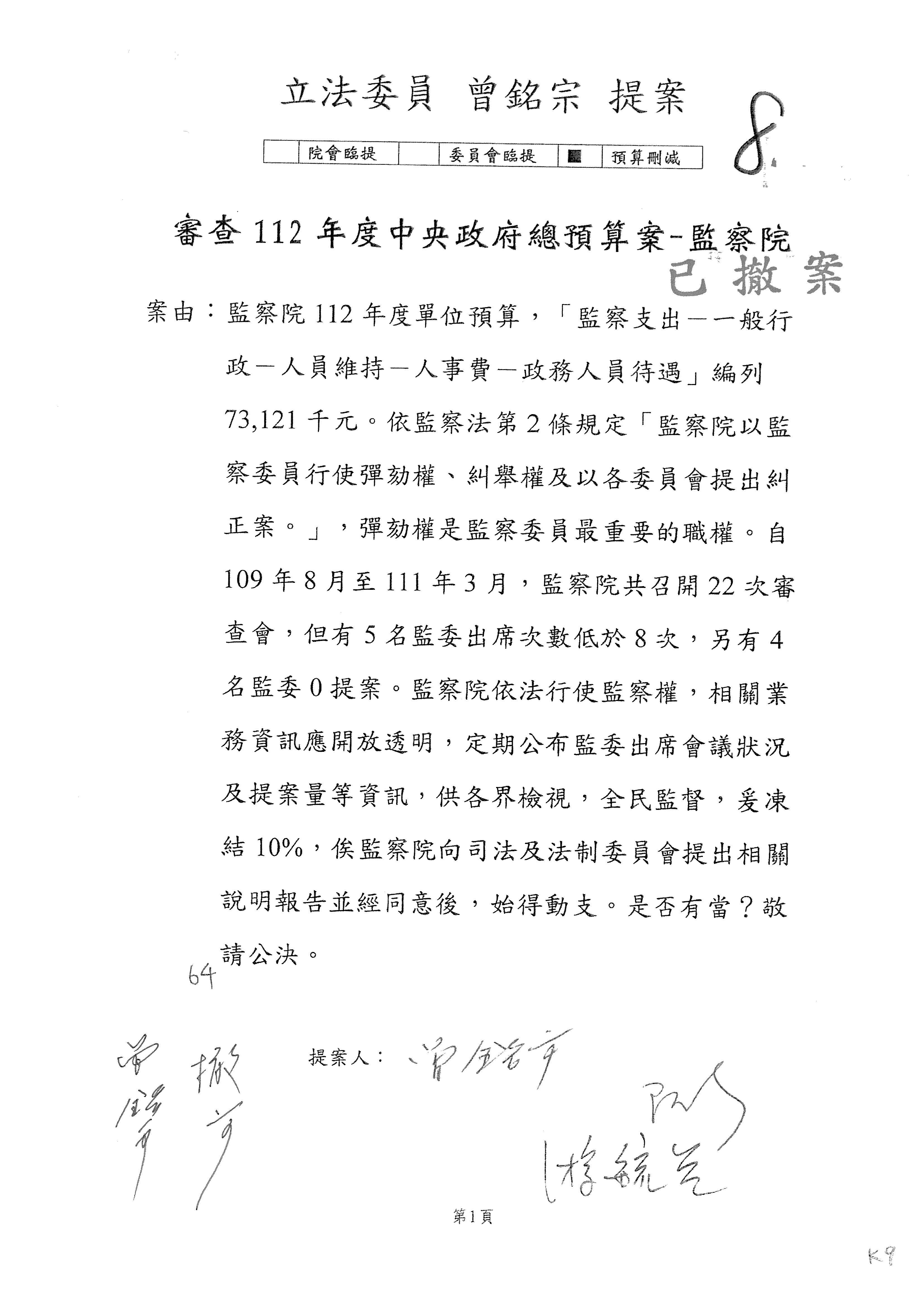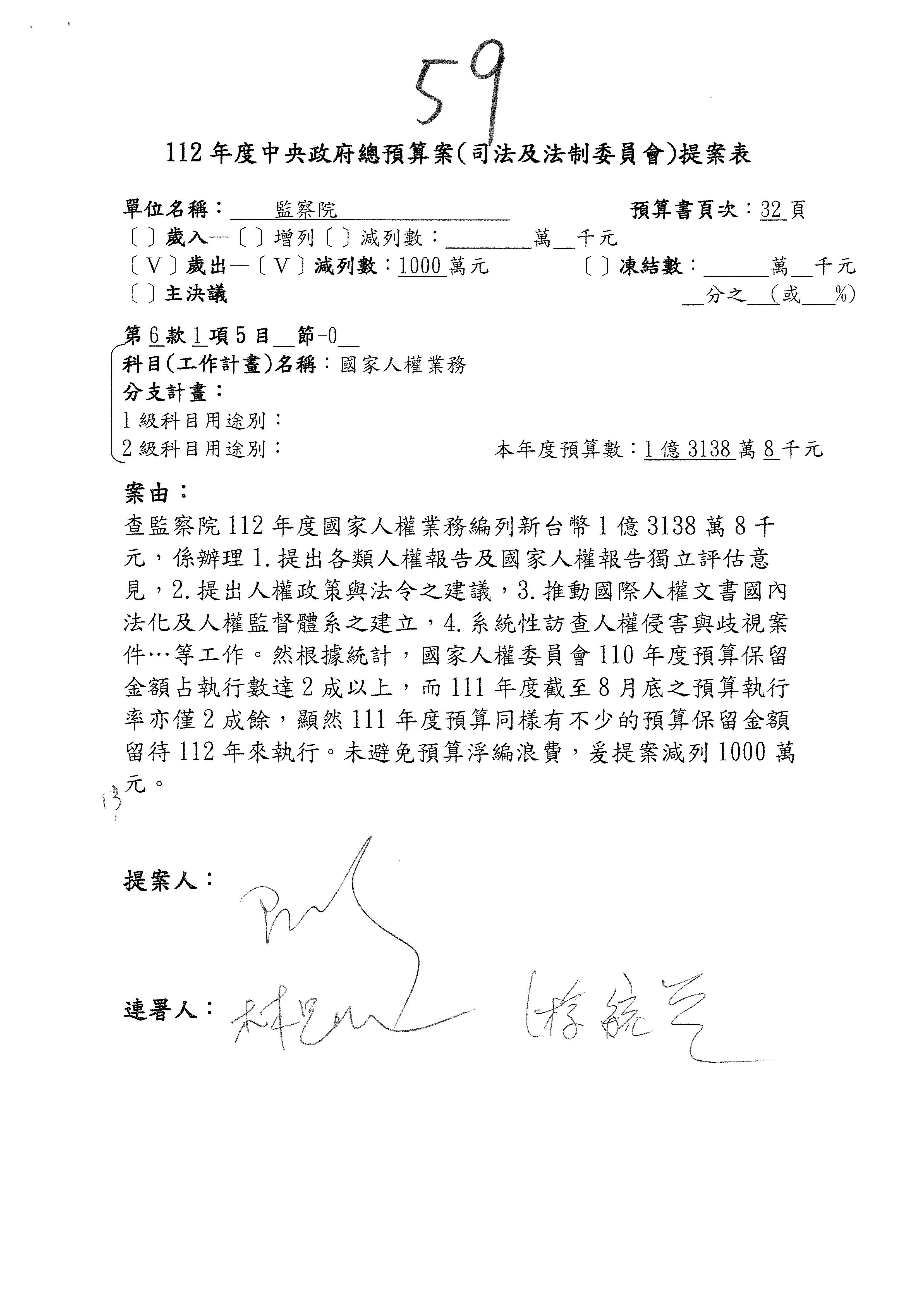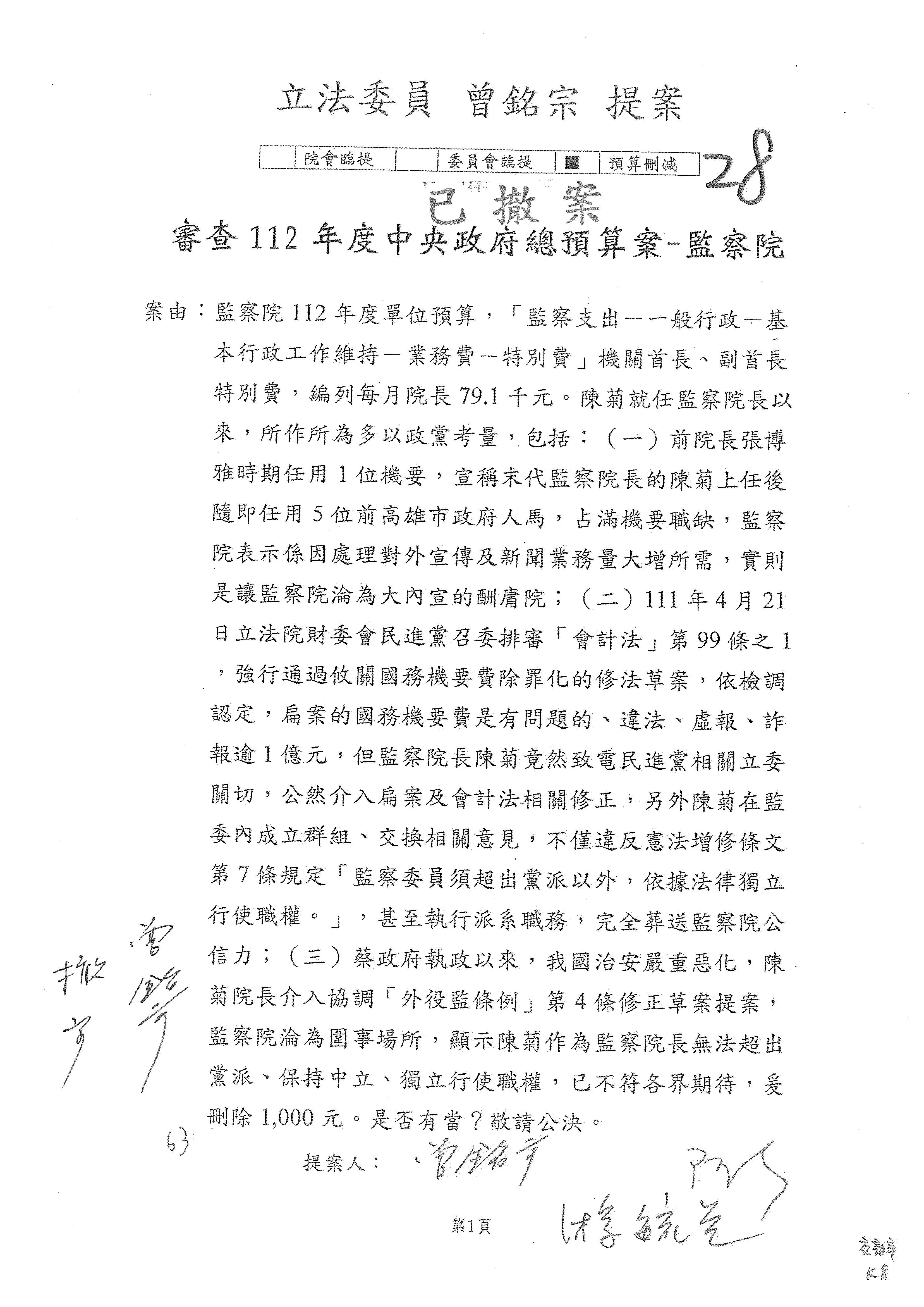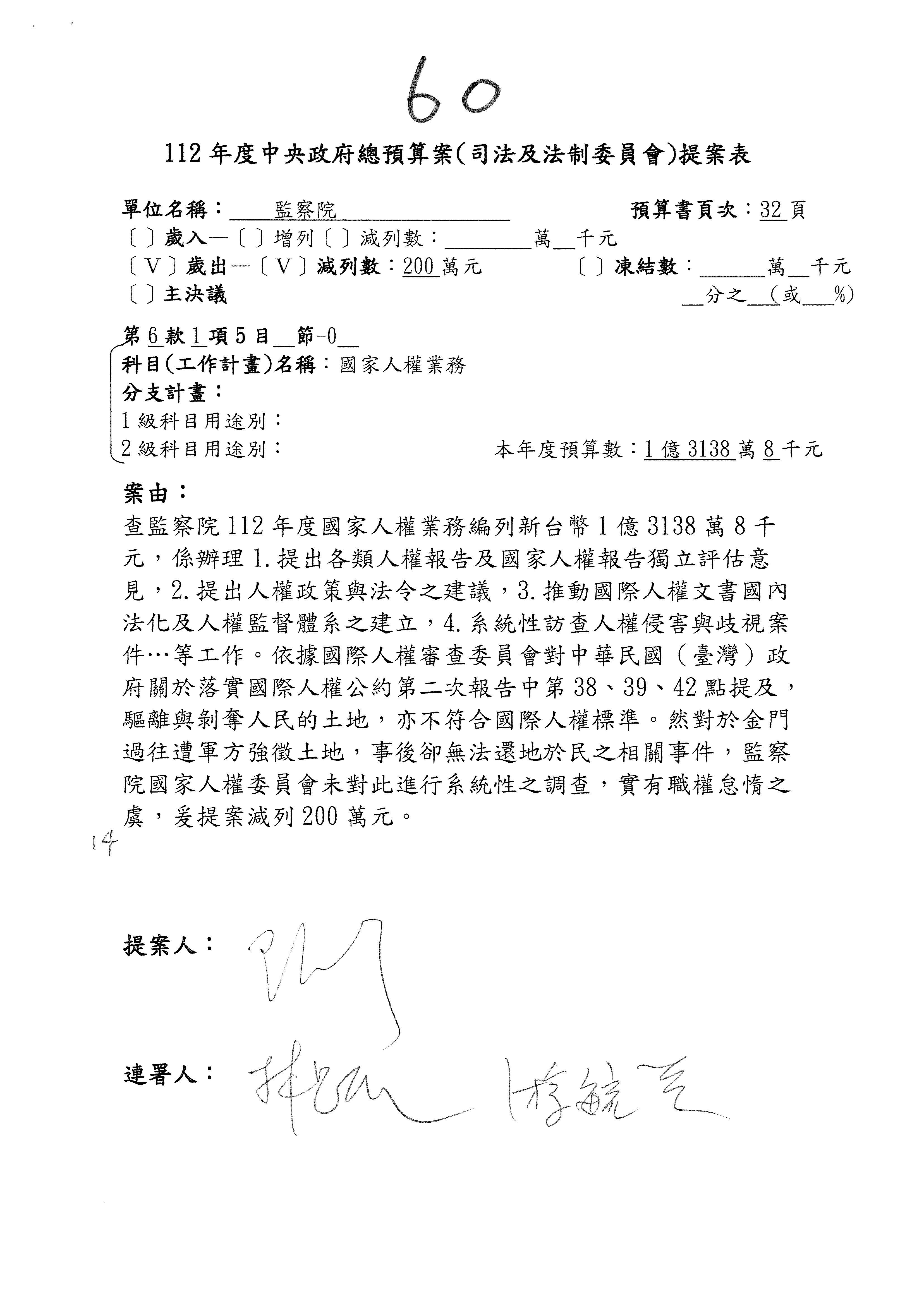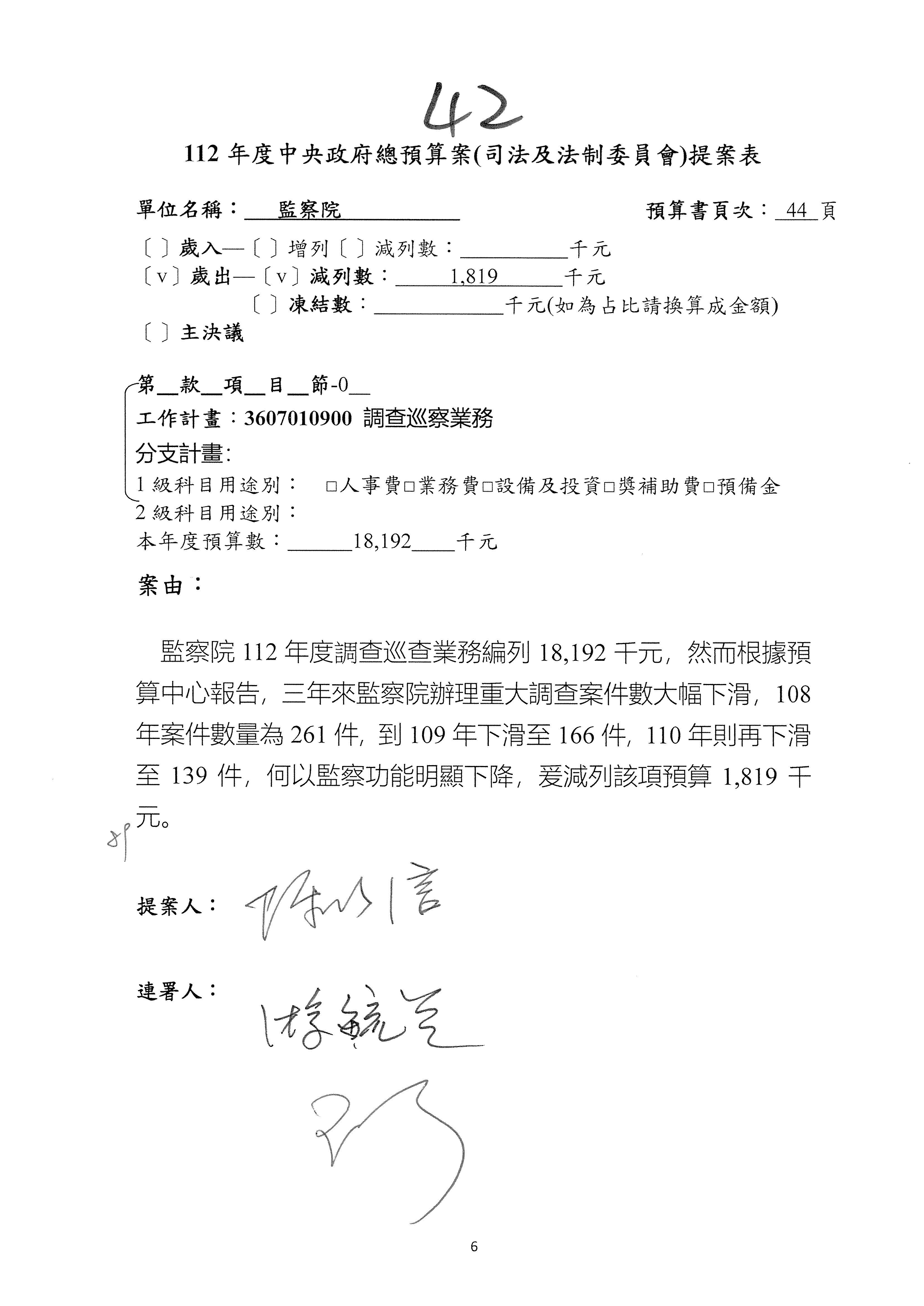 現在處理討論事項第一案─繼續審查112年度中央政府總預算案關於監察院主管收支部分,在處理之前,請議事人員一併宣讀討論事項第一案預算案之全部預算數及委員提案,請宣讀。