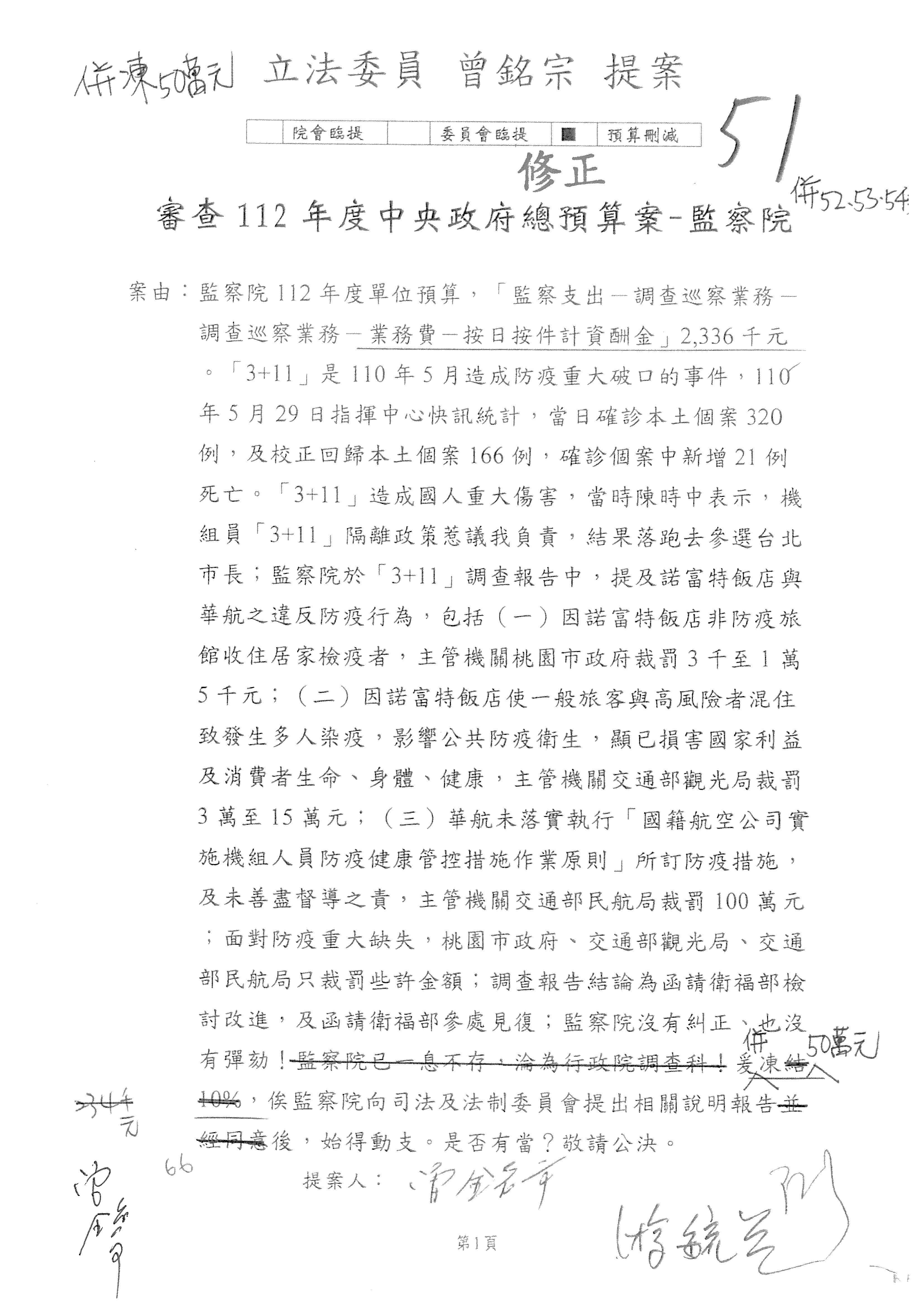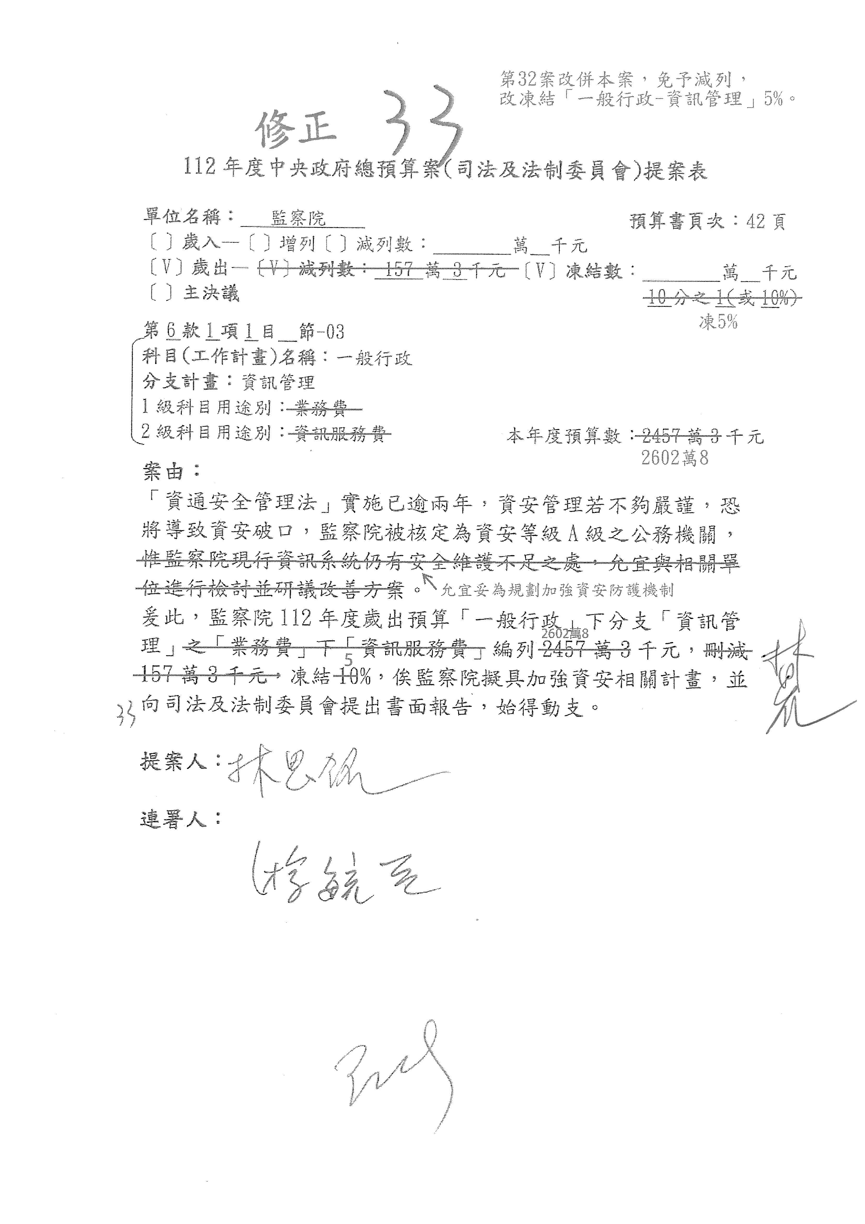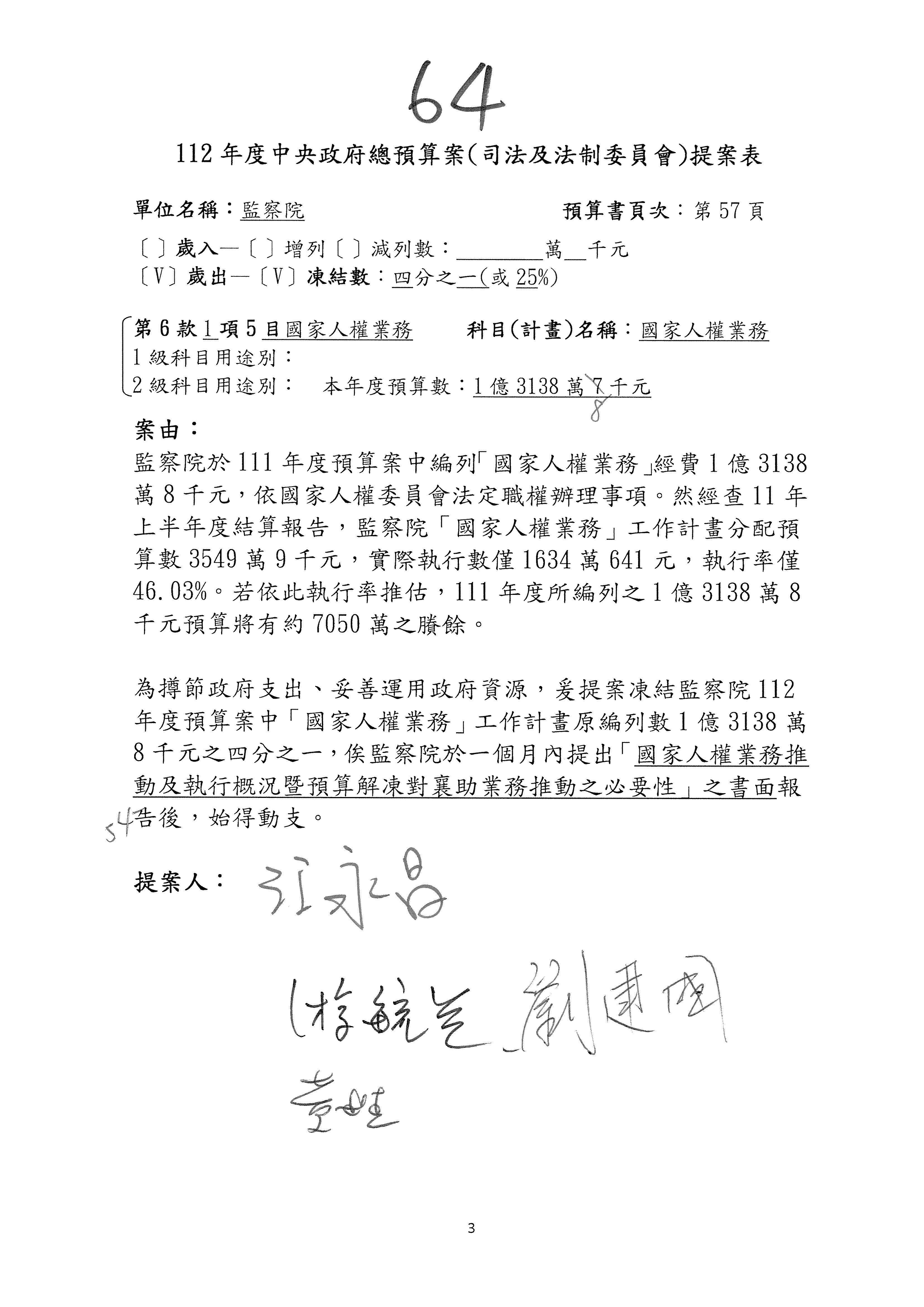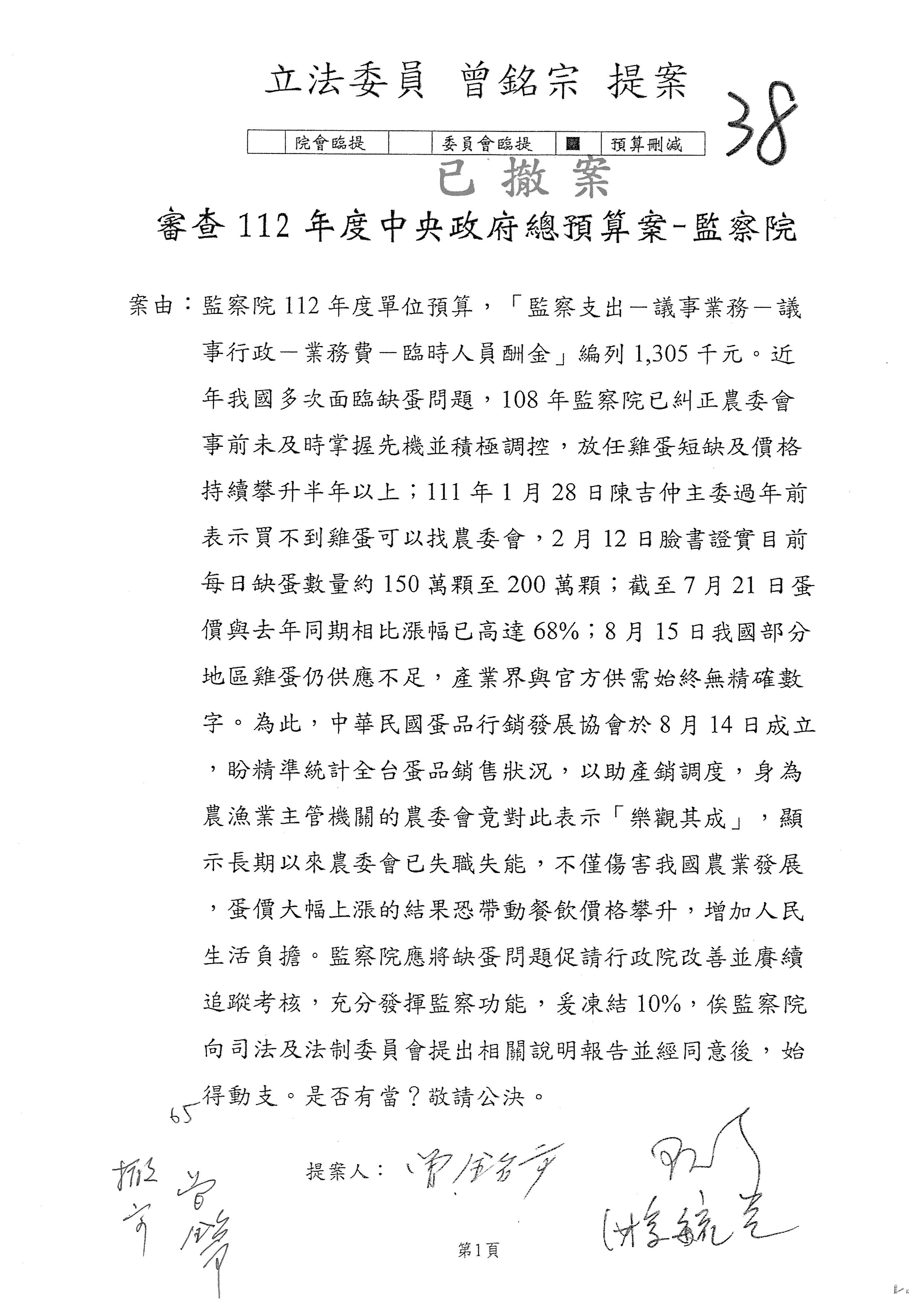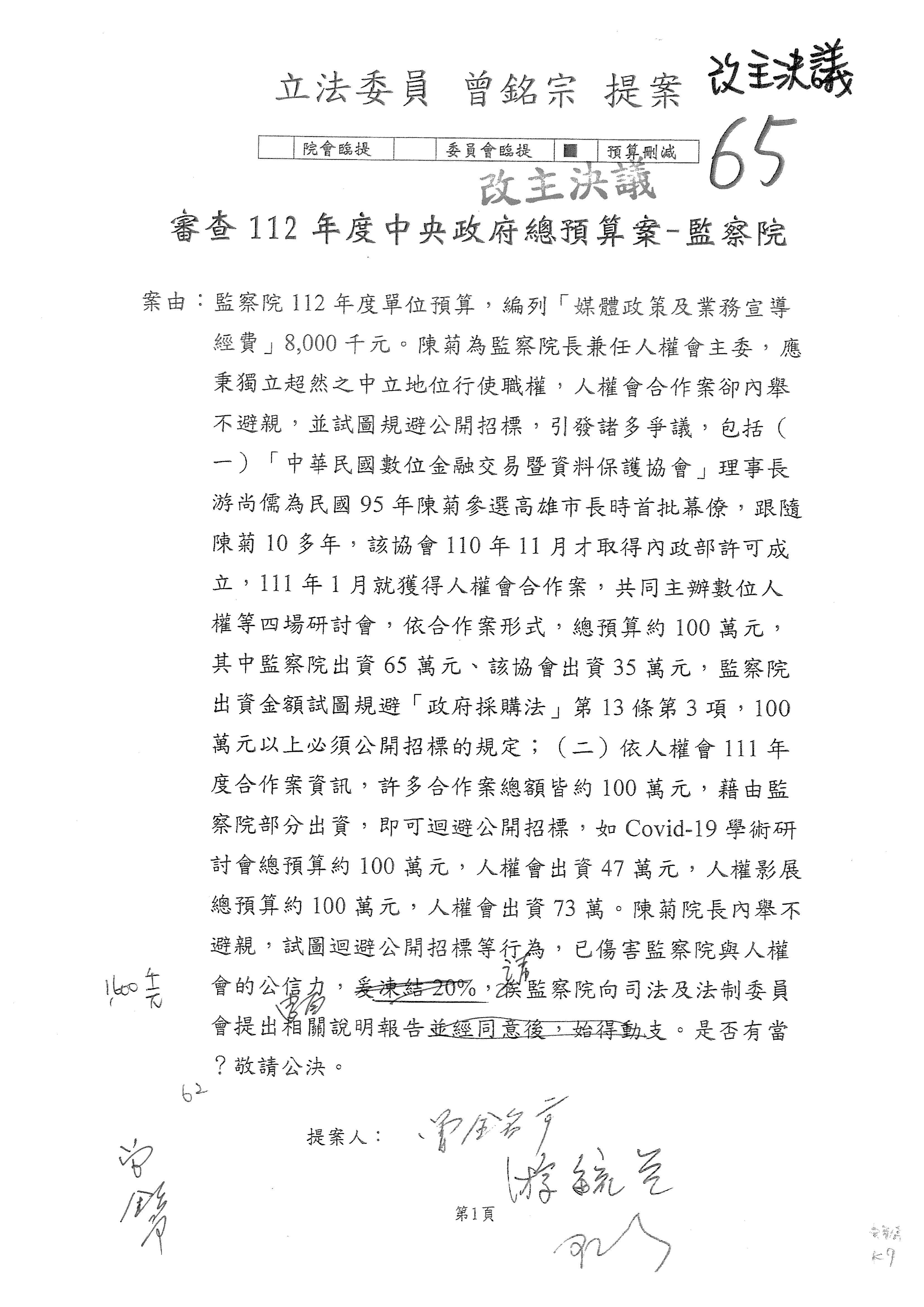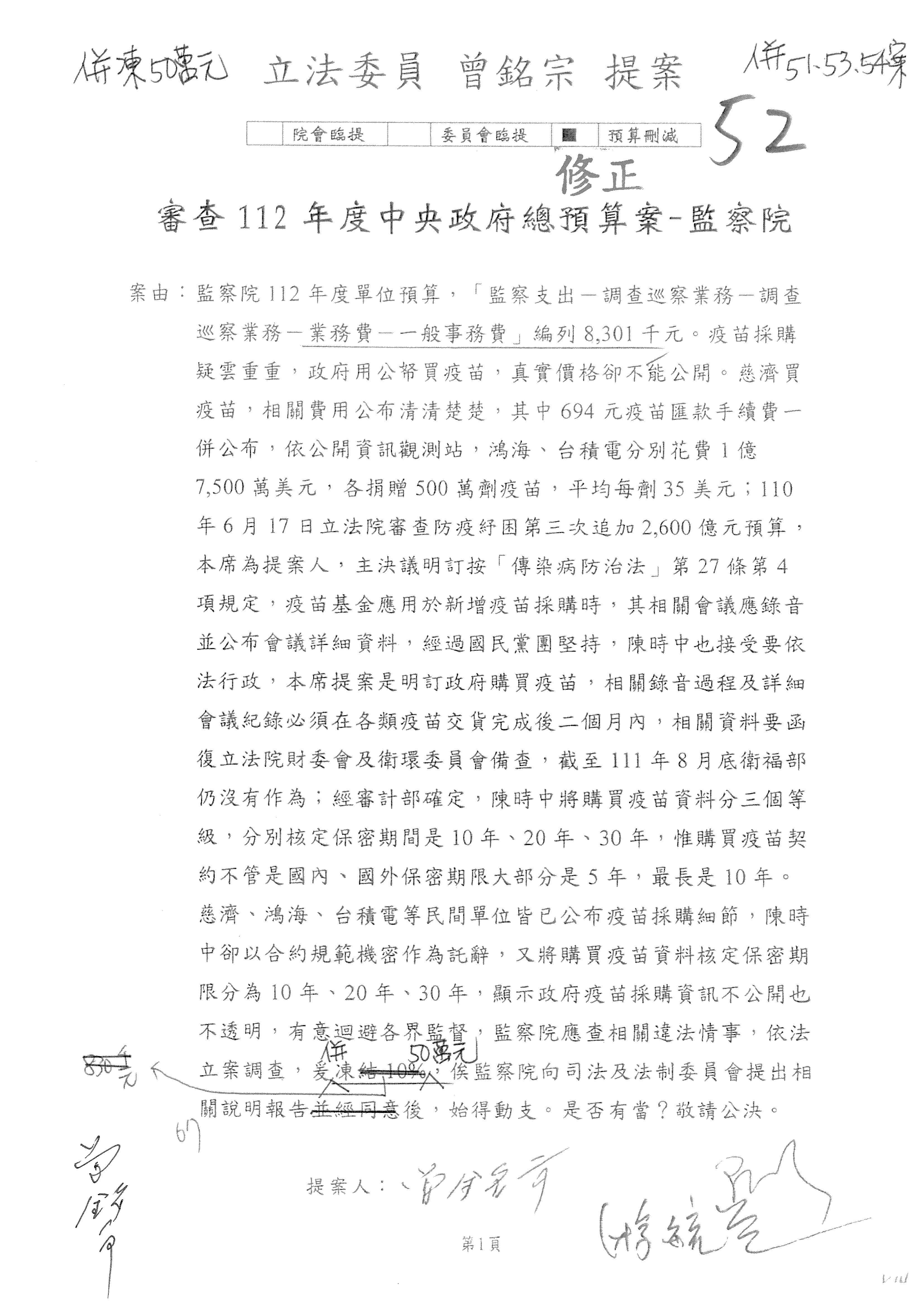 現在處理討論事項第一案─繼續審查112年度中央政府總預算案關於監察院主管收支部分,在處理之前,請議事人員一併宣讀討論事項第一案預算案之全部預算數及委員提案,請宣讀。