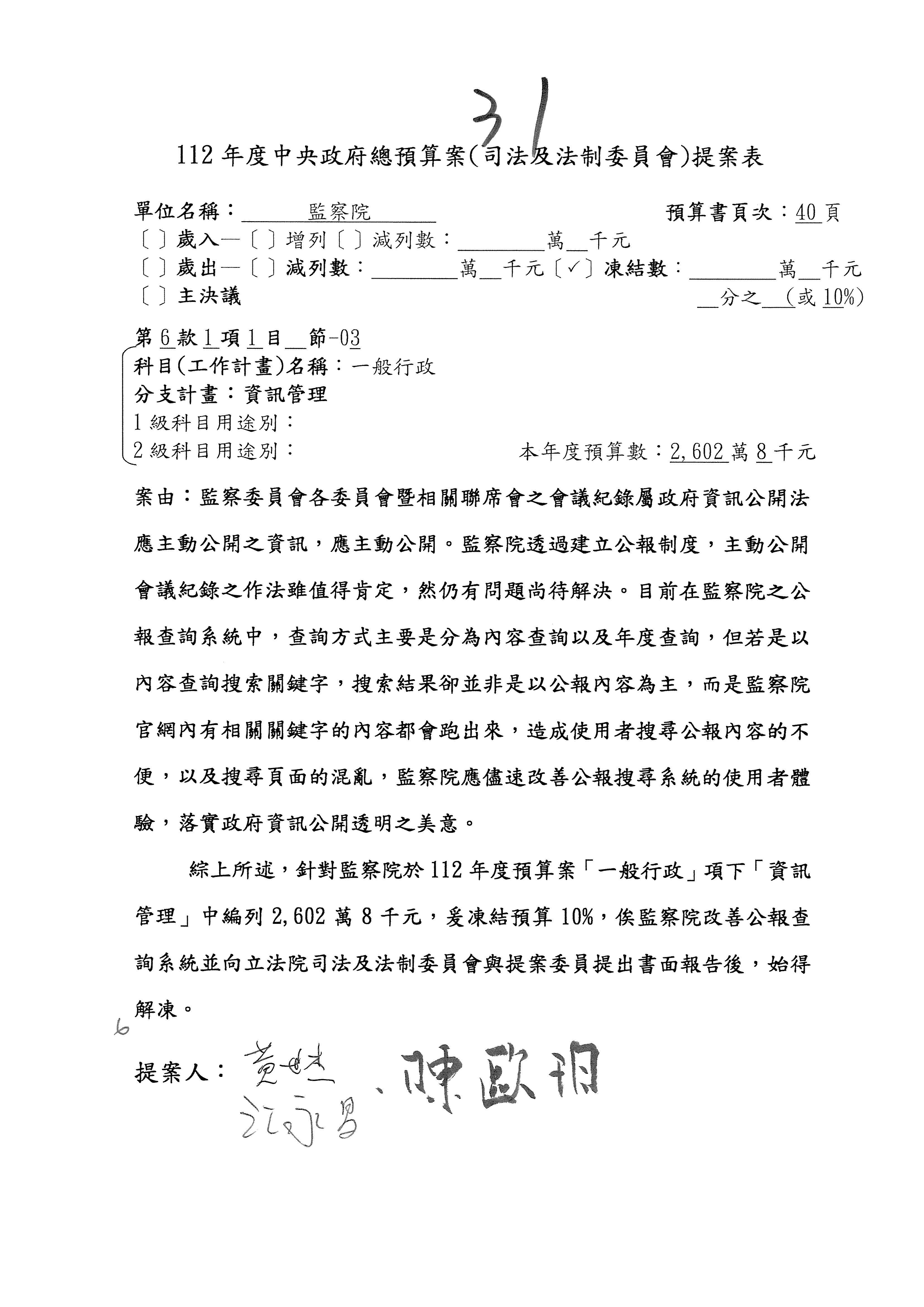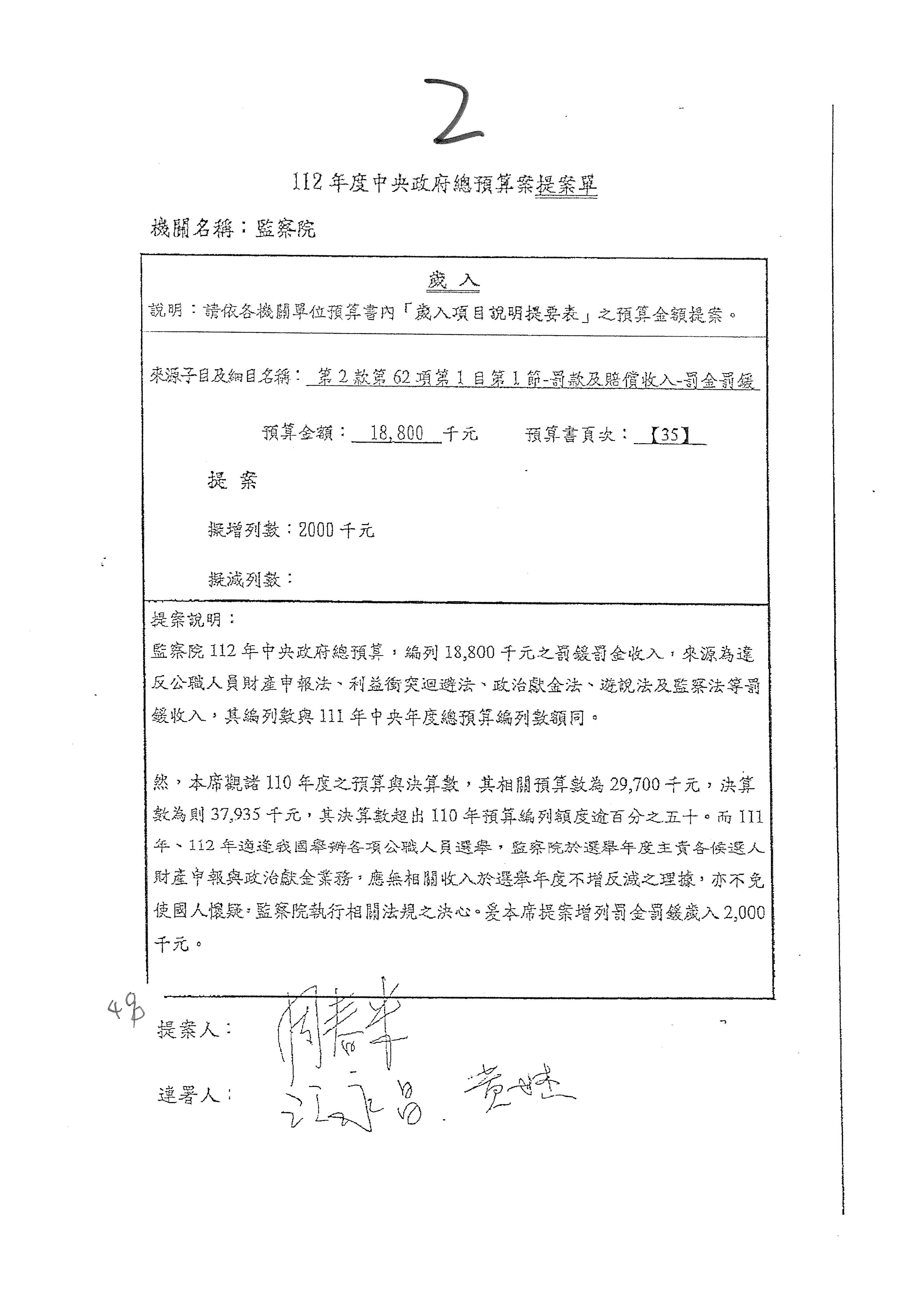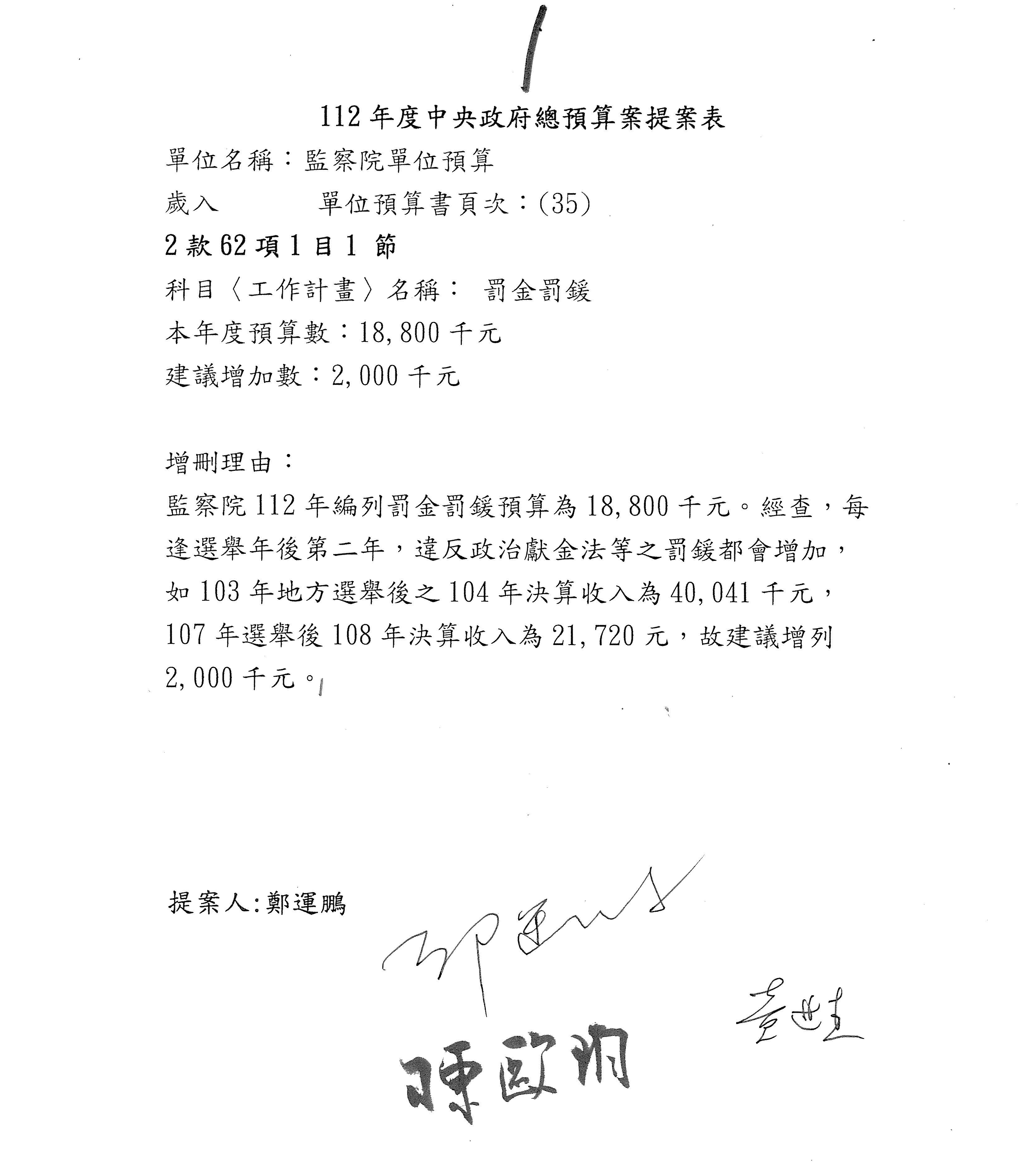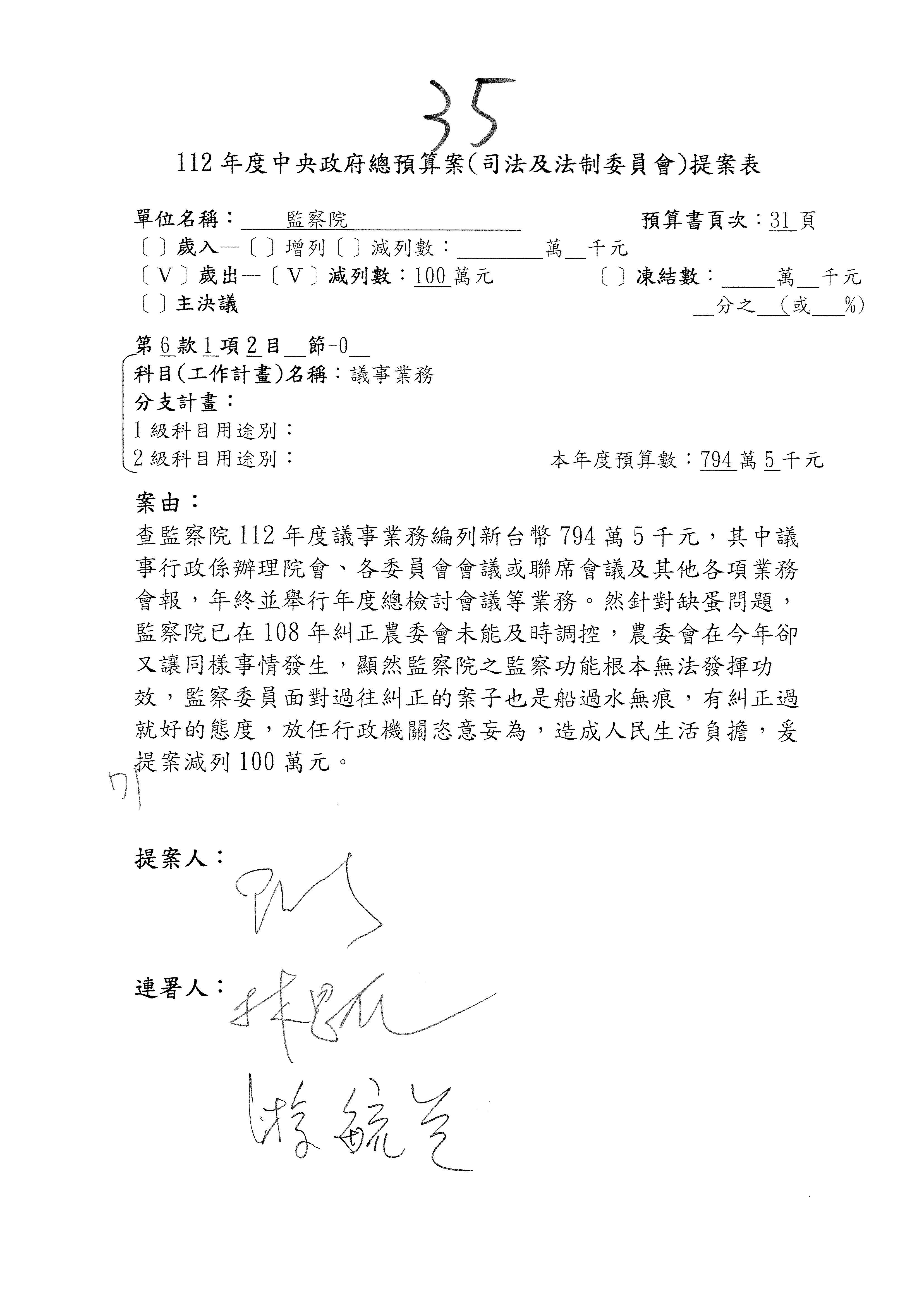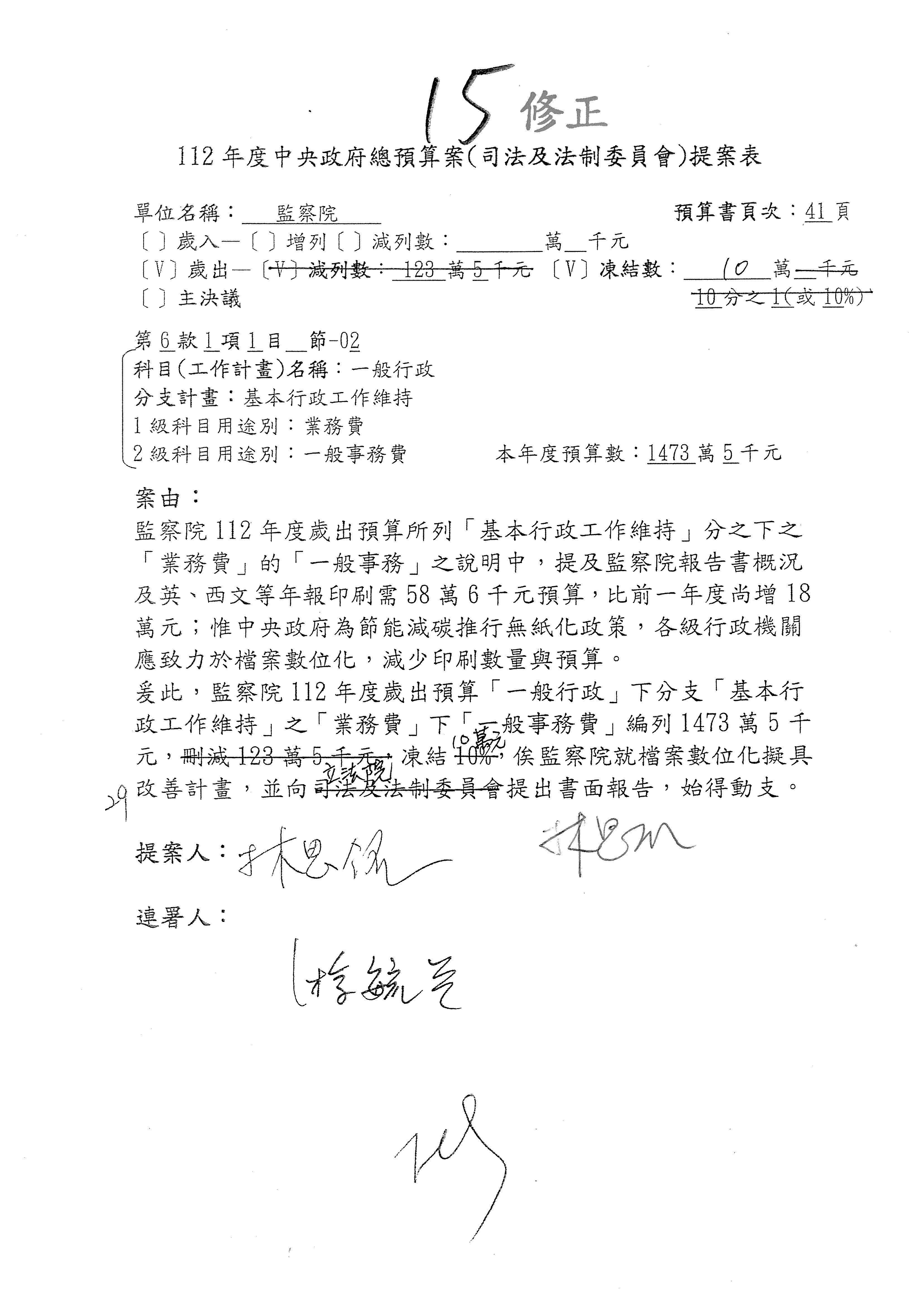 現在處理討論事項第一案─繼續審查112年度中央政府總預算案關於監察院主管收支部分,在處理之前,請議事人員一併宣讀討論事項第一案預算案之全部預算數及委員提案,請宣讀。