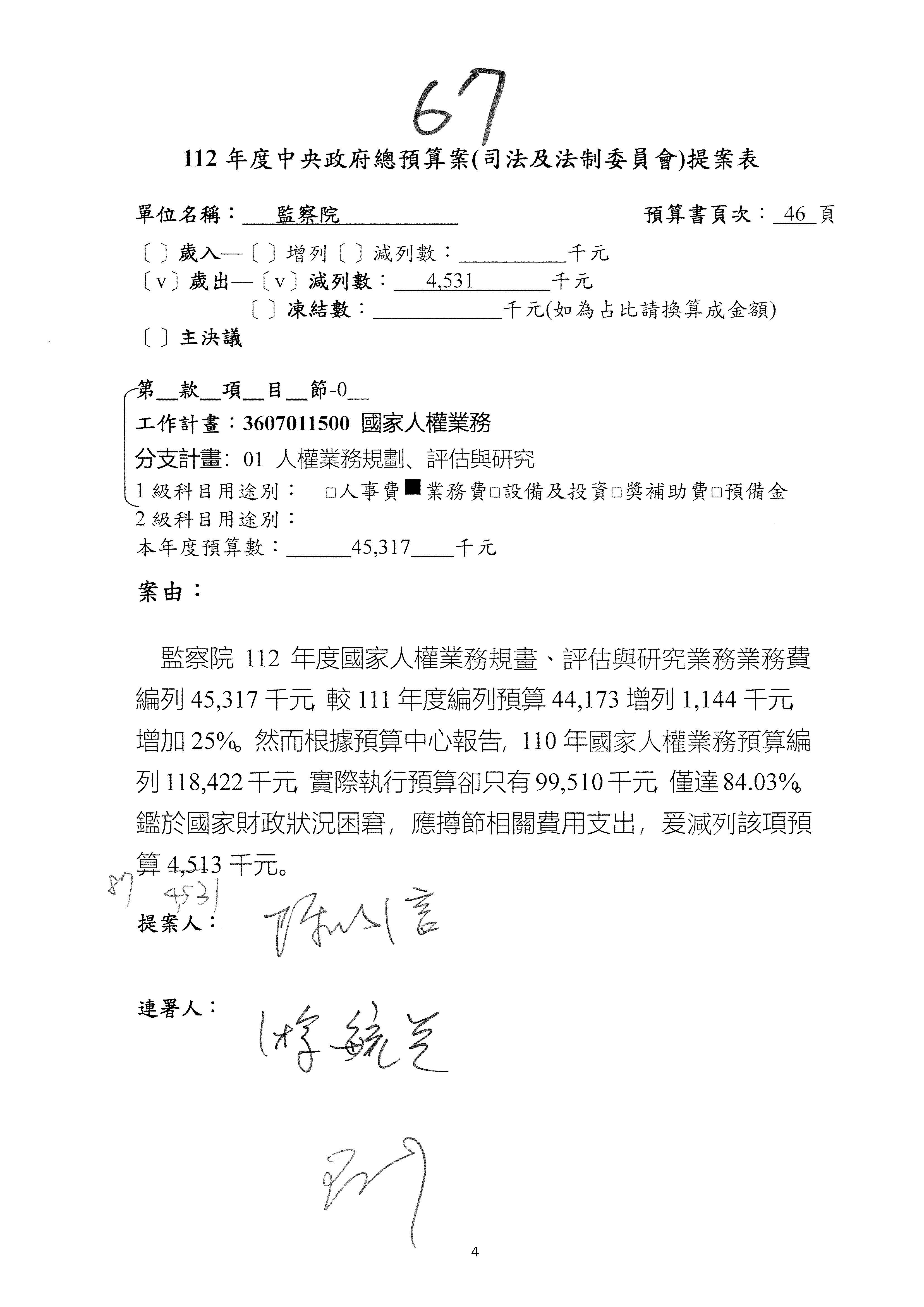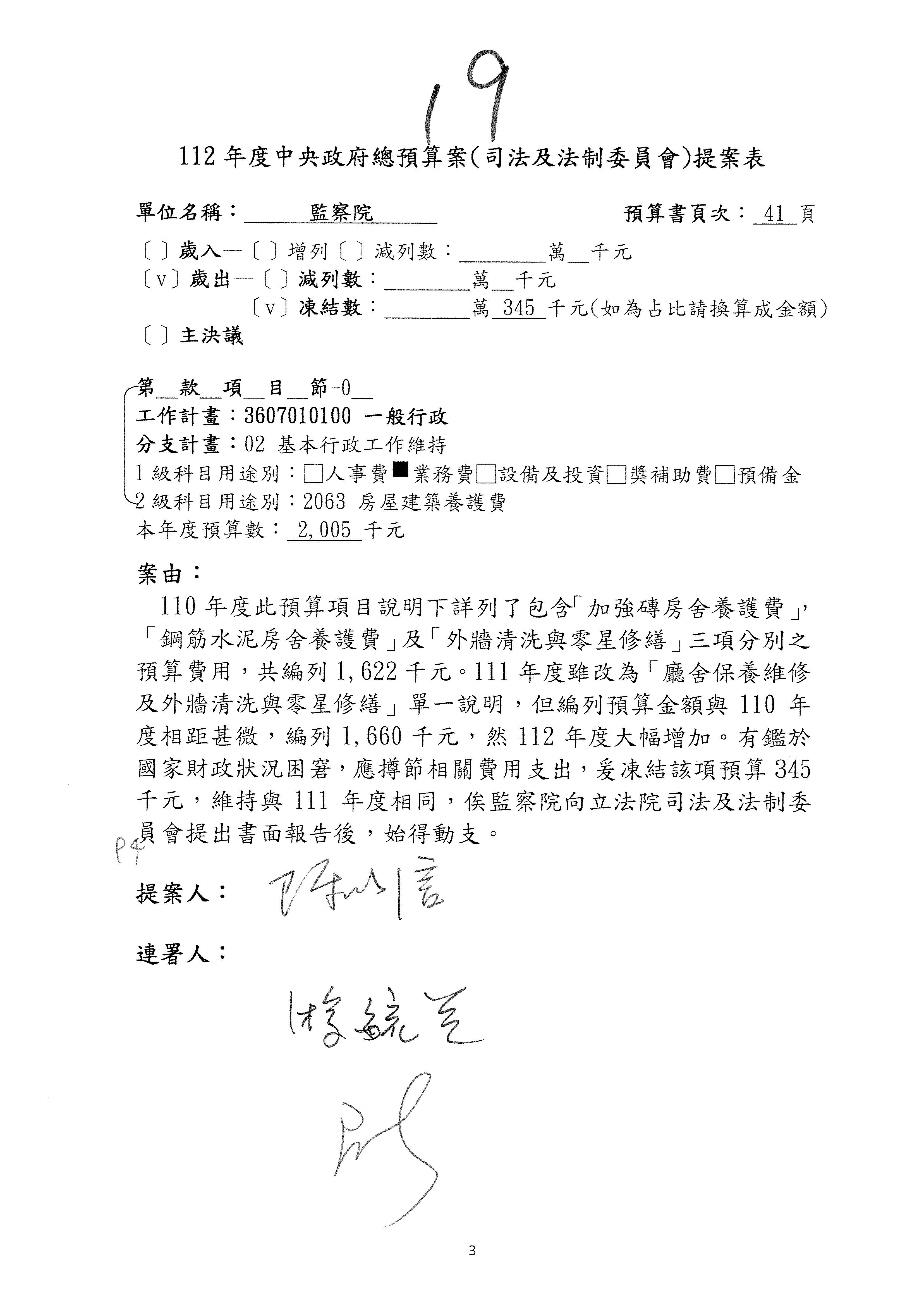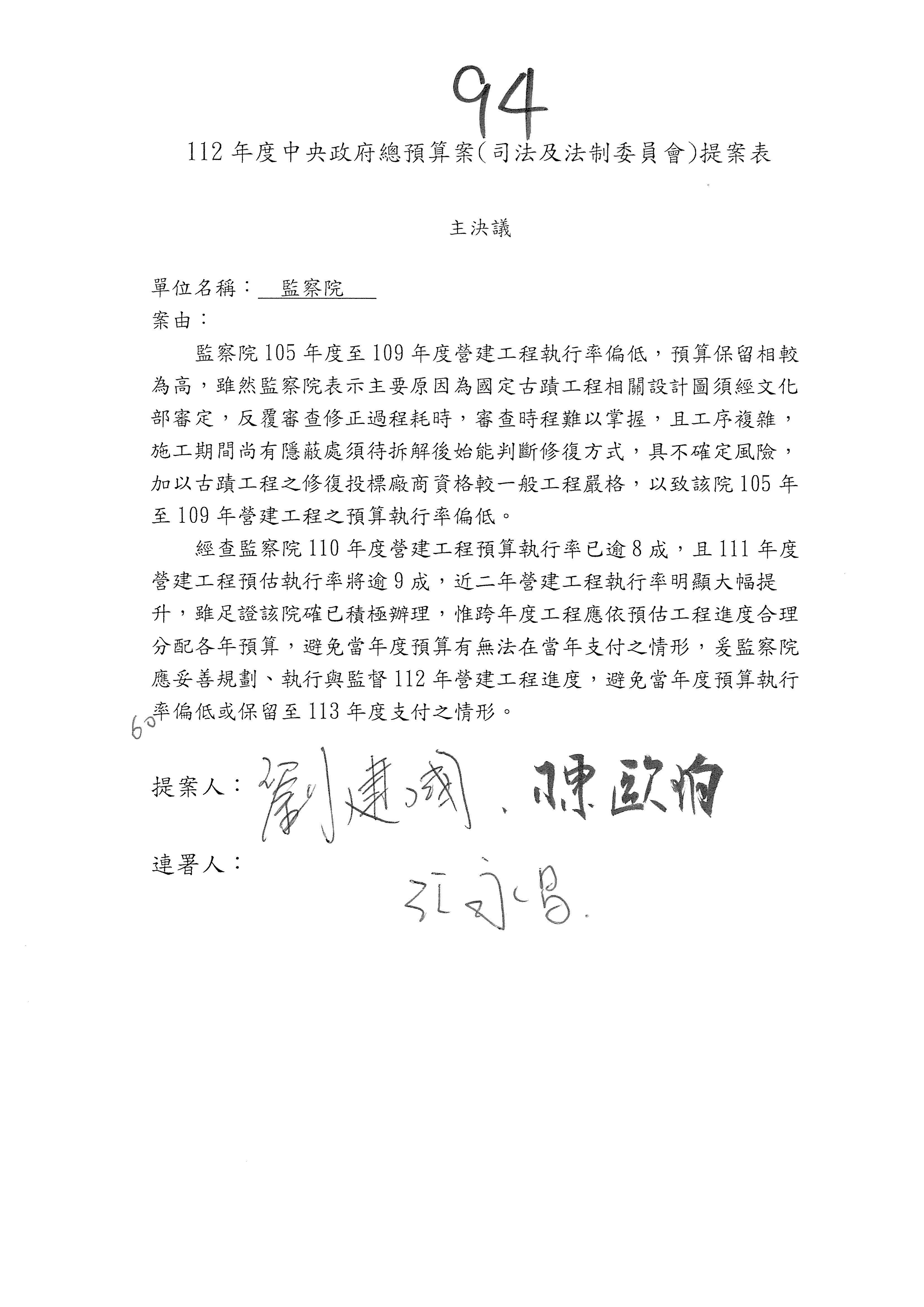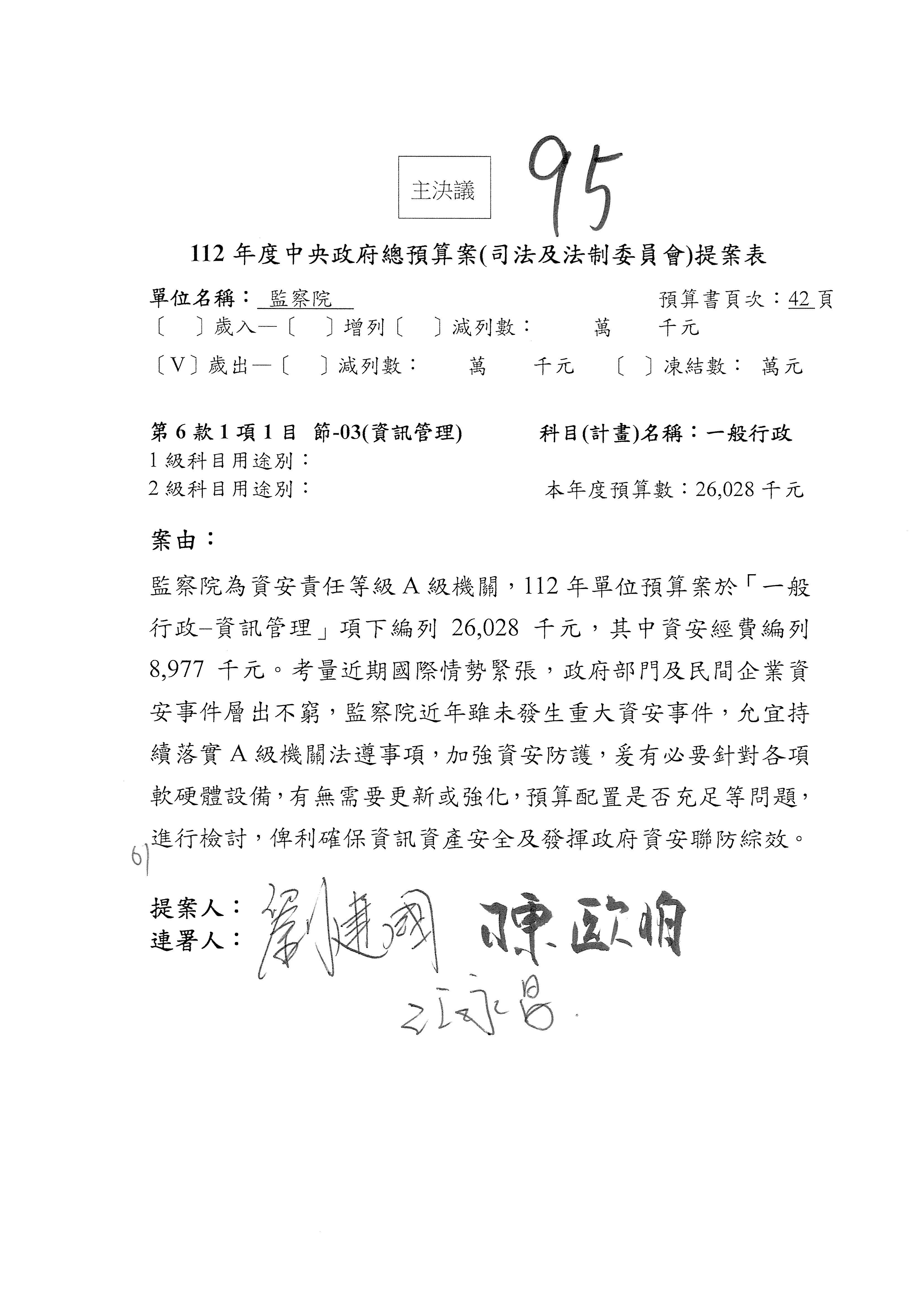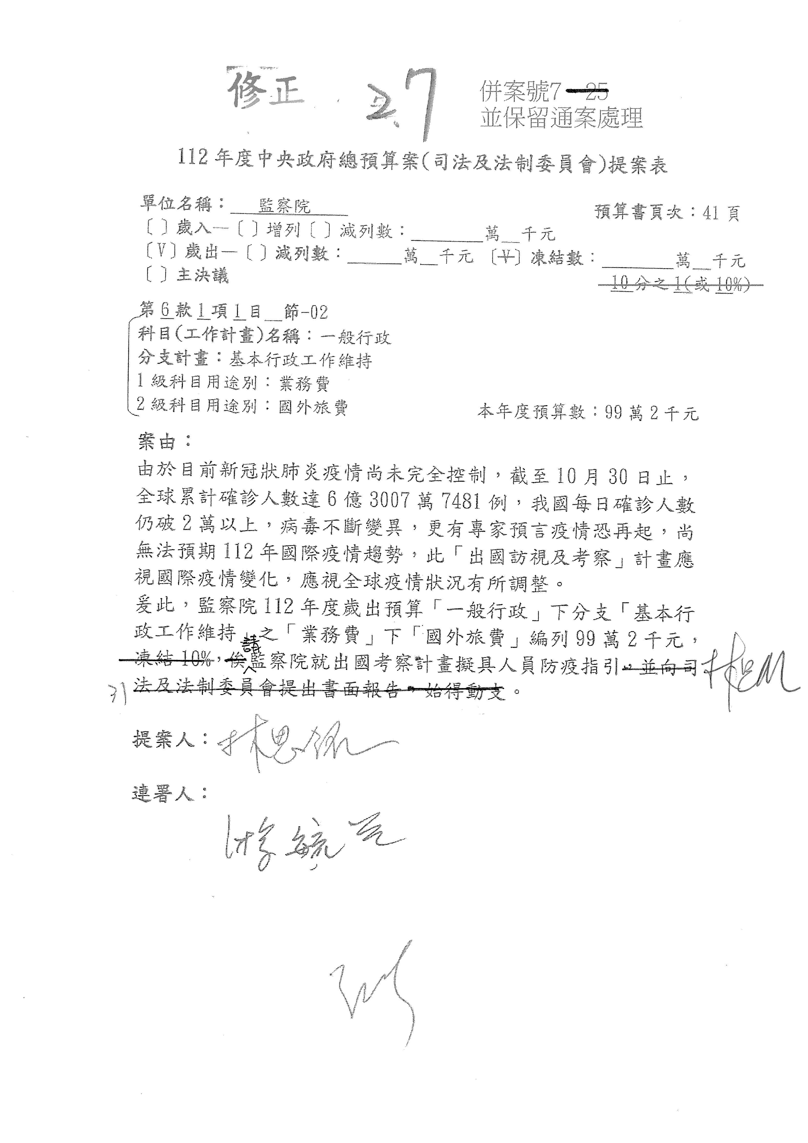 現在處理討論事項第一案─繼續審查112年度中央政府總預算案關於監察院主管收支部分,在處理之前,請議事人員一併宣讀討論事項第一案預算案之全部預算數及委員提案,請宣讀。