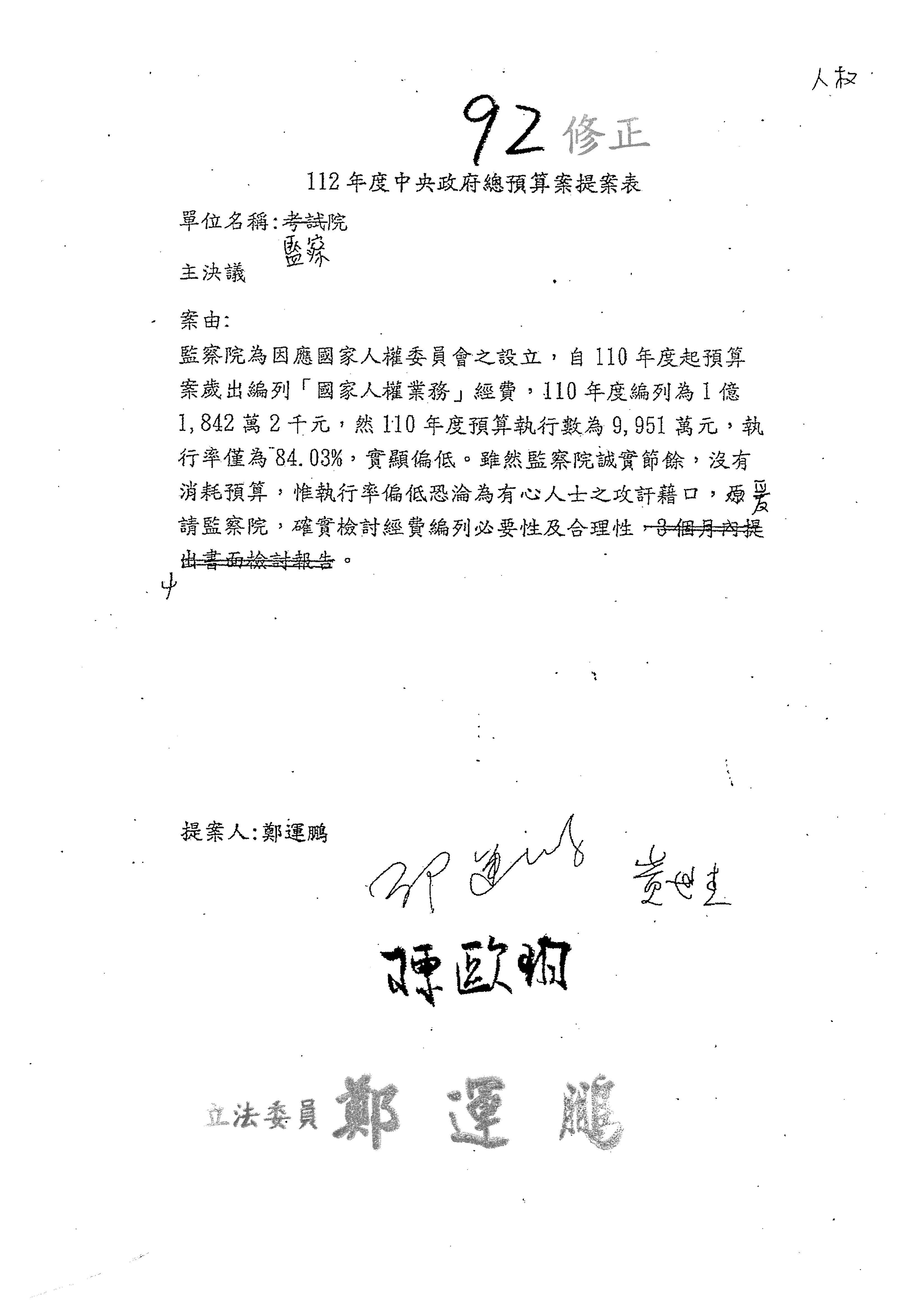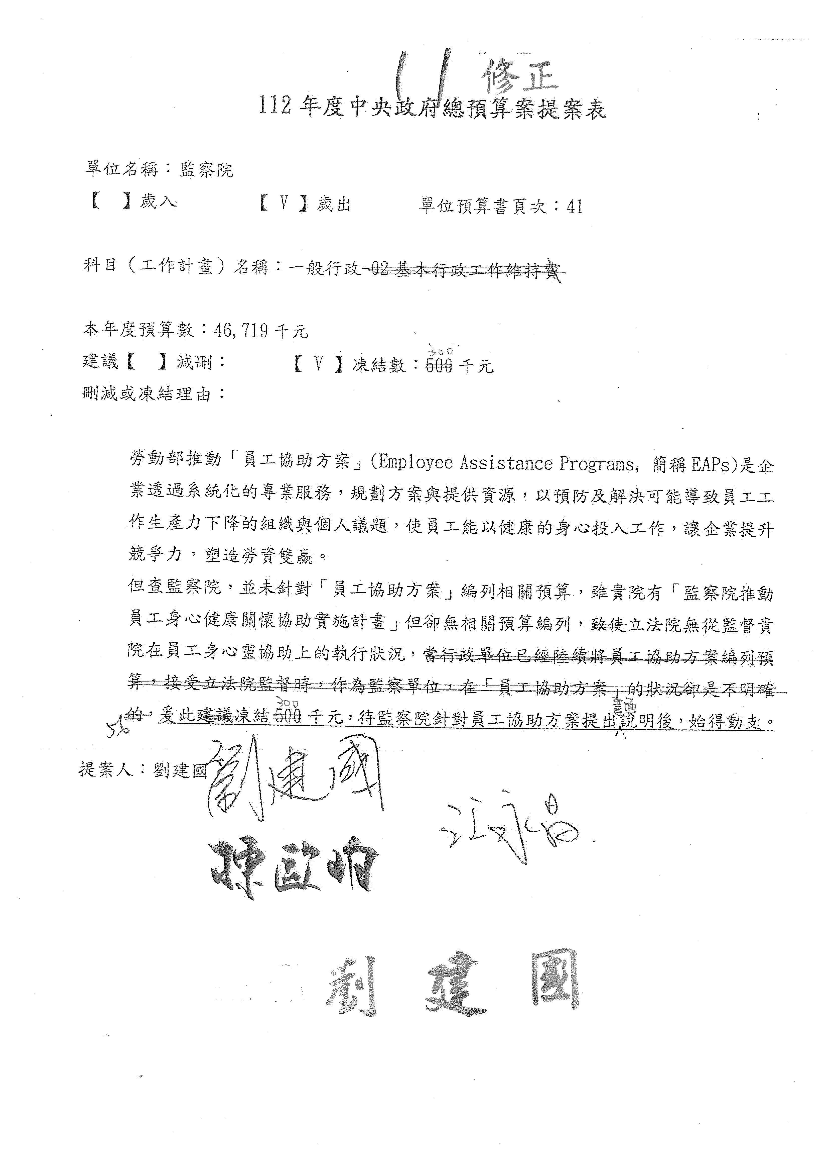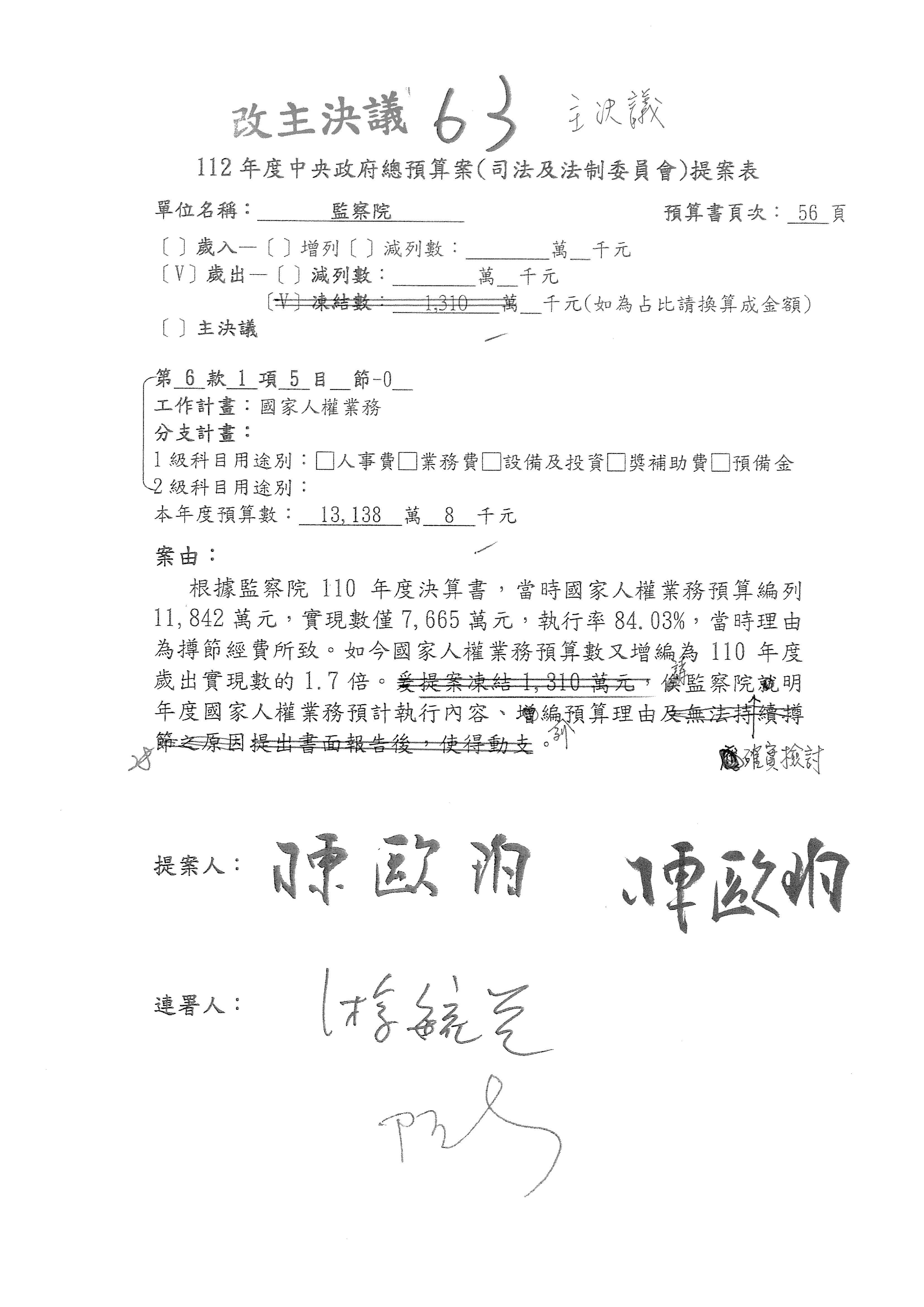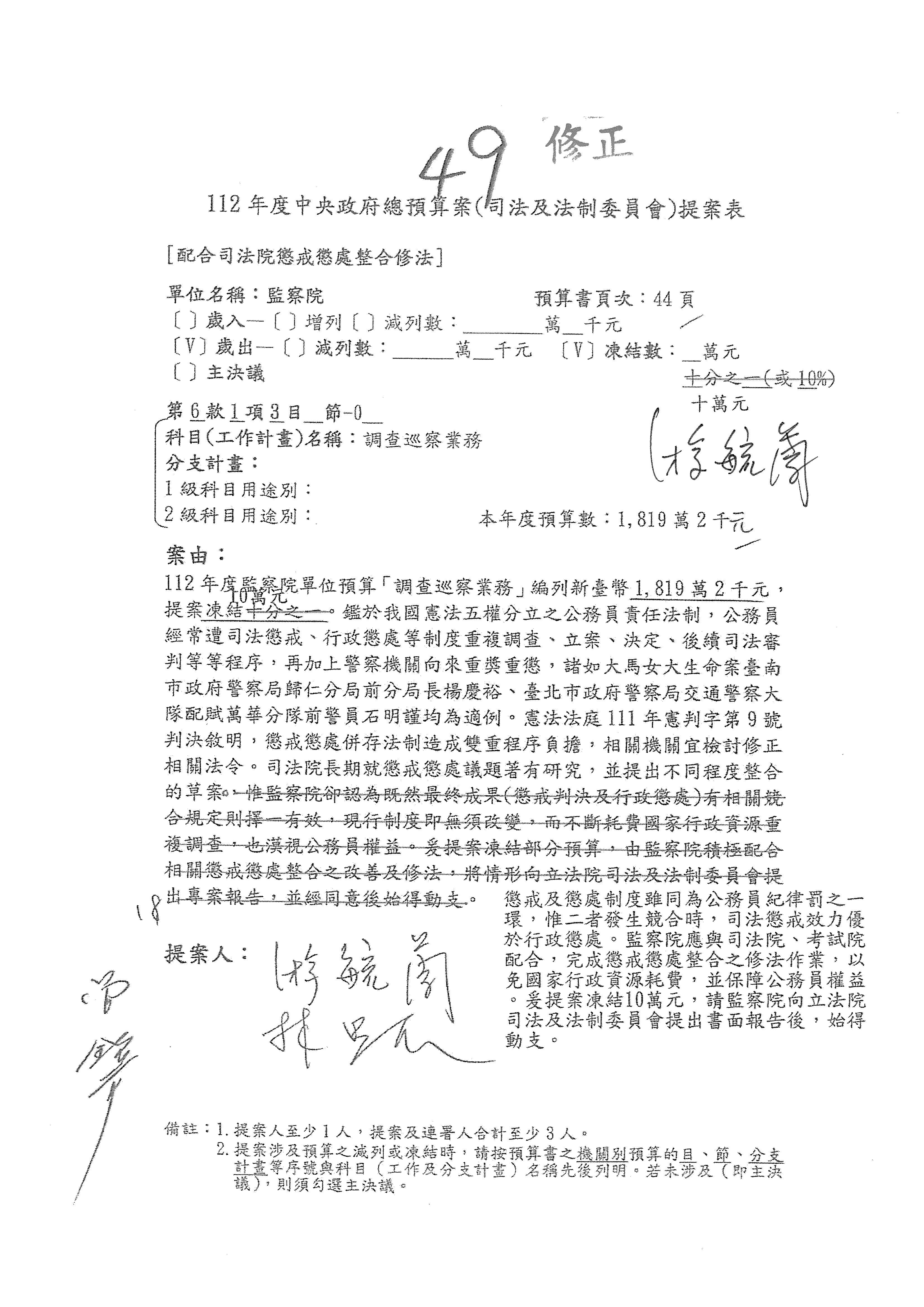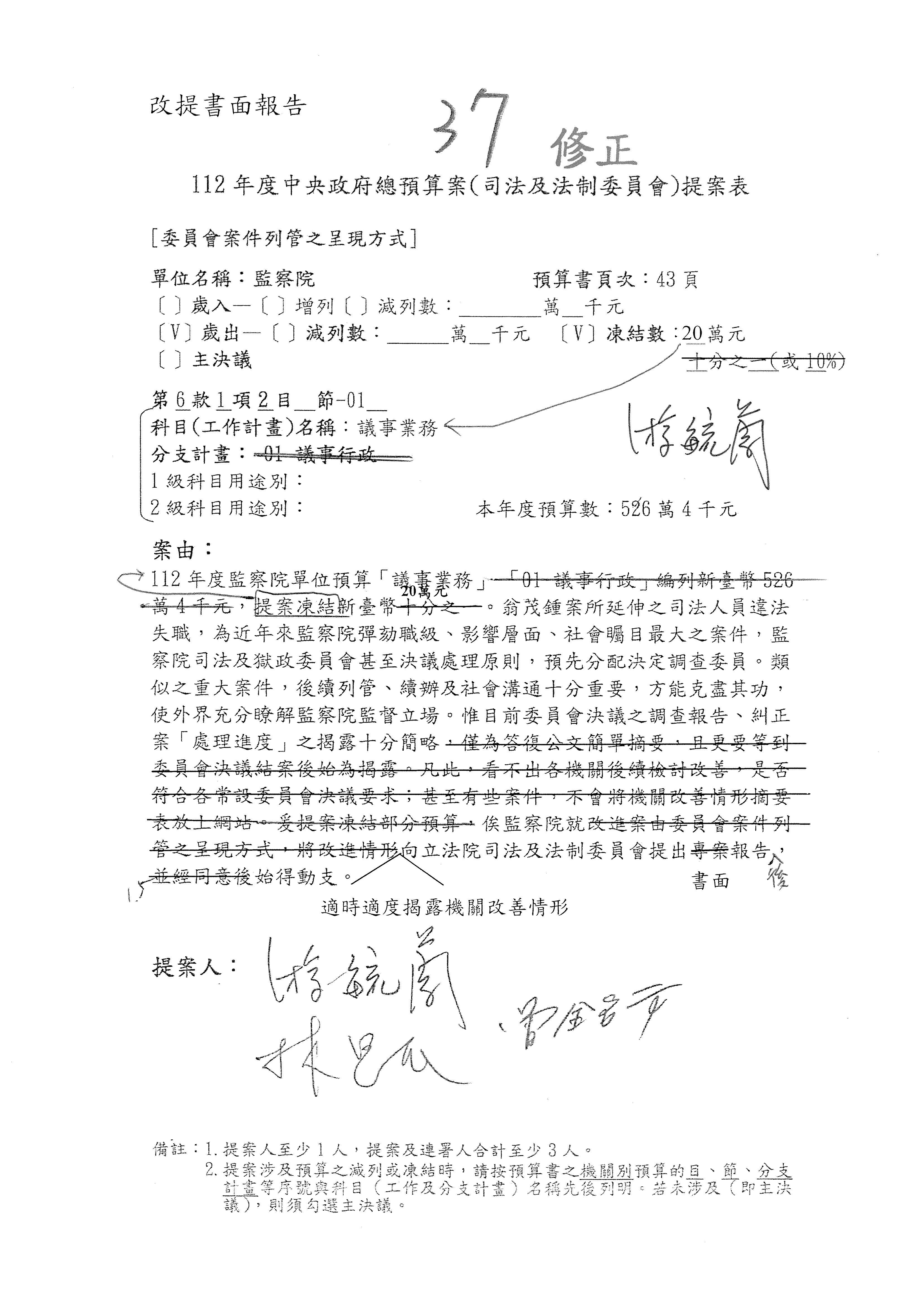 現在處理討論事項第一案─繼續審查112年度中央政府總預算案關於監察院主管收支部分,在處理之前,請議事人員一併宣讀討論事項第一案預算案之全部預算數及委員提案,請宣讀。