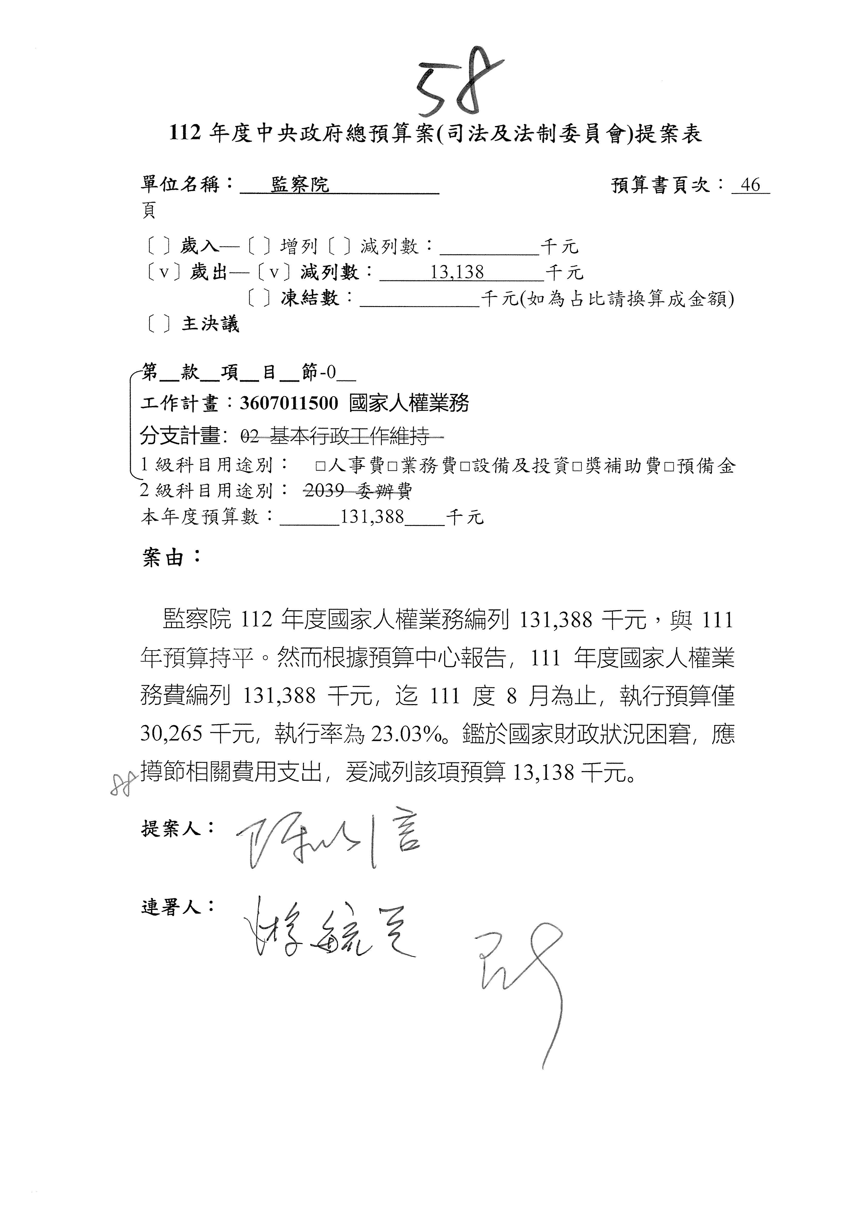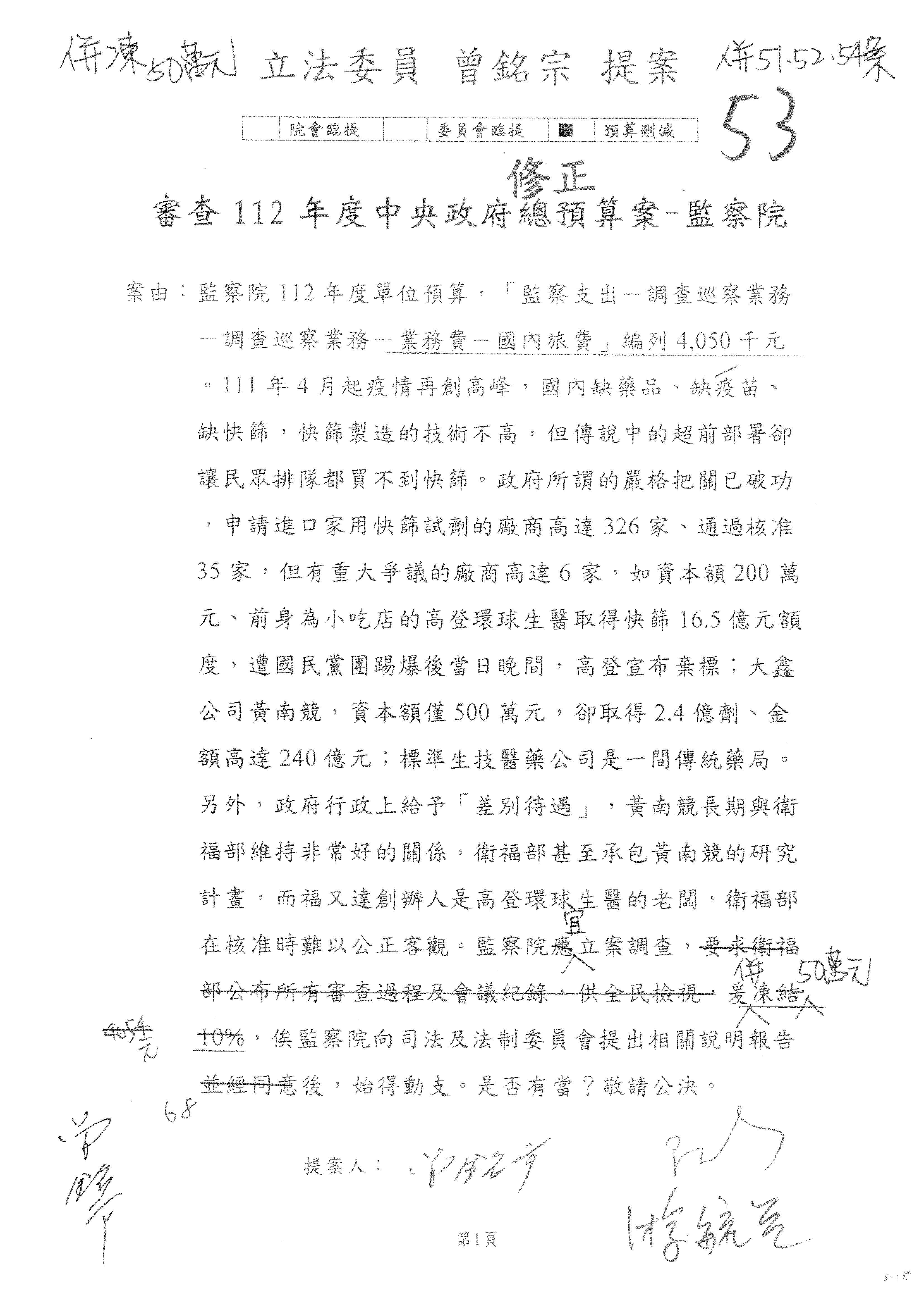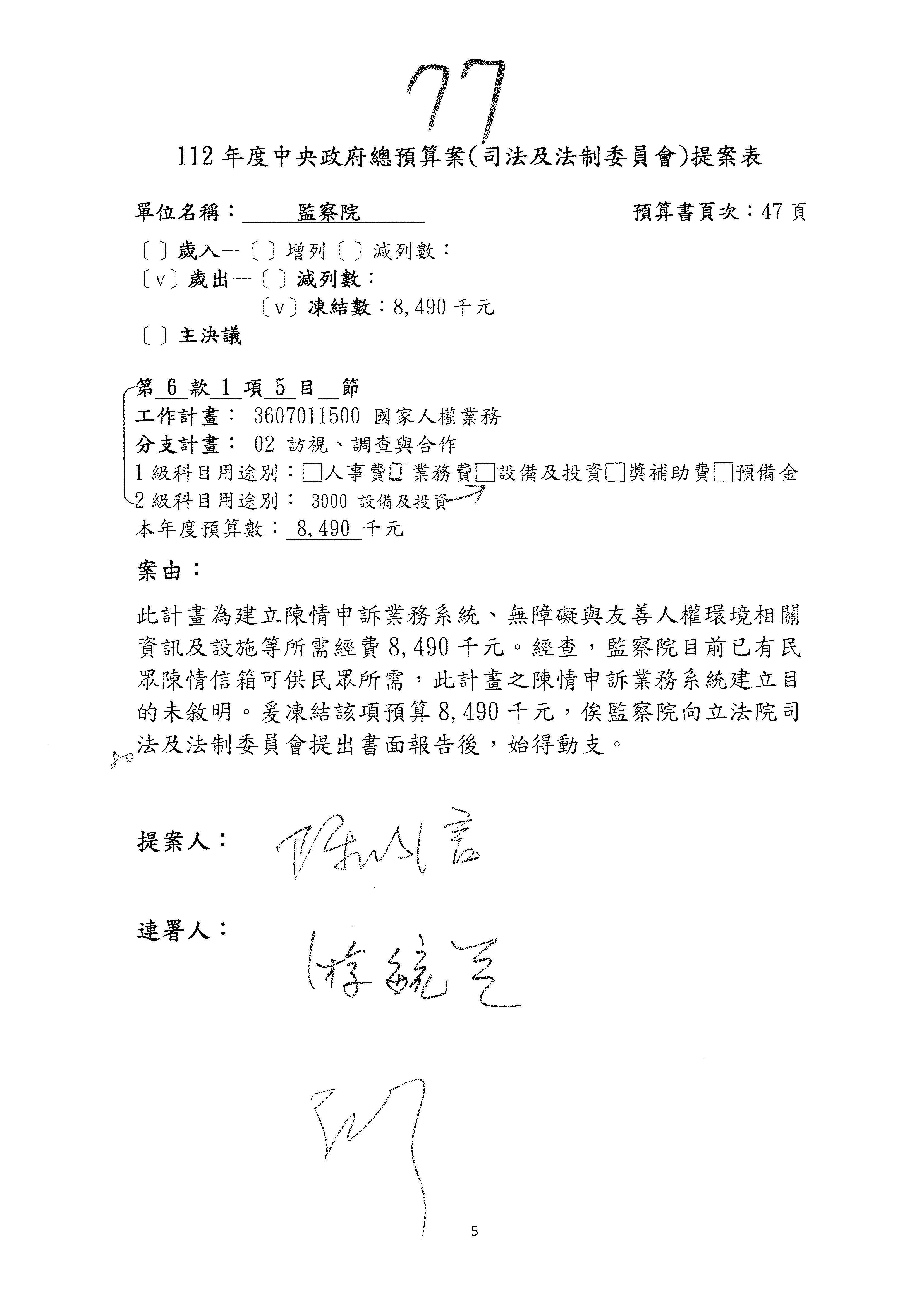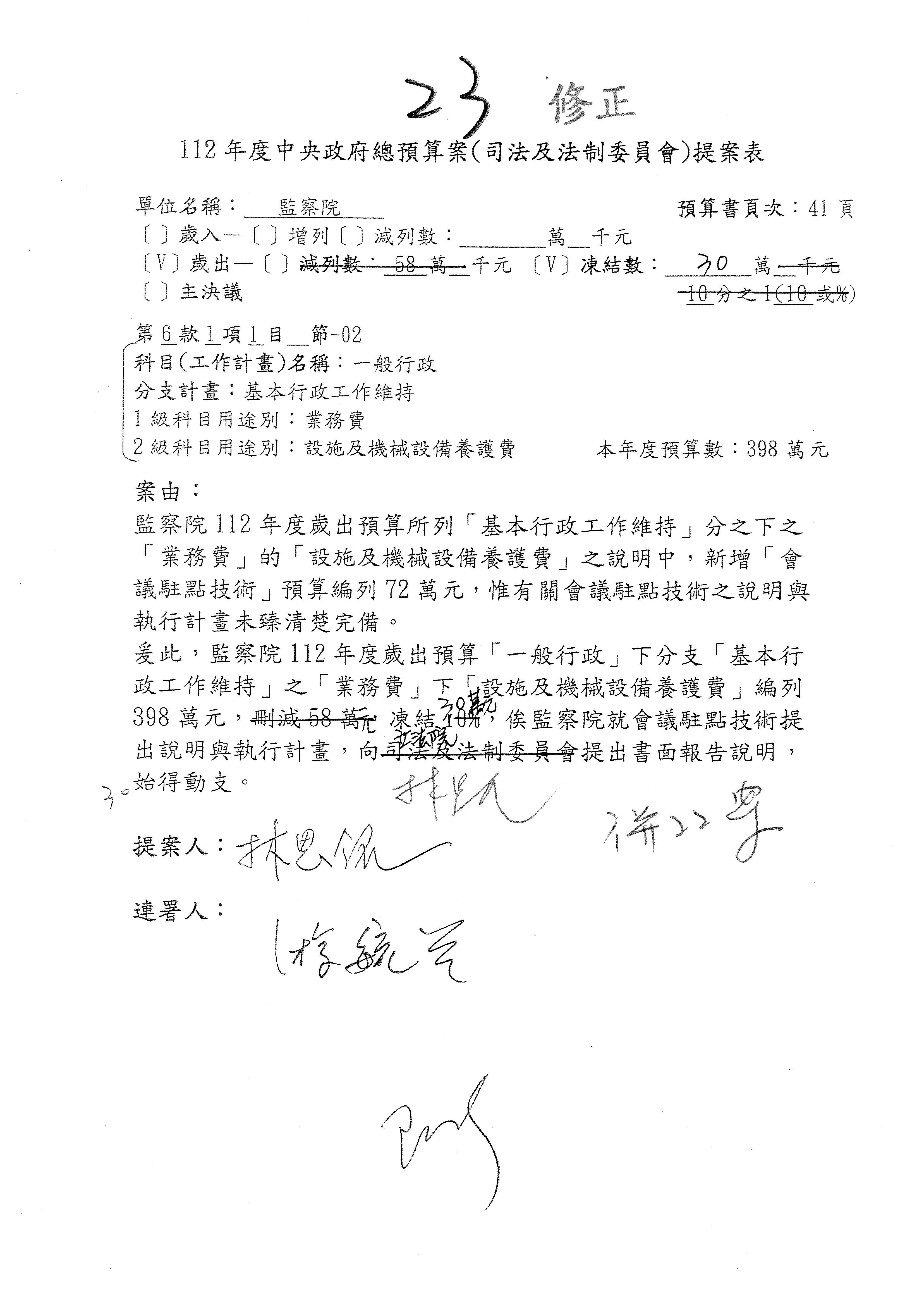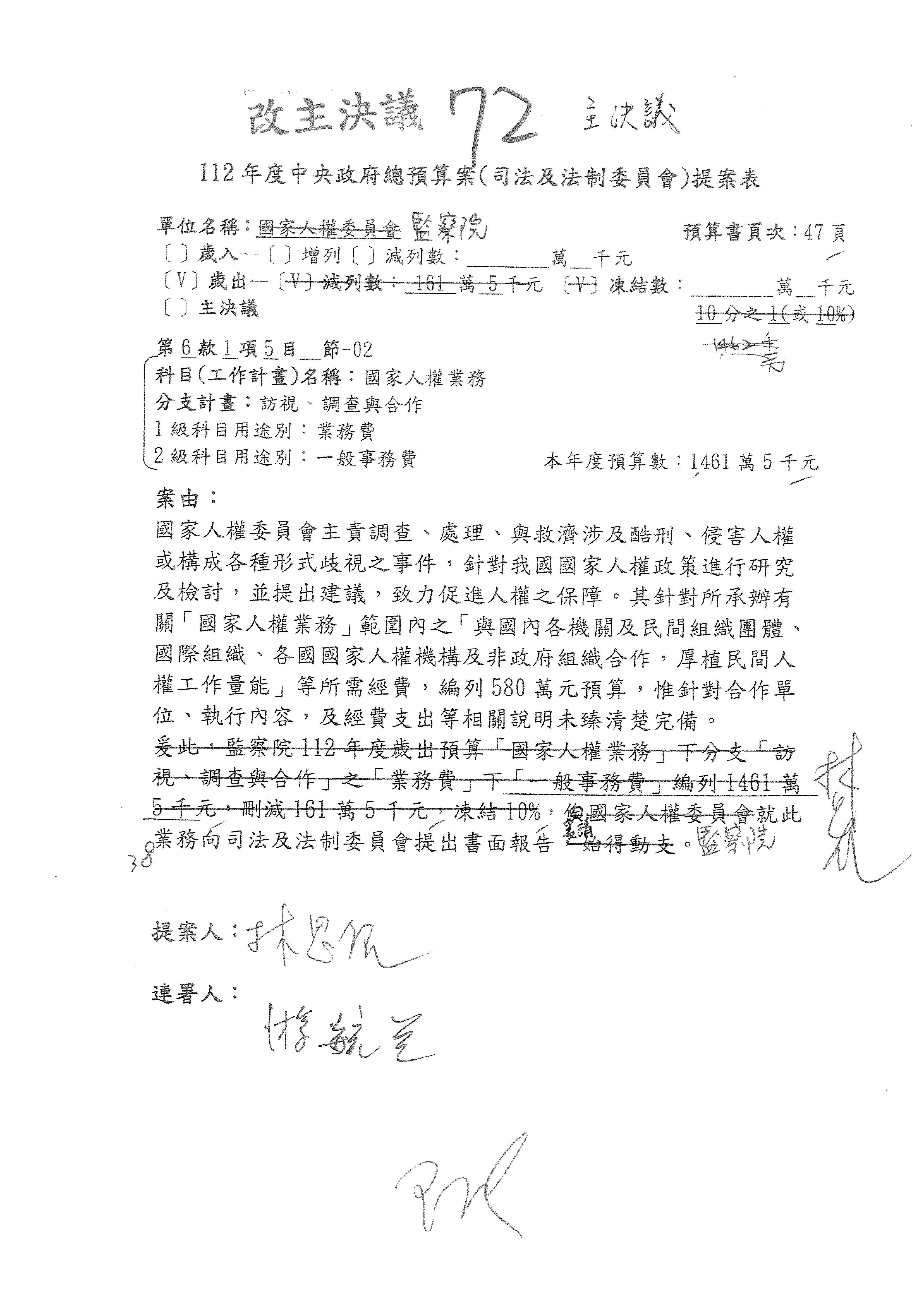 現在處理討論事項第一案─繼續審查112年度中央政府總預算案關於監察院主管收支部分,在處理之前,請議事人員一併宣讀討論事項第一案預算案之全部預算數及委員提案,請宣讀。
