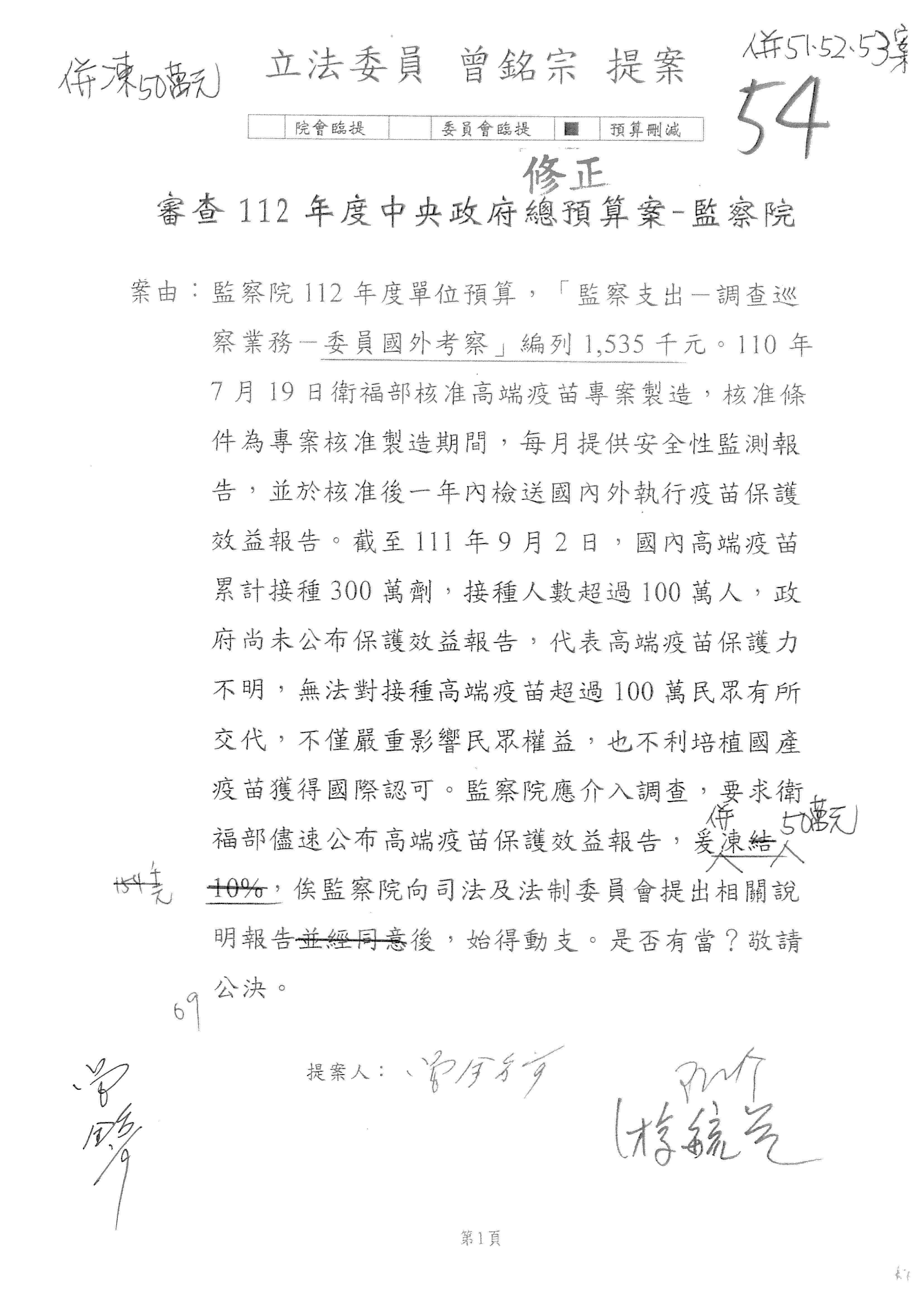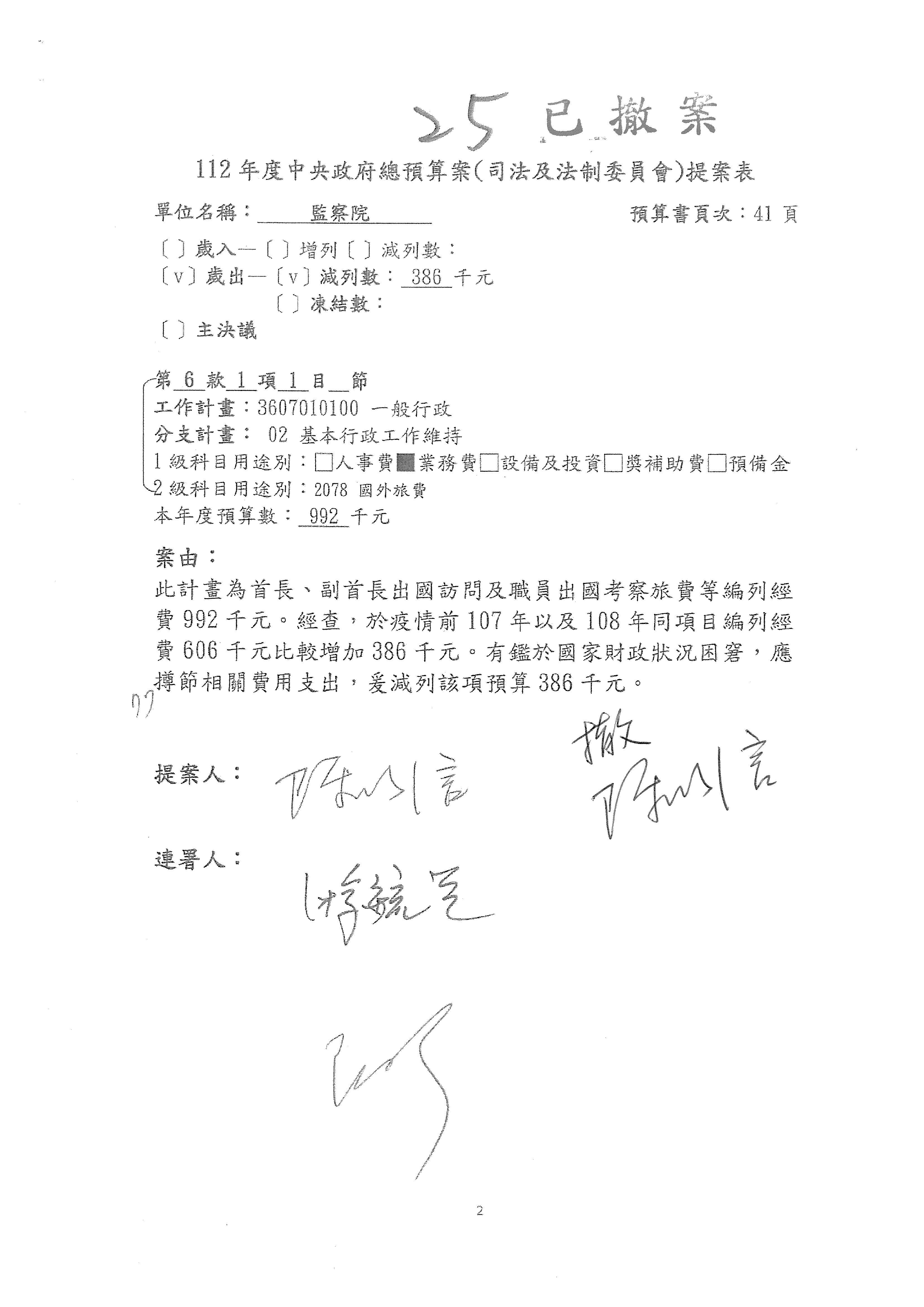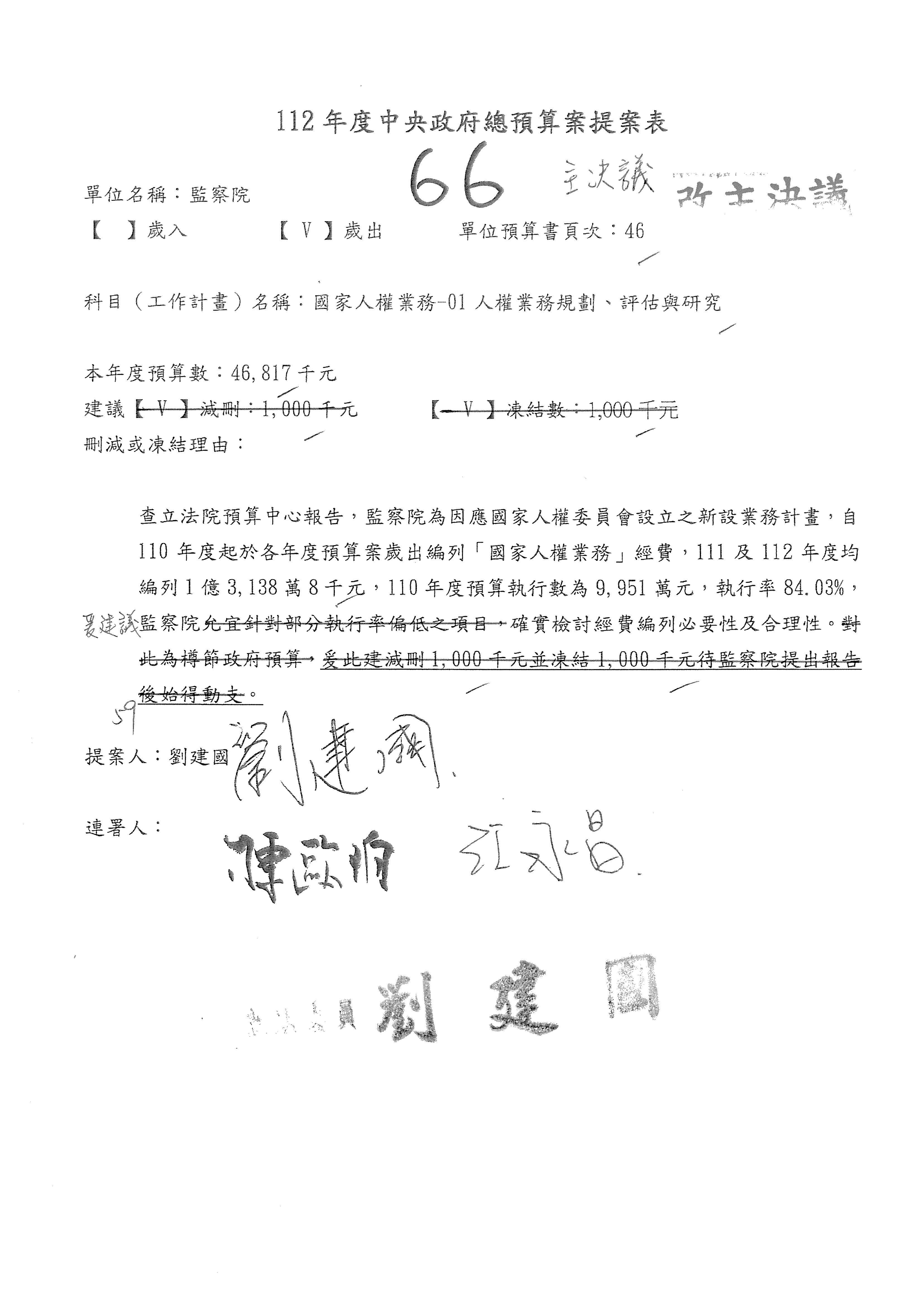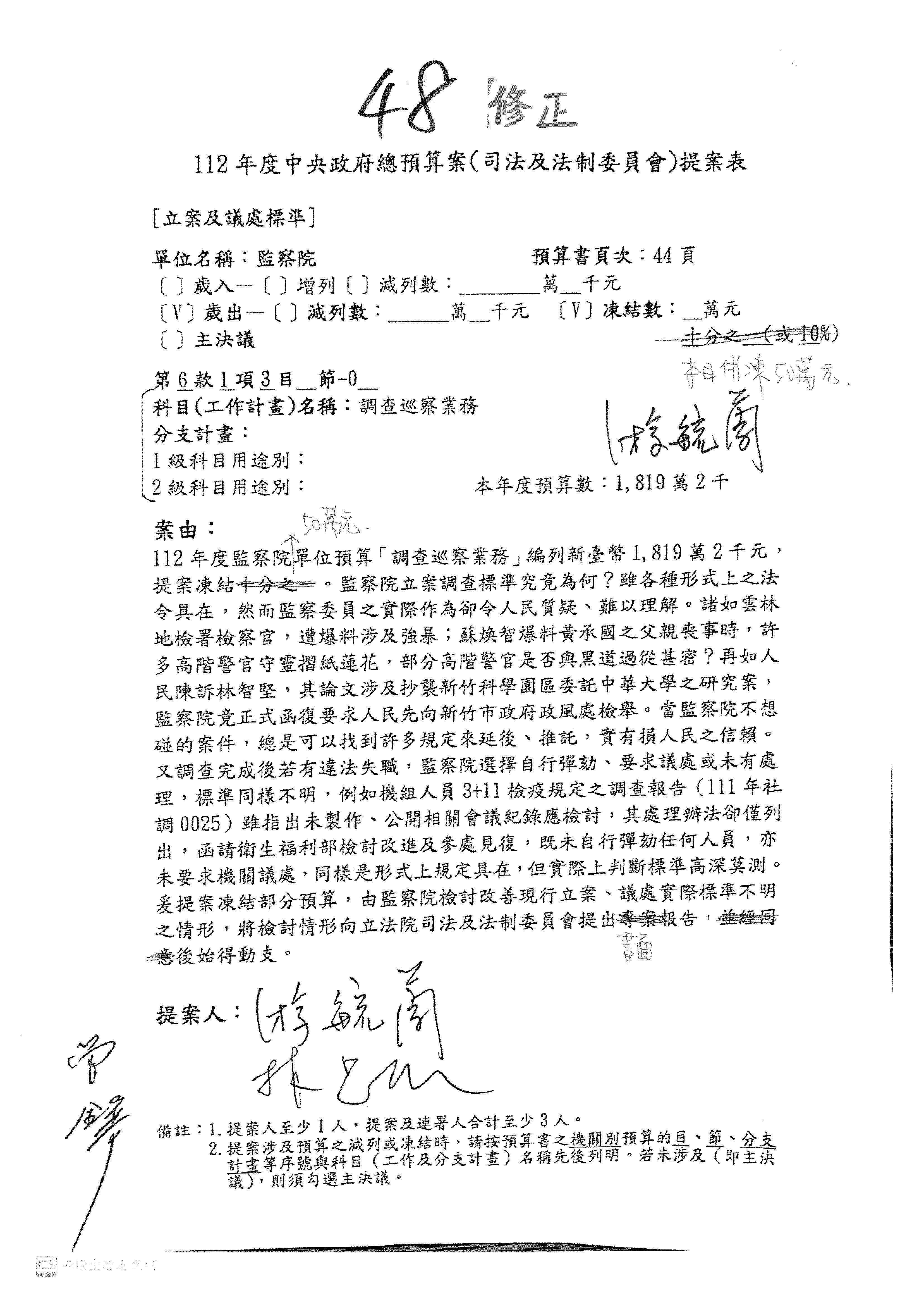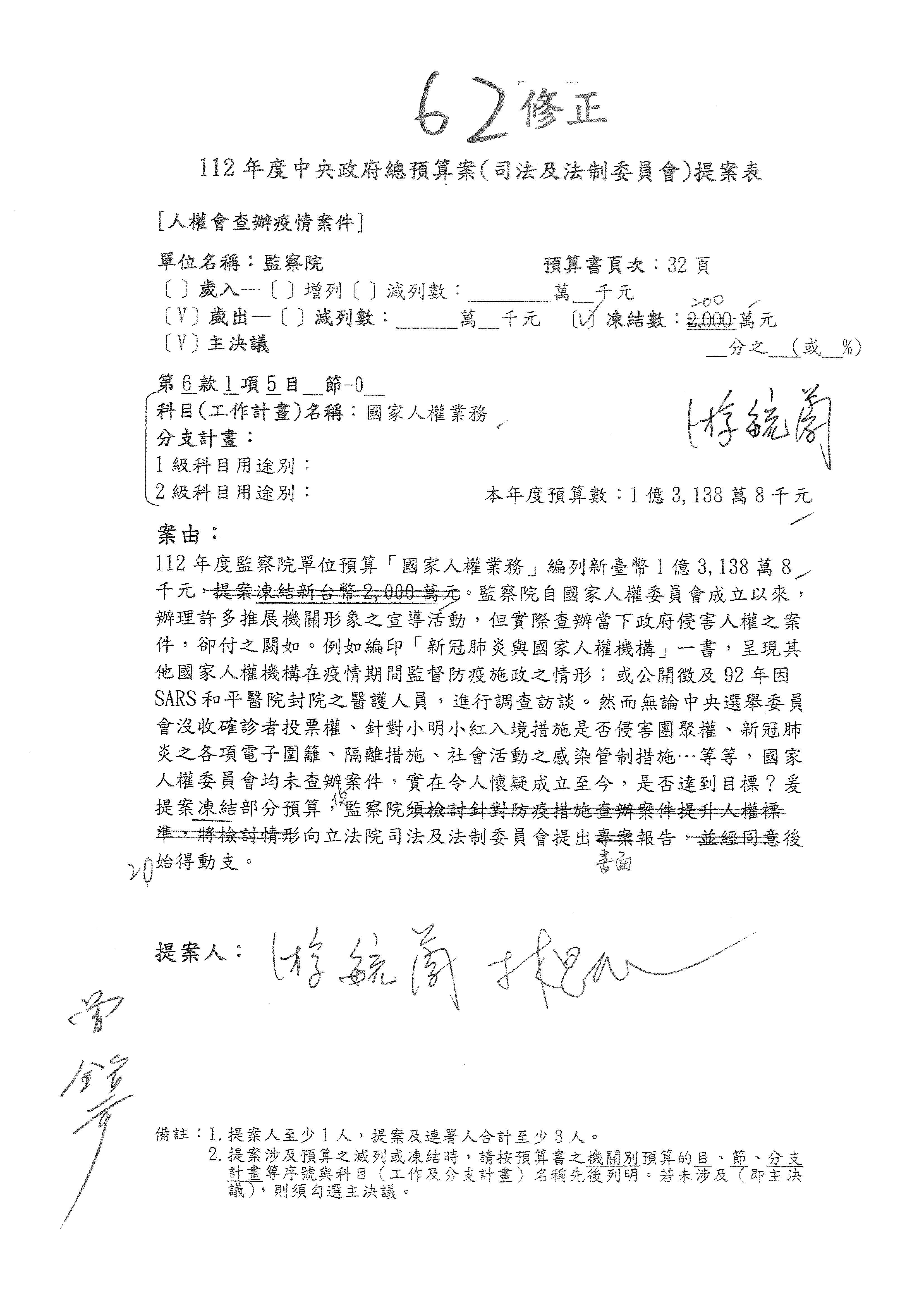 現在處理討論事項第一案─繼續審查112年度中央政府總預算案關於監察院主管收支部分,在處理之前,請議事人員一併宣讀討論事項第一案預算案之全部預算數及委員提案,請宣讀。