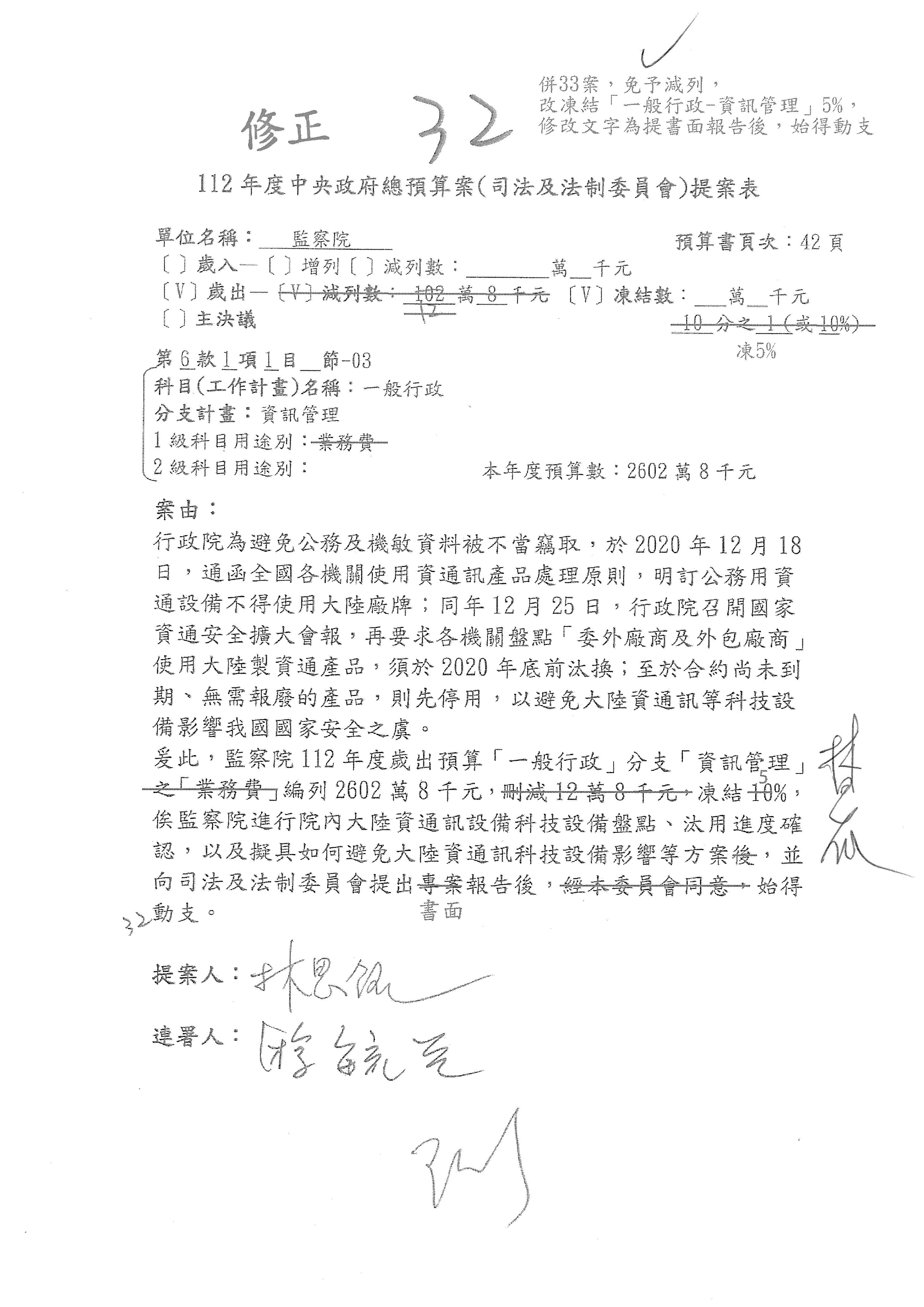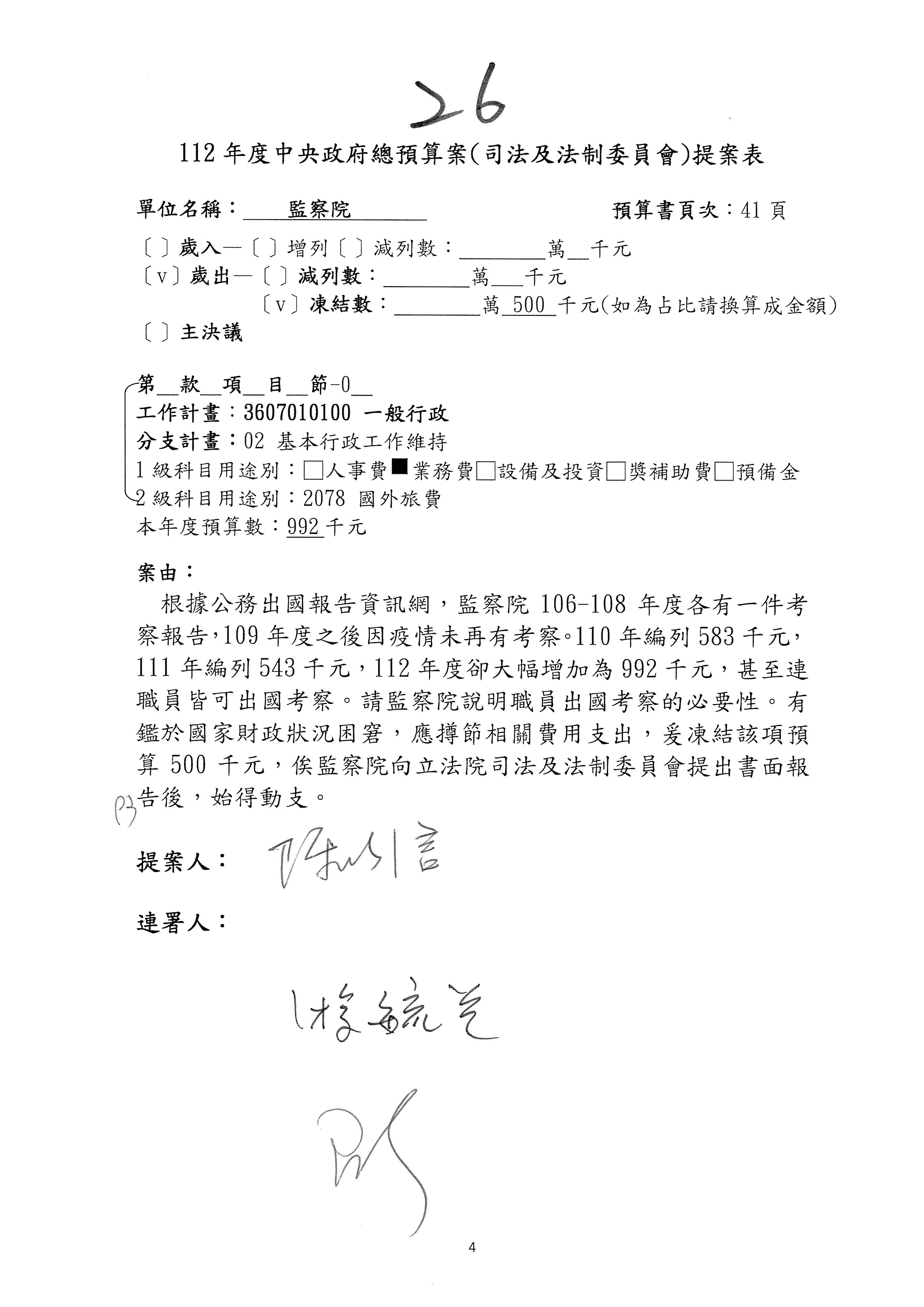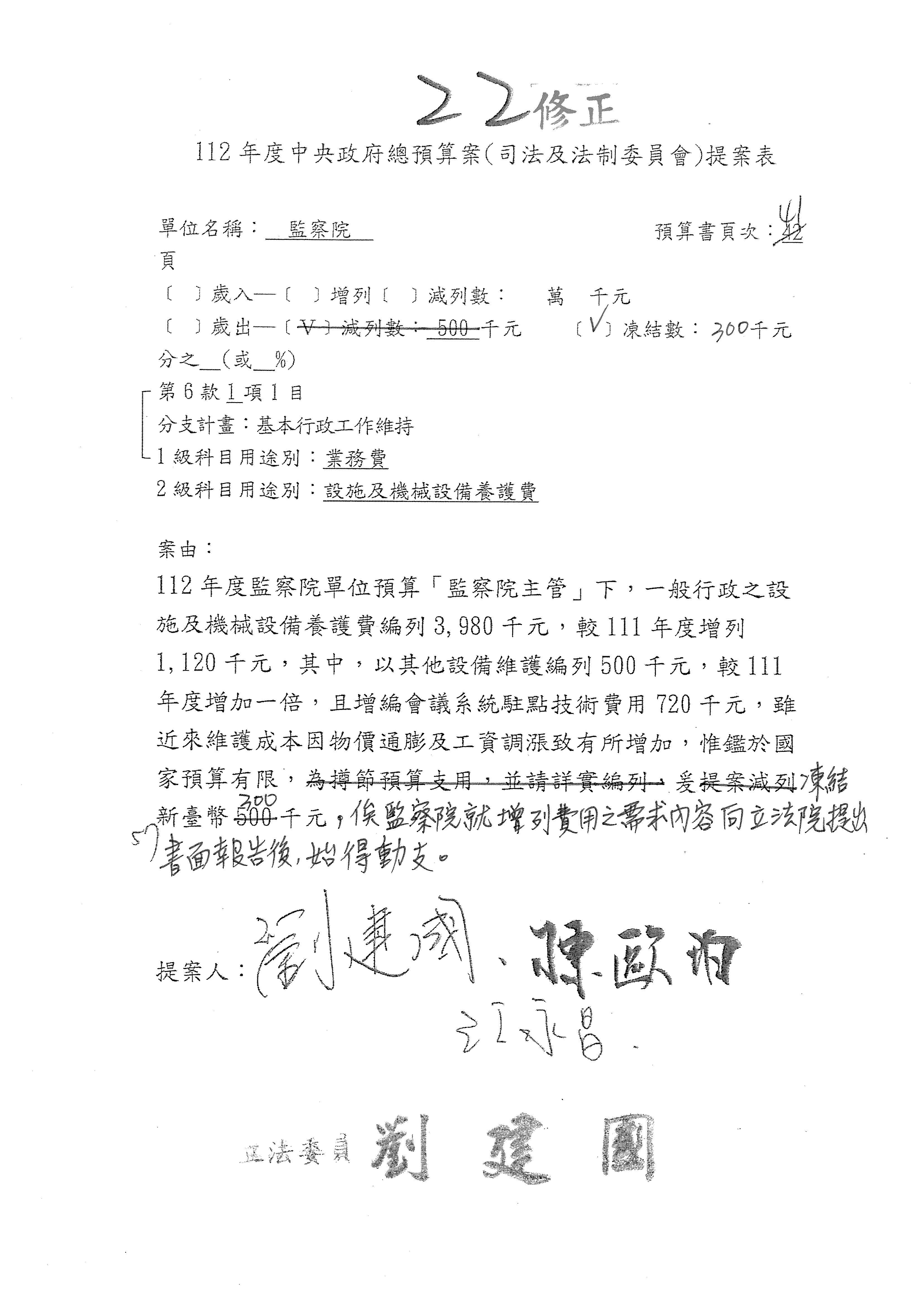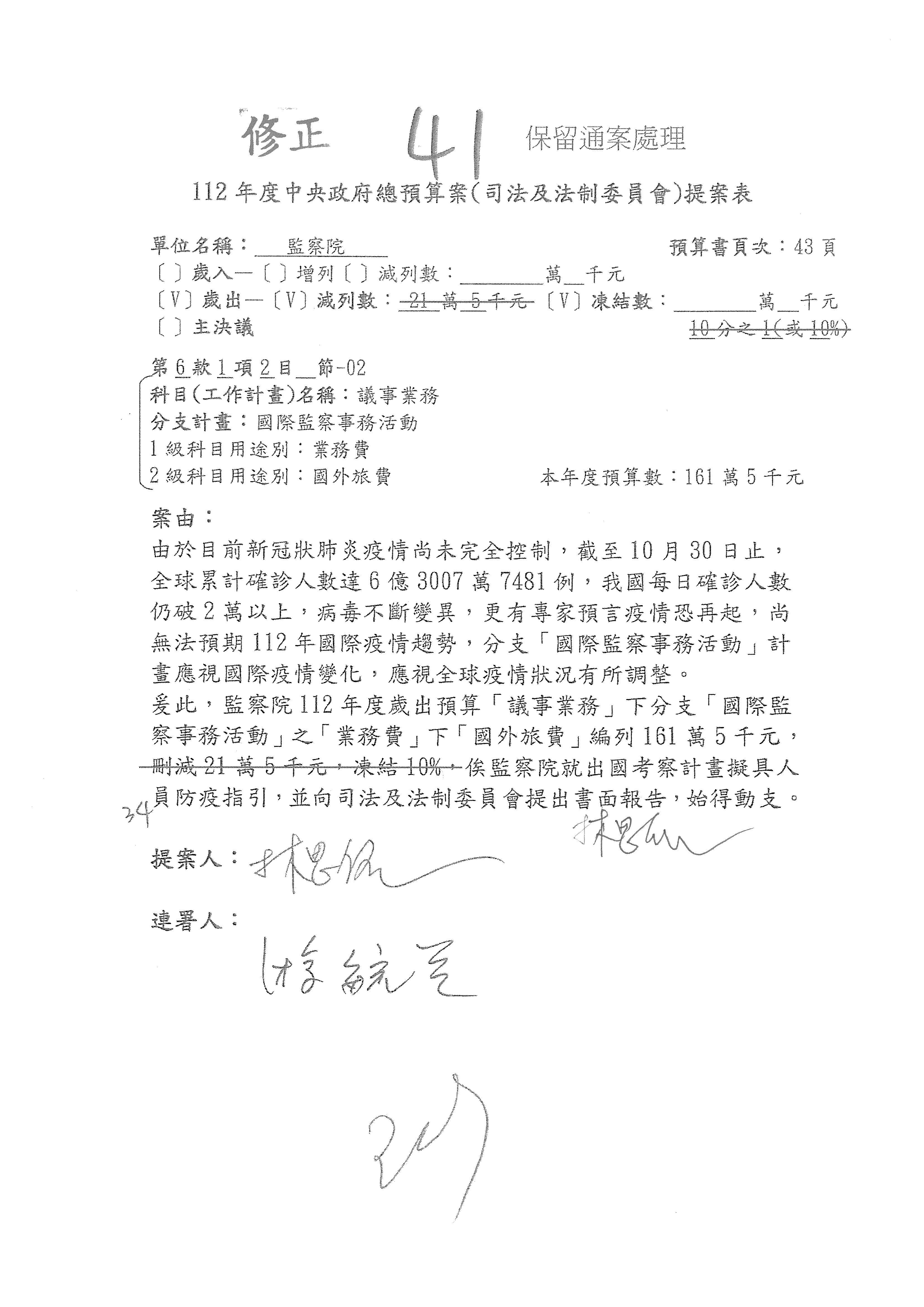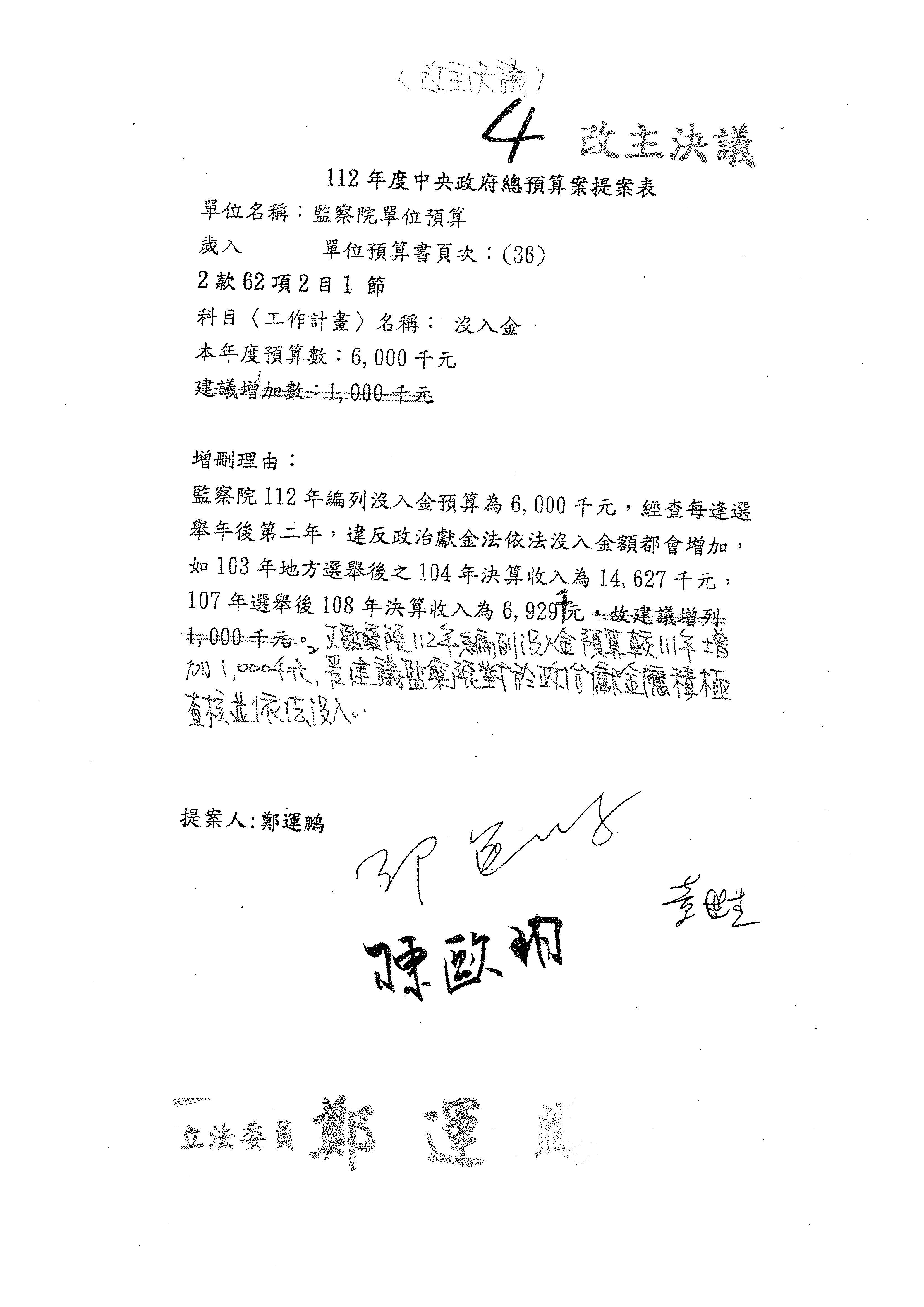 現在處理討論事項第一案─繼續審查112年度中央政府總預算案關於監察院主管收支部分,在處理之前,請議事人員一併宣讀討論事項第一案預算案之全部預算數及委員提案,請宣讀。