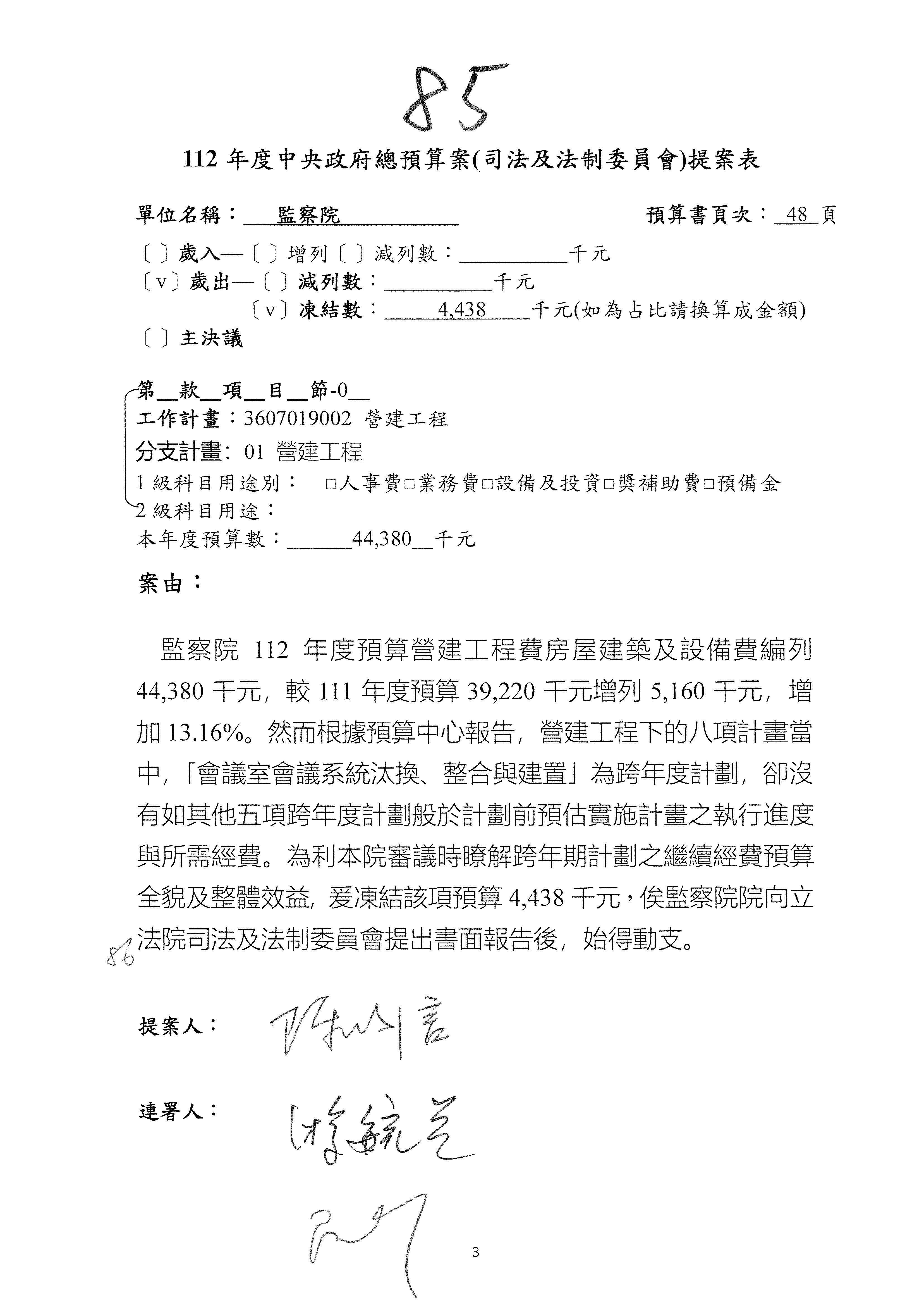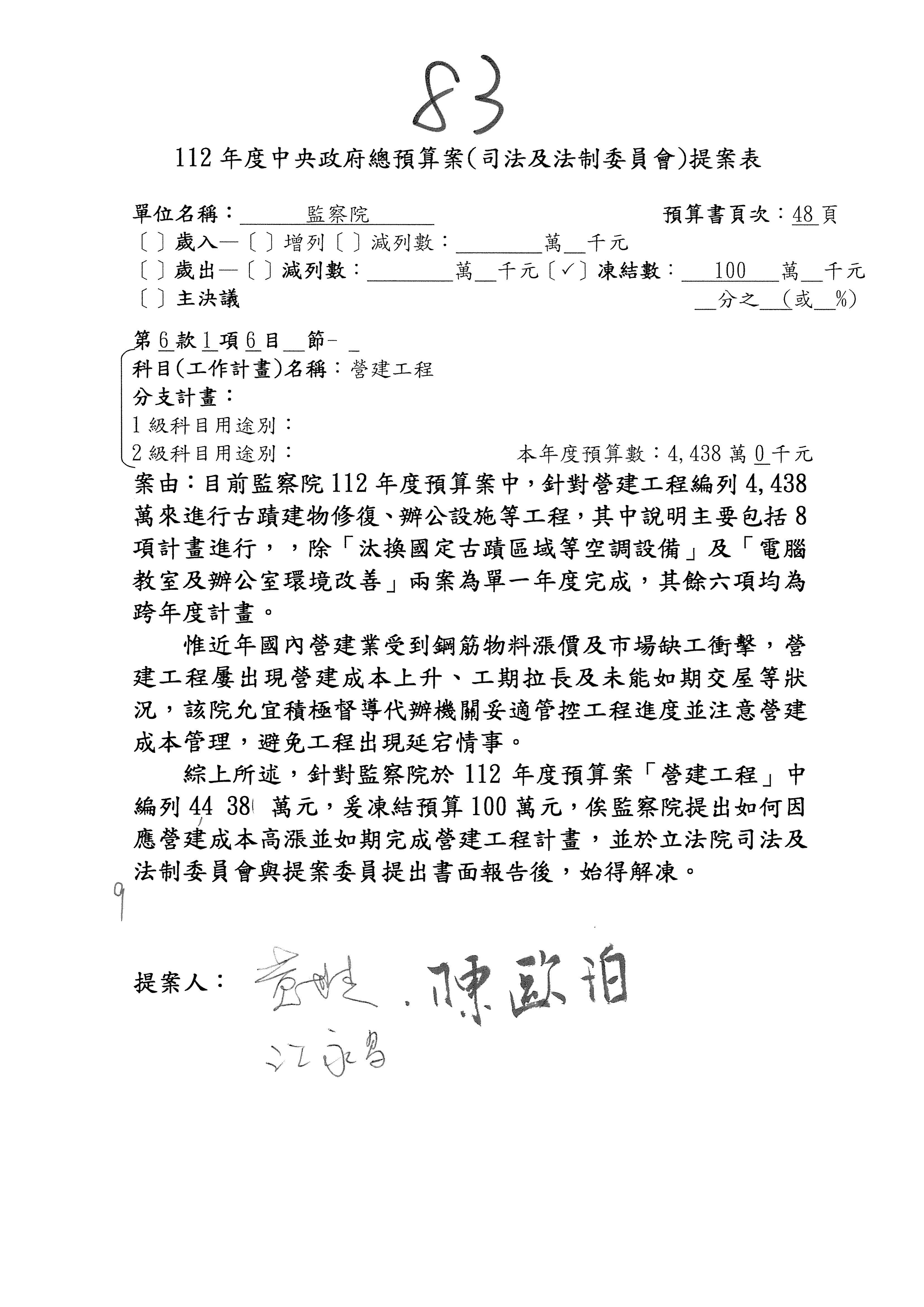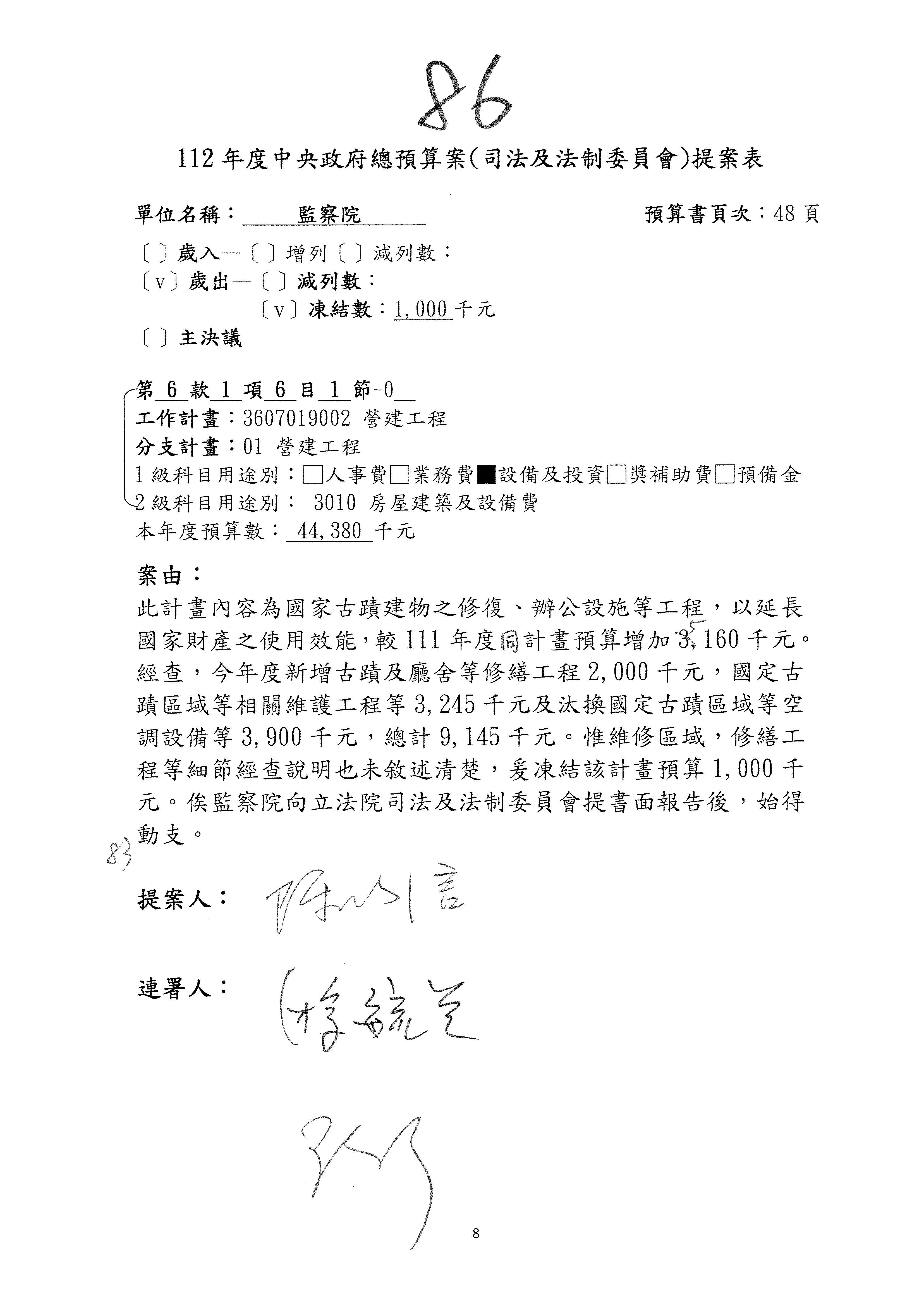 主席:好,第6款第1項第6目「一般建築及設備」,提案案號第83案至第90案,其中第87案撤案;第88案改為主決議,合併凍結50萬元,並針對各凍結提案之要求,依審查會決議提出書面報告後始得動支。