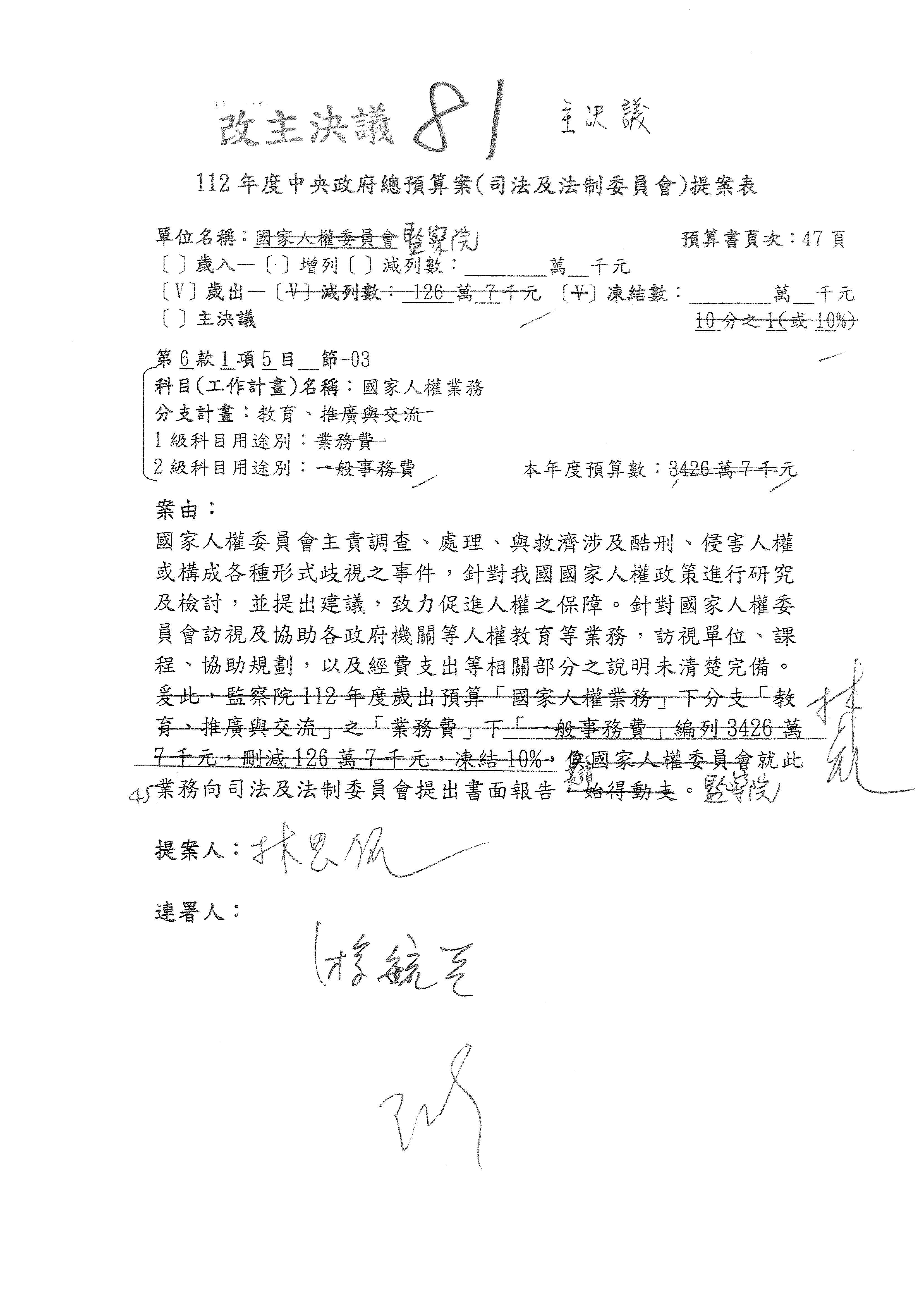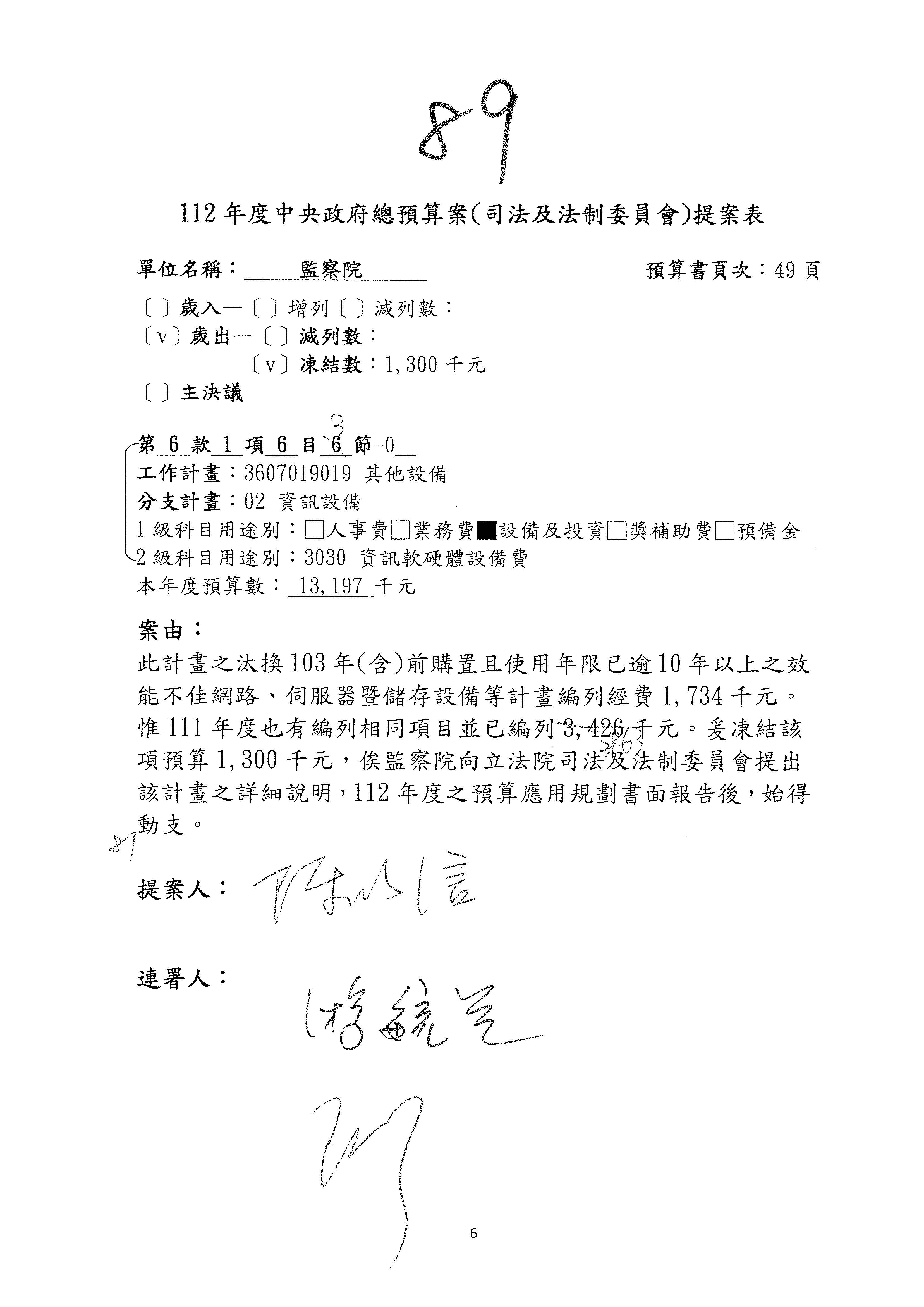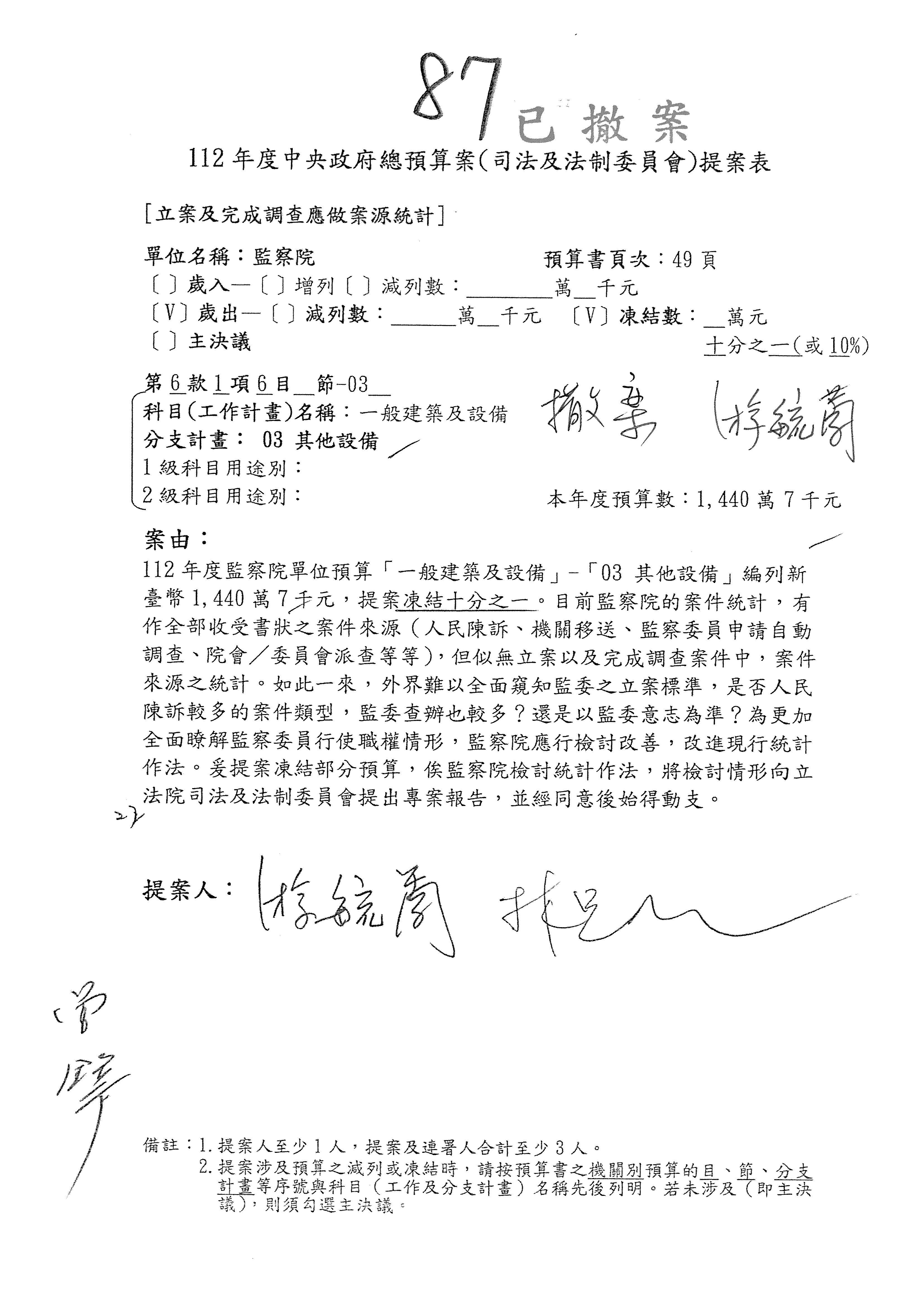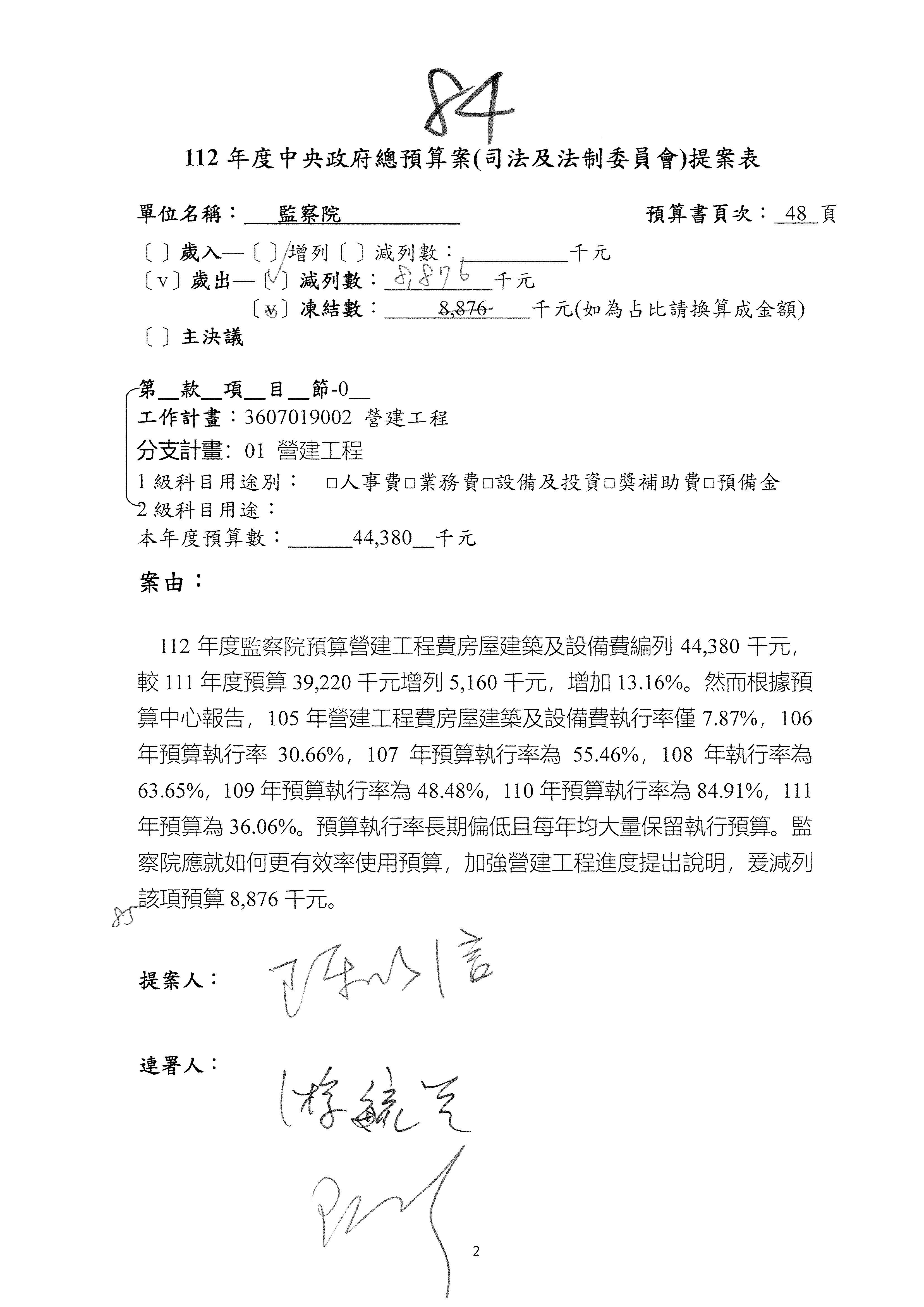 主席:好,第6款第1項第6目「一般建築及設備」,提案案號第83案至第90案,其中第87案撤案;第88案改為主決議,合併凍結50萬元,並針對各凍結提案之要求,依審查會決議提出書面報告後始得動支。