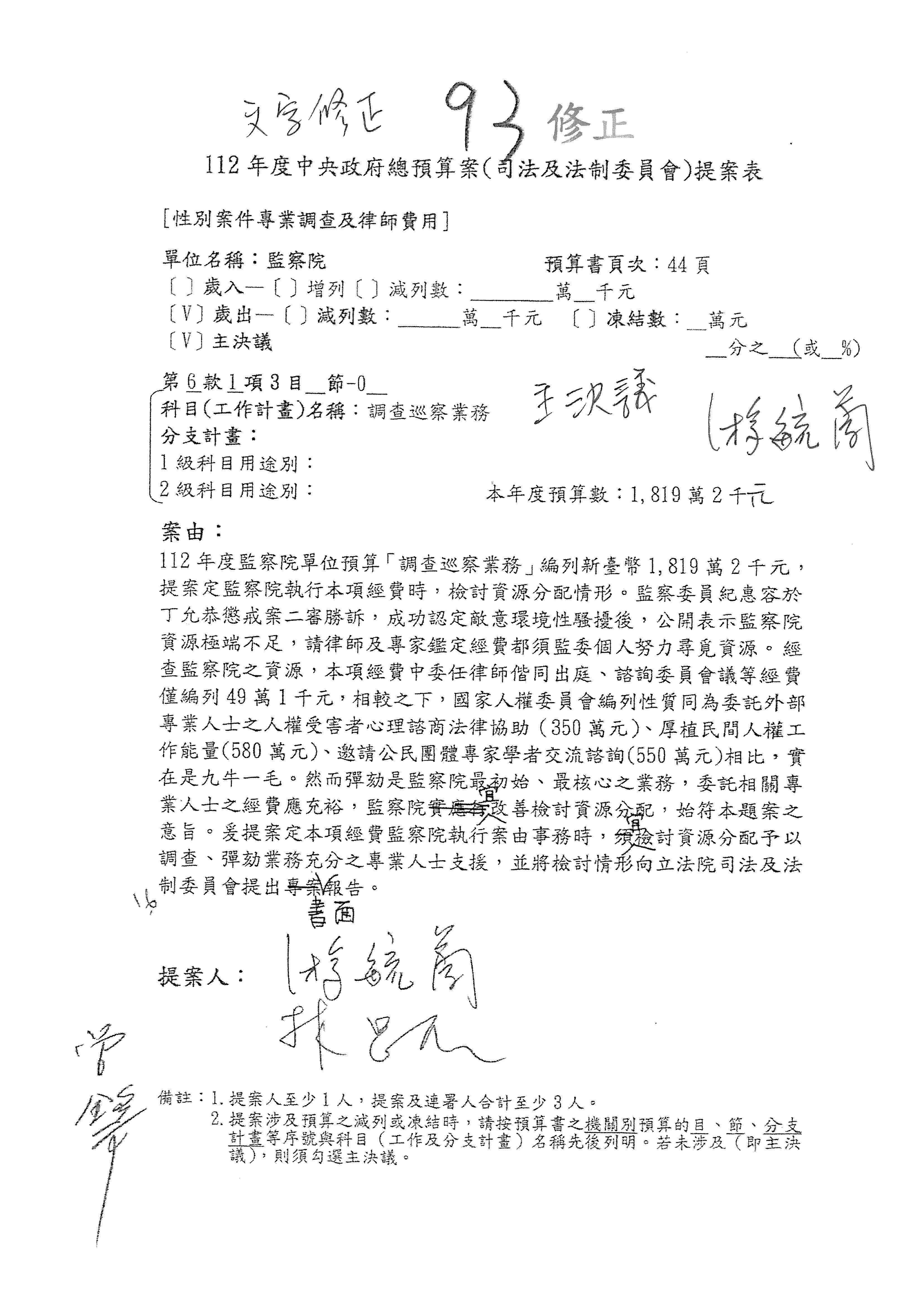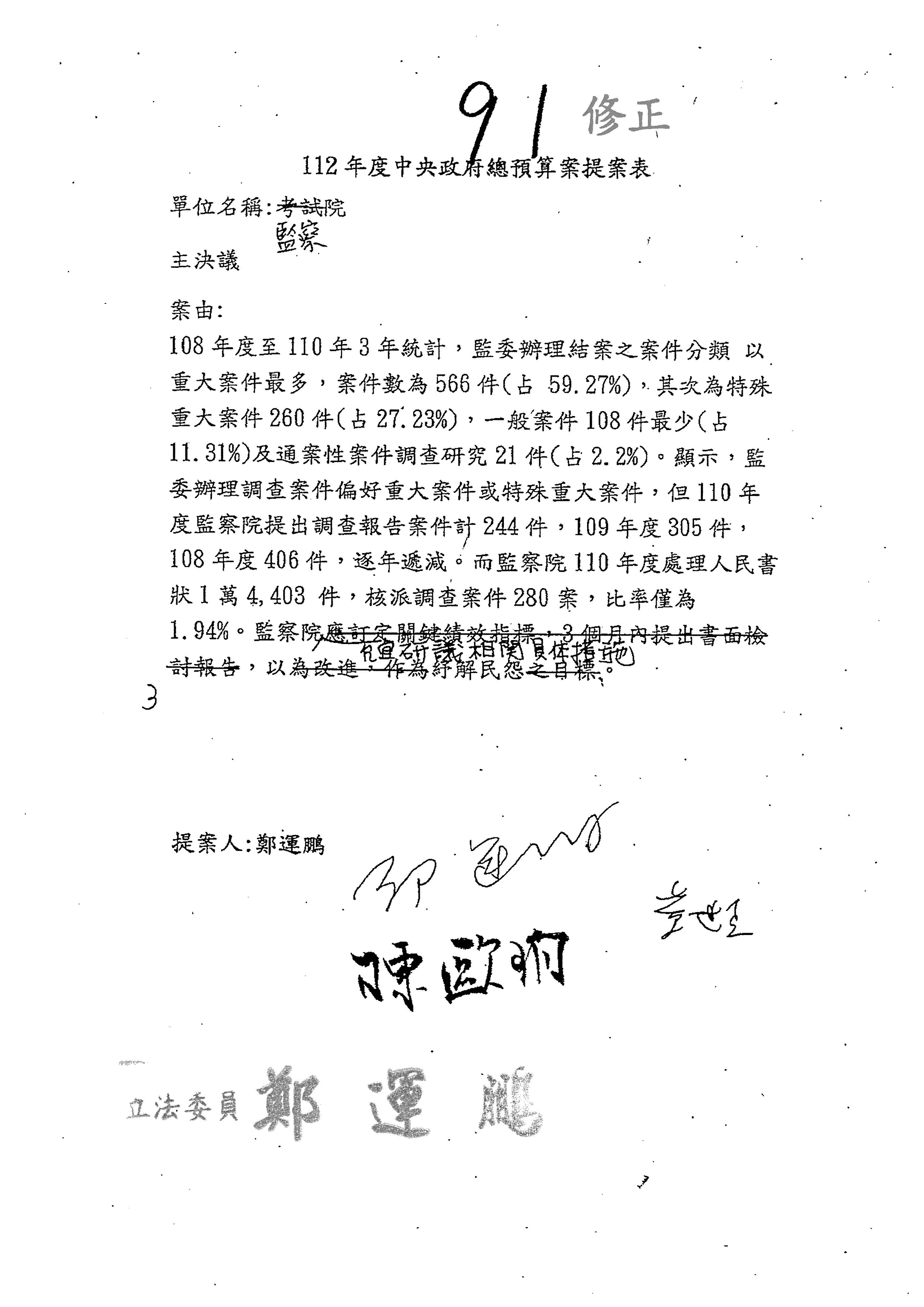 接著處理歲出第6款第1項,監察院之主決議,提案案號第91案至第95案,我們逐案處理。都沒意見吧!都已經講好了,都溝通好了吧!沒有意見,好。第6款第1項的主決議,提案第91案至第95案,其中第94案、第95案照案通過;第91案、第92案、第93案修正通過。關於經提案委員同意修正之提案內容,於委員簽名後請送至主席臺,並列入公報紀錄。
