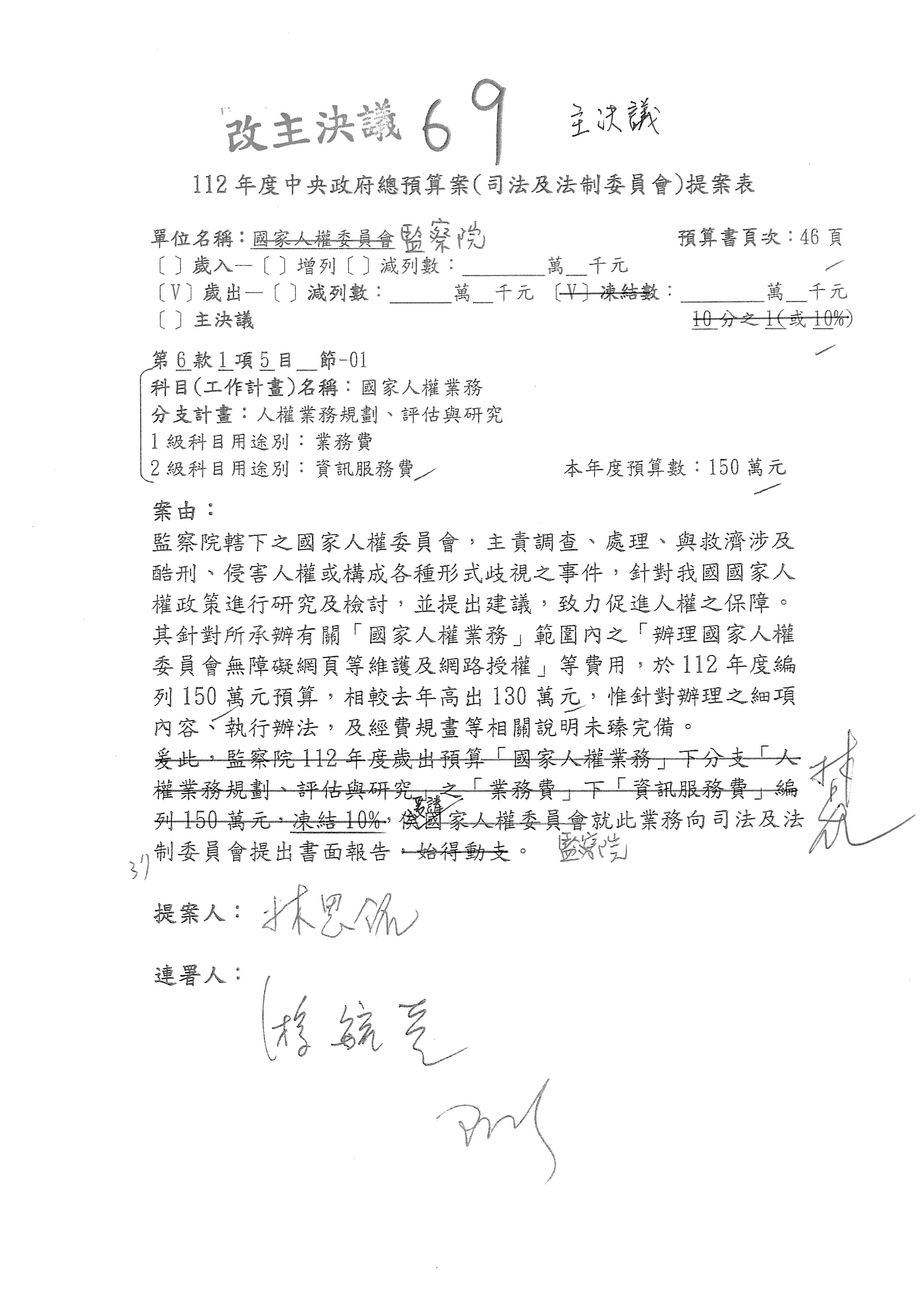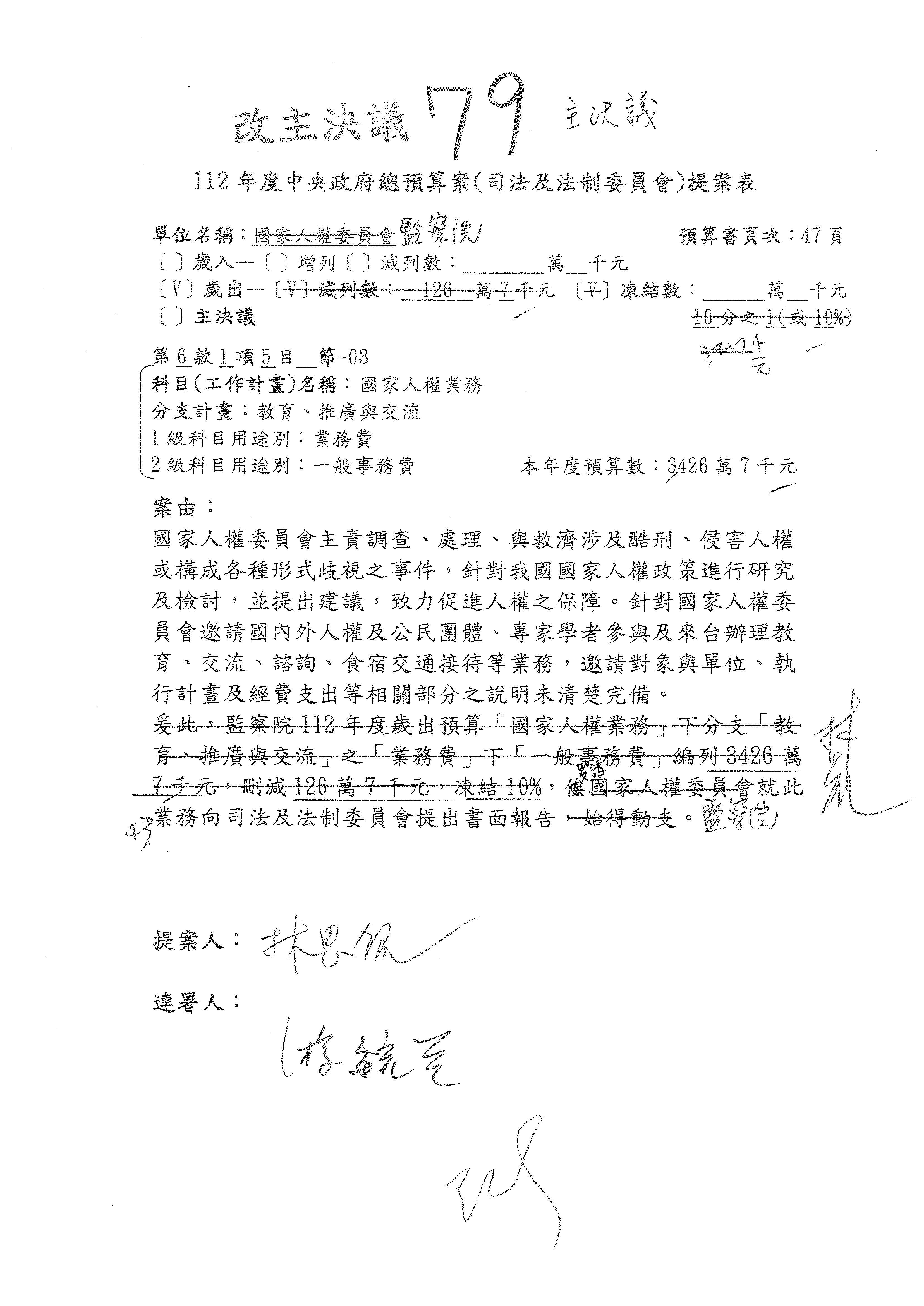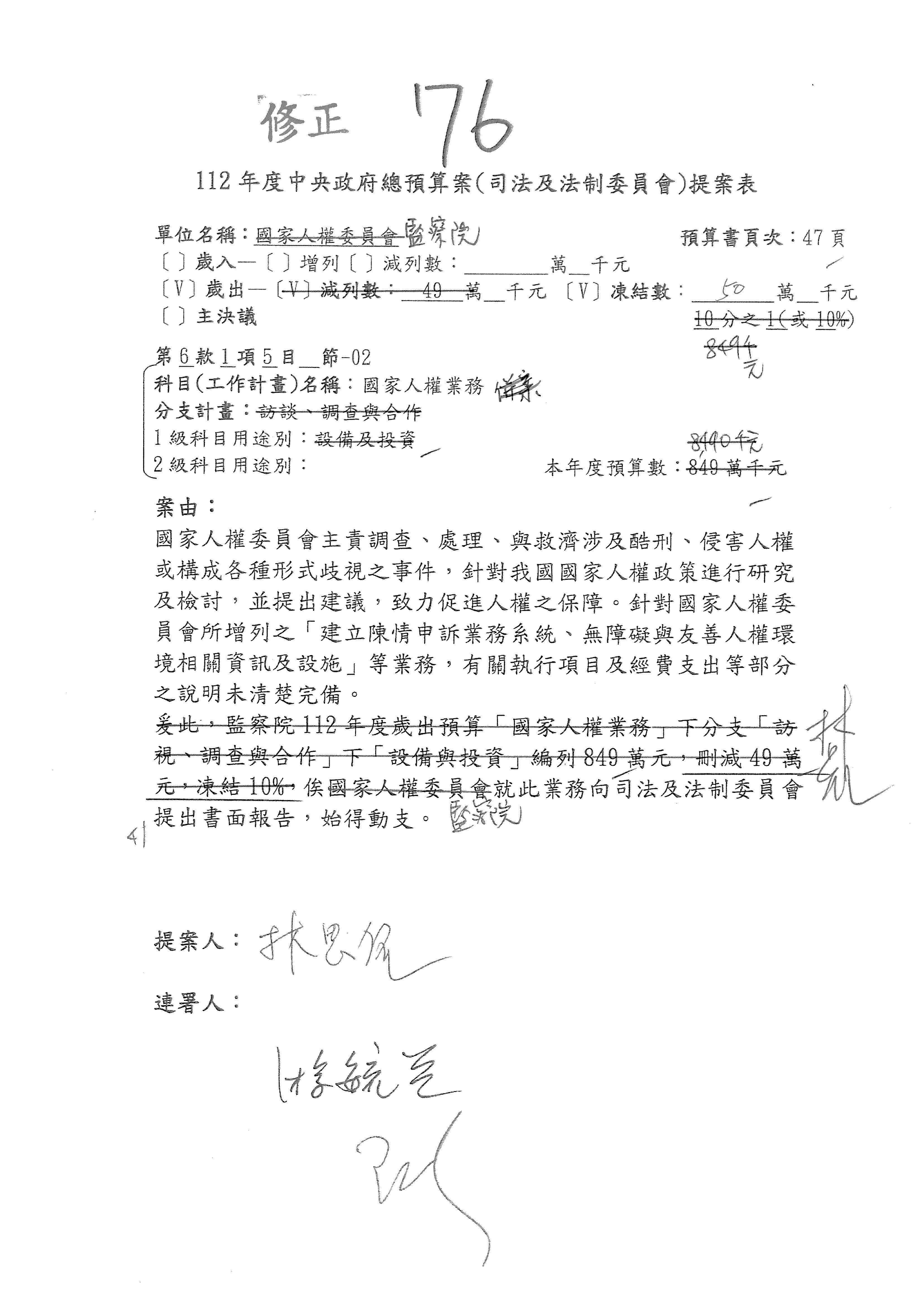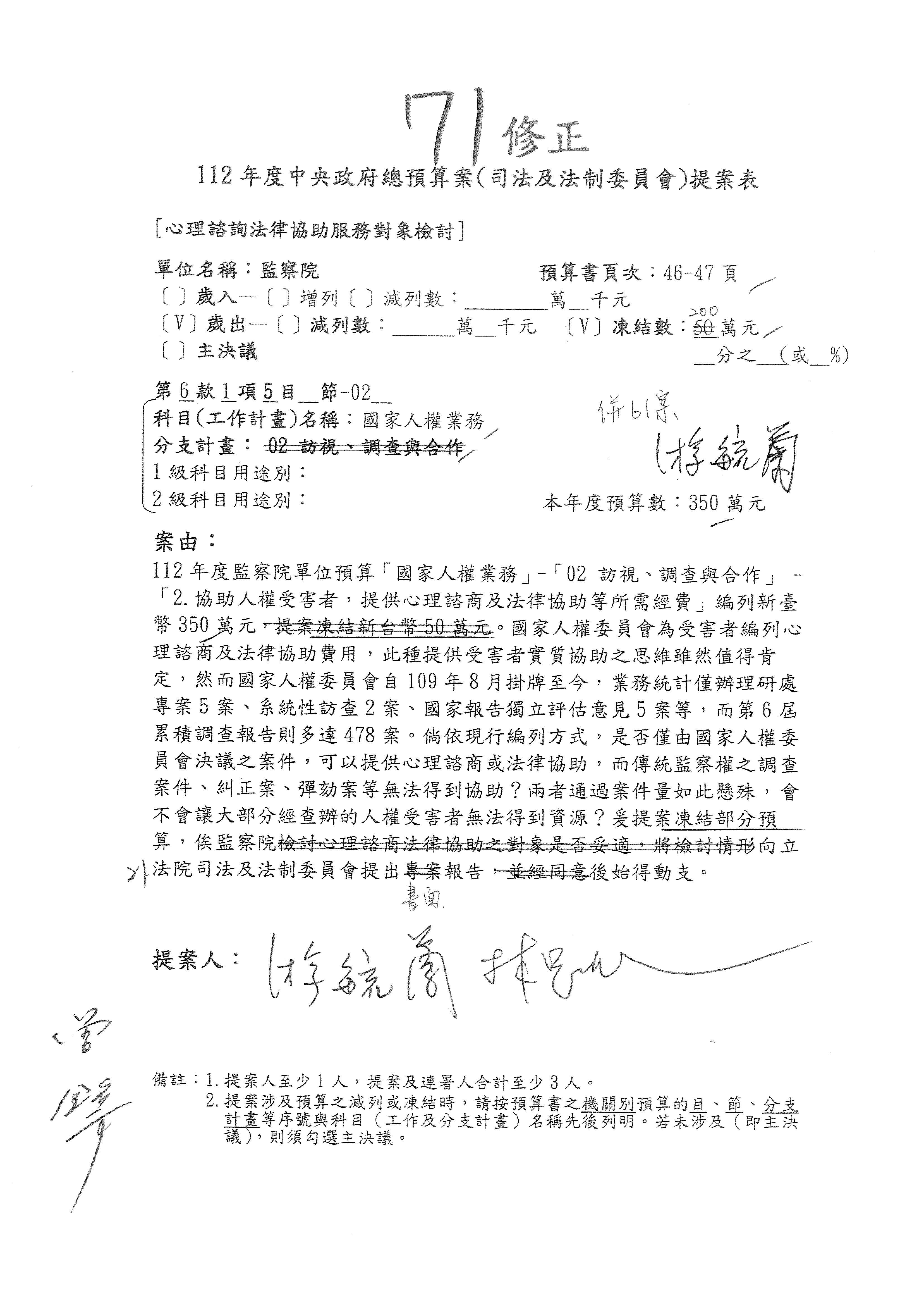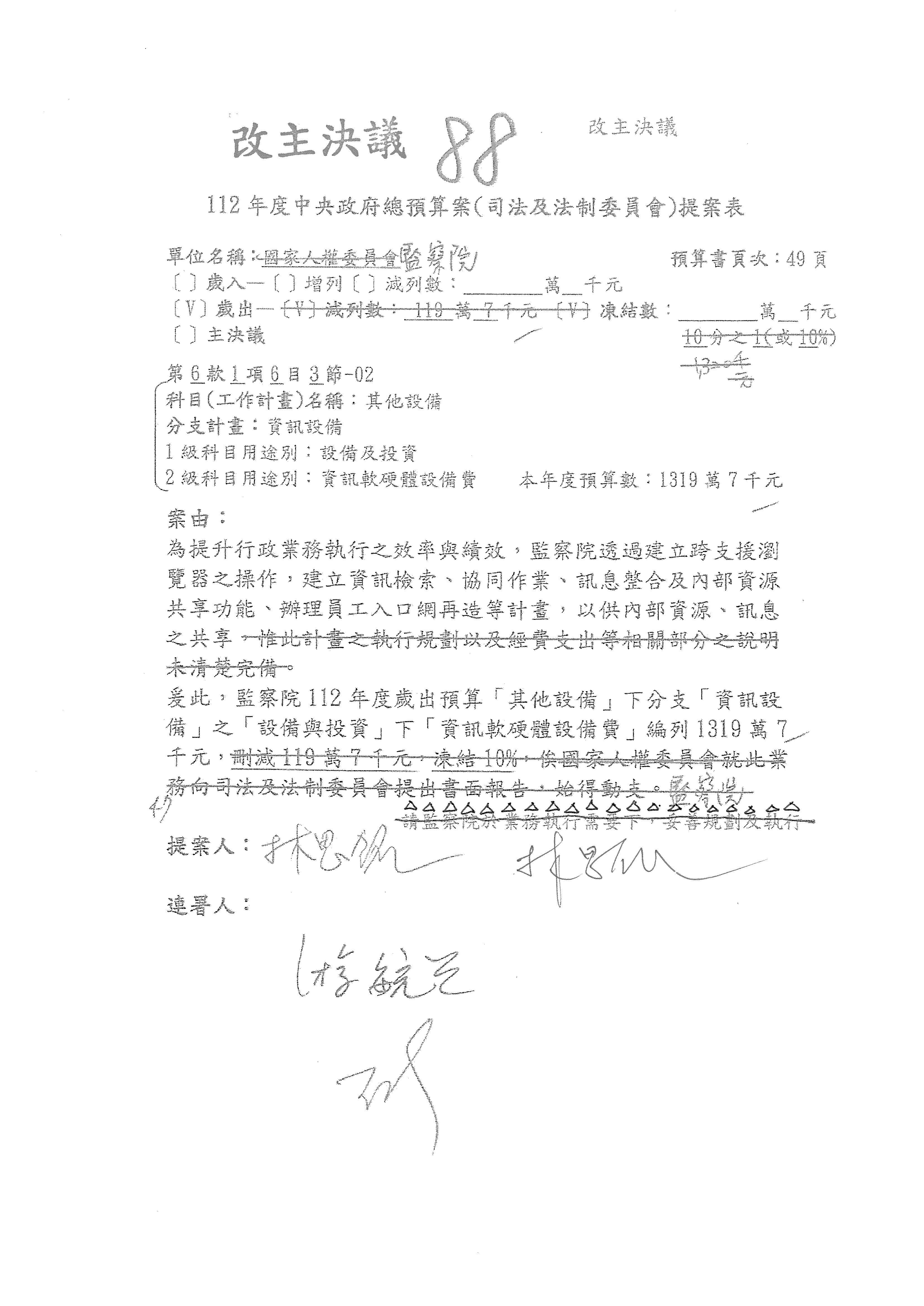 朱秘書長富美:我們都是配合法令修改的,因為法令有修改,我們的影片當然也要改,還有開放民眾參觀跟互動,向外界宣導監察職權。剛才游毓蘭委員還鼓勵我們跟人權委員會分擔經費,讓外界多認識我們,包括建築古蹟、人權業務,還有陳列室的展板更新及維護,這些都有利於人權教育,也是一種公民教育,讓民眾知道監察院人權行使跟人權工作的成果,而且經費其實也不多。