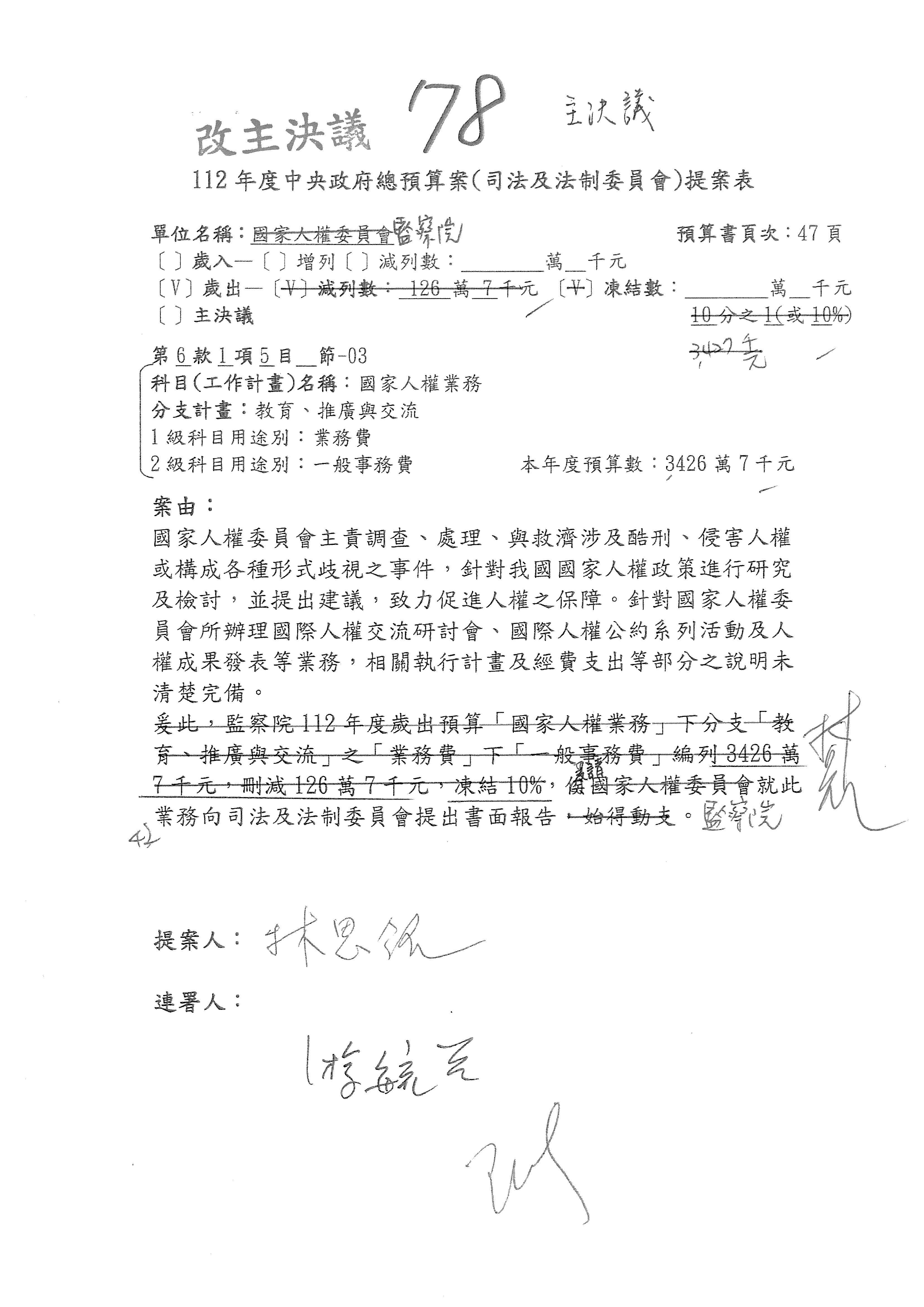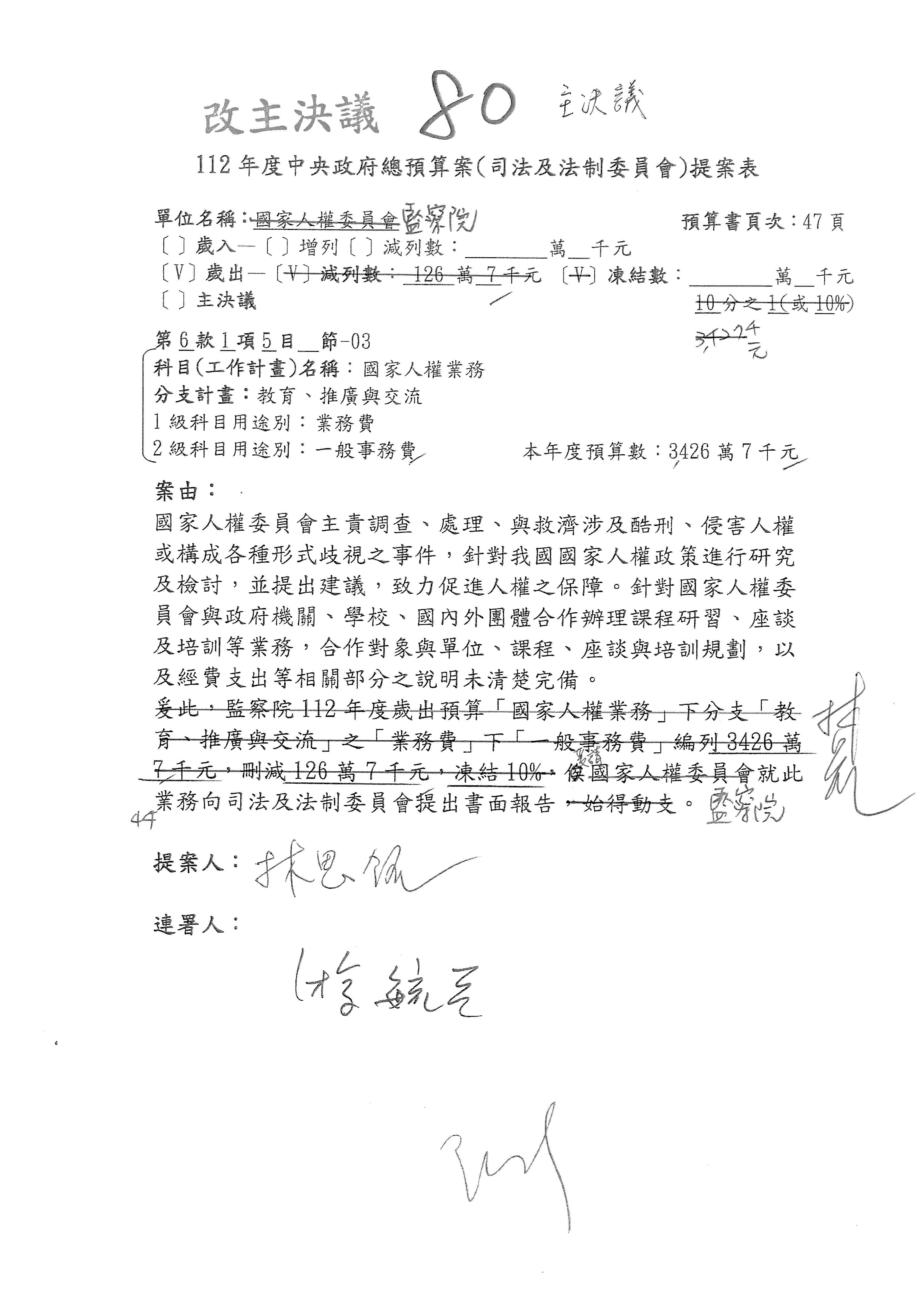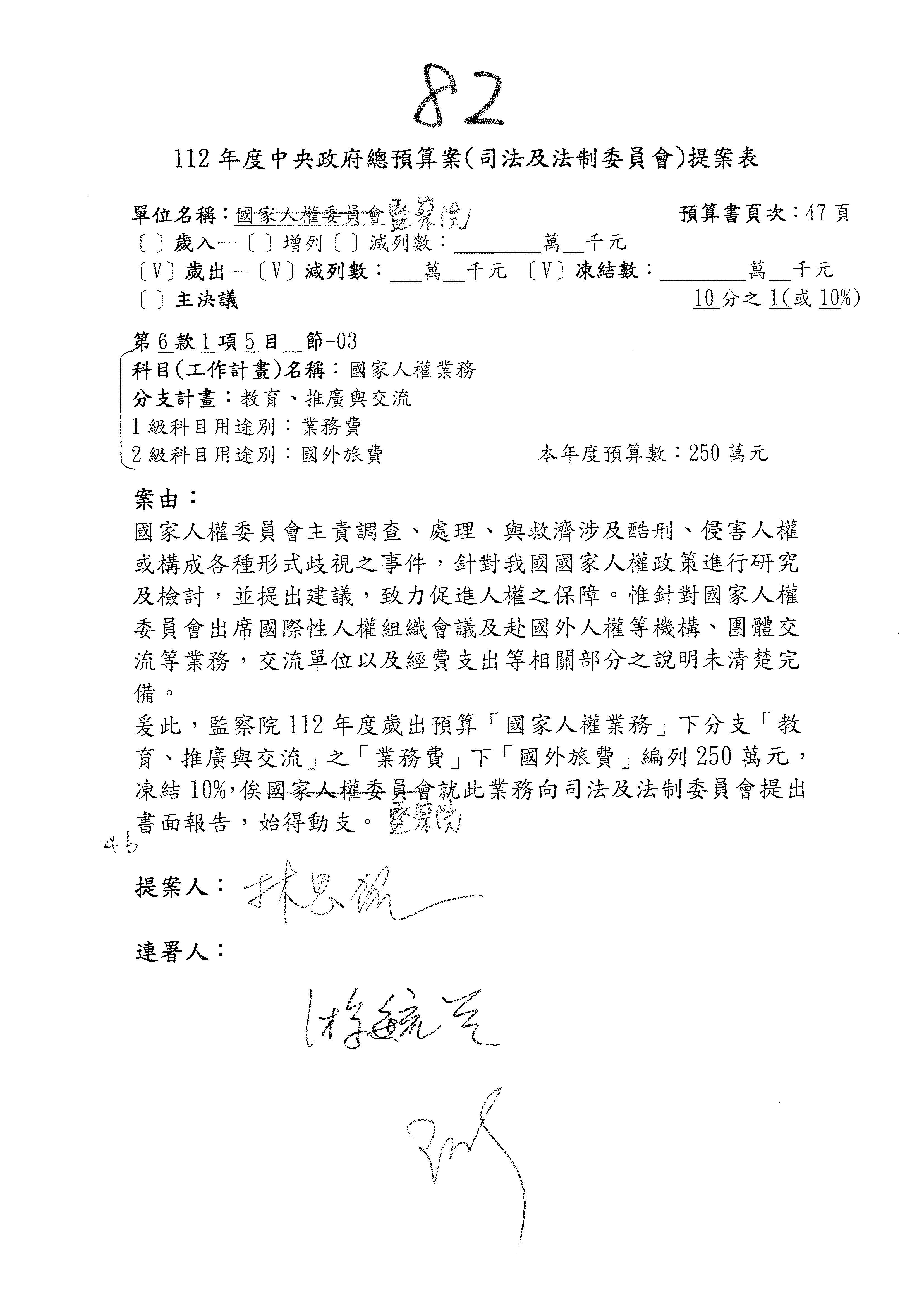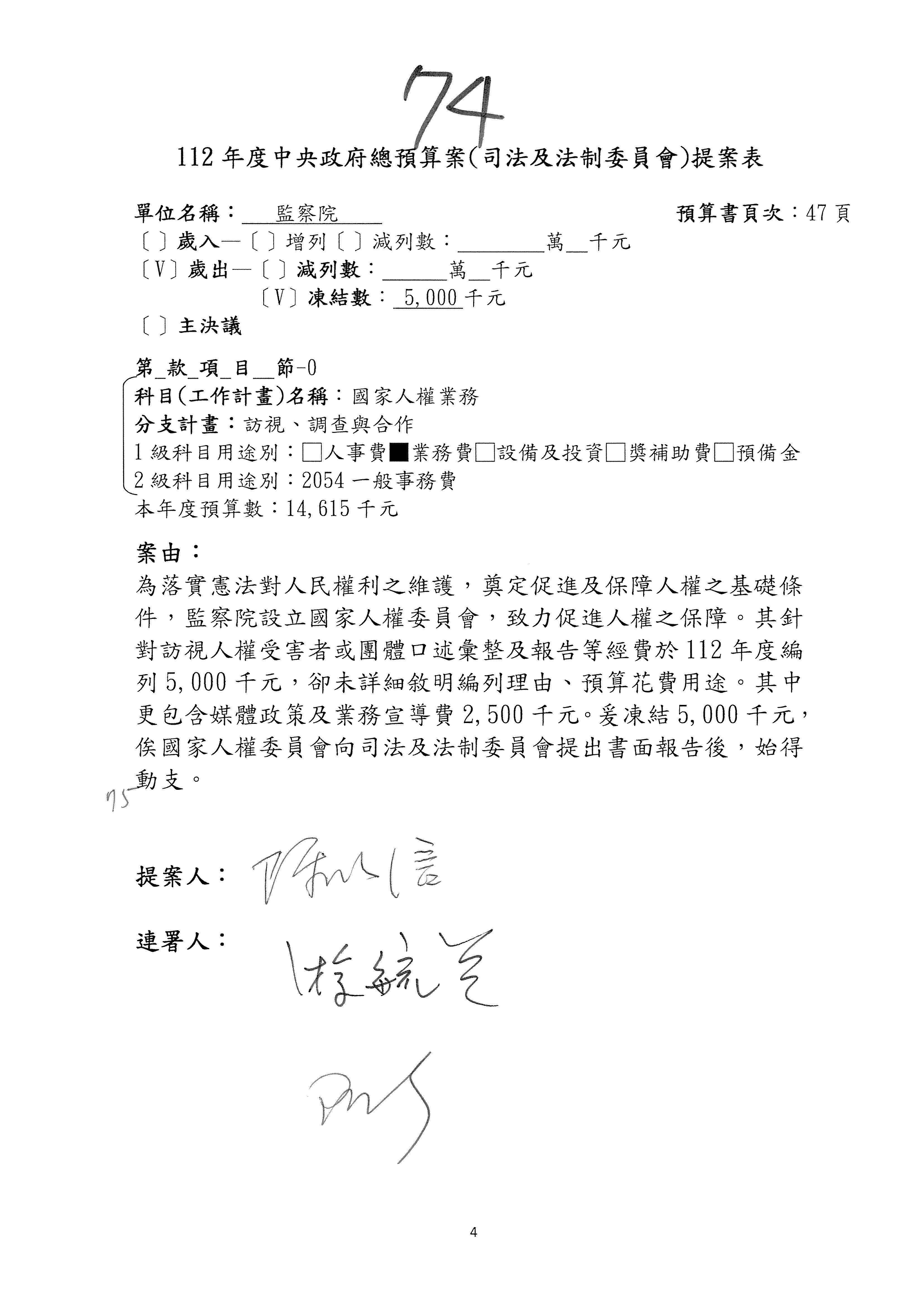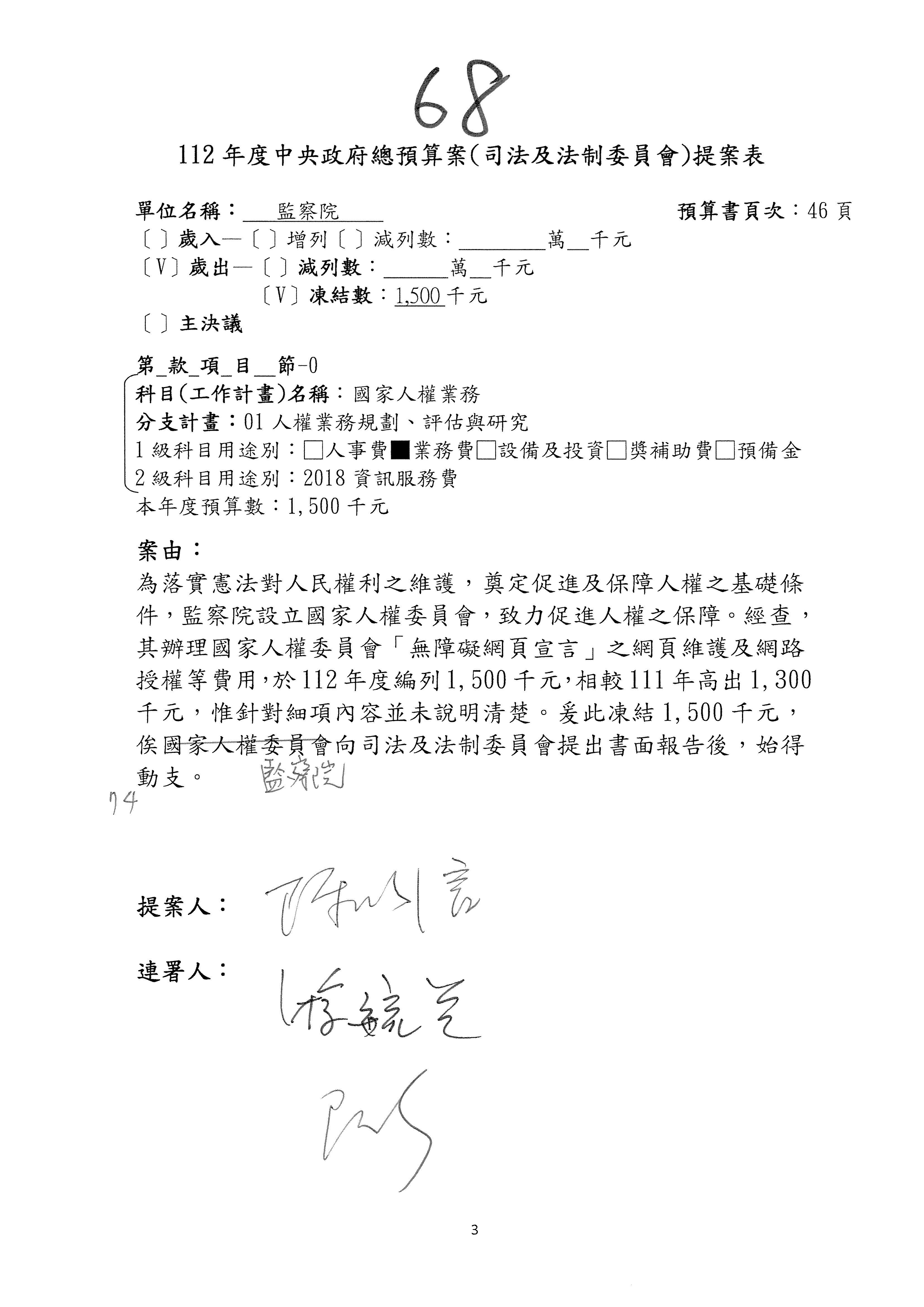 朱秘書長富美:我們都是配合法令修改的,因為法令有修改,我們的影片當然也要改,還有開放民眾參觀跟互動,向外界宣導監察職權。剛才游毓蘭委員還鼓勵我們跟人權委員會分擔經費,讓外界多認識我們,包括建築古蹟、人權業務,還有陳列室的展板更新及維護,這些都有利於人權教育,也是一種公民教育,讓民眾知道監察院人權行使跟人權工作的成果,而且經費其實也不多。