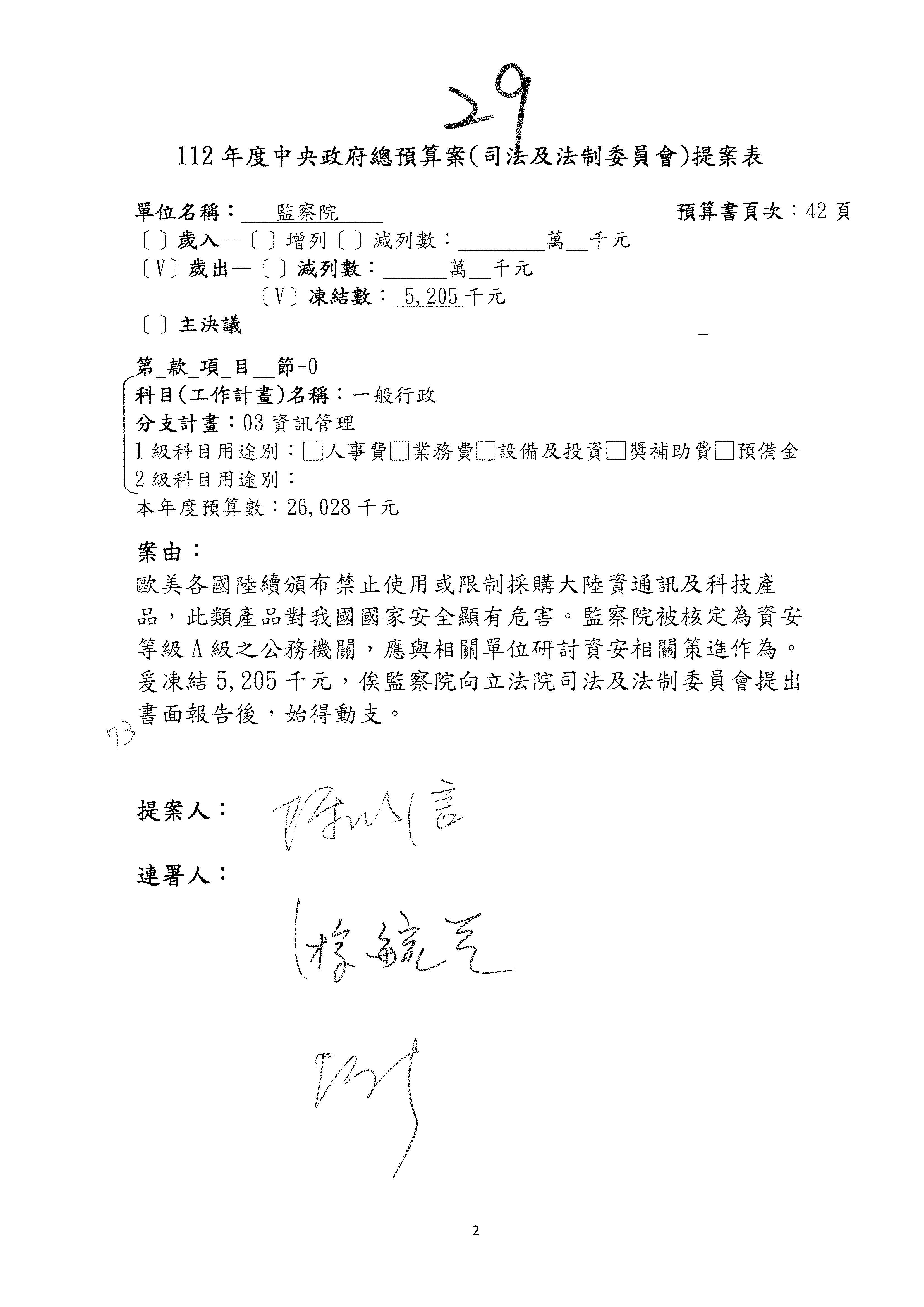 二、監察院函,為111年度中央政府總預算決議,檢送決議(一)預算凍結書面報告,請查照案。