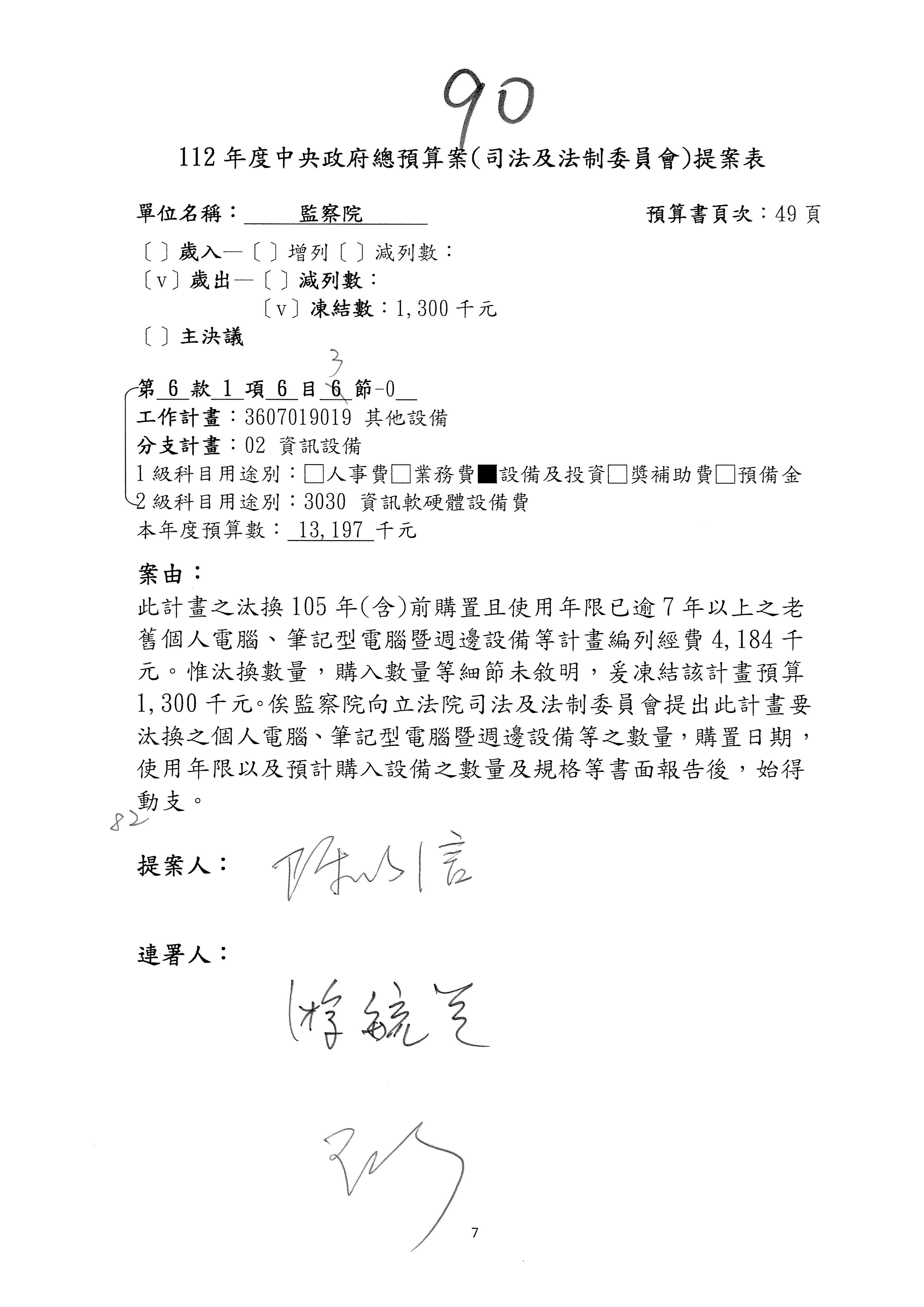 七、監察院函,為111年度中央政府總預算決議,檢送決議(六)預算凍結書面報告,請查照案。