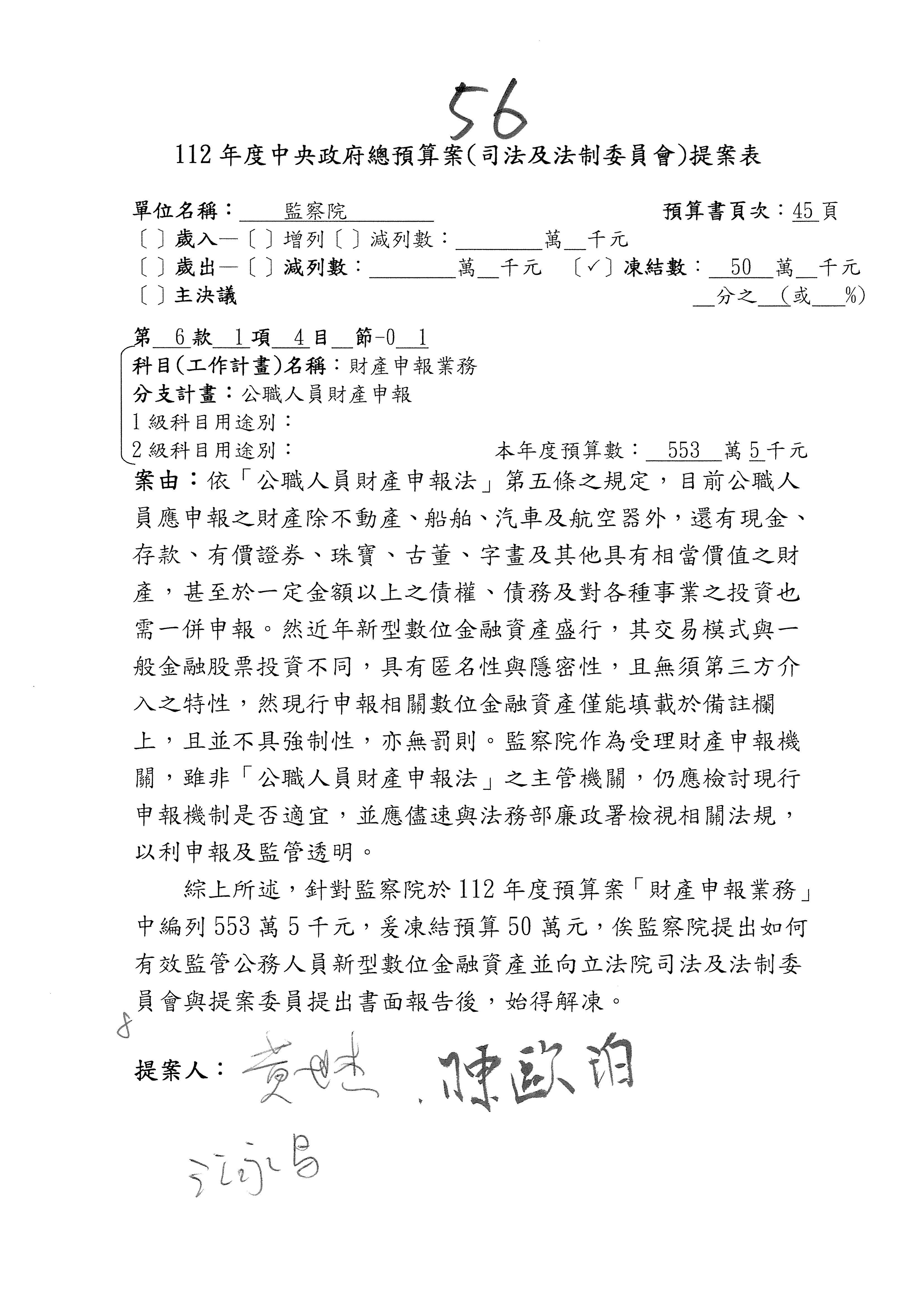 陳委員玉珍:請說明。一般行政分成好幾個案子凍結。