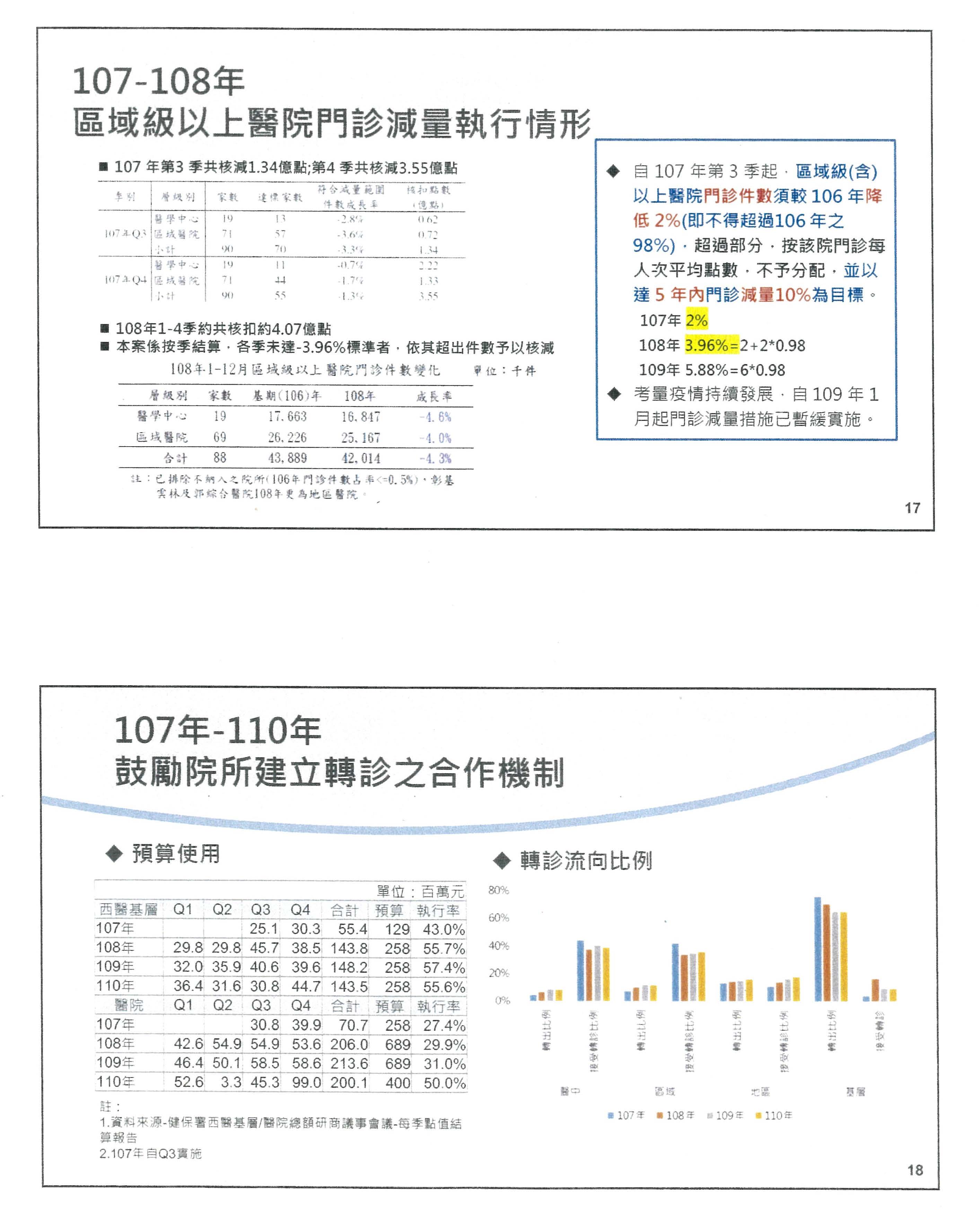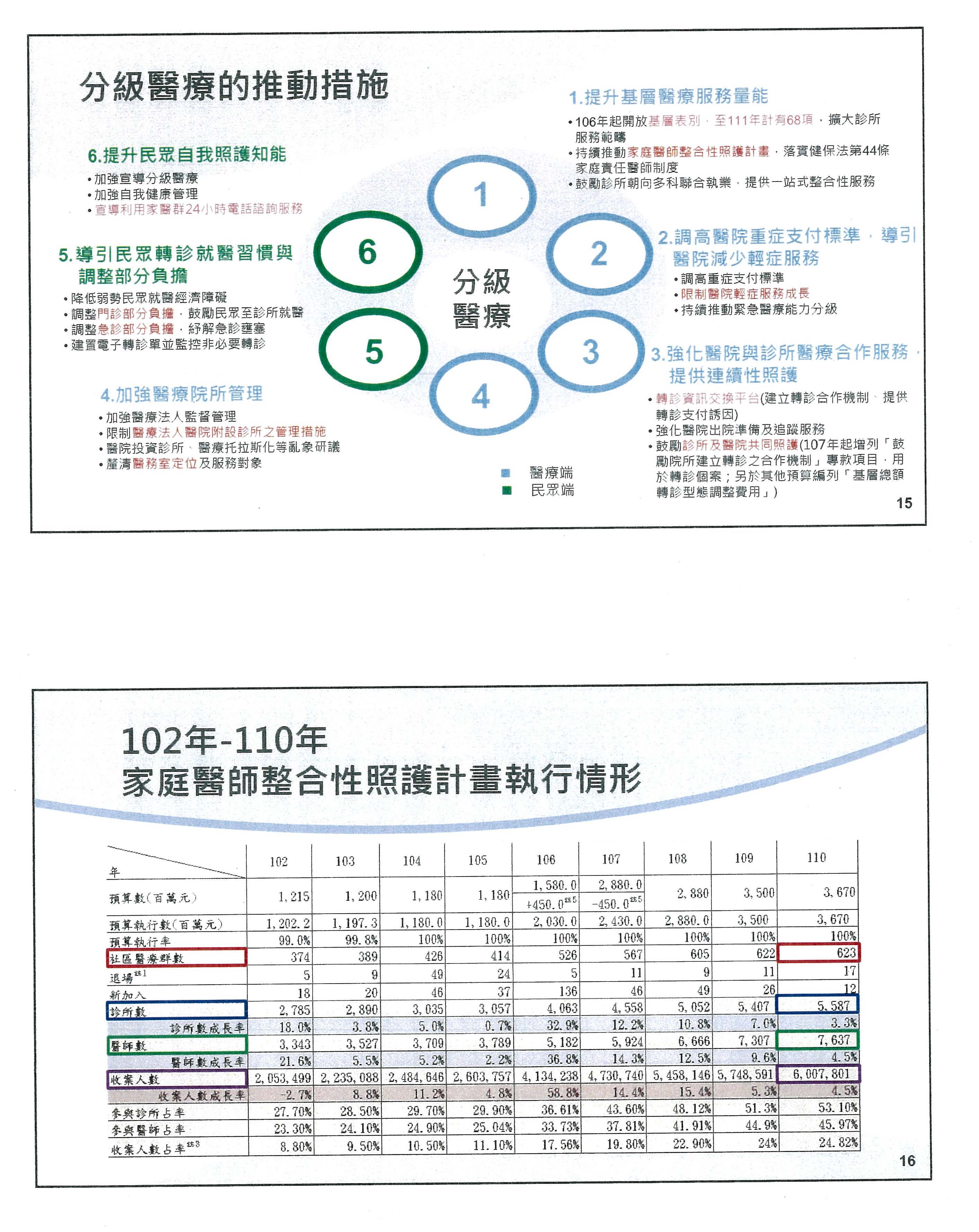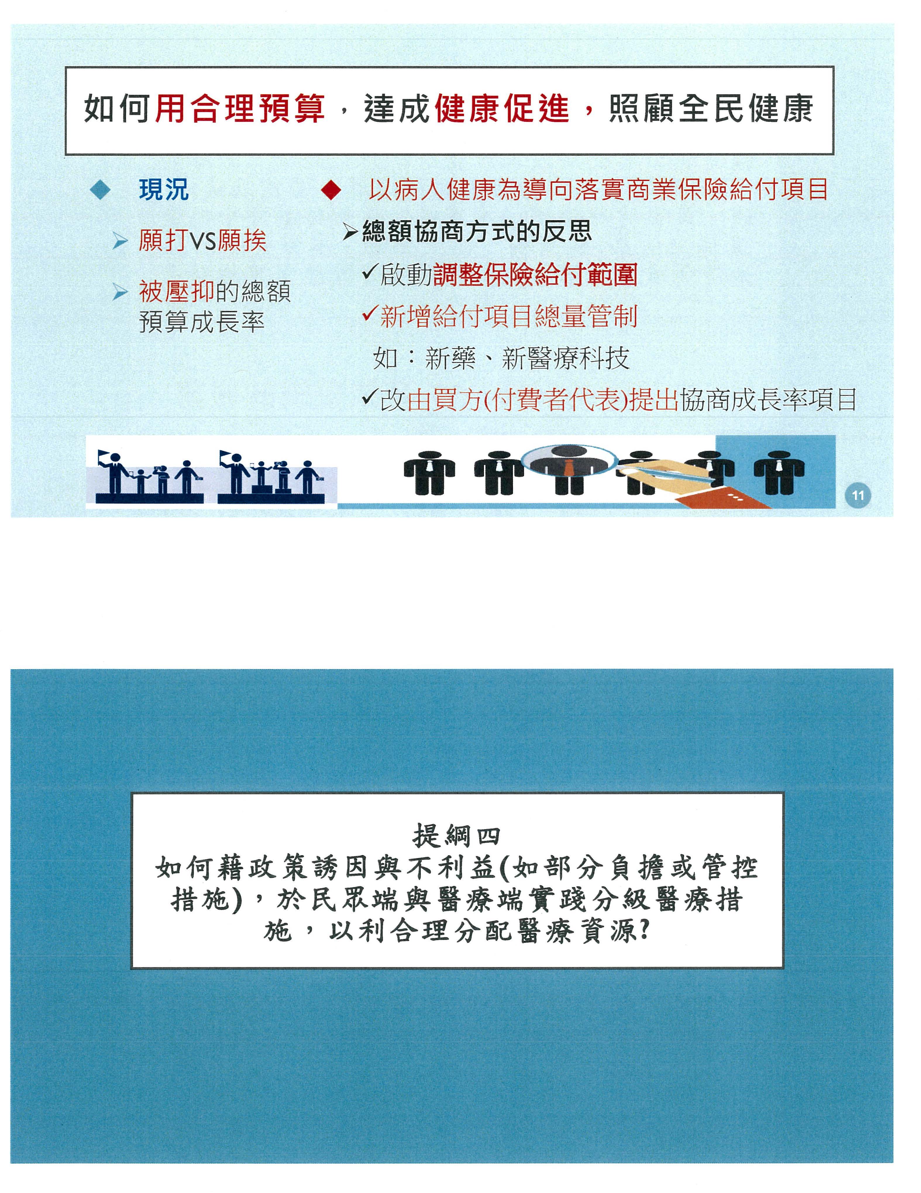 第三個,有鑑於這樣的政策方向,所以我們在這次也提出中長程改革計畫,這就是考慮到所有醫療的改革必須搭配整個健保共同來推動,所以它並不是用健保費用來做,而是用公務預算搭配在健保體系制度之上來得到一個綜效,這是最主要的精神,舉例而言,有幾個重點,這次在推動的時候,非常強調的第一個就是PAC系統的完備跟長照的銜接,這幾年長照系統越來越健全,體系已經差不多將近完成,所以怎樣讓國人在罹病之後,在三段五級的後段,從PAC到復能、復健跟長照銜接的部分做得更有效率、更好,減少不斷地反覆就醫,這是一個。第二個當然就是分級醫療制度會繼續推動,特別是對剛剛提到的預防保健、健康促進等等,如何在分級醫療上去呈現,所以我們現在正著手進行家庭醫師整合計畫的檢討,把過去很多國健署或其他單位的預防保健、健康促進的工作與家庭醫師制度結合,以強大基層,落實家庭醫師制度,甚至透過醫療群轉診制度、醫療網等各項的結合,讓我們的體系更有效能,民眾也能夠得到更好的健康。第三個,剛剛大家在簡報裡也看到,有些兒童健康指標是落後在相比對的國家,所以也提出優化兒童醫療照顧計畫,推動0到3歲幼兒都有一個專責醫師,這也是分級醫療的一部分,剛剛提到已經少子化,需要更健康的下一代,所以這個部分,我們也是爭取公務預算要積極投入,所以剛剛提到的不論是幼兒的專責醫師制度,或者是預防保健的擴大,這些都是於公務預算爭取增加之後,結合健保體系的推動,以達到加乘綜效。