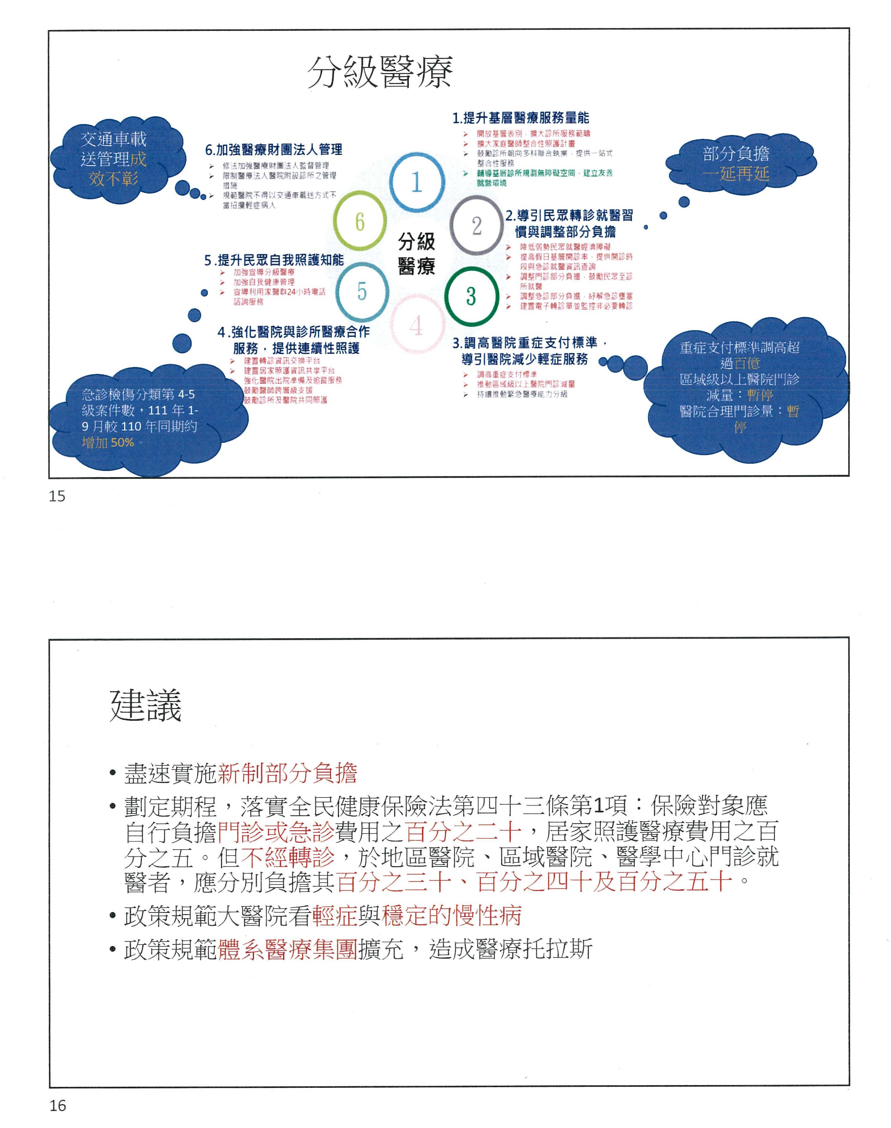 我們的具體建議是,第一個,健保費率該調就應該調;第二個,部分負擔的實施應該要符合使用的正義,但是要顧慮到醫療經濟弱勢者的使用權益;第三個,我們也贊成商業保險要適度地去補位全民健保,讓合理的理賠率,在此能對全民健保有一些相輔相成的效果;第四個,政府應該編列適度的預算來補助,當然這一點就有賴現場的委員們,可能必須在法令上做個修正。以上報告,謝謝。