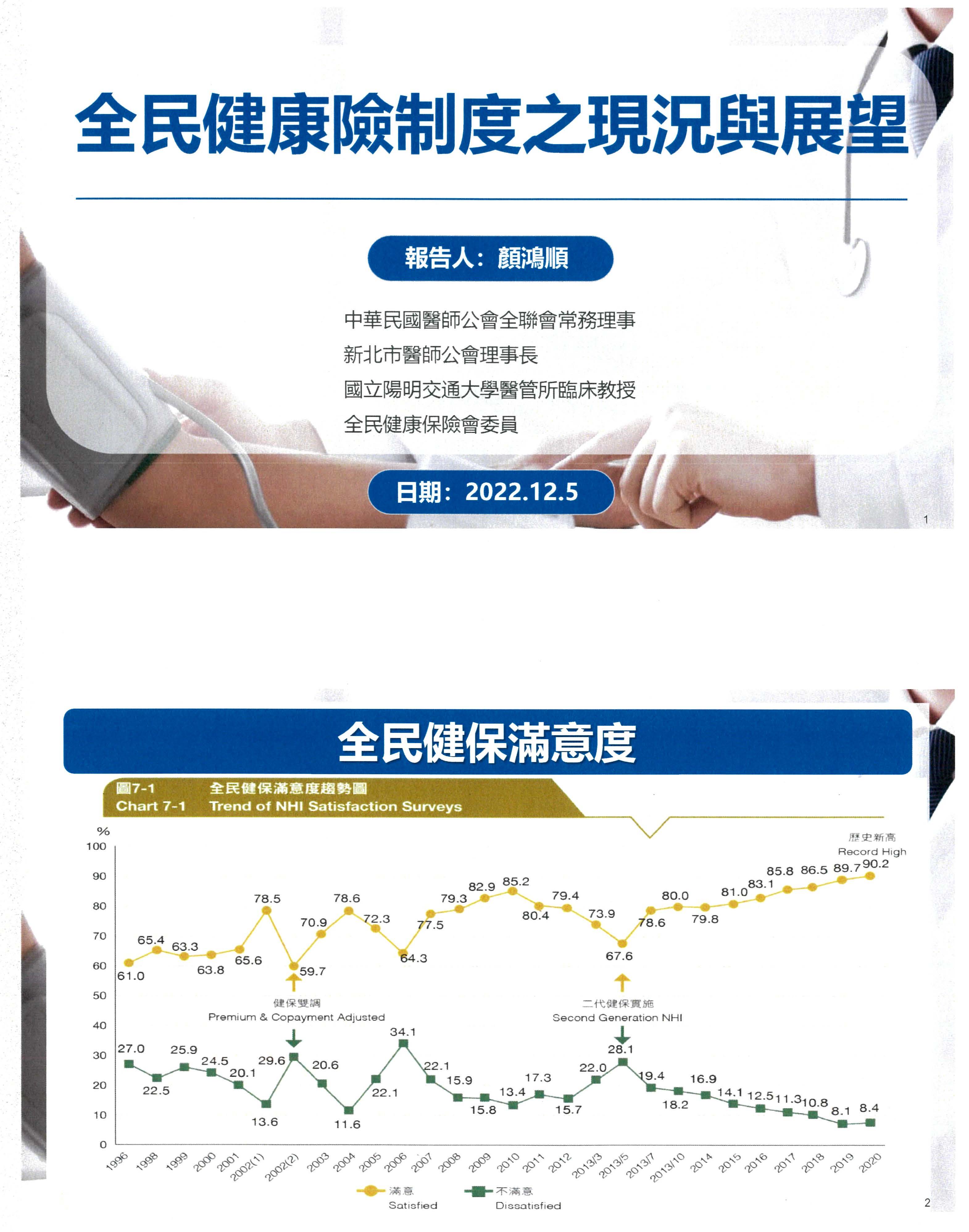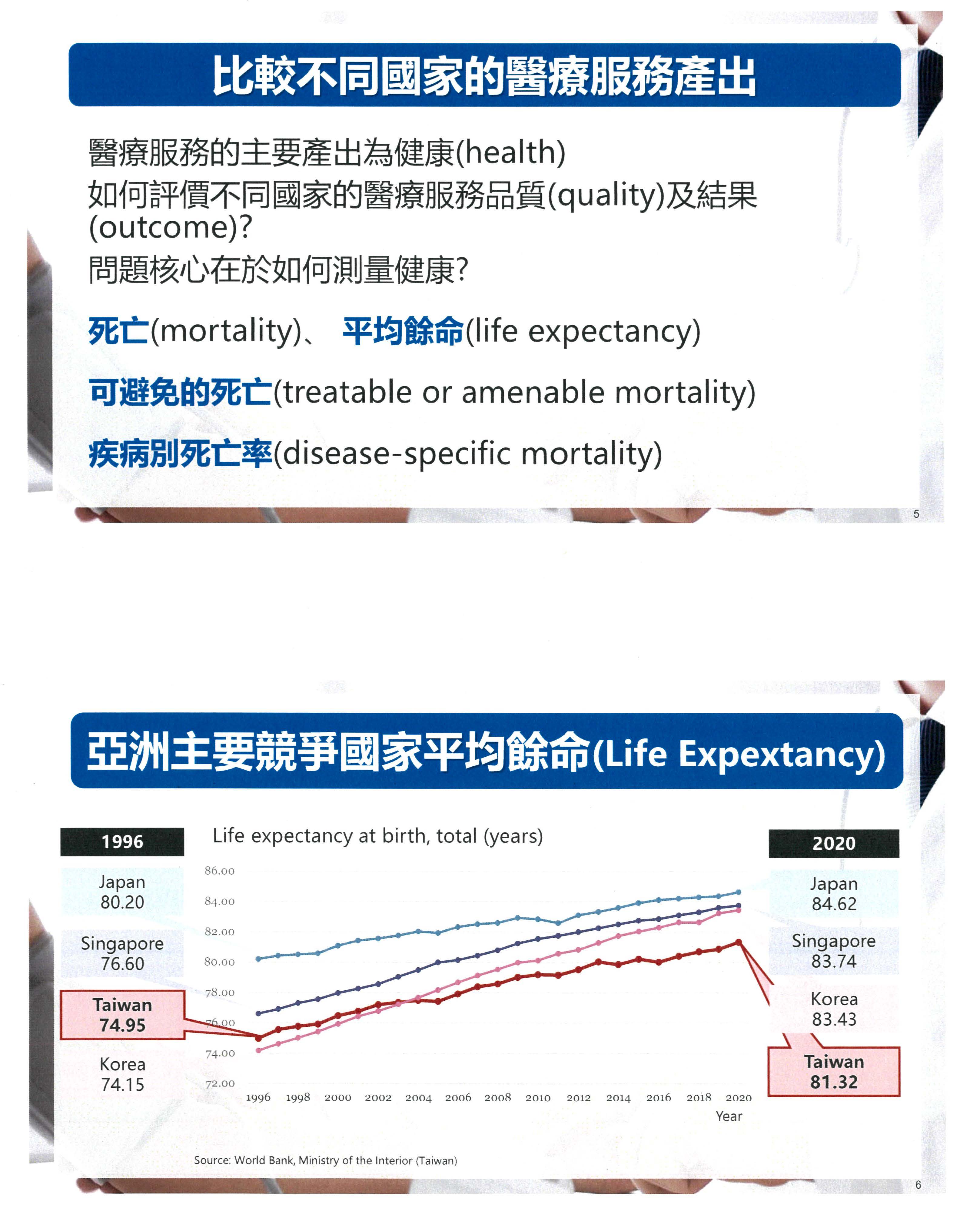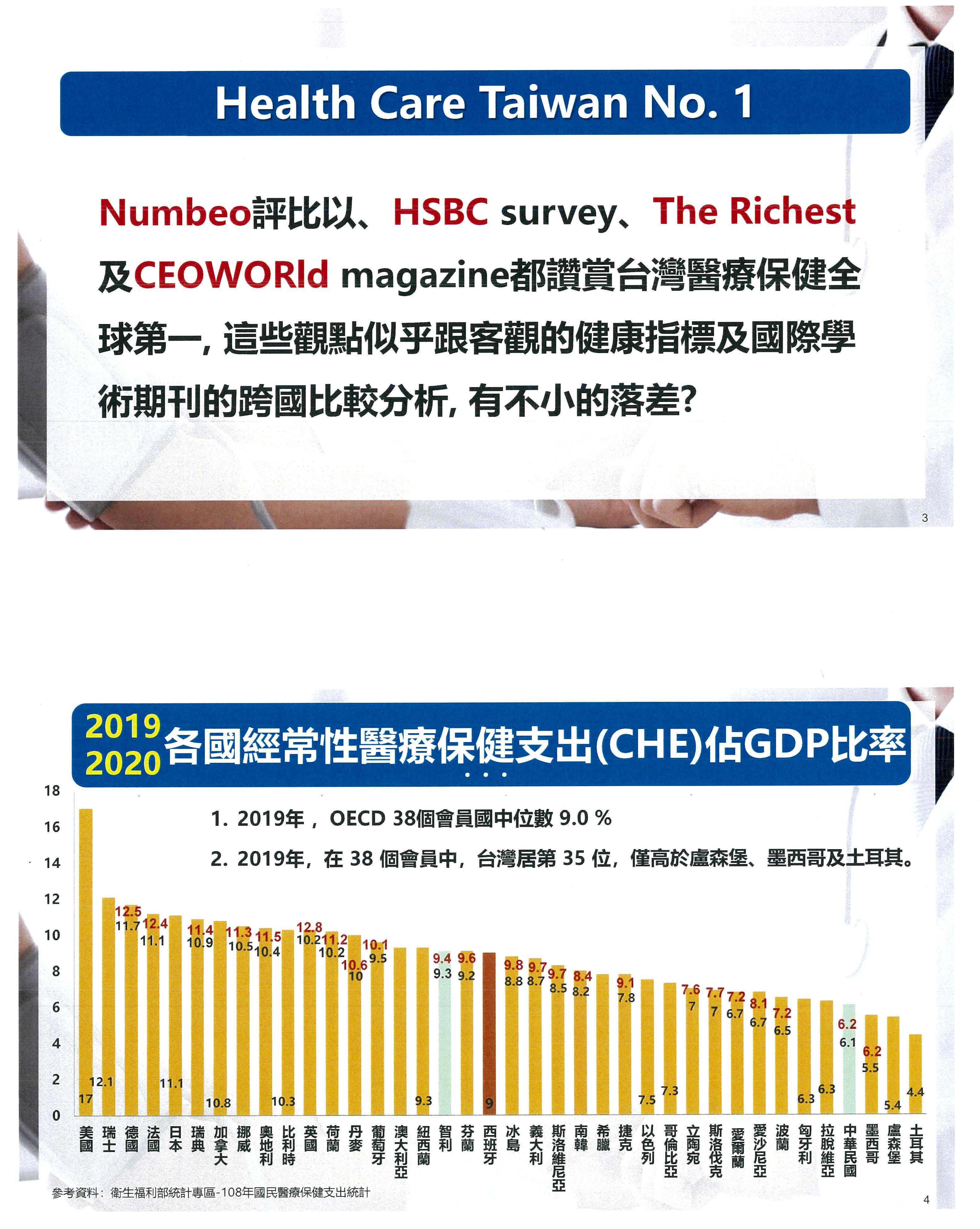 顏鴻順常務理事:主席、委員、各位長官、各位學者專家,大家午安。我是醫師公會全聯會常務理事,在這裡跟大家報告。我想大家都非常熟悉,全民健保從1995年實施到現在它的滿意度一直都高達八成,甚至在今年疫情期間,還曾經突破到92% ,這個就面臨到剛才鄭守夏老師講的,民眾滿意度這麼高,我們還需要改善什麼東西呢?甚至在國際的這些雜誌Numbeo、HSBC 等等也都對臺灣的全民健保盛讚,這是一個非常好的制度,但是這些指標似乎都是針對國際CEO、國際往來的主管,或者旅客所做的一些問卷調查,跟國際上的一些客觀的健康指標,跟一些期刊的比較其實是有點落差。這張簡報大家都非常的熟悉,臺灣CHE占比在OECD國家裡頭,我們大概都是在6.1%,疫情的第1年,我們提高到6.2%,跟墨西哥是一樣的,是倒數第三名。OECD國家裡頭,他的平均中位數在8.8%,我們所知道的鄰近國家南韓在8.2%。所以從這裡我們就知道,國際認為臺灣人民對臺灣健保的滿意度高似乎是因為臺灣的CP值高,不見得是它的品質非常的好,為什麼?我們從國際期刊的一些比較來看,剛才游毓蘭委員也提到全民健保其實就是要保障人民的健康,醫療服務的產出其實就是健康。我要問大家,全民健保實施了二十幾年,你有比較健康嗎?我們的國民有比較健康嗎?這就牽涉到一個問題,健康要怎麼去評估呢?國際上對健康的評估大概就是從國民的平均餘命來看,然後還有死亡率,特別是嬰兒的死亡率(infant mortality),或是可避免的死亡率,或是各種不同疾病別的死亡率,對此,我們跟世界各國的比較到底是怎麼樣呢?這是大家都熟悉的一個圖表,臺灣二十幾年前實施全民健保的時候,我們的平均餘命其實是贏過韓國的,那時我們是74.95歲,韓國是74.15歲,但全民健保實施了二十幾年,我們的平均餘命有沒有進步?當然有進步,而進步是可以比較的,別人若進步得比我們更多,表示我們就有更多進步的空間。