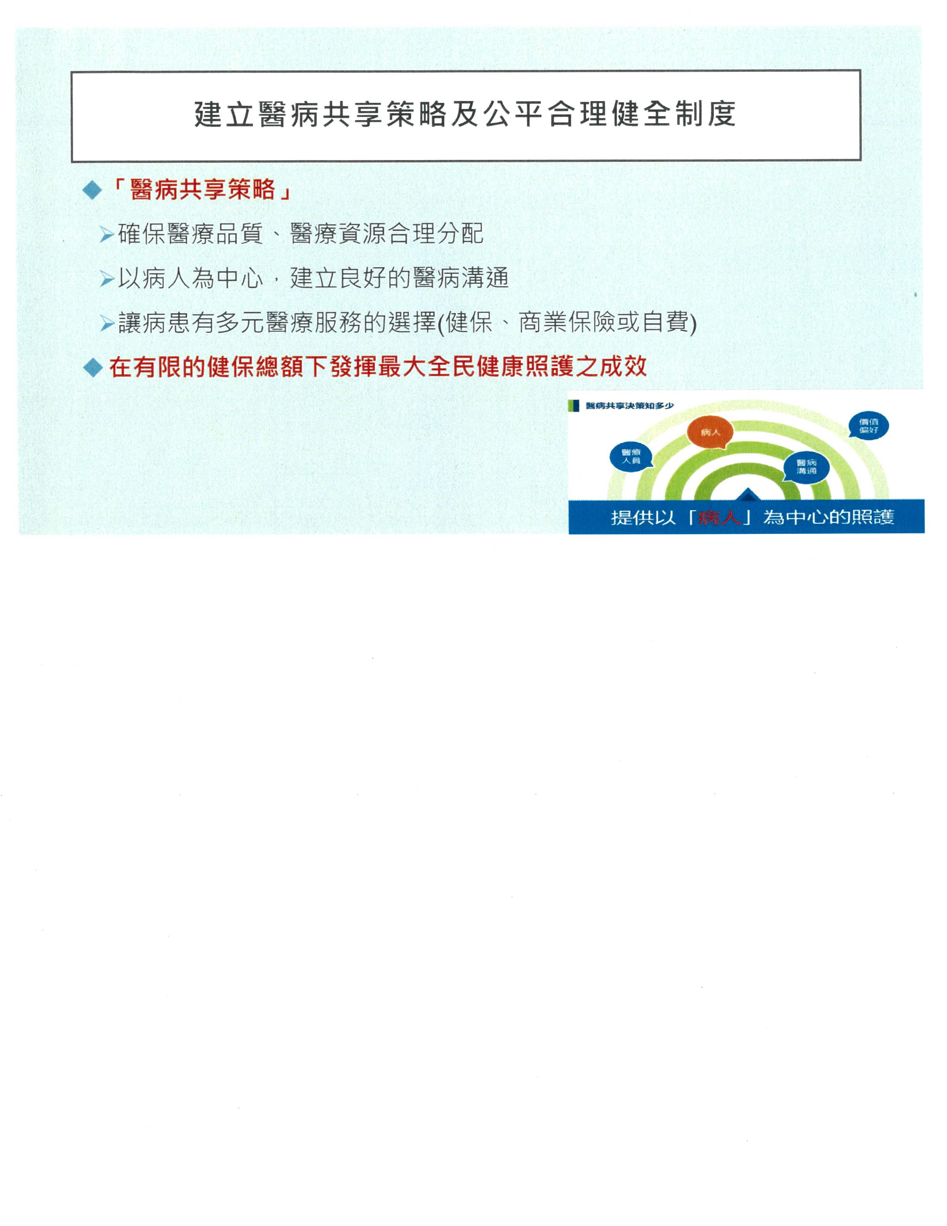 四、此外,健保署自104年起已建置病友意見分享平台,將病人意見作為納入新藥物收載時之參考,反映病人需求,使病人共同參與健保給付決策。