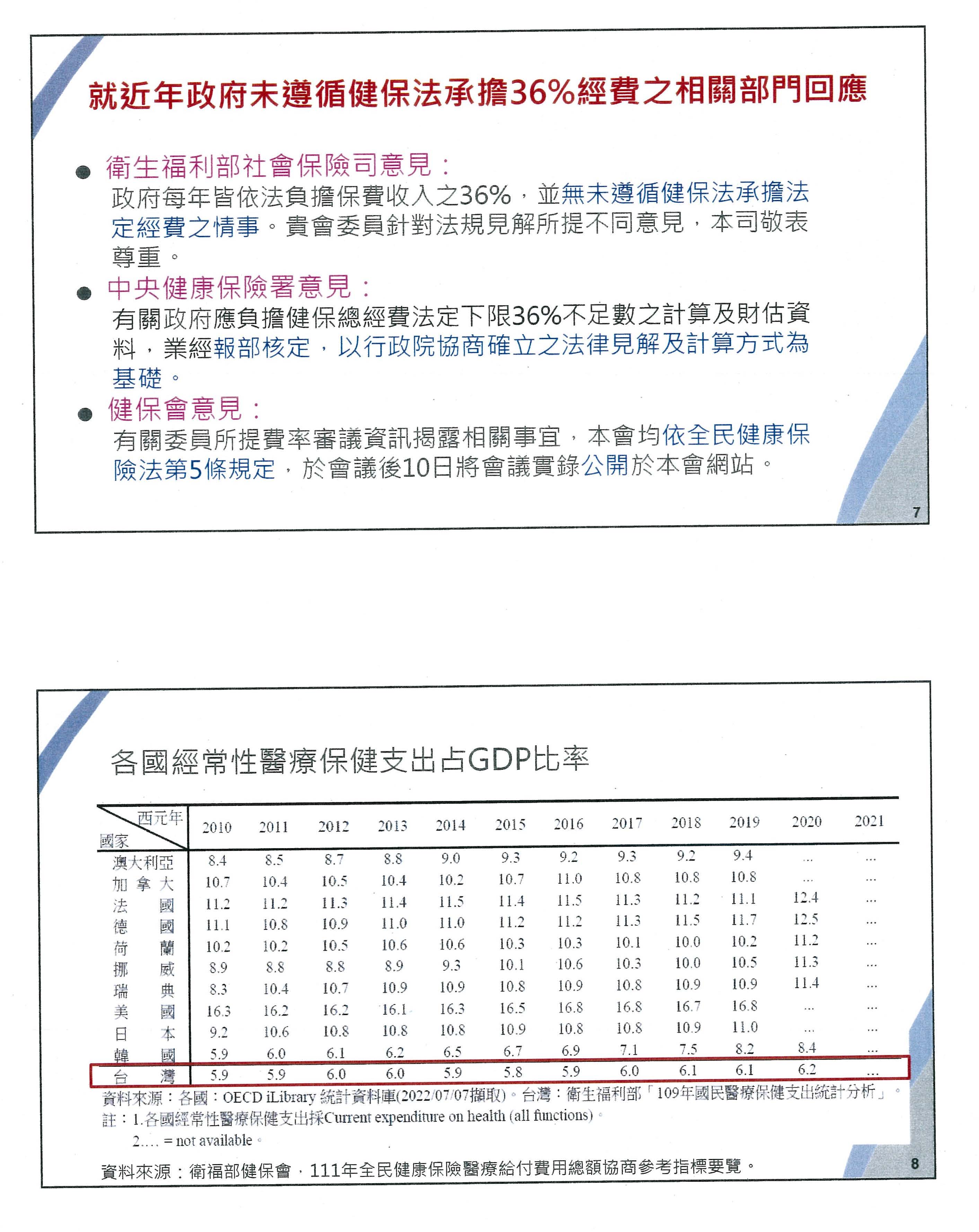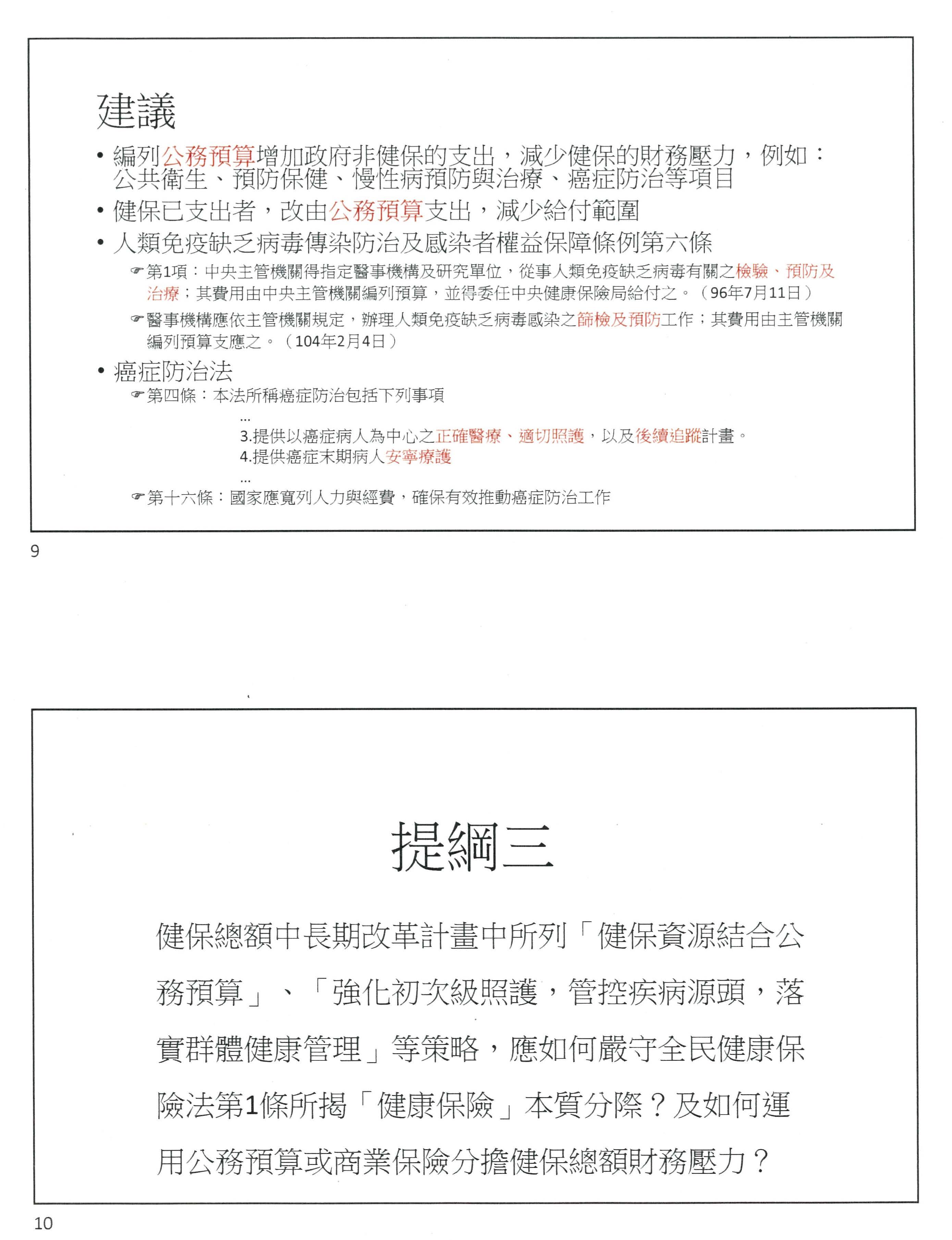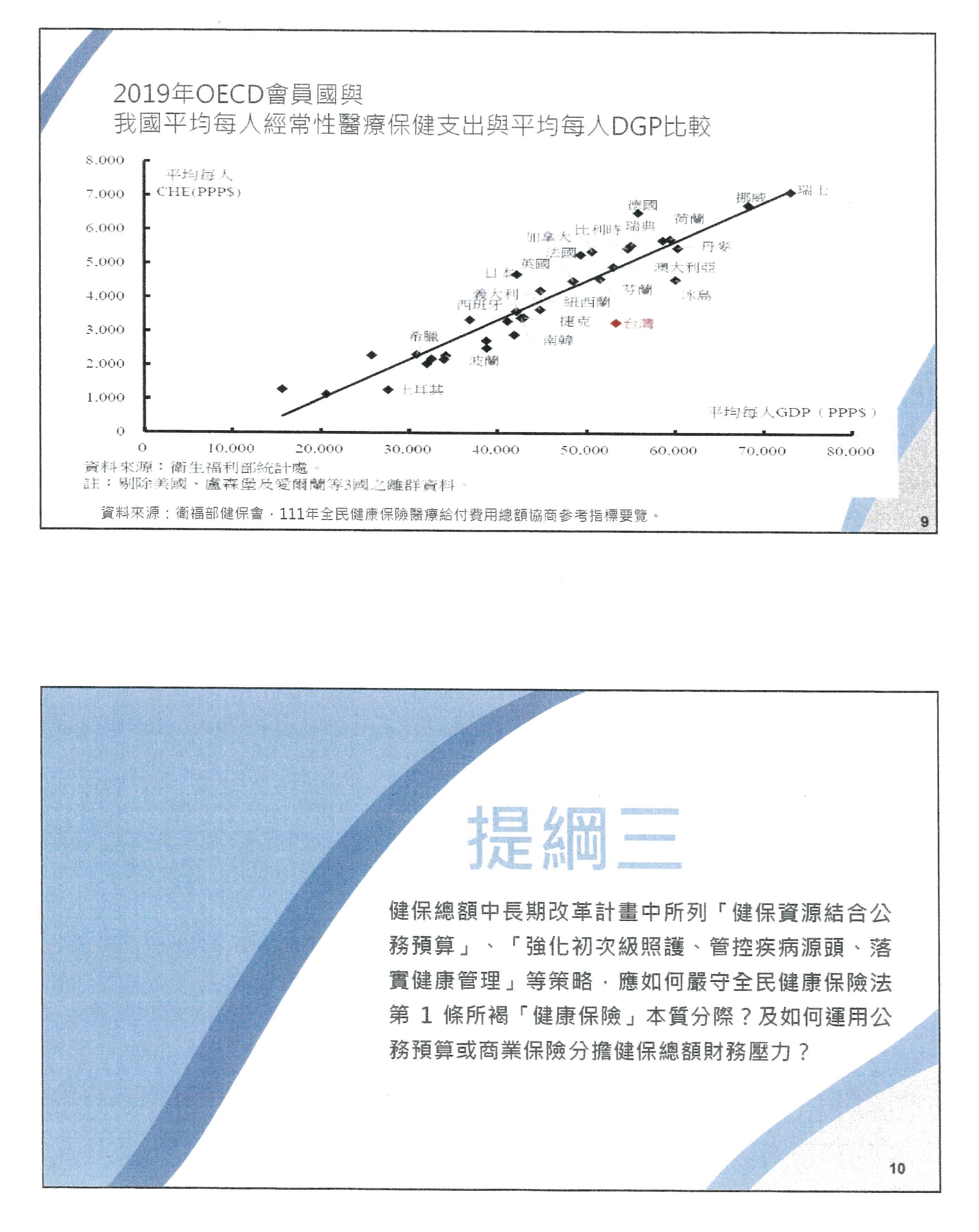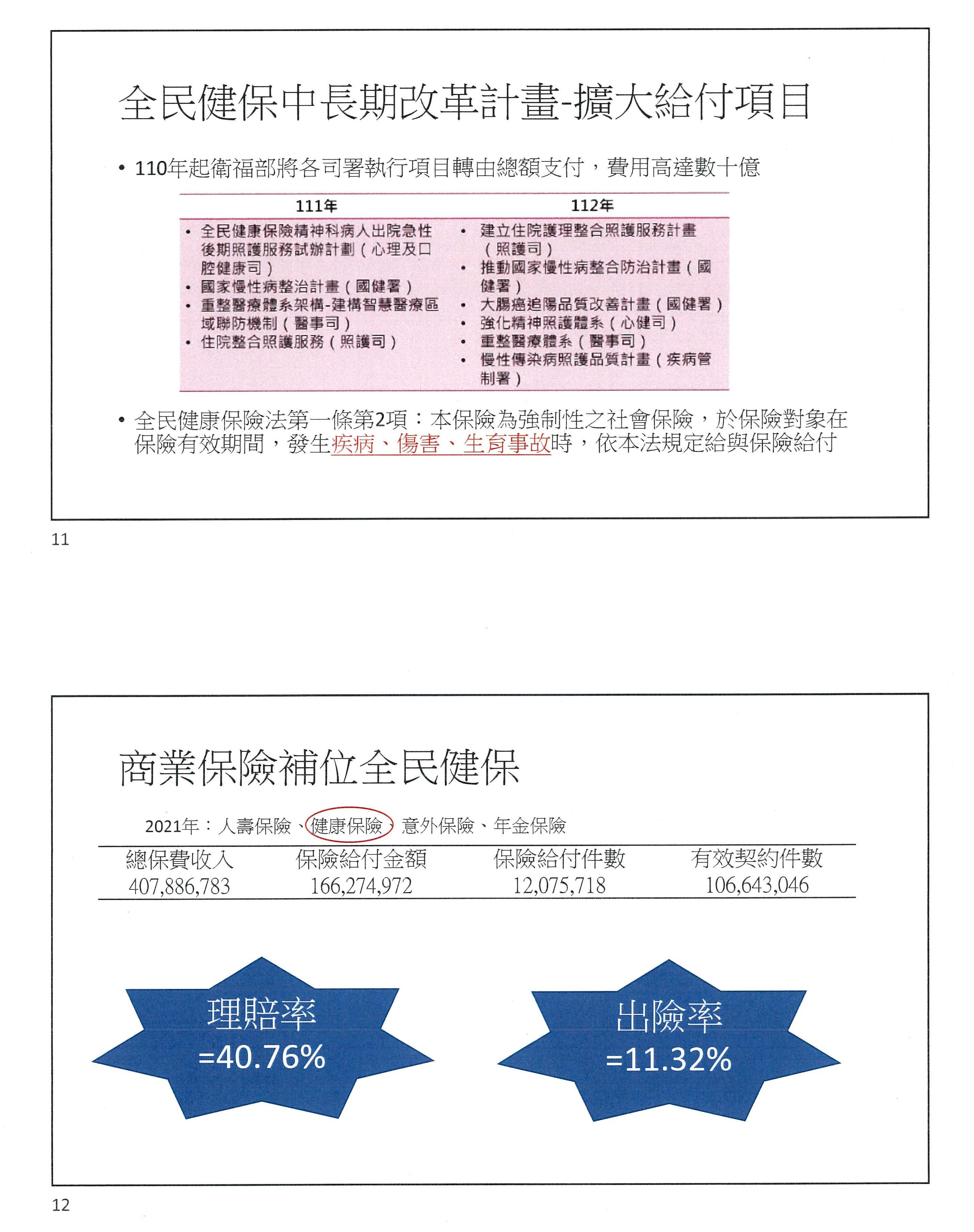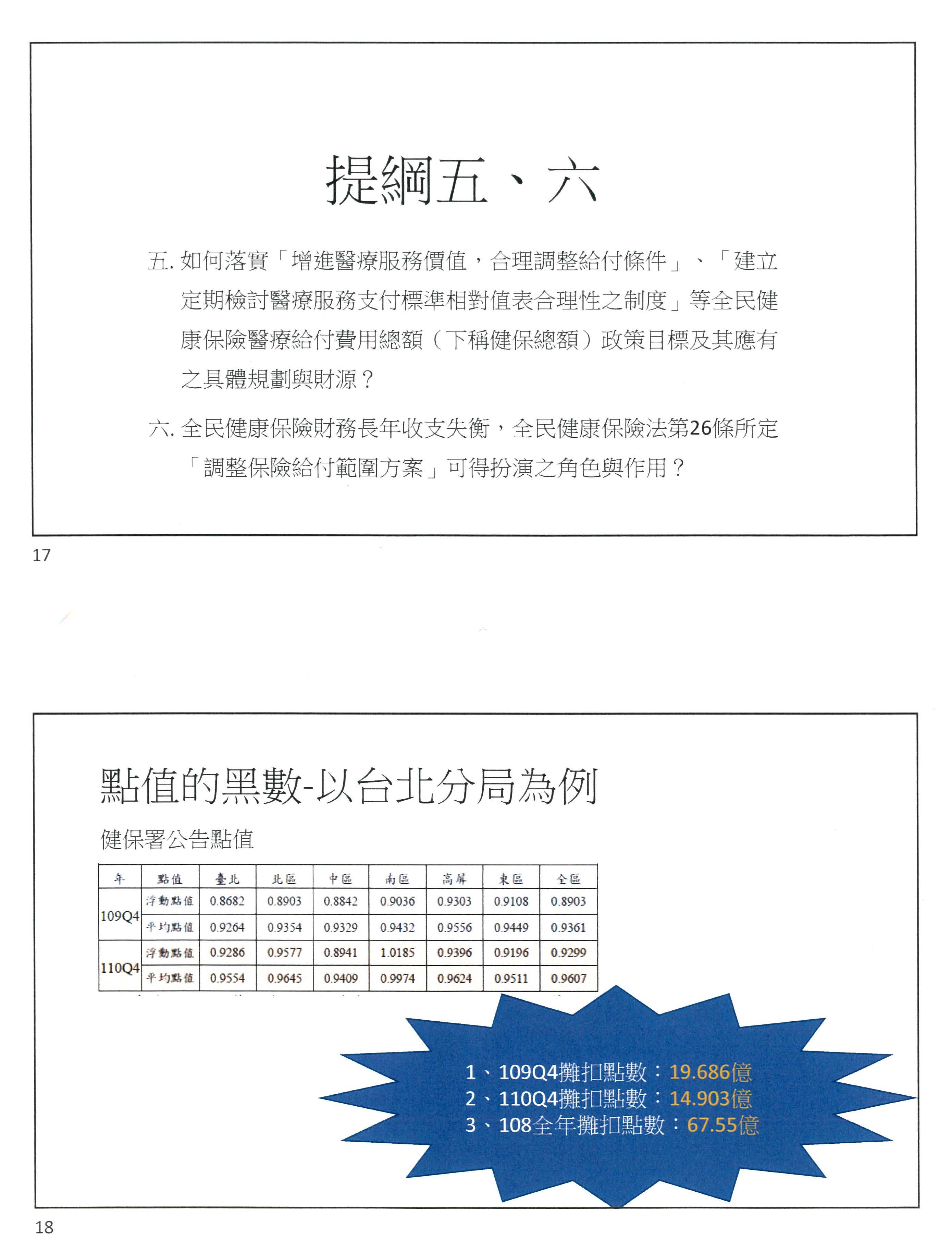 第二個部分,我要回應一下,其實我剛剛報告時也提到,大家很關切國民的健康權益與健保財務穩健如何平衡的部分,也是政府部門一直很努力在思考及平衡,所以我們很肯定衛福部在110年開始推動健保中長期的改革,在健保總額審查的時候,大家也肯認這個制度。誠如剛剛石次長所提,由健保來做一個驅動,然後統整現有公務預算跟健保支出的一個合理分配,不完全是全部把該公共預算要做的事情交給健保來執行,並不是這樣,我們認為健保應該是資源有效分配的一個有力工具,這部分在後續政府部門這邊會來全力解決這樣的問題,然後希望可以讓健保能再進一步投資在健康,提升醫療服務品質、提升整個效率,然後讓民眾跟健保取得更好的規劃及完善的維護,以上。