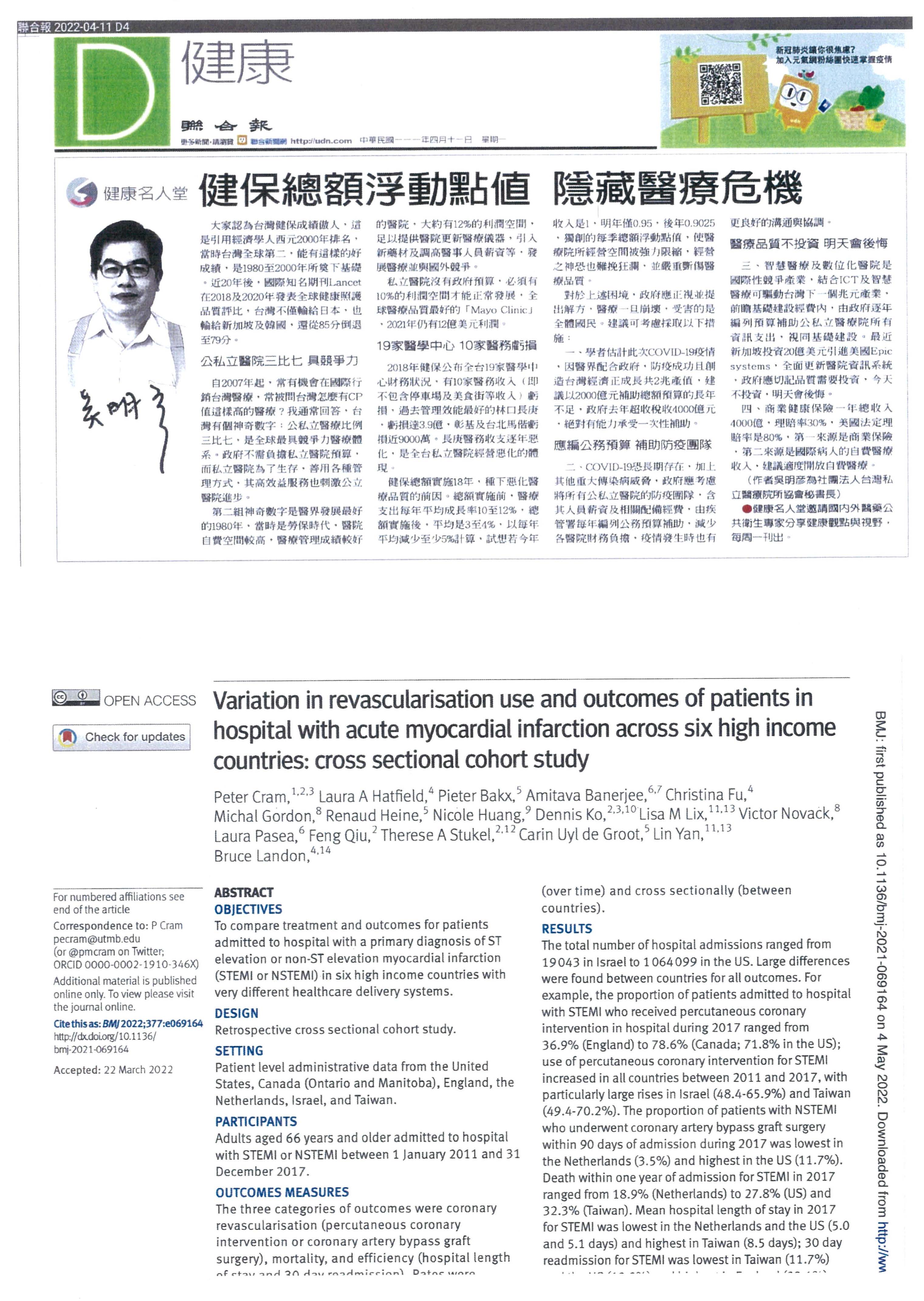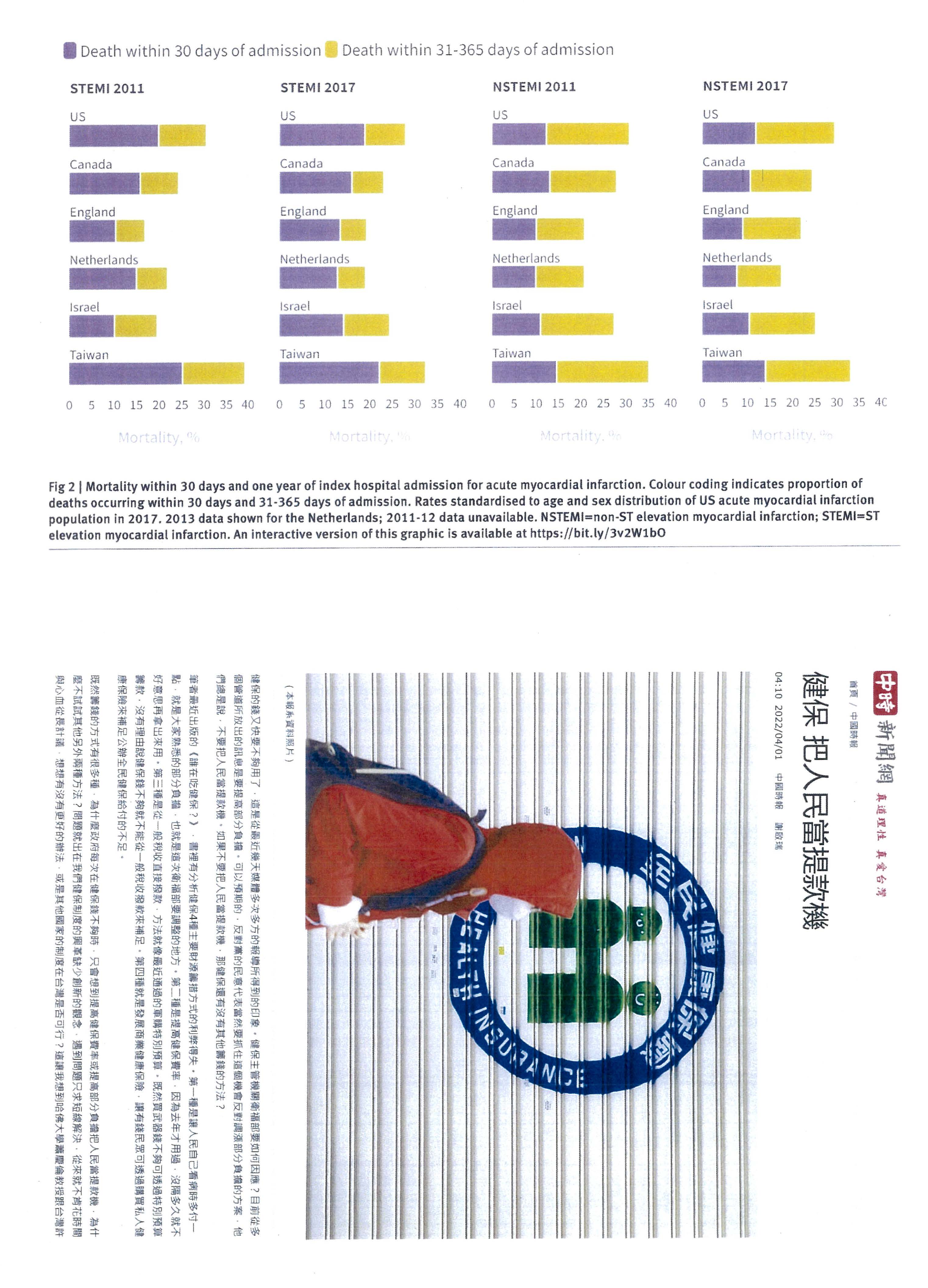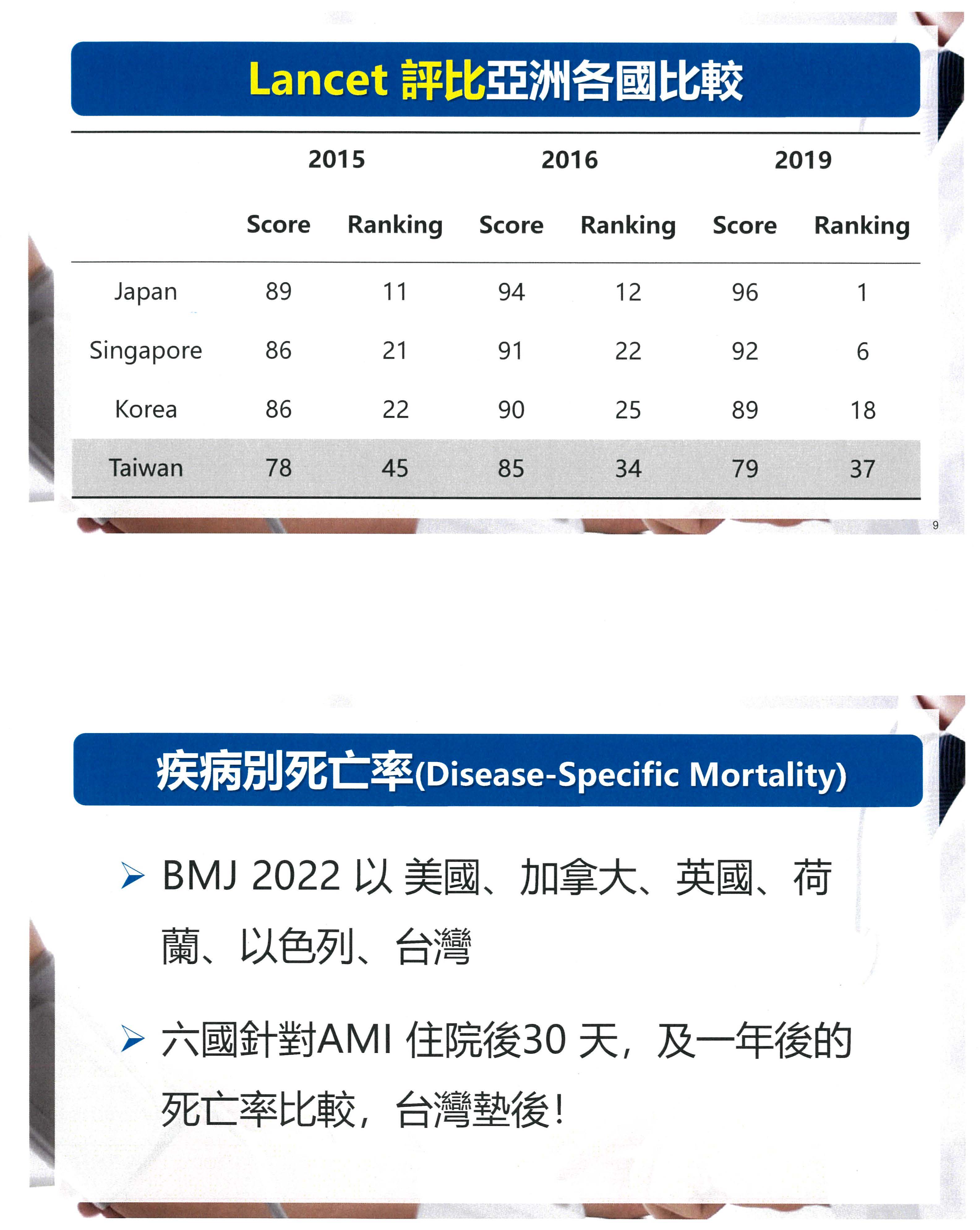 從疾病別的死亡率來看,2022年BMJ以美國、加拿大、英國、荷蘭、以色列、臺灣等6個國家的AMI住院後30天以及1年後的死亡率來比較,臺灣是敬陪末座。