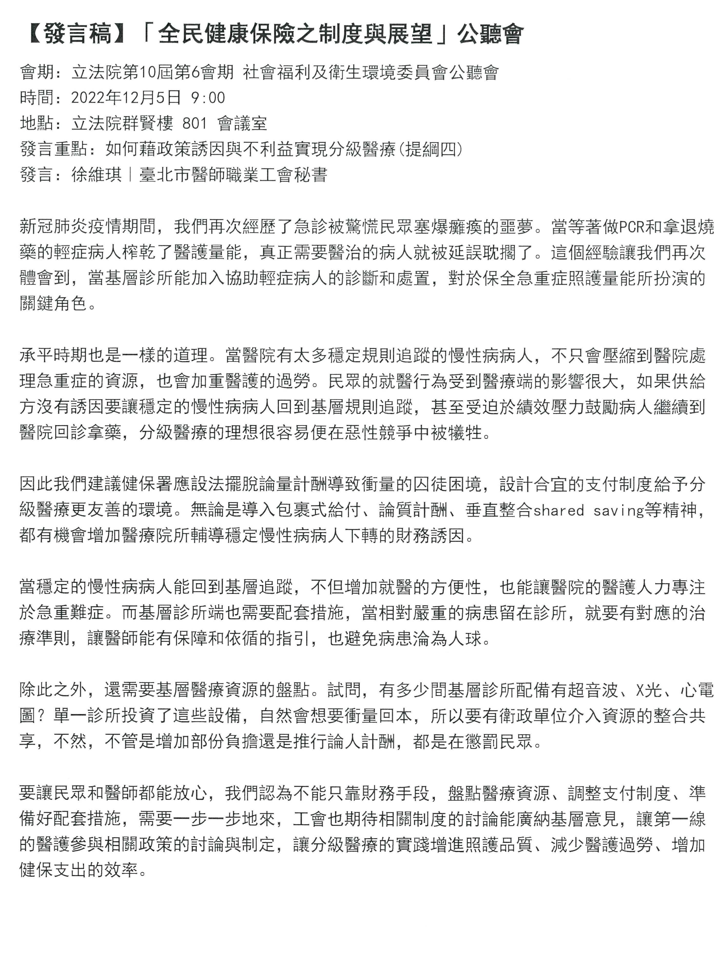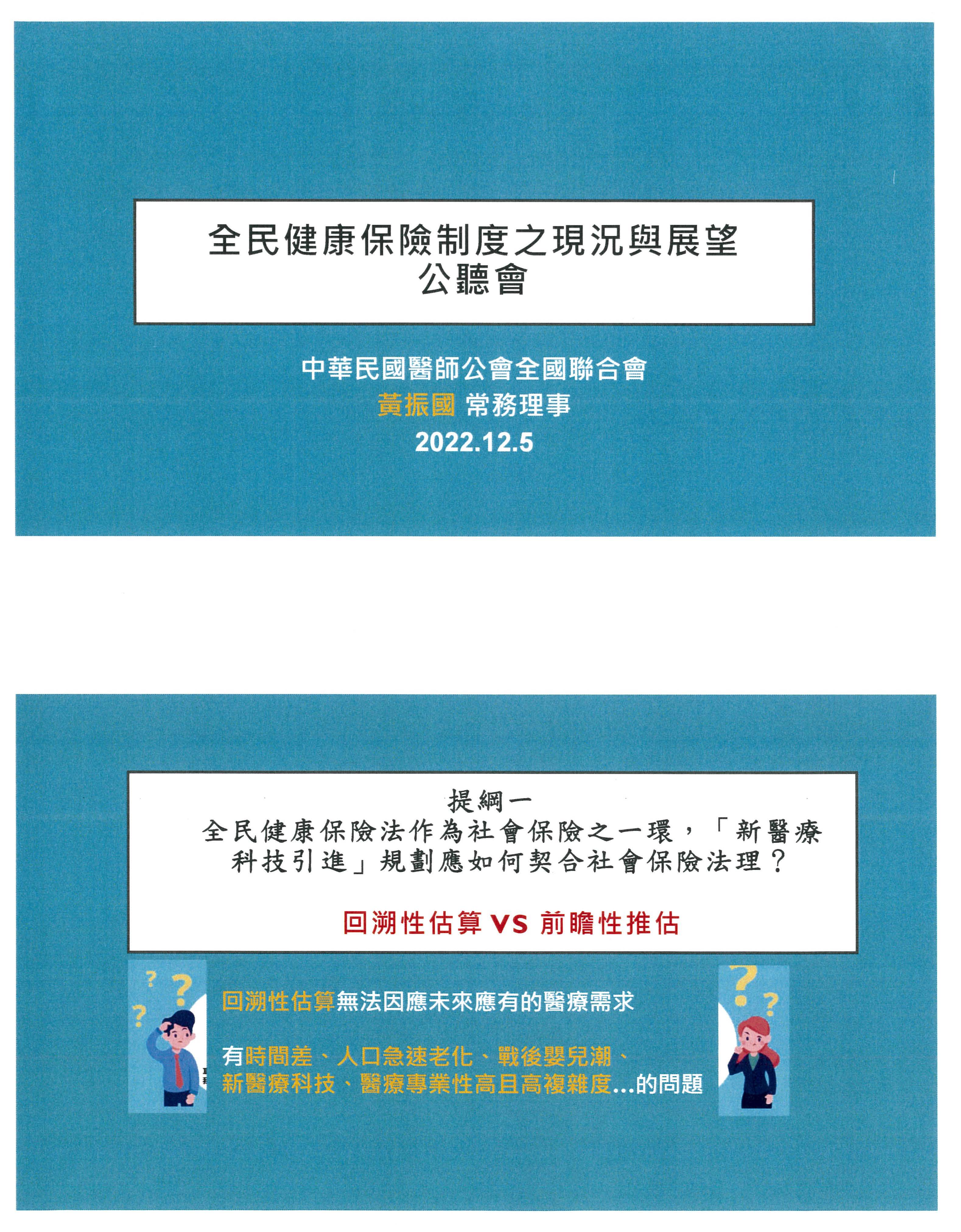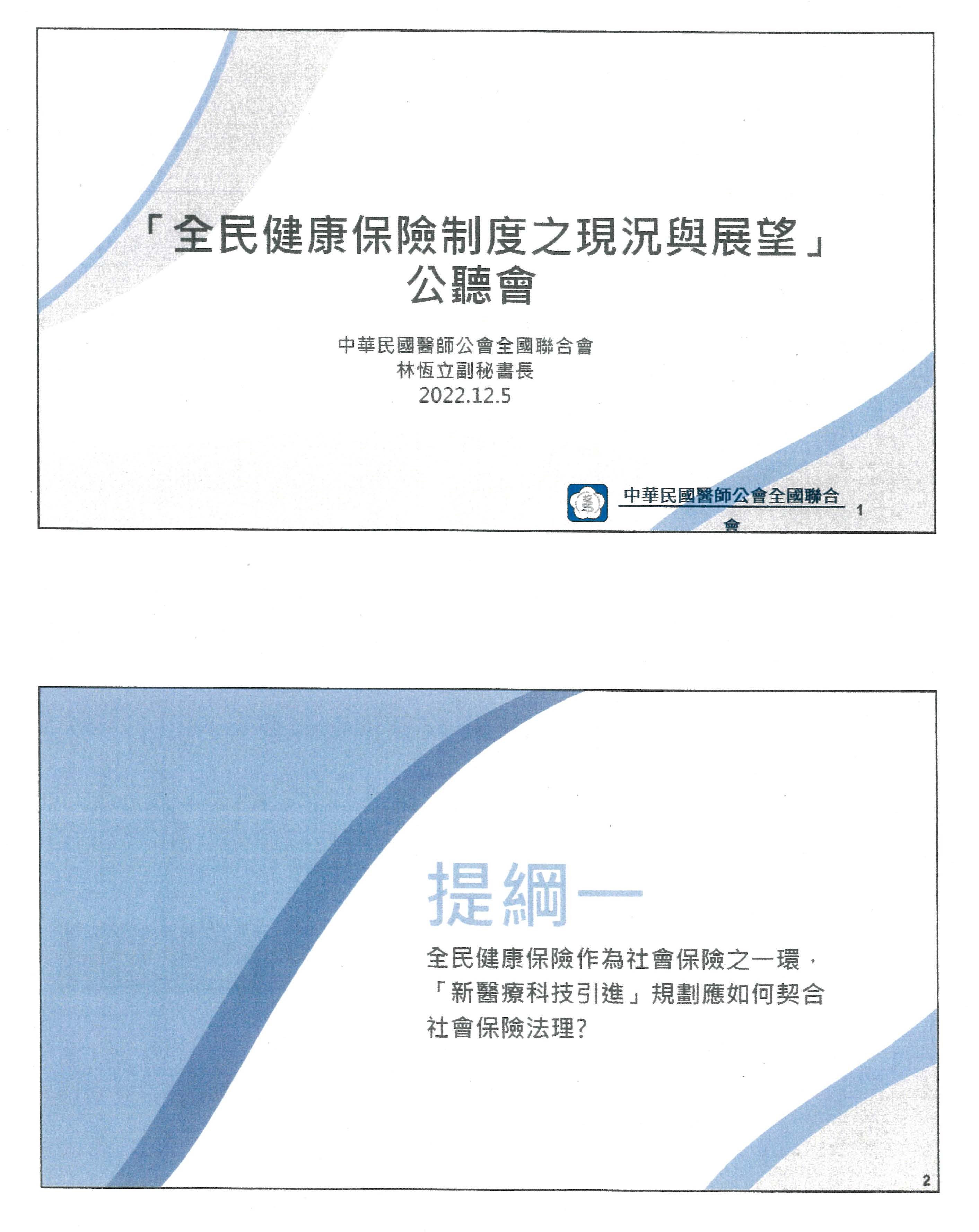今天貴委員會舉行「全民健康保險制度之現況與展望」公聽會,本會應邀列席,至感榮幸。謹就本次公聽會討論題綱,與本會相關部分說明如下,敬請各位委員、先進不吝指教。