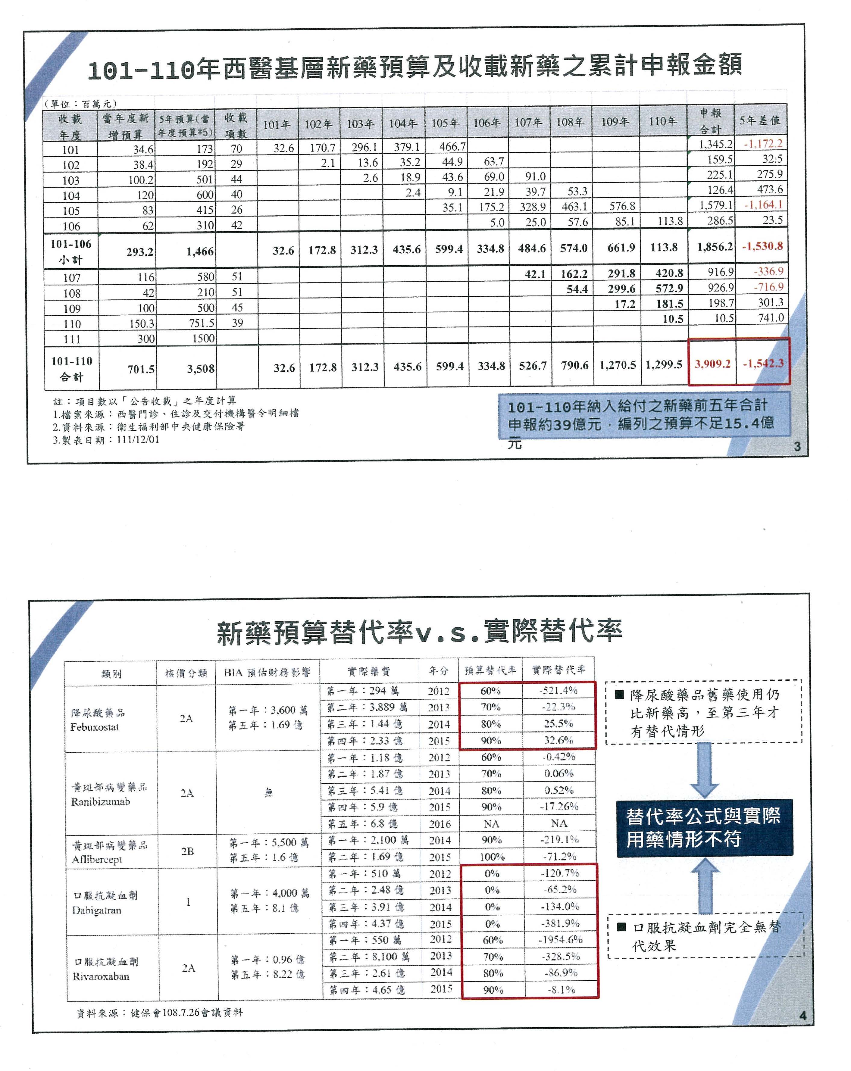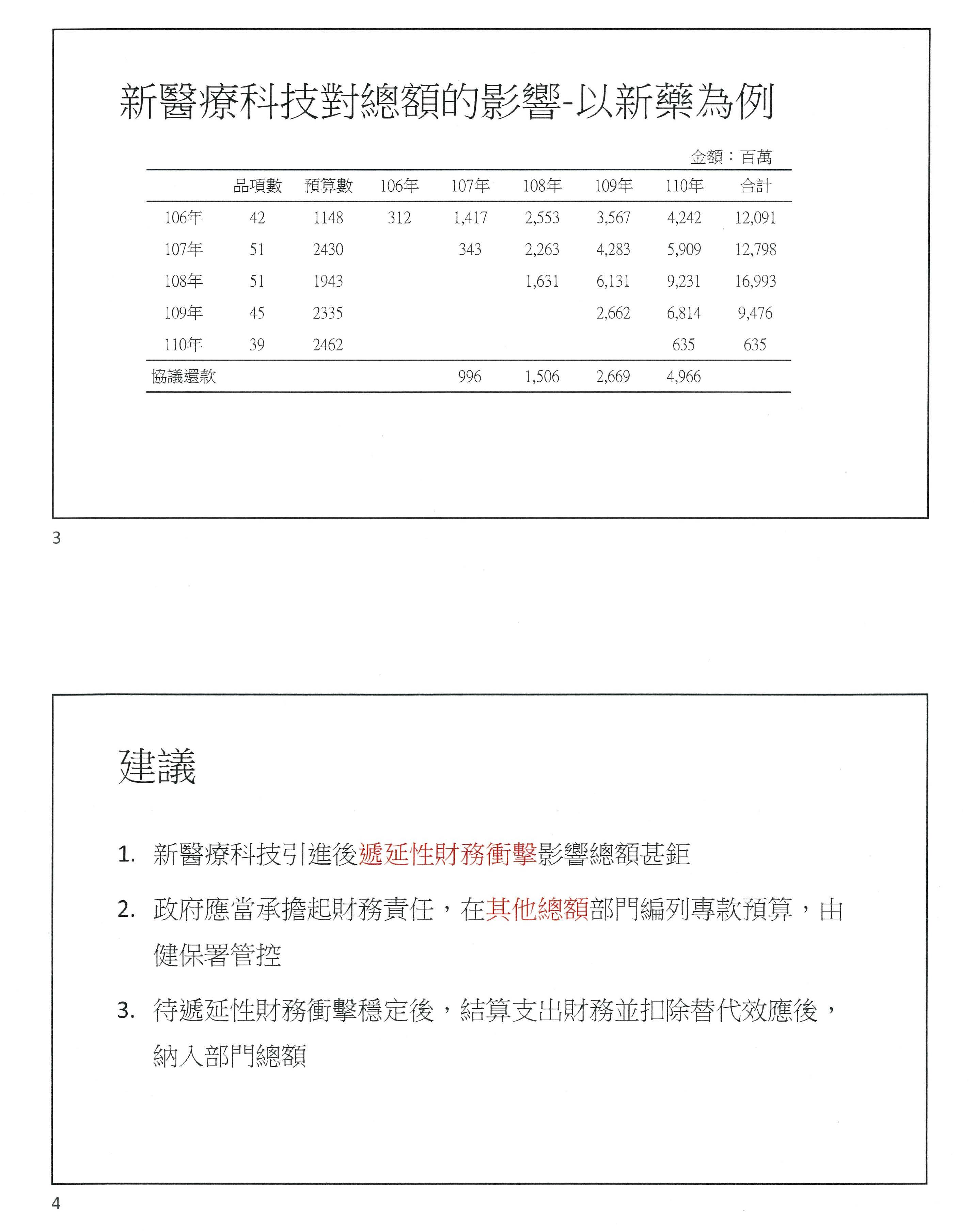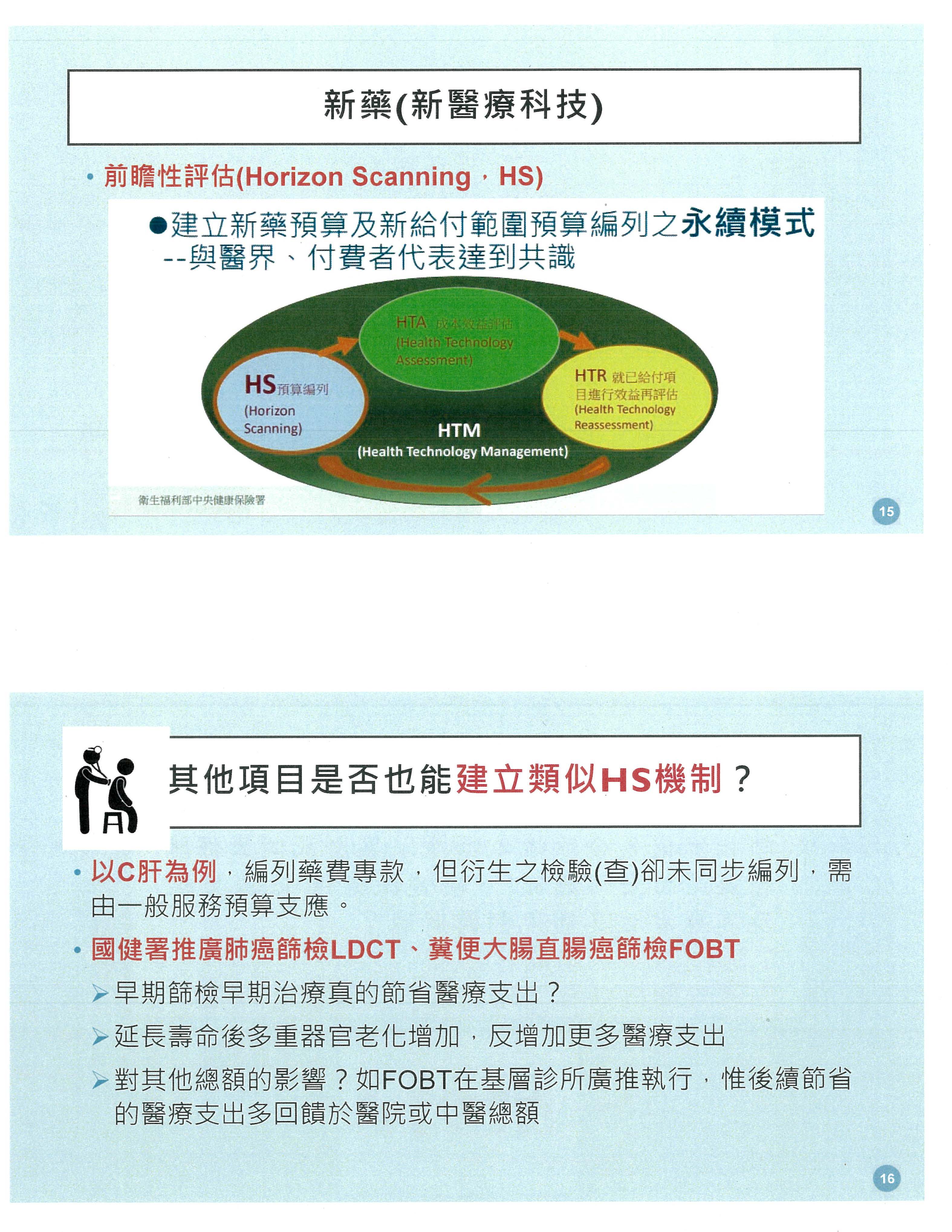 第一個是新科技跟新藥的導入問題,確實我們目前在所有新藥、新科技導入的時候都會有一些HTA,再加上對健保財務衝擊的影響評估。剛剛有特別提到遞延效應所產生的健保衝擊,以及導入商業保險的自費或是差額負擔,但由於有些新藥的差額負擔可能涉及到修法的問題,而醫材的差額負擔目前已經在執行中,這部分會持續式滾動修正。