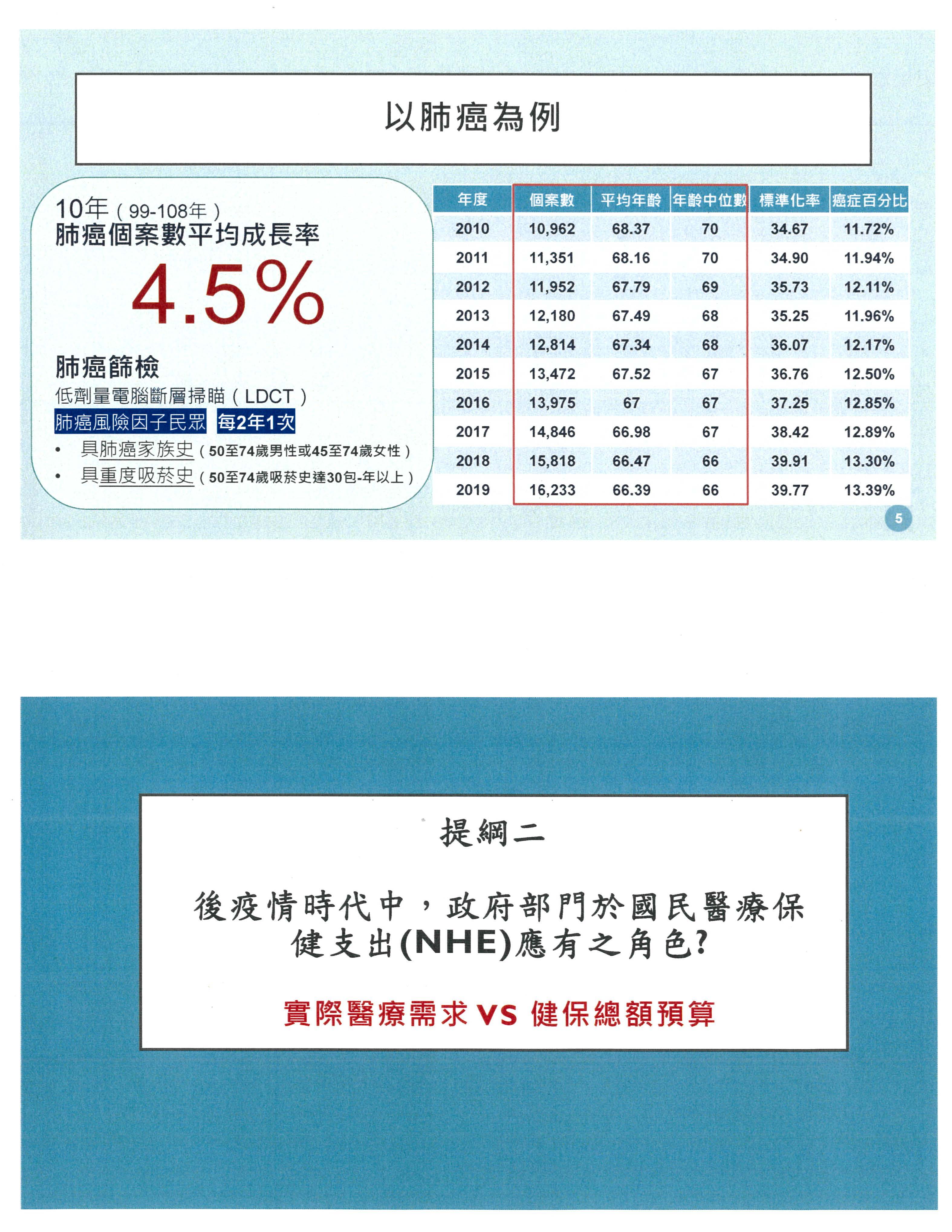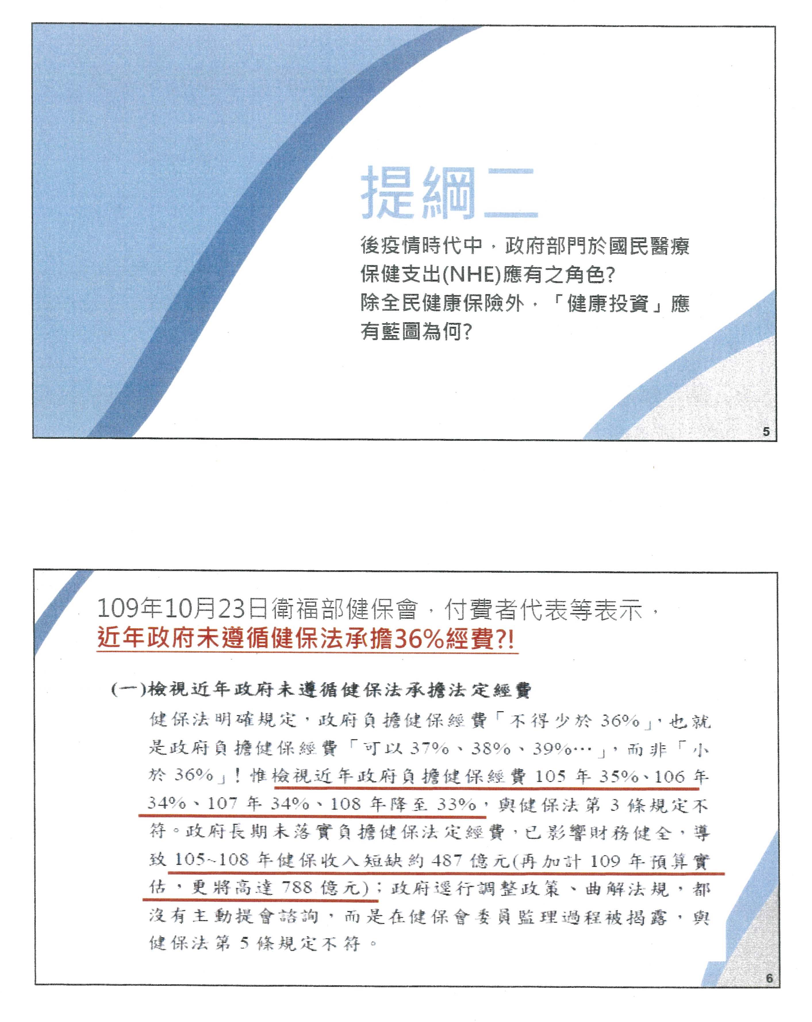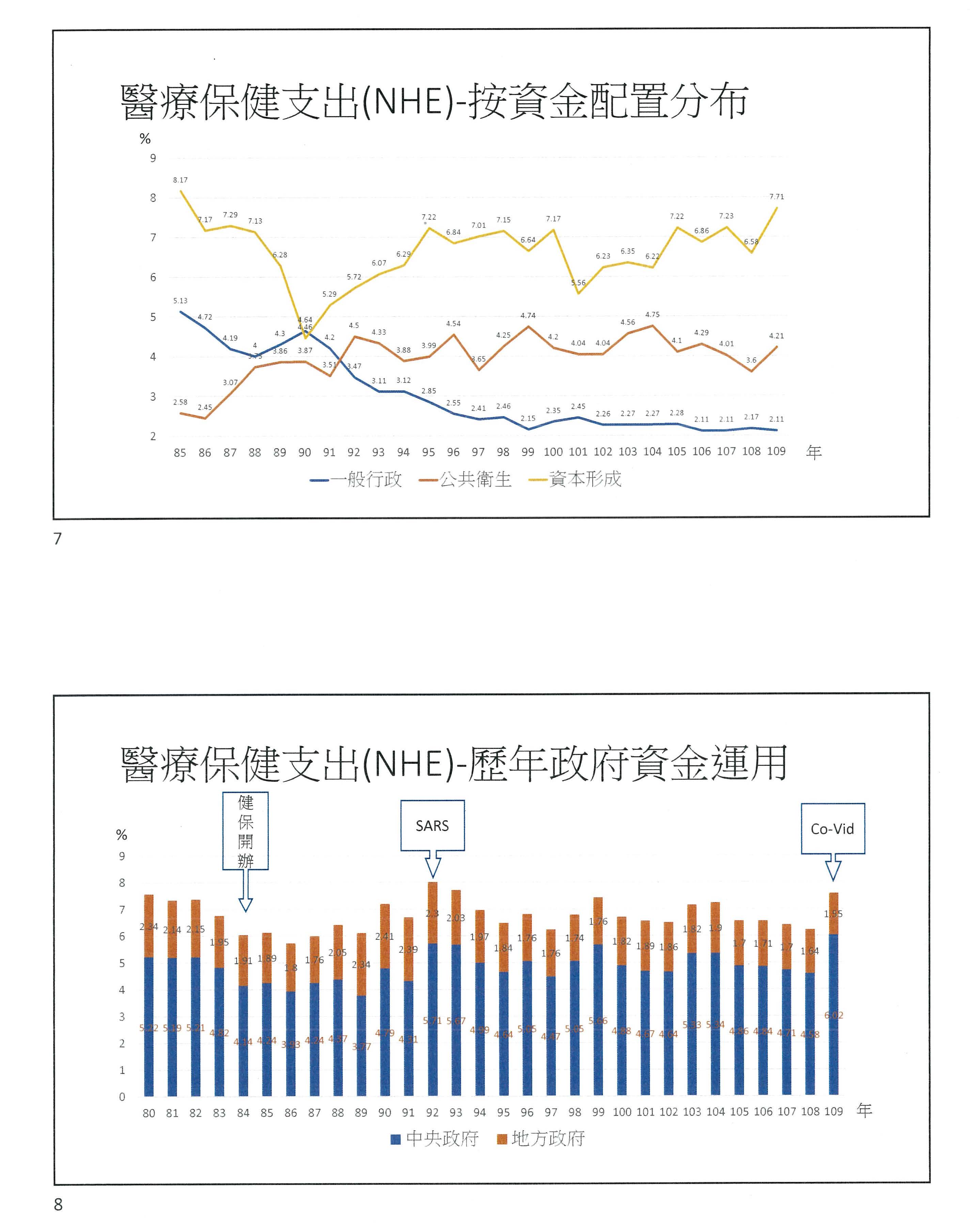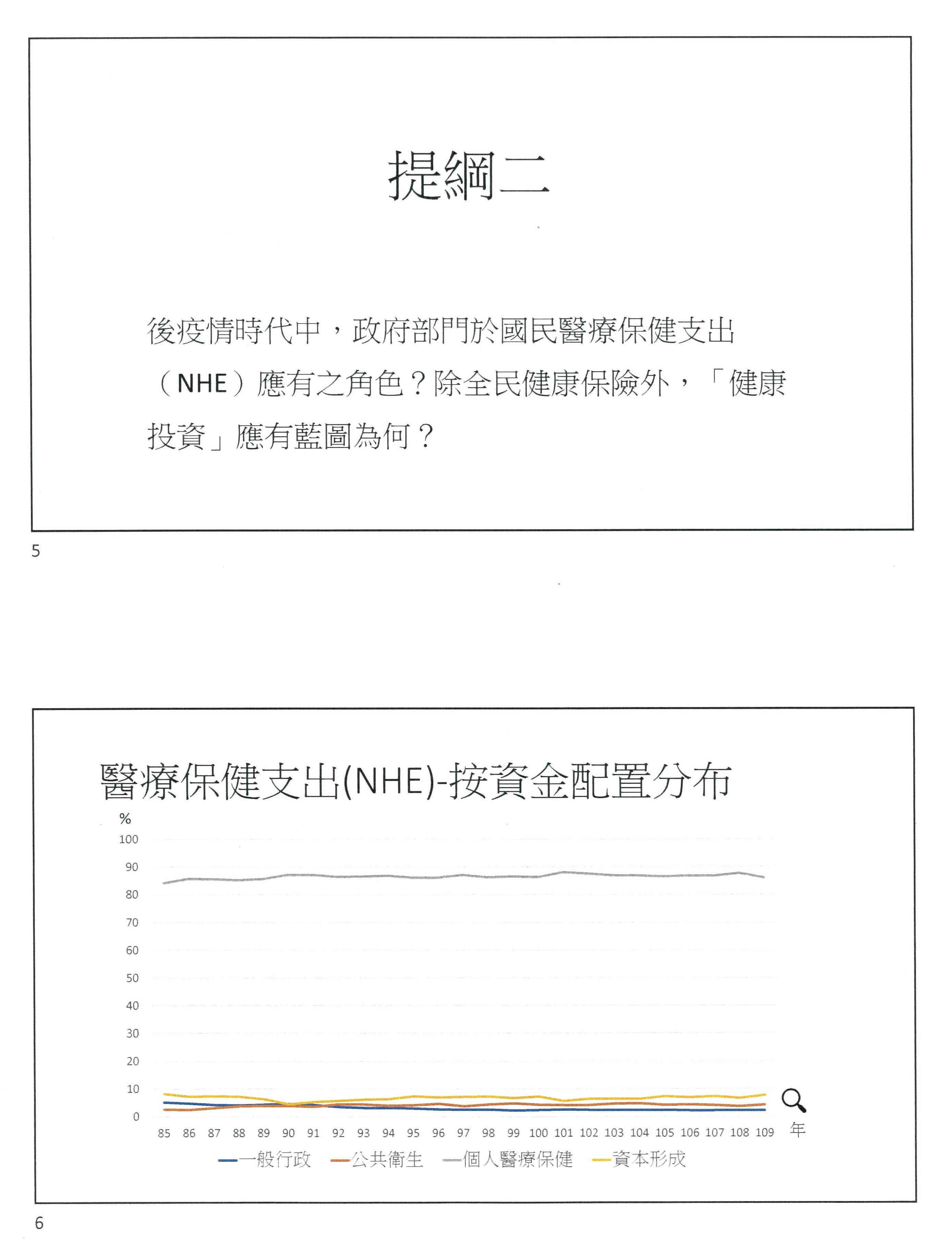 討論提綱二、後疫情時代中,政府部門於國民醫療保健支出(NHE)應有之角色?除全民健康保險外,「健康投資」應有藍圖為何?
