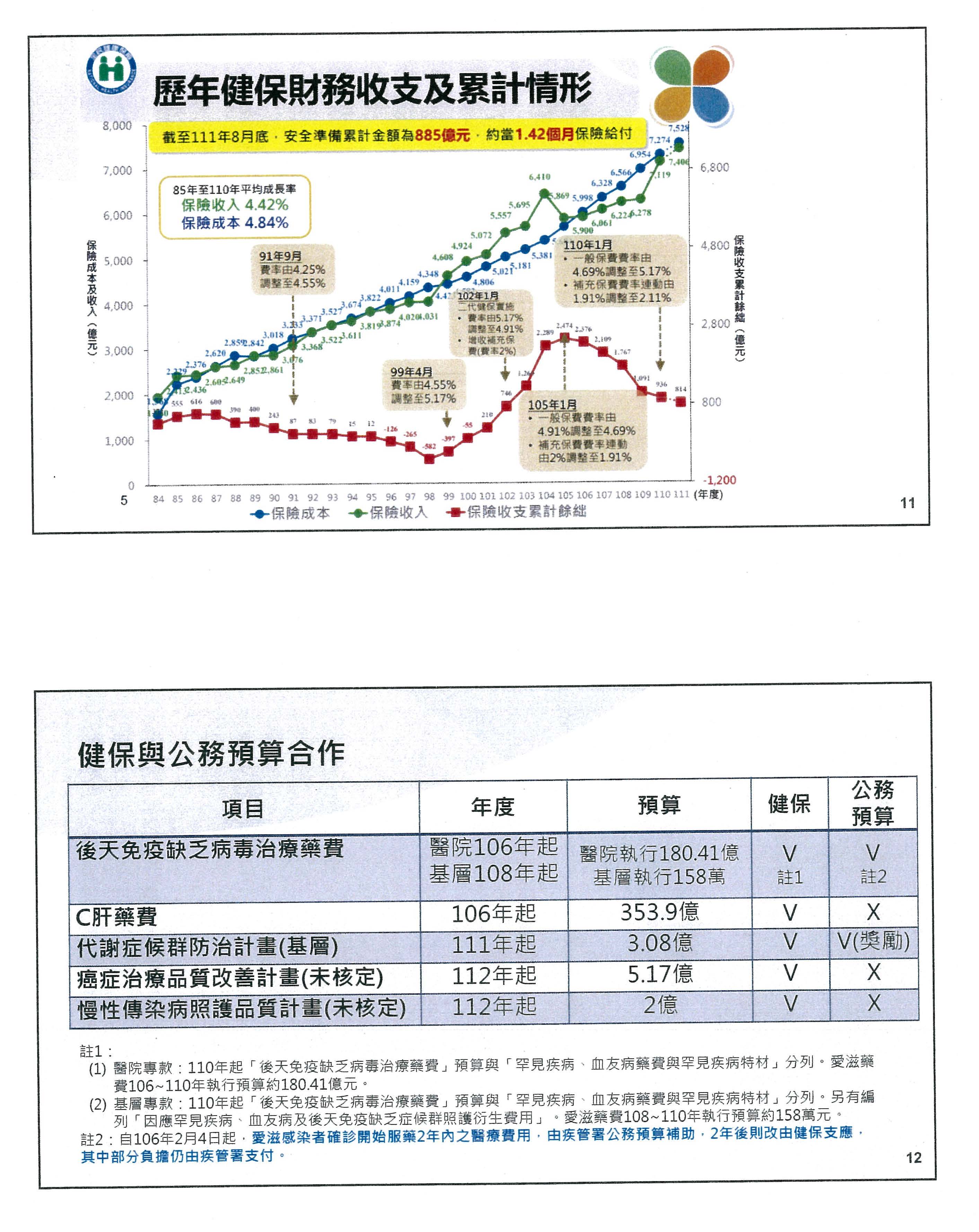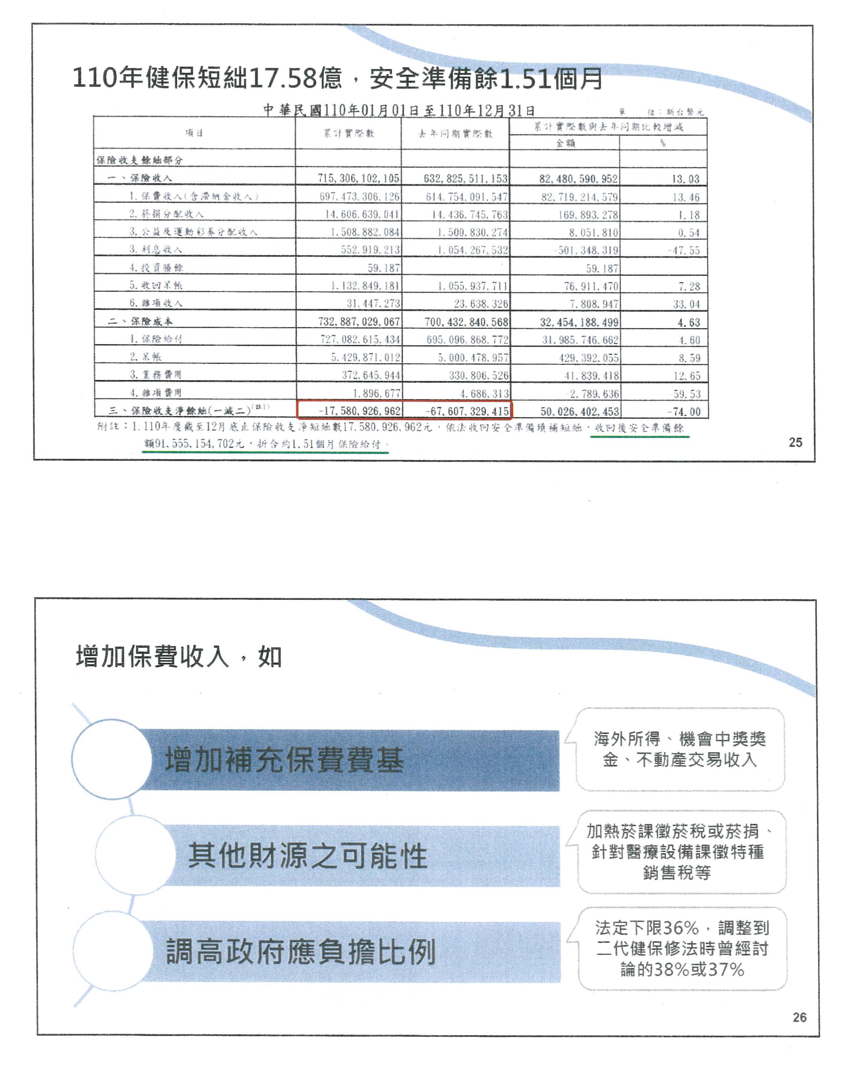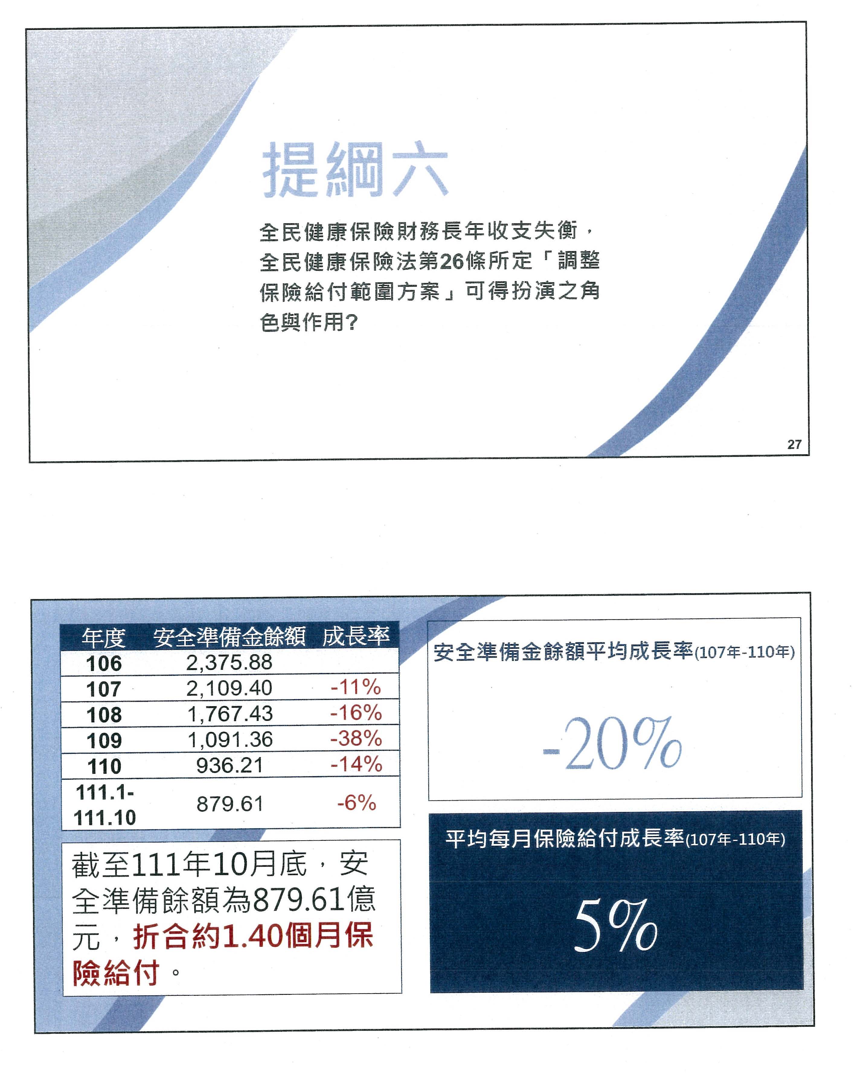 根據今日主計總處提出之書面報告,全民健保從106年開始,保險收支年年呈現短絀,縱然已在110年調整保險費率,但是保險收支依然入不敷出。因此,如何在財務面為全民健保建立一套可長可久的永續制度,同時能兼顧醫療發展動能、民眾就醫權益,絕對是迫在眉睫的議題。