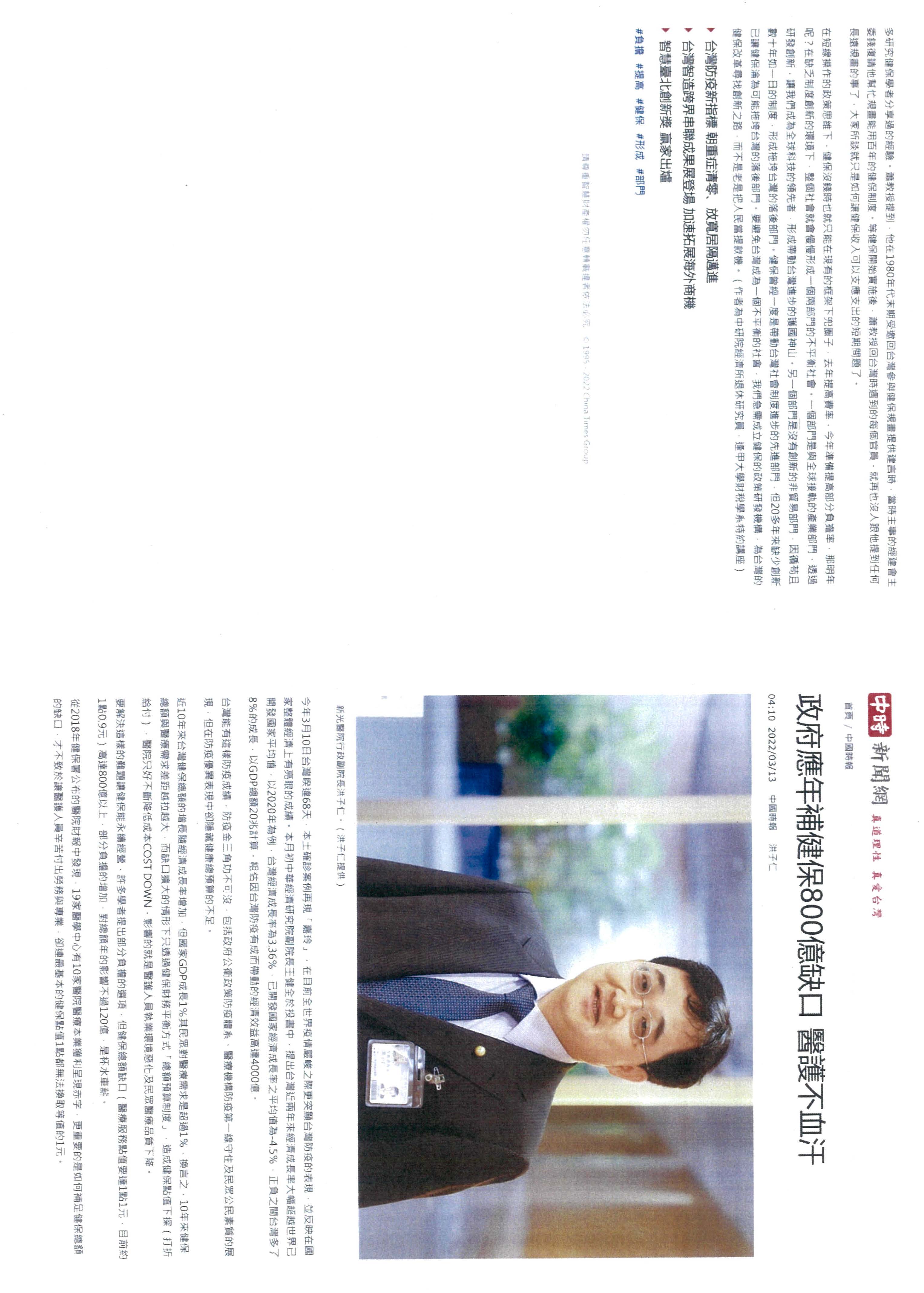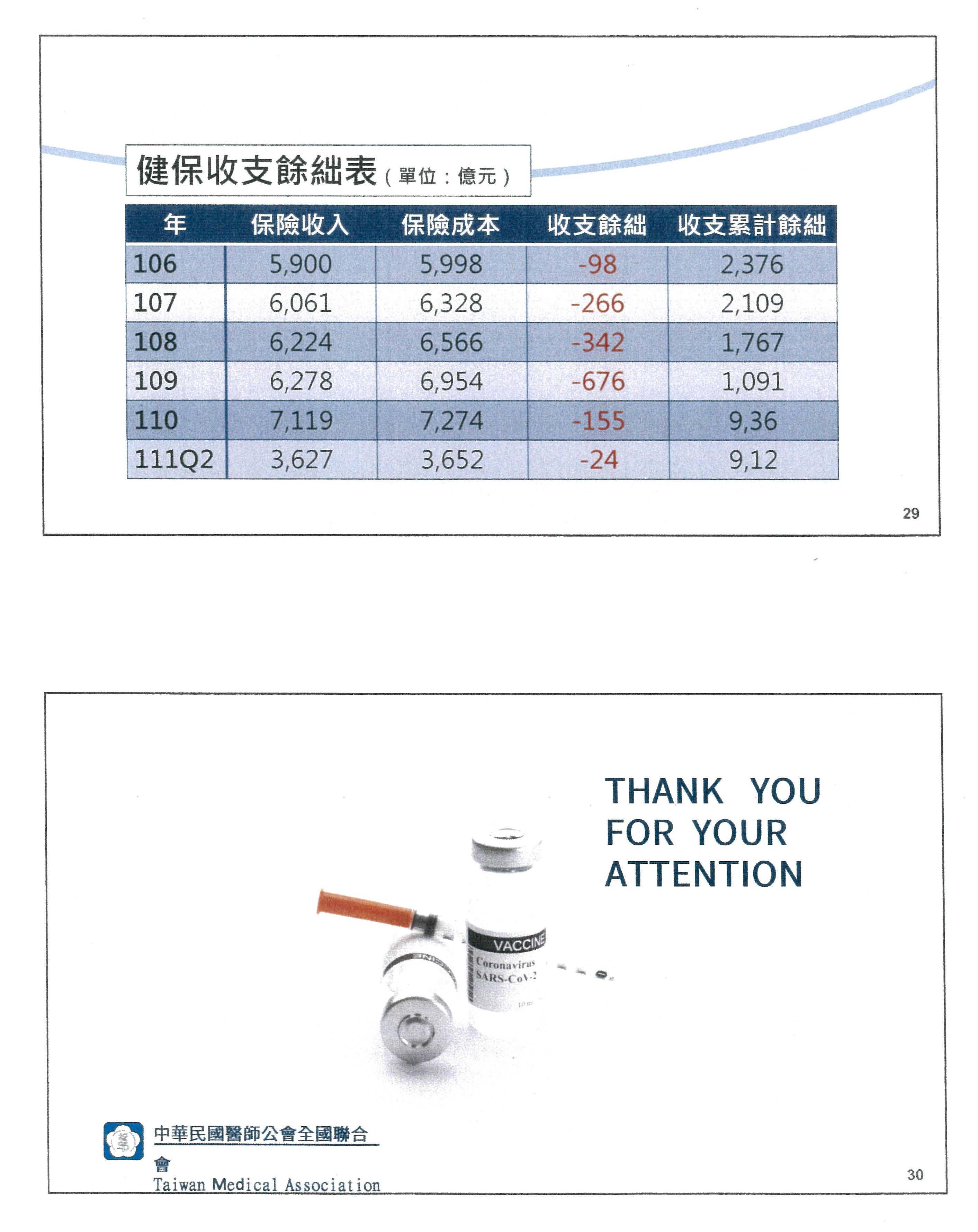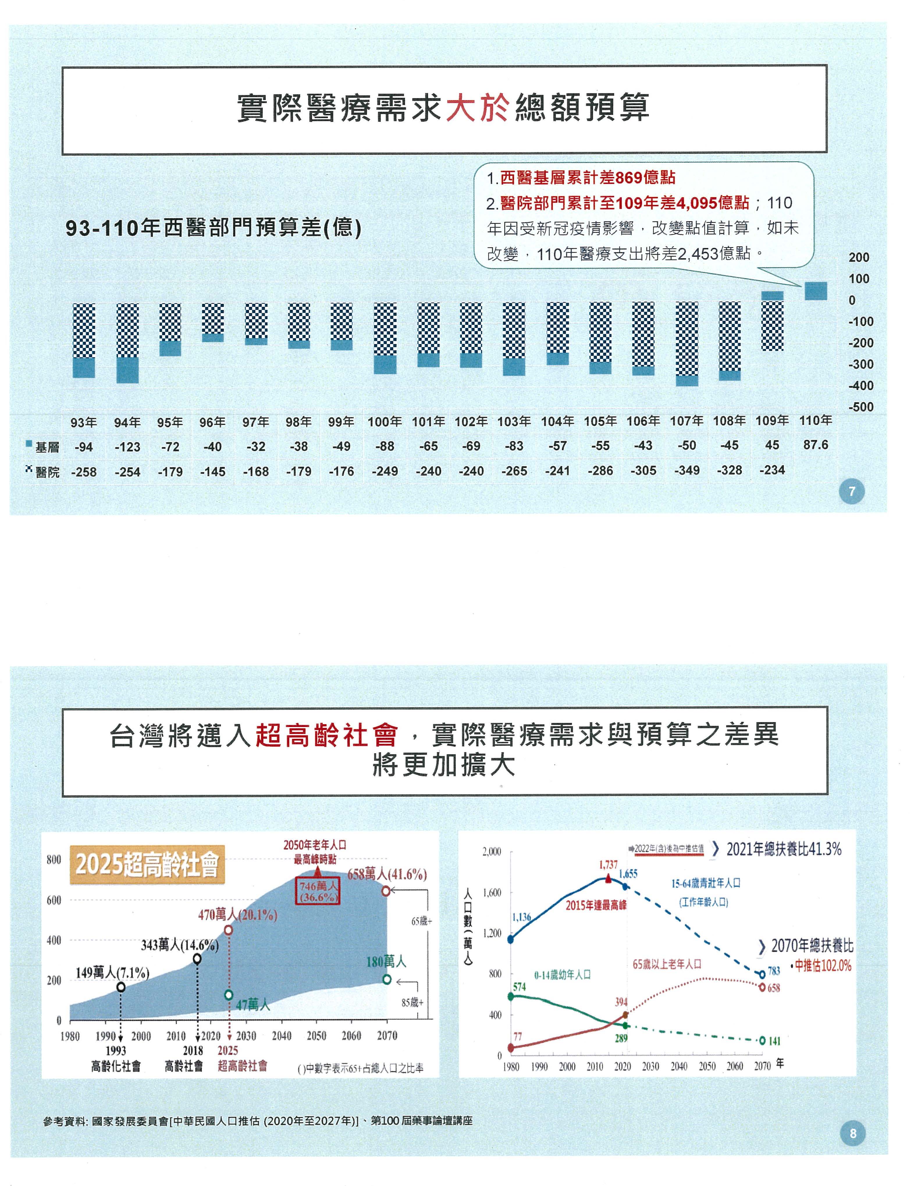 根據今日主計總處提出之書面報告,全民健保從106年開始,保險收支年年呈現短絀,縱然已在110年調整保險費率,但是保險收支依然入不敷出。因此,如何在財務面為全民健保建立一套可長可久的永續制度,同時能兼顧醫療發展動能、民眾就醫權益,絕對是迫在眉睫的議題。