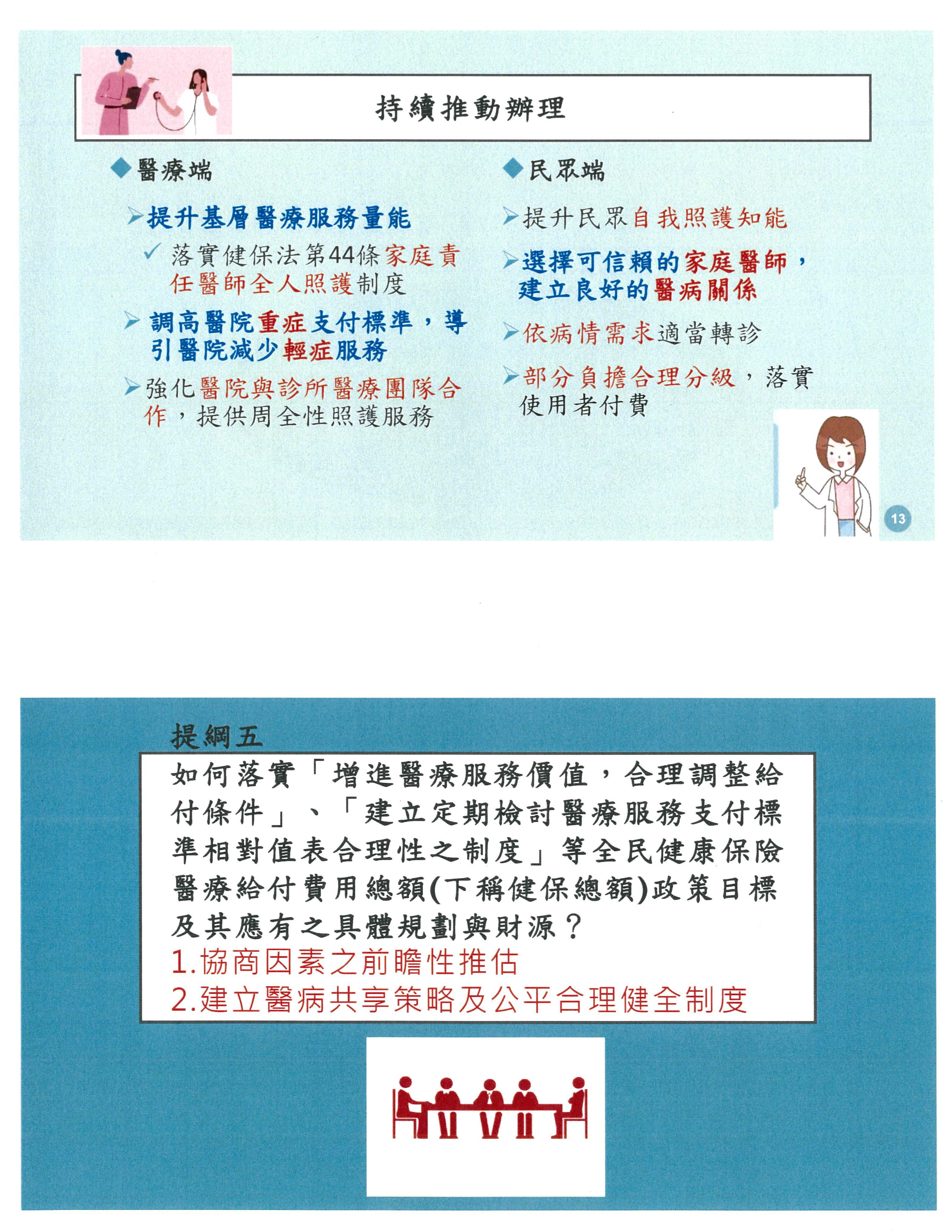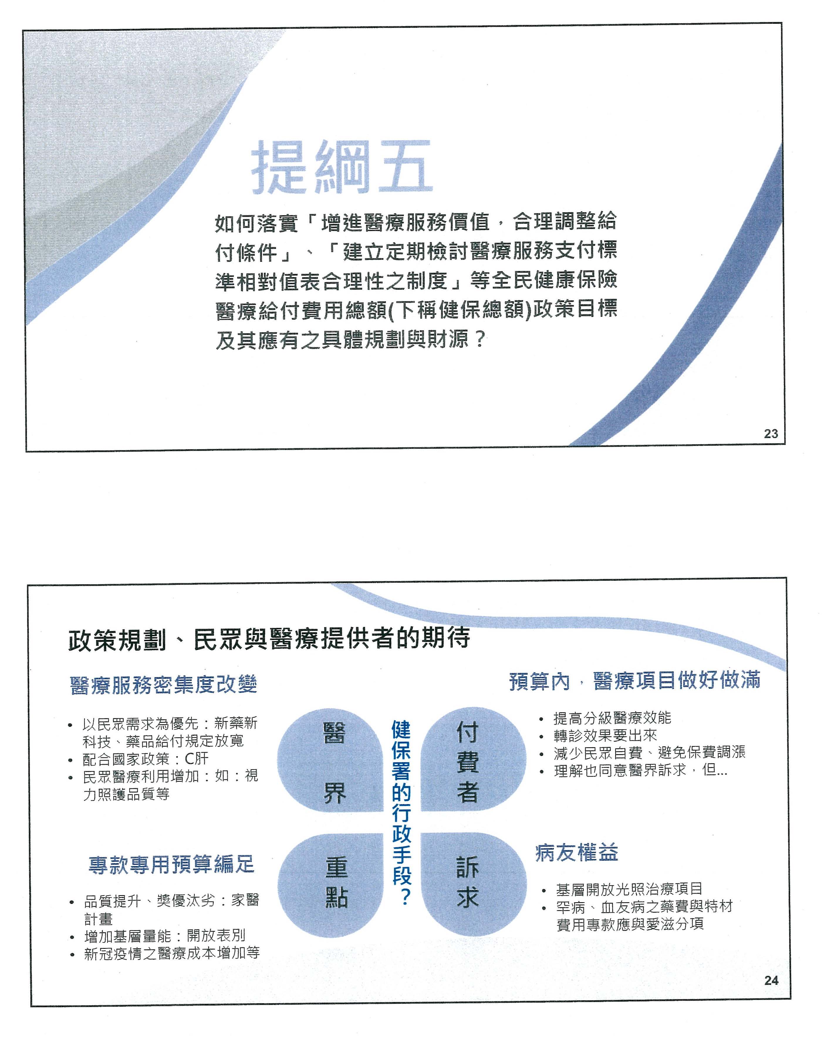 討論提綱五、如何落實「增進醫療服務價值,合理調整給付條件」、「建立定期檢討醫療服務支付標準相對值表合理性之制度」等全民健康保險醫療給付費用總額(下稱健保總額)政策目標及其應有之具體規劃與財源?