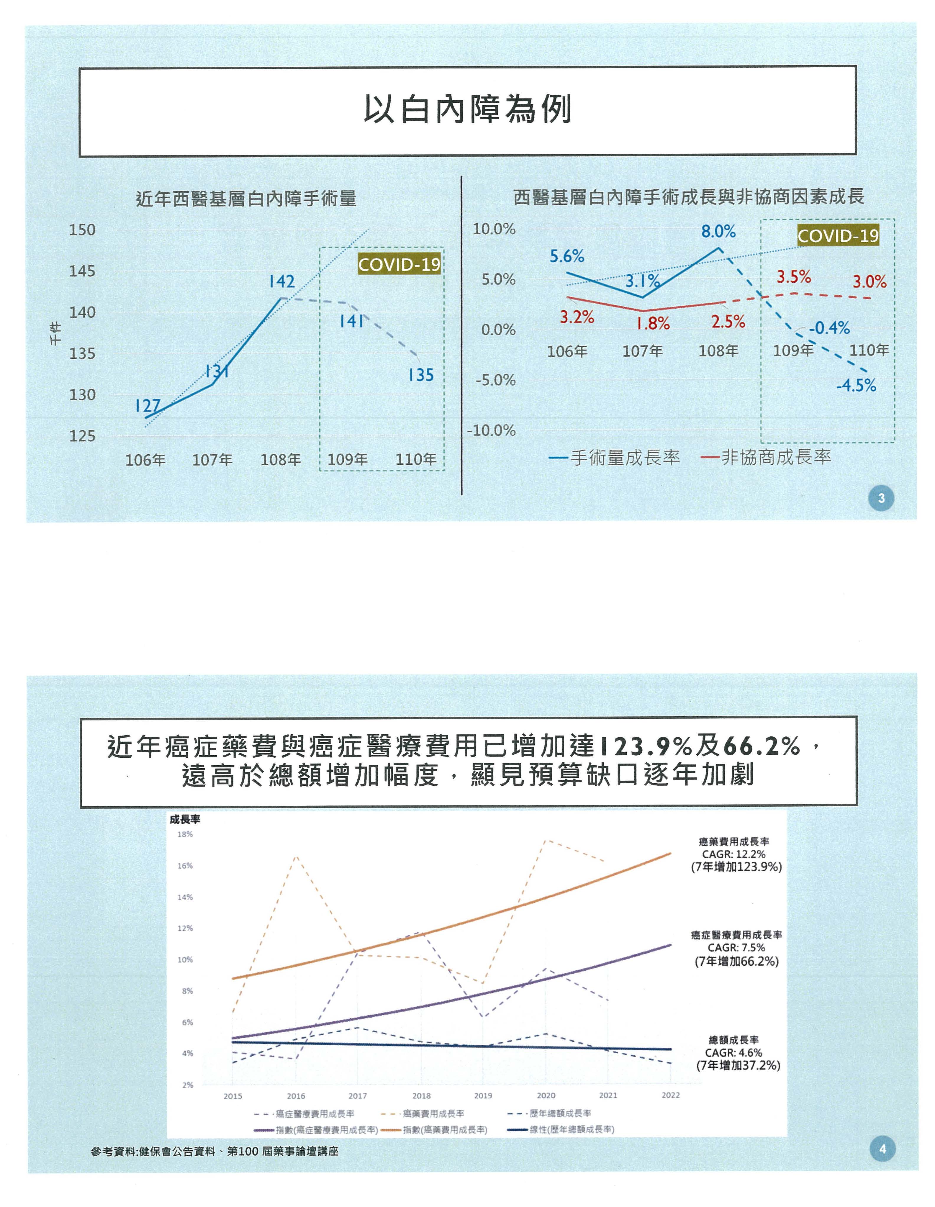黃振國常務理事:主席及在座各位長官、專家學者大家好。今天我來跟各位報告這次的議題,大家都知道健保實施總額制度從91年到現在已經二十幾年,之前行政部門的長官和專家學者都表現得非常好,當然我也知道我們現在對於健康的投資遠低於已開發國家,這個gap如何能夠改善呢?以往我們都著重在節流,亦即如何節省費用並達到最好的效益,這就是二十幾年來的成果,如果我們不跳脫以往的思維,我認為再討論下去還是會維持這麼低的投資報酬率,結果就是人民失去健康。最大的問題在於現在的健保總額是回溯性的估算,也就是以前兩年甚至三年的實際耗用來推估未來一年的醫療需求,這樣會有什麼問題?大家都知道臺灣早期的經濟發展來自於臺灣的人口紅利,所以是以青壯年為主,但我們在2025年之後會面臨老年人口增加的問題,我們的人口老化,另外還有戰後嬰兒潮、新醫療科技等等問題,如果還要用回溯性推估的方式,將會造成實際醫療的gap有多大?以白內障手術為例,白內障手術在基層從106年到108年之間,也就是在沒有疫情的時候,每年大概都以增加一萬件左右的比例在提升,白內障手術是年齡大到一定程度才會爆發的,這也是戰後嬰兒潮在未來十年、二十年將要面對的最大議題。以我們過去的推估方式,大家可以看到簡報右邊的圖,我們西醫基層白內障手術率實際上以前的成長率都已經平均大於5%,甚至108年達到8%,但是大家別忘了,這個落差在109年、甚至110年,我估算至少還差10萬件的成長,假設112年疫情回復的時候,原來差的10萬件,它的demand及實際上的成長率跟現在非協商因素的成長率相差不到3%,只有百分之二點多,各位認為這樣的服務能滿足民眾需求嗎?