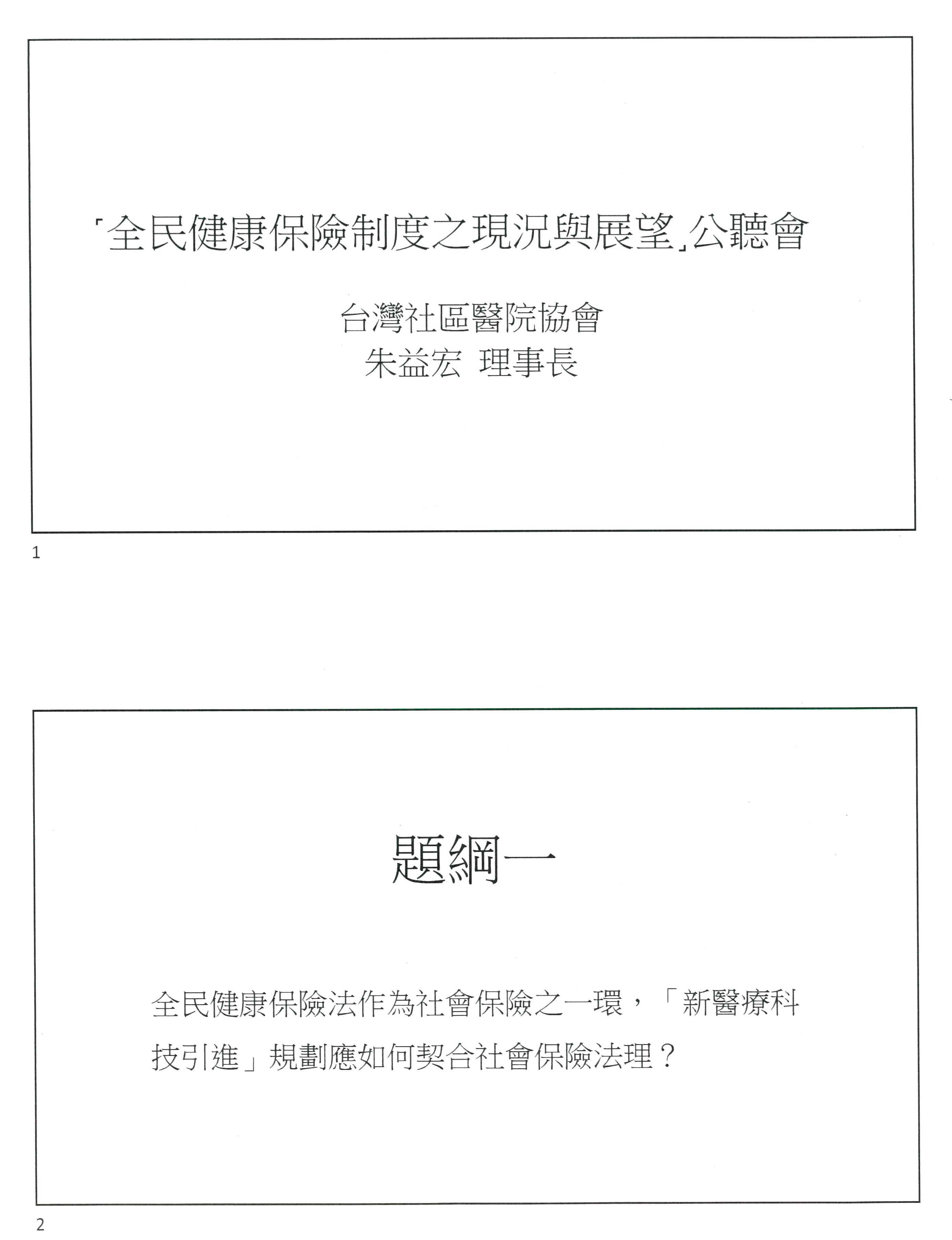 主席:現在開始開會。今天本會為「全民健康保險制度之現況與展望」舉辦公聽會,謝謝各位學者專家及政府機關代表的蒞臨。公聽會探討的議題為「全民健康保險制度之現況與展望」。
