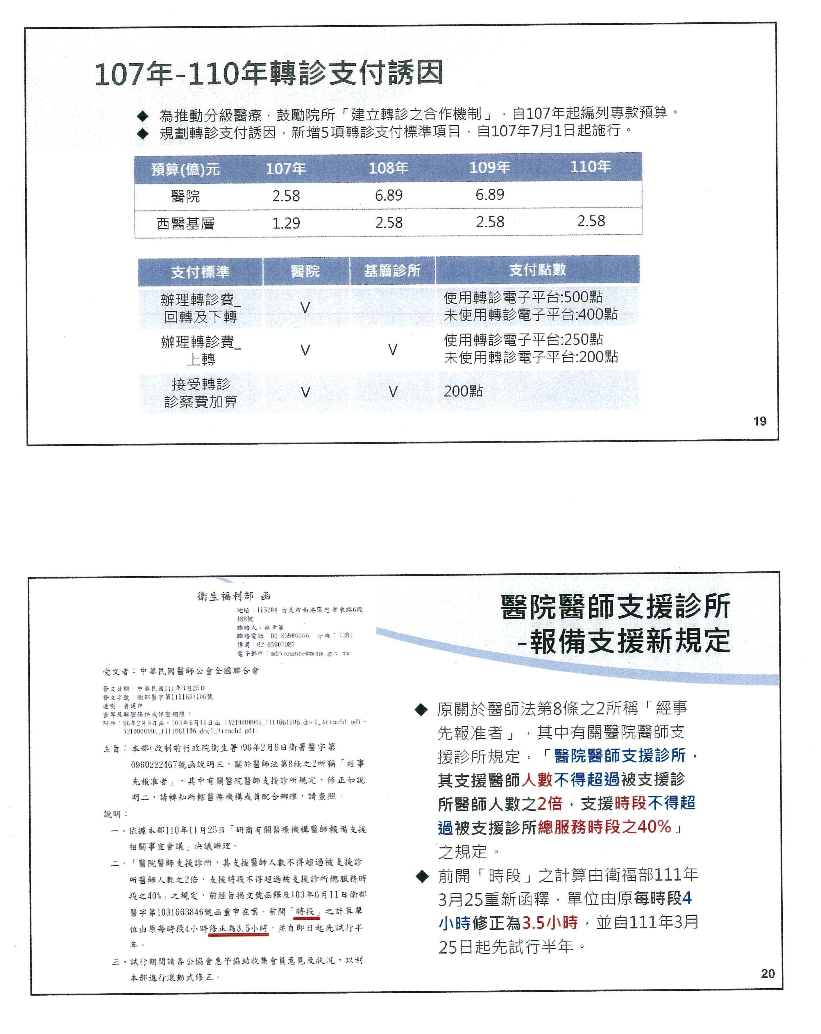 另外,關於如何推動分級醫療,重要的是健保母法的家庭醫師責任制的推動,目前只有西醫基層在推,我希望醫院也能夠推,就是把輕重症病患適當地推給家庭醫師的部分建立一個合作的團隊模式,由基層的家庭醫師來照護,如此不僅可以減少費用,達到健康守門員的角色,也能夠推動適當、合理的分級醫療。