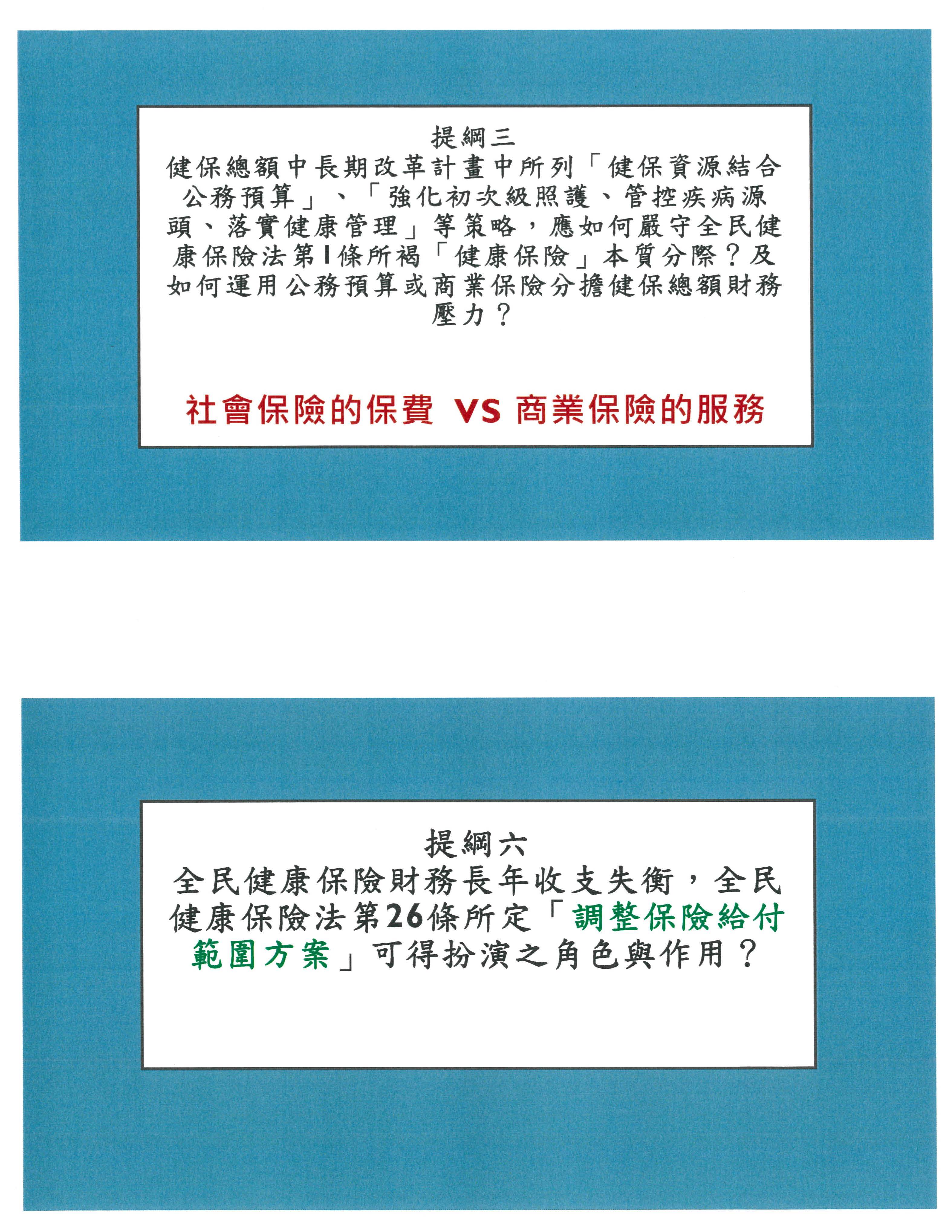 今日公聽會的進行,針對提綱採綜合討論,議題範圍首先從隨著醫療技術的發展,健保給付項目年年增加,是保險制度提高的原因之一,然而我們應該先思索,對於民眾的健康保護,難道只有健保一途嗎?如果行政部門發揮健康投資的精神,在健保之外以公務或基金預算達到健康源頭的管理,是不是能夠減少健保的財務壓力?除此之外,近年來談到健保對財務的問題,分級醫療總是受到各界關注,但實際上民眾就醫習慣改變及醫療資源整合之合理分配成效如何?是不是還有其他可以運用的手段?