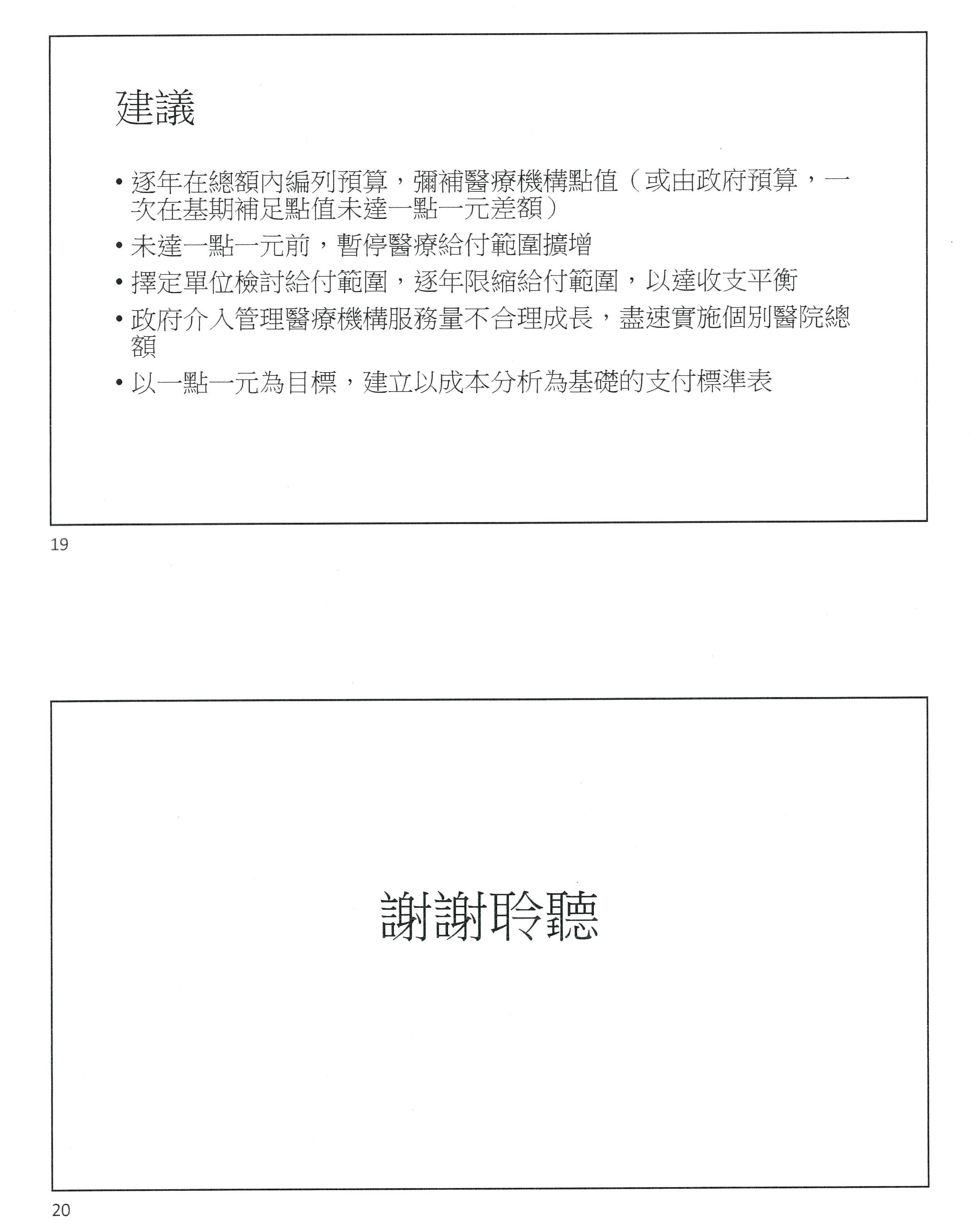 最後,我時常說醫療機構提供醫療服務,常常是做1塊錢,只拿了9毛;事實上,連9毛都拿不到。健保法固然規定採總額支付,但是面對數十年來點值不足,難道就只能讓醫界承受委屈嗎?