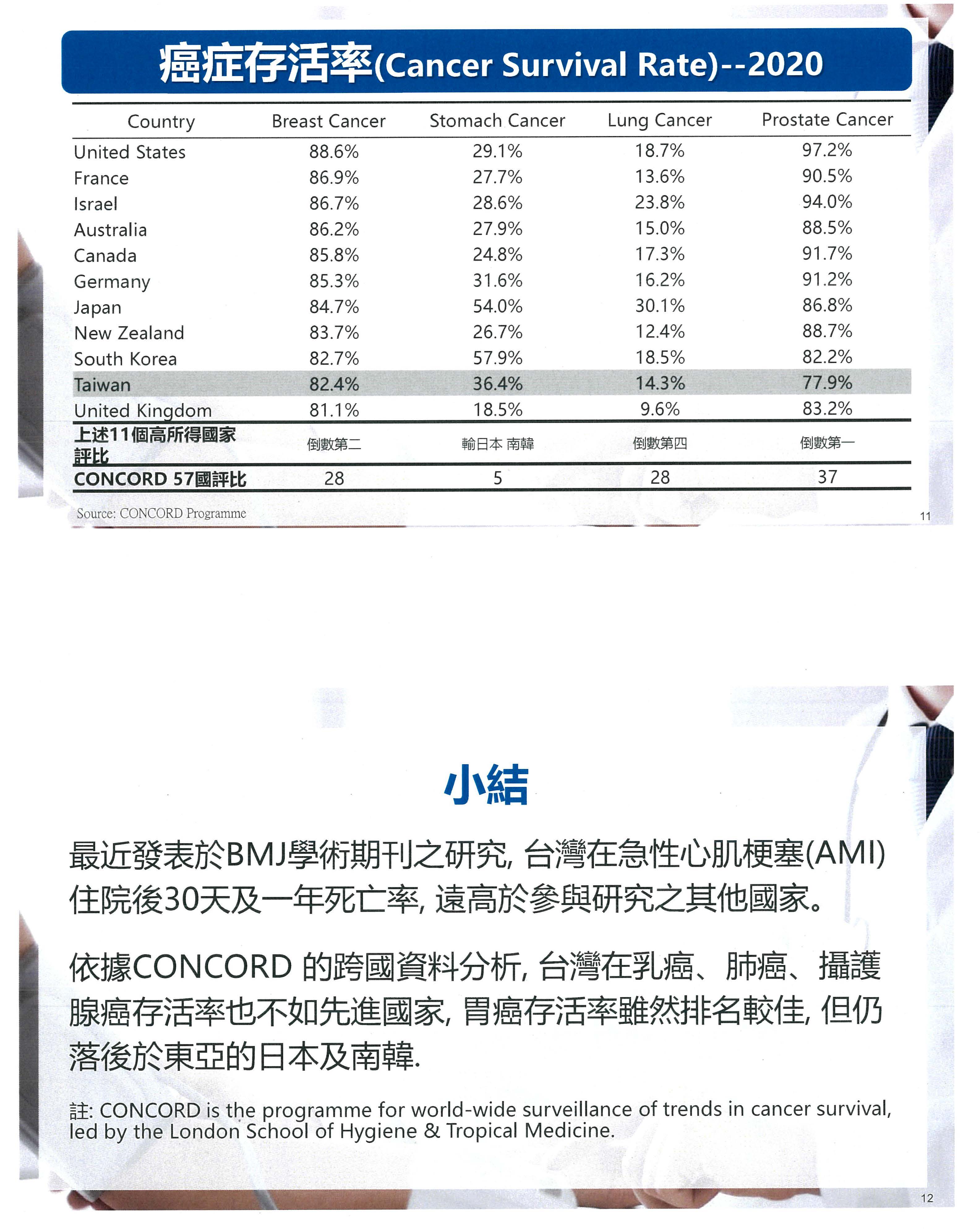 以癌症的存活率來看,從Breast、Stomach、Lung還有Prostate這幾個cancer來看,臺灣在CONCORD 57國評比中,除了胃癌的表現比較好之外,其他的表現也只能算是中段班,即使在胃癌我們也落後亞洲的南韓,所以這些都是國際上比較客觀的指標,而不是一個問卷式的調查,其實從這些指標當中,我們可以看到包括AMI、包括這些癌症的治療,我們都有改善的空間。