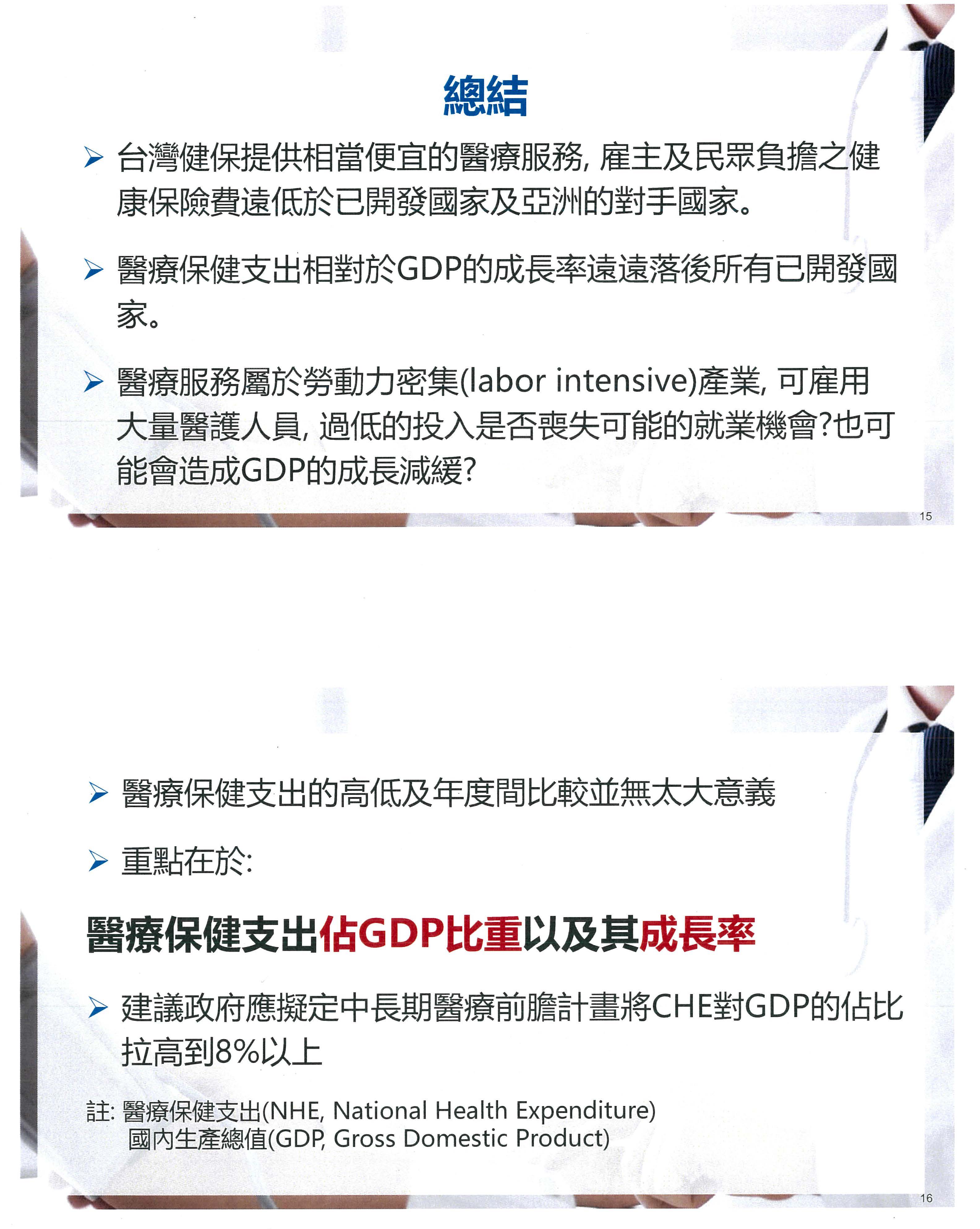所以在此做一個簡單的總結,臺灣的健保,其實它提供相對便宜的醫療服務,雇主跟民眾在醫療的負擔上,其實是少的,對企業主來講,也必須知道相對於其他的企業主,他們的負擔是少的;醫療保健支出相對於GDP的成長率已經遠遠落後已開發國家,而且醫療服務它是屬於labor intensive的產業,多投資之後其實它可以聘用更多的醫療人員做更精緻的照護;相反的,不足的投資是不是也減少了相關的就業機會?我們都說健保已經超過8,000億元,但光講絕對值其實是沒有意義的,重要在於它對GDP的占比的比重以及它的成長率,所以在此建議政府應該要擬定一個中長期的醫療前瞻計畫,CHE或NHE對GDP的占比一定要提高8%以上。