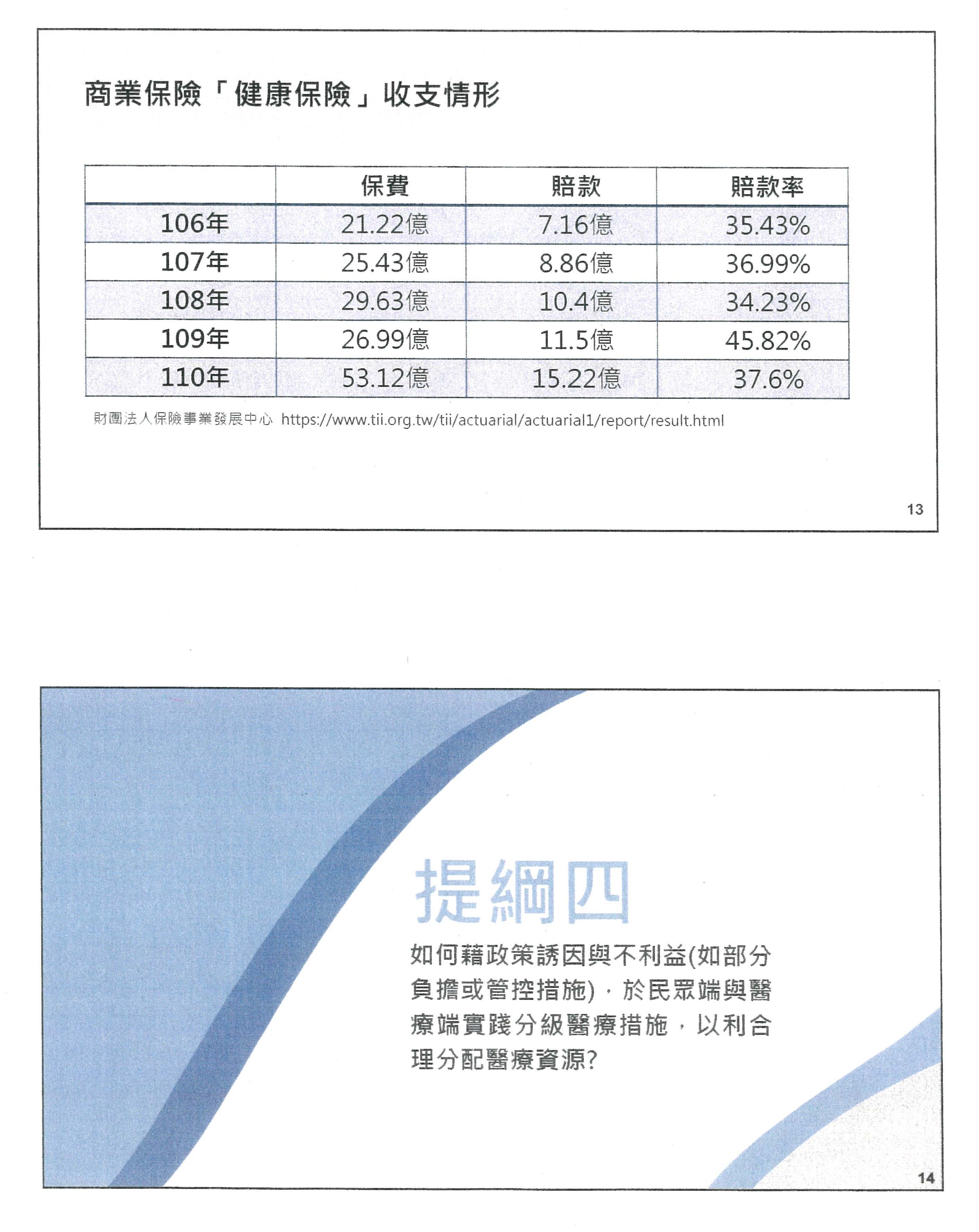 第二點,因為剛才有一些先進提到有關商業健康險發生率的部分,這邊跟大家說明一下,因為國內商業保險大多是長期險,跟國外像美國大多都是一年期險的性質是不同的,所以我們在看理賠率的時候,可能沒辦法用單一年度的保險給付和保費收入直接相除,這樣的作法可能沒辦法反映實際理賠的狀況,因為通常長期險所繳的保費是用來支應未來十幾年之後的支出,所以可能沒辦法用單一年度去做這樣的計算,不過我們會督促保險公司未來在理賠的時候,要確實依據契約條款的約定對保戶做公平合理的賠付,原則上還是要依照契約條款的約定去辦理。