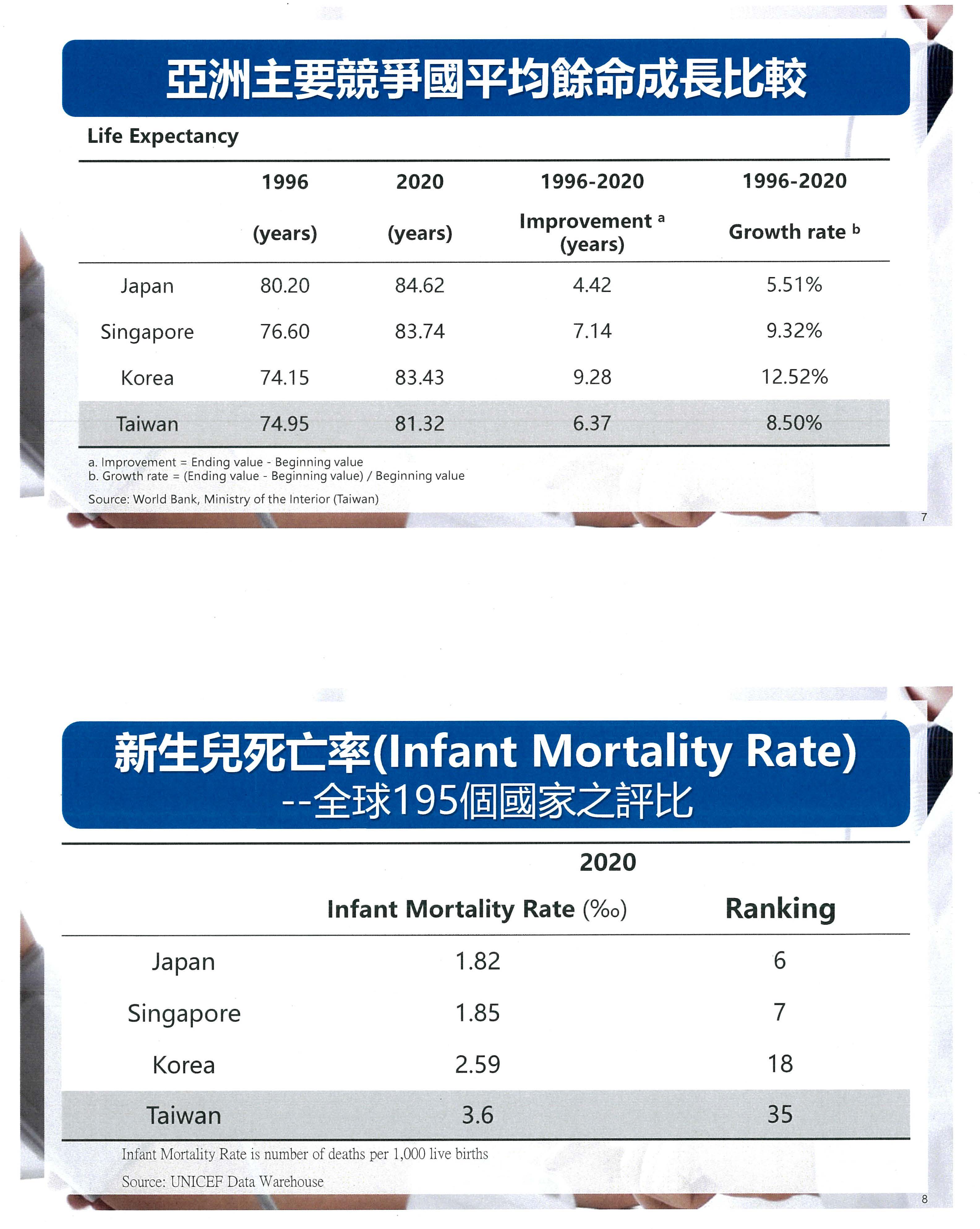 從臺灣的infant motality來看,在2020年的報告中,它是千分之三點六,世界排名第35,落後於日本、新加坡和韓國,這也是一個警訊喔!還有,Lancet在2015年先發表了一份論文,針對世界上百個國家的慢性病照護提出了他們的ranking,臺灣在第一年被排名第45,很多學者非常不以為然,就我所知,還有學者投書表示,它裡頭的一些數據或研究是不正確的;後來在2016年果然我們有進步到了第34名;2019年我們又退到第37名,而日本是第1名,新加坡是第6名、南韓是第18名。