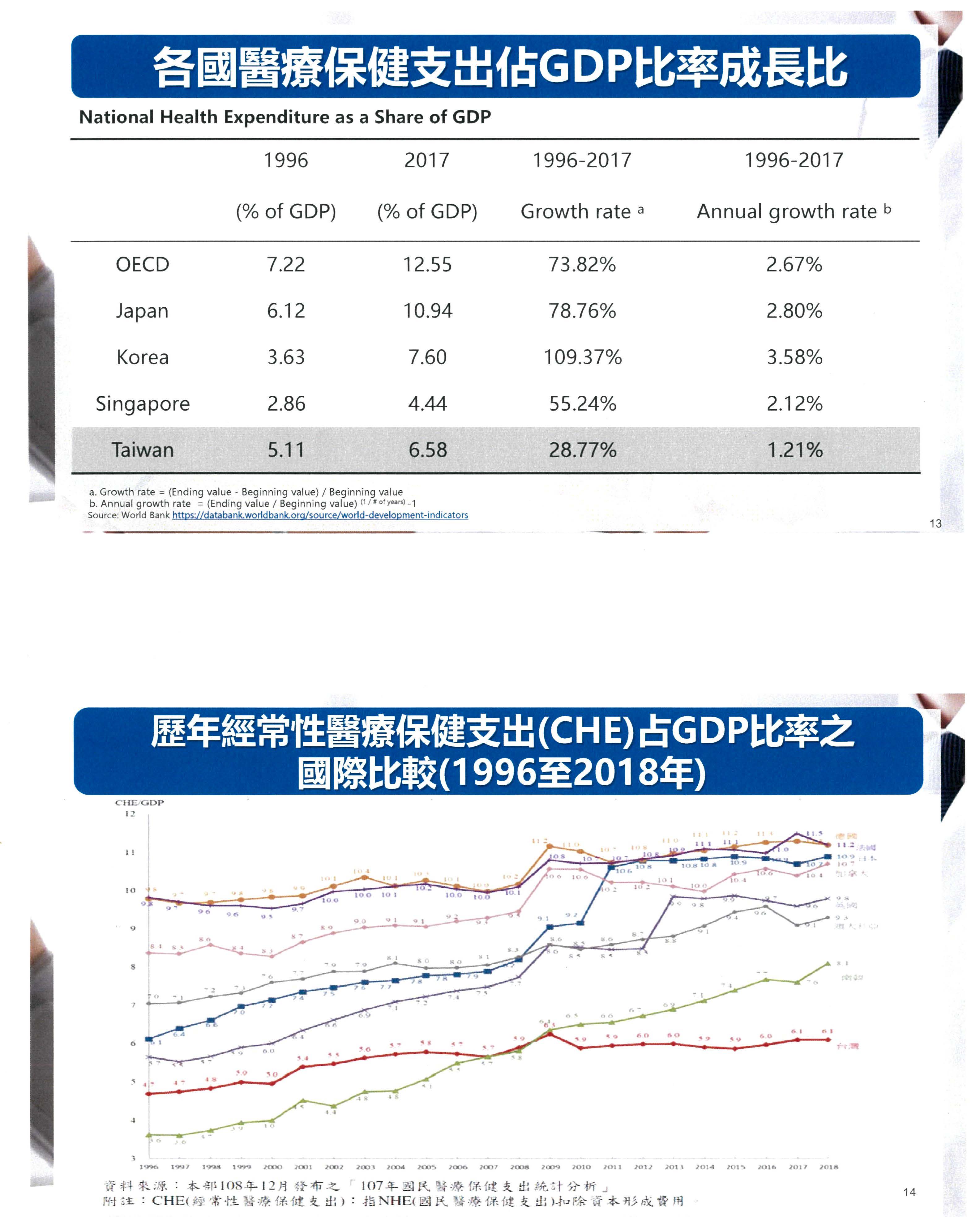 第二個是國民醫療保健支出占GDP多少叫做合理?也許我們不要跟OECD國家差不多。剛剛有一個數據也許不是很正確,我們覺得新加坡做得不錯,他們的數字大概只有百分之五點多,沒有超過6%,但是臺灣一直都是百分之六點多,其實是健保署很用力在壓。韓國從百分之五點多、六點多、七點多,現在已經到8%了,韓國政府不是壓不好,而是有目的、有策略地投資他們本土的生技產業,臺灣要做嗎?韓國在2008年推了長照保險,所以支出自然增加了,這是他們有意要跟上OECD國家的標準,所以我們要回答的是,我們的政府、民眾要這樣做嗎?這是第二個問題。