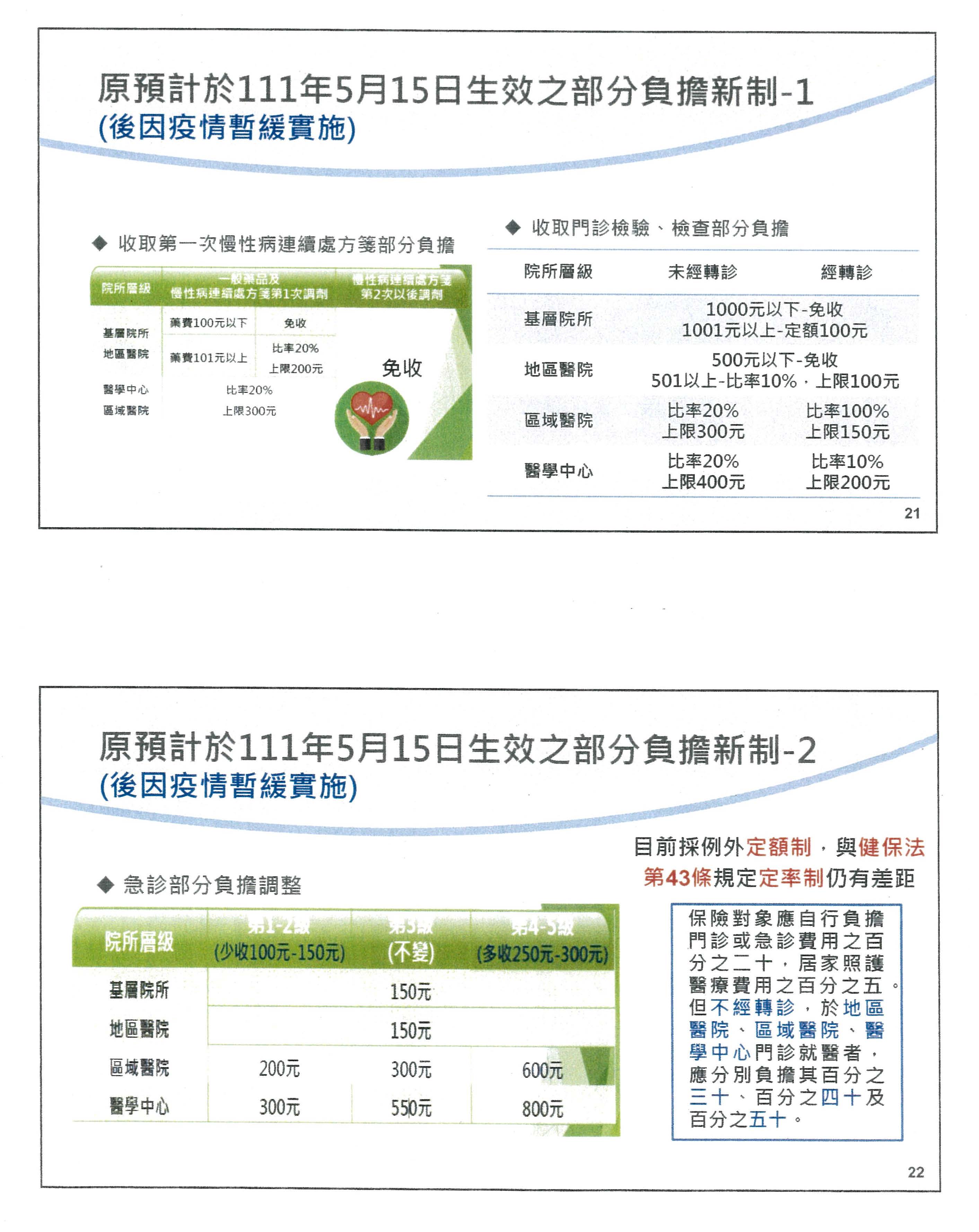 (二)原訂於111年5月15日實施之「門、急診部分負擔調整方案」,調整範圍包括藥品、檢驗檢查及急診部分負擔,期待藉本次調整提升民眾就醫成本意識,促進醫病共同決策,以減少不必要的就醫行為,協助促進分級醫療,強化醫療服務效率使健保效益極大化。前述部分負擔新制因COVID-19疫情影響暫緩實施,後續將考量疫情及社會經濟狀況,在政策實施可行、院所醫療資訊系統整備完善時再行推動。
