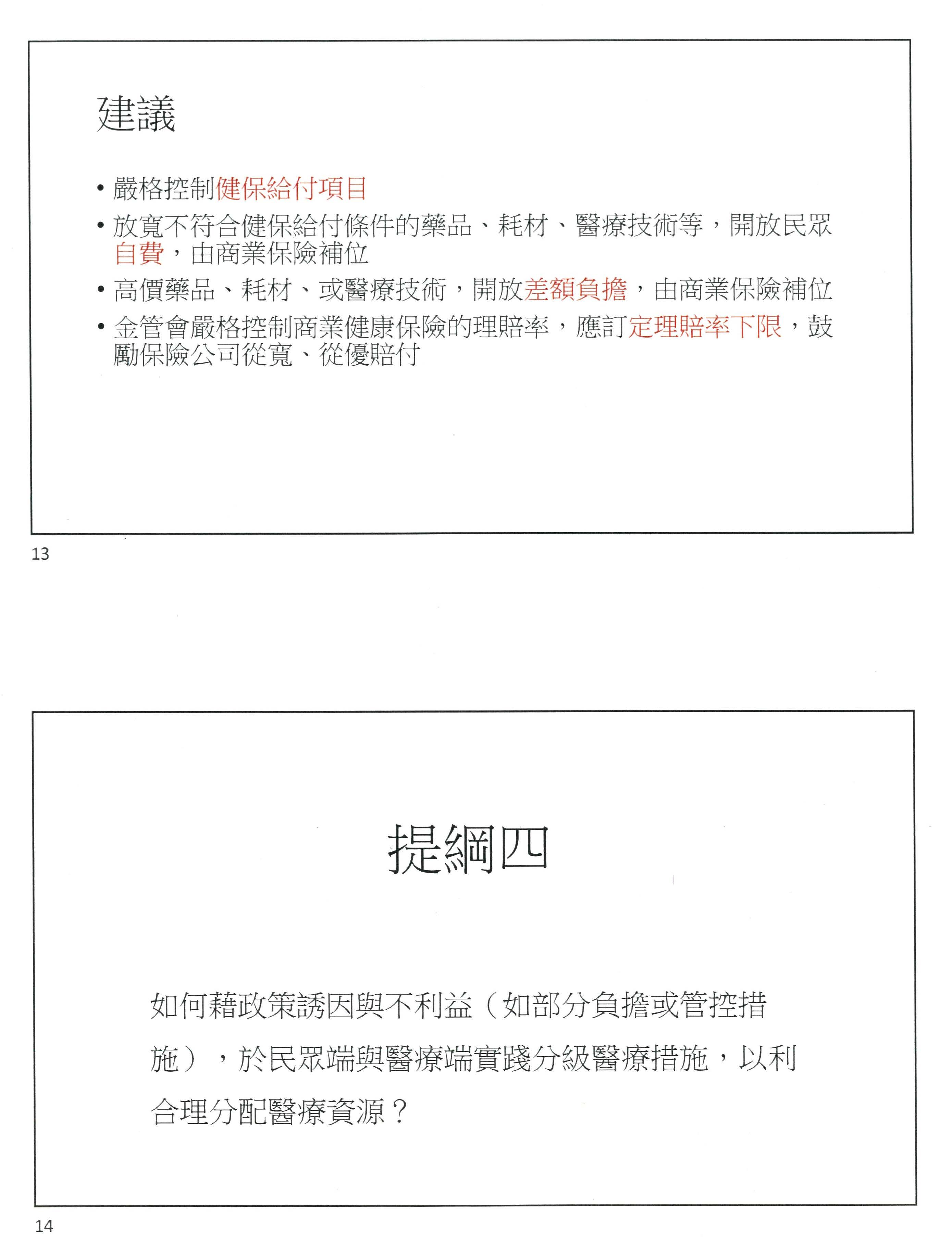 所以我們建議:第一,要確保我們的保險給付範圍。第二,新增給付項目總量管制,包括新藥、新科技醫療,能夠明定用專款的方式,讓民眾足額使用,沒有使用的時候就退回給大水庫。還有很重要的是,所謂新醫療的需求既然要推向商業保險,首先就要確保哪些不給付,由民眾去提,如果是屬於全民健保該給付的,就由全民健保支付;民眾提的項目如果全民健保不給付,就推給商業保險。