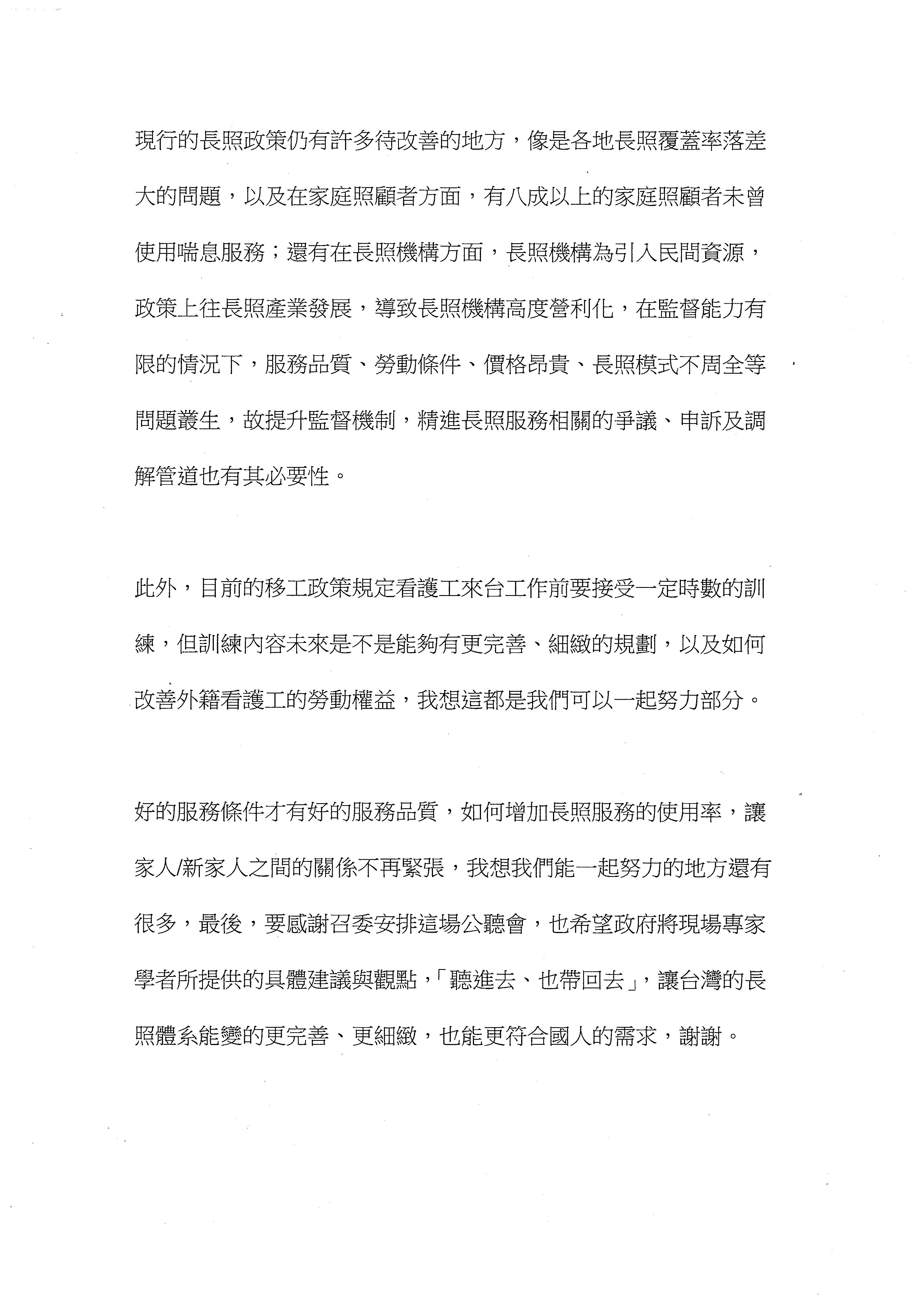 第二點,個人聘僱的家庭看護工應該要落日,至於如何落日,當然我們聯盟還需要做進一步的討論,但在此我要代表協會說的是,因為個人聘僱的落日,我覺得過去這個制度是因為長照資源不夠所以把聘僱個別看護工的責任推給家庭,讓家庭去當一個雇主、去承擔所有管理的壓力,可是當他的工人出了問題的時候,他還要想辦法解決這個問題,可是他的長照服務還是沒有進來,所以我們認為應該要廢除,讓個別家庭聘僱制度落日,讓政府承擔起長照責任,這樣雇主才可以去掉他所謂雇主的角色,真的回歸到長照服務接收者的角色;而這個服務可以有很多項目,就是全部納入機構聘僱,讓機構去做一個分配,並討論出更多符合服務使用者需要的服務方式,我覺得這兩個東西配合起來,才可以真的達到剛剛提到所謂照顧的概念,然後讓大家在這個制度裡面都不會被剝削、被傷害。謝謝。