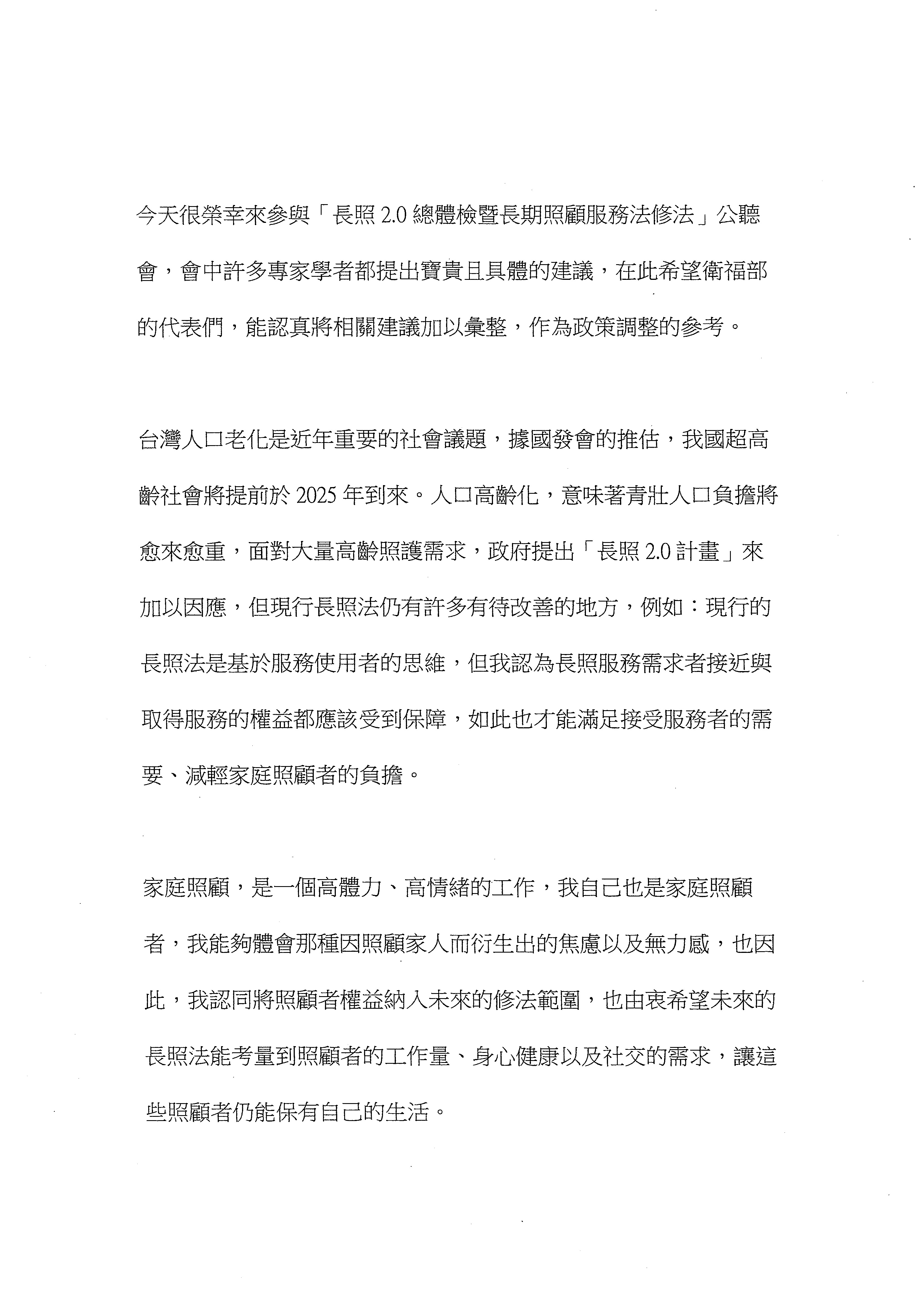 我們希望,因應CRPD的精神,讓障礙者使用長照有更多自主的選擇權、有個人福利帳戶的機制,並讓他們有申訴的管道、參與政策的機會跟空間,不再被噤聲。此外,移工的議題也應該納入考量,正視移工是我們國家長照的重要人力。最後在這邊要求,長照必須立法、依法要求各縣市調查實際的需求,逐年改善、編列經費,因應人口快速老化及多元族群身分交織下所產生的需求,不要讓悲劇再度上演。長照的破網如果沒有補起來的話,我相信對每一個人的生命照護而言都是很大的危機。以上是我們聯盟的發言,謝謝。