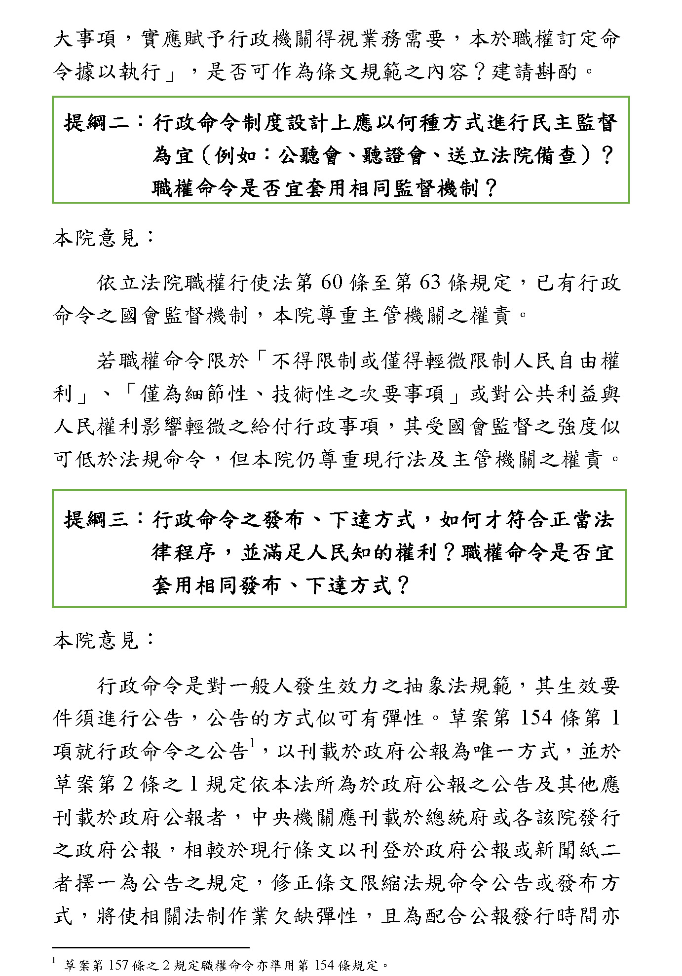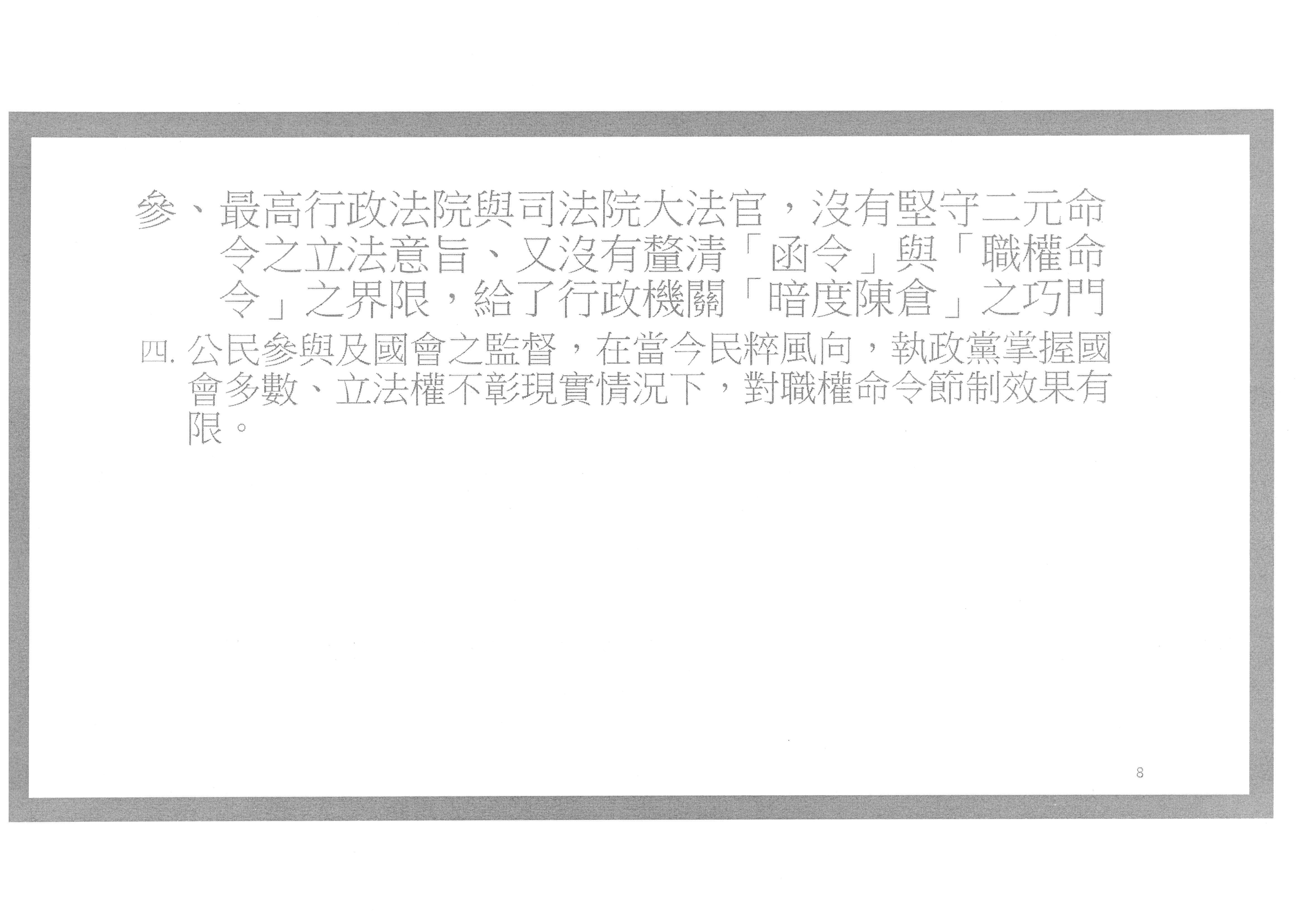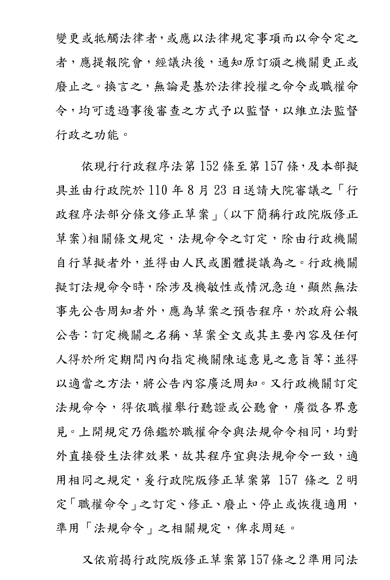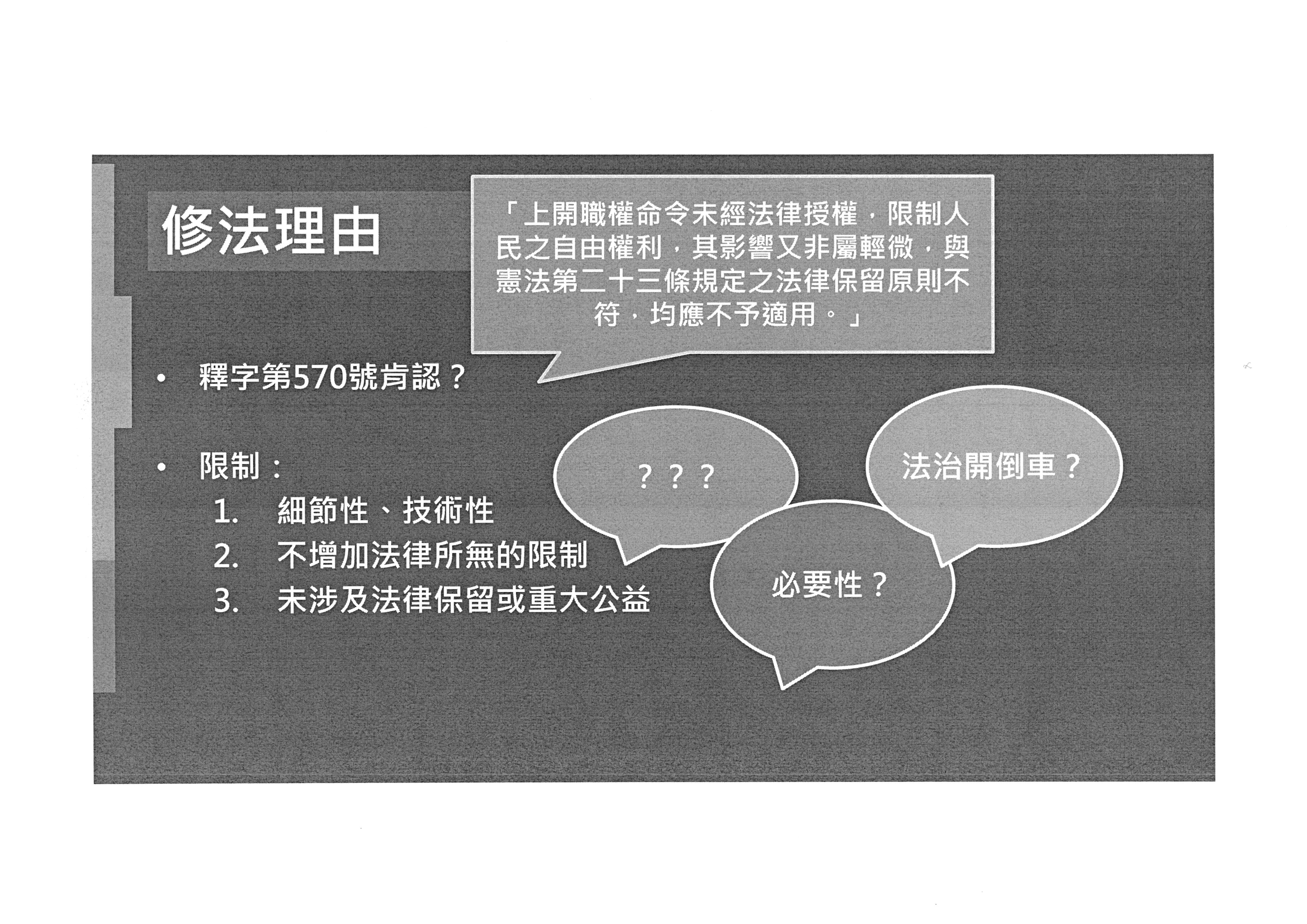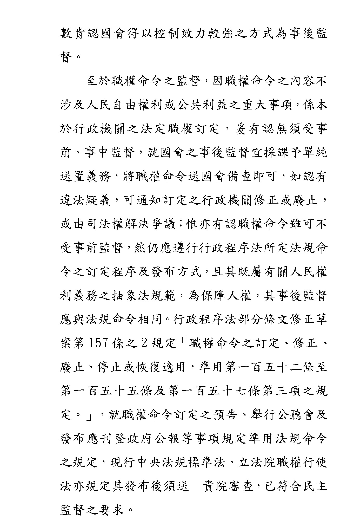 其次,關於監督的部分,目前立法院職權行使法第六十條至第六十三條,已經針對行政命令之監督予以明定。有關職權命令的部分,其實只要符合我們剛剛所提到的框架部分,送立法院備查的話,我們覺得是可以落實監督的機制。