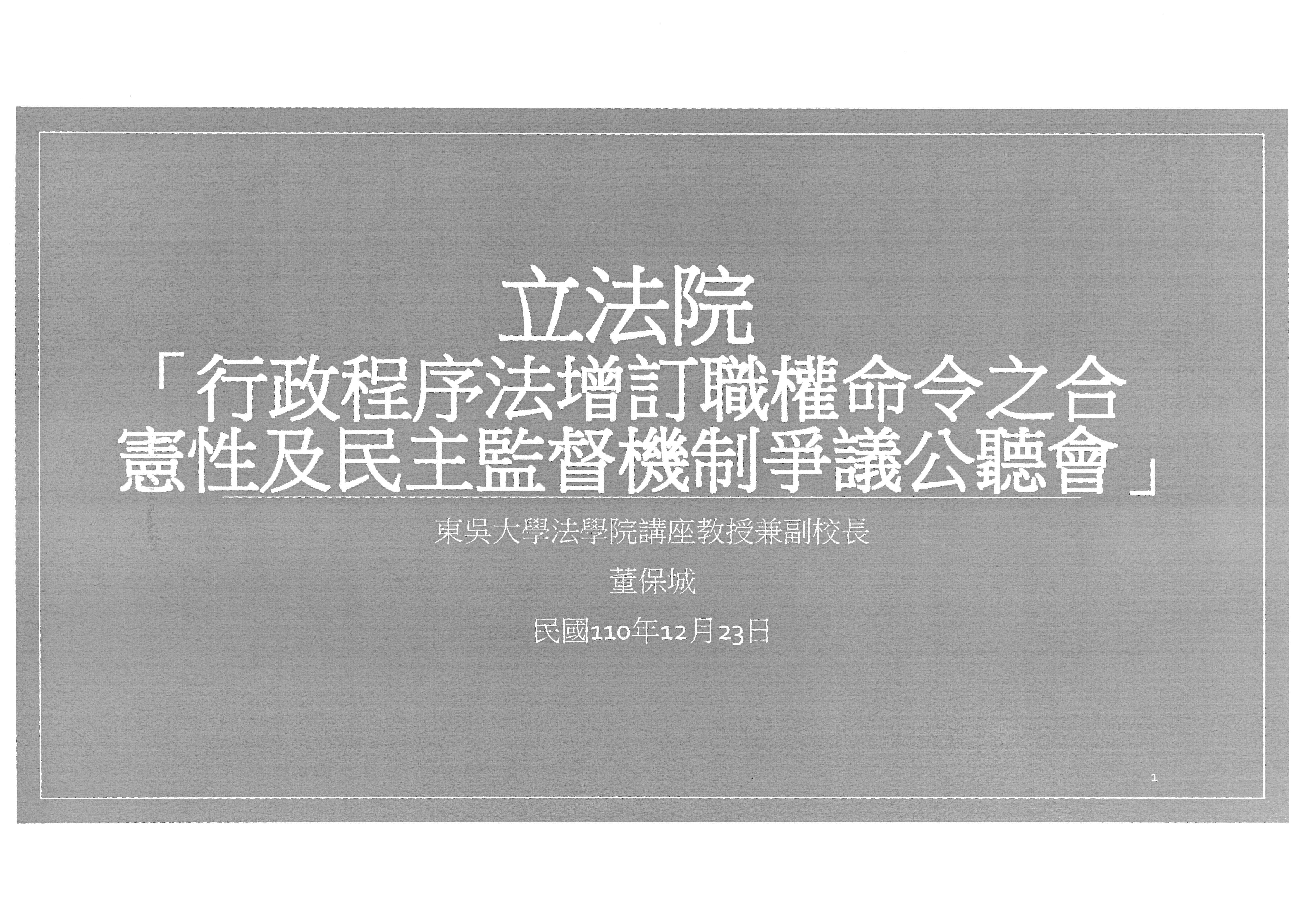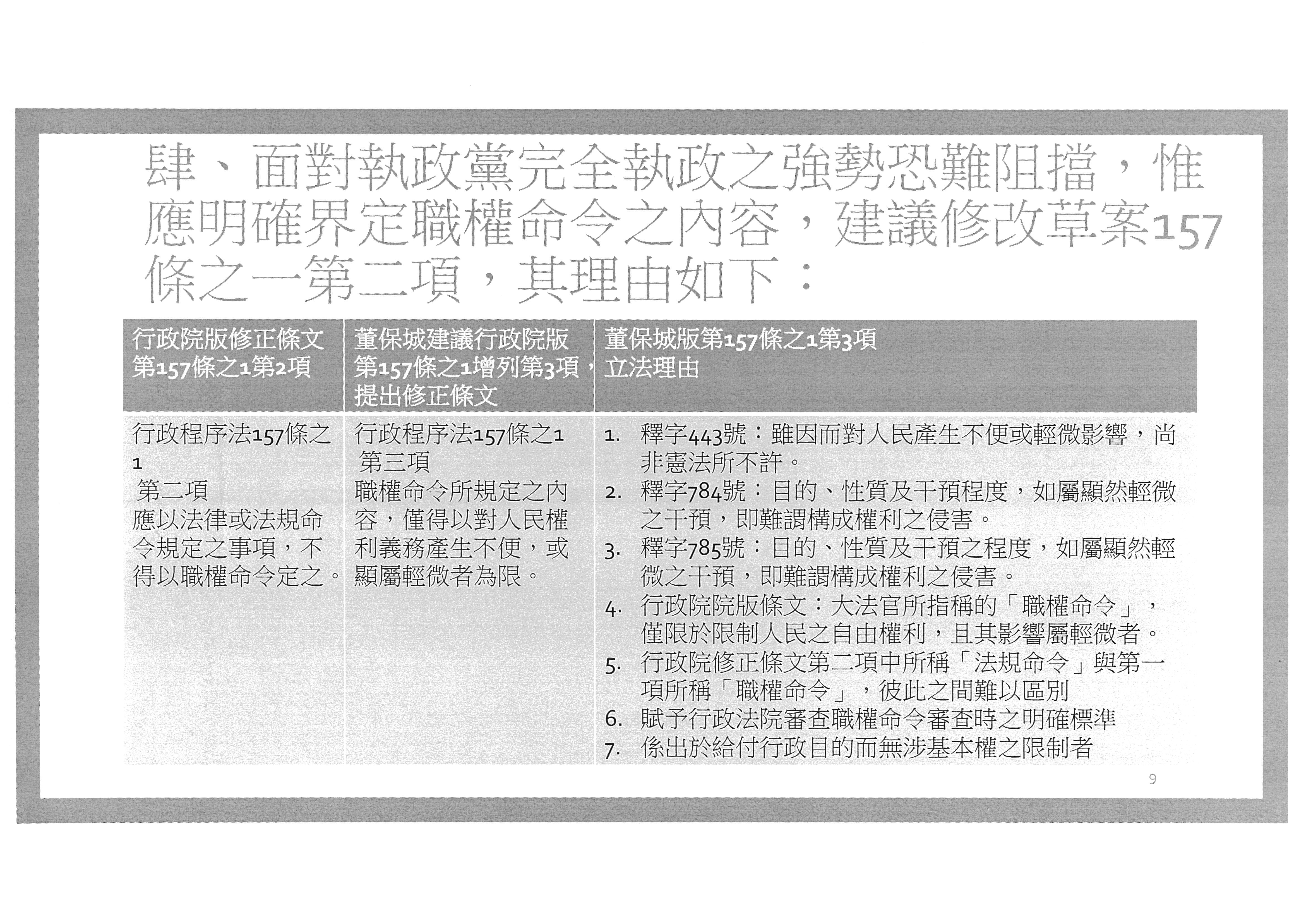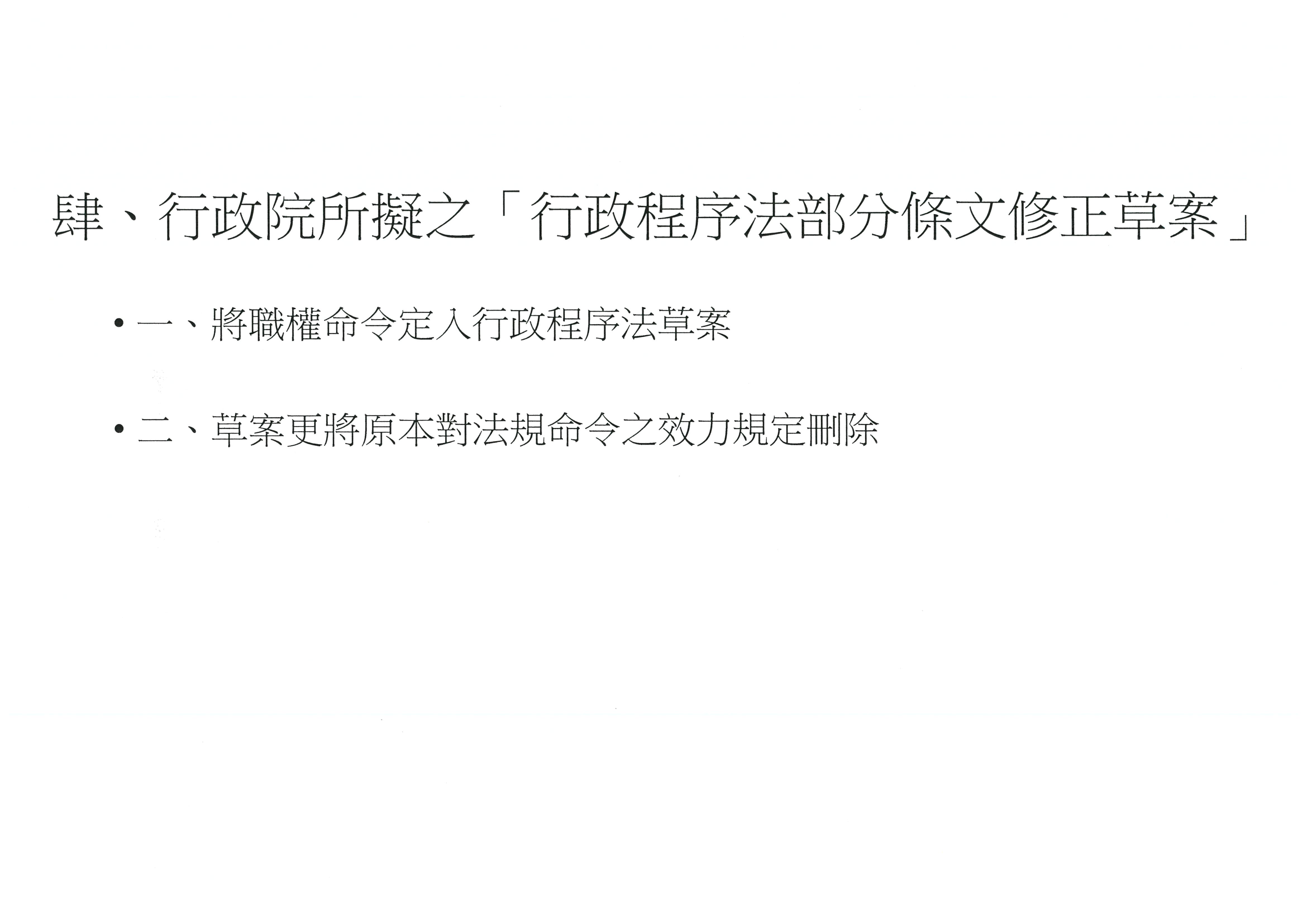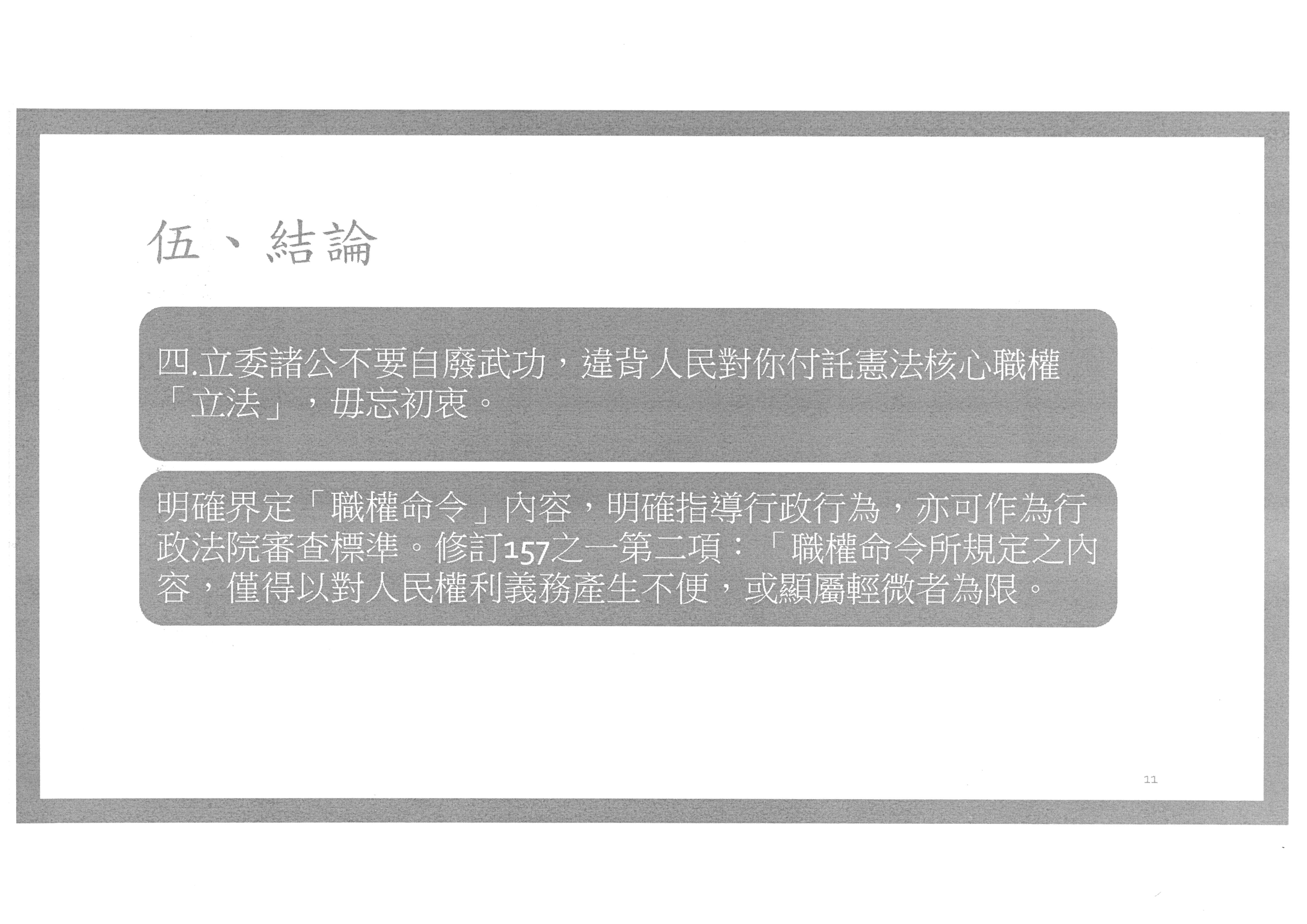 其次,關於監督的部分,目前立法院職權行使法第六十條至第六十三條,已經針對行政命令之監督予以明定。有關職權命令的部分,其實只要符合我們剛剛所提到的框架部分,送立法院備查的話,我們覺得是可以落實監督的機制。