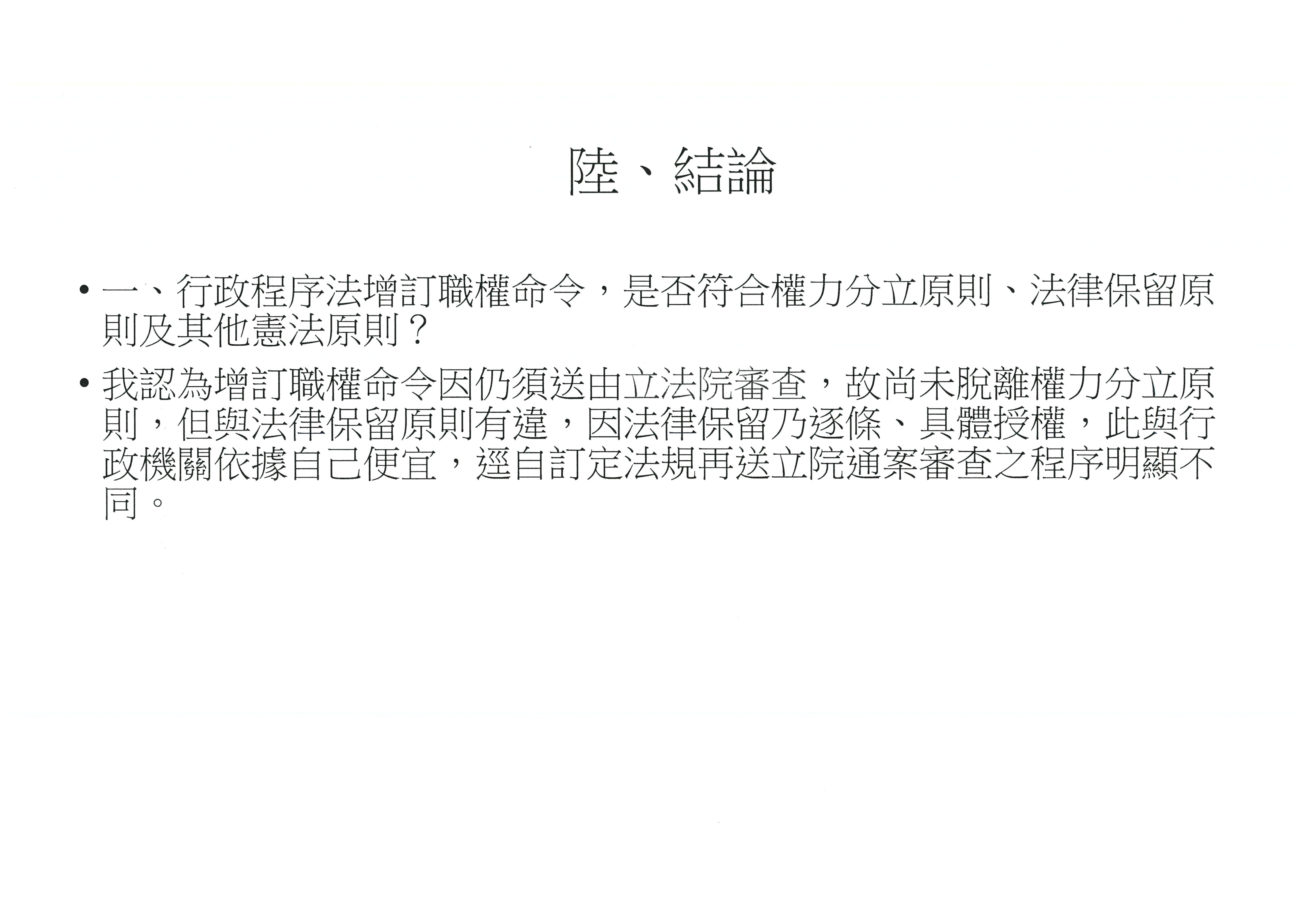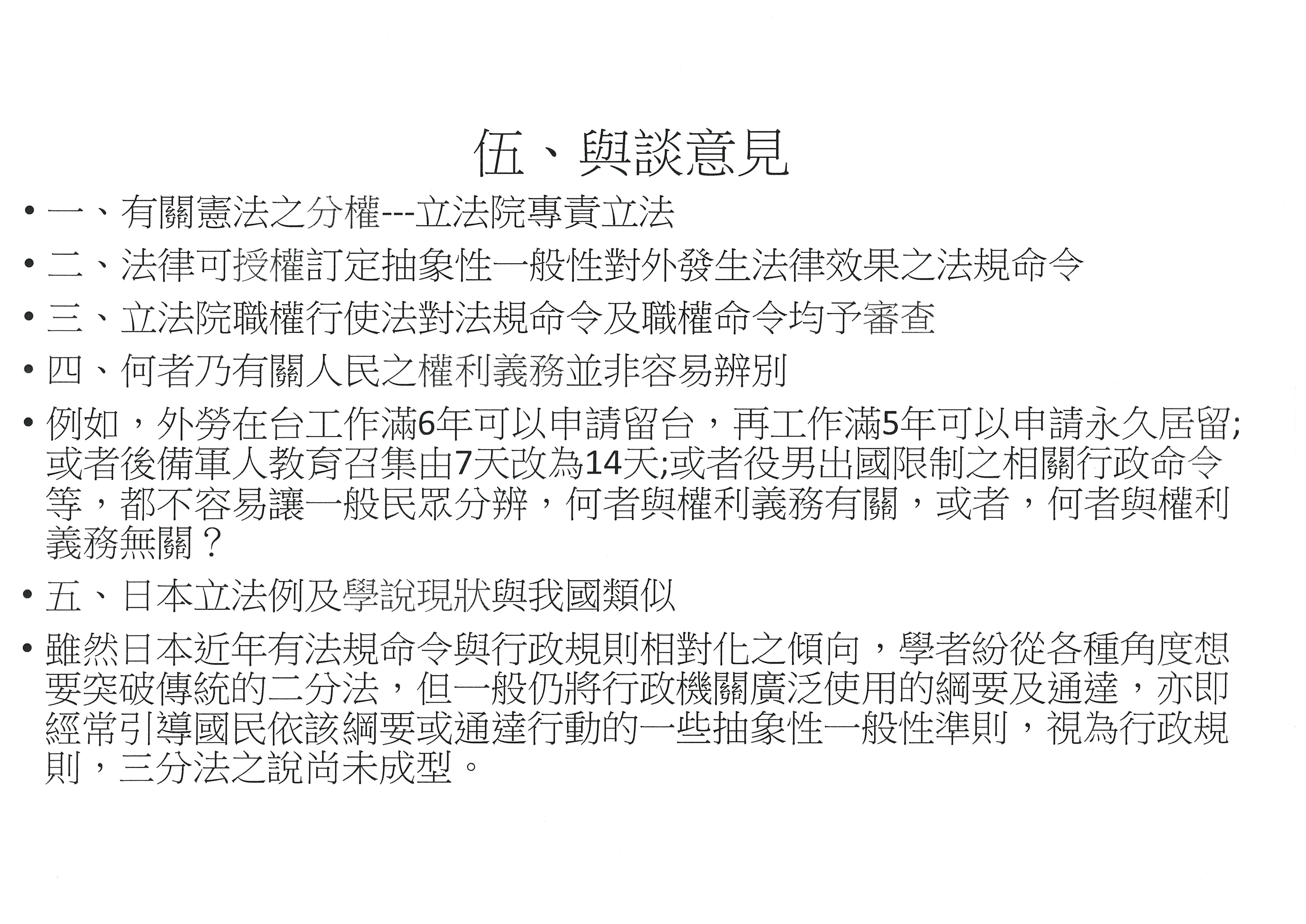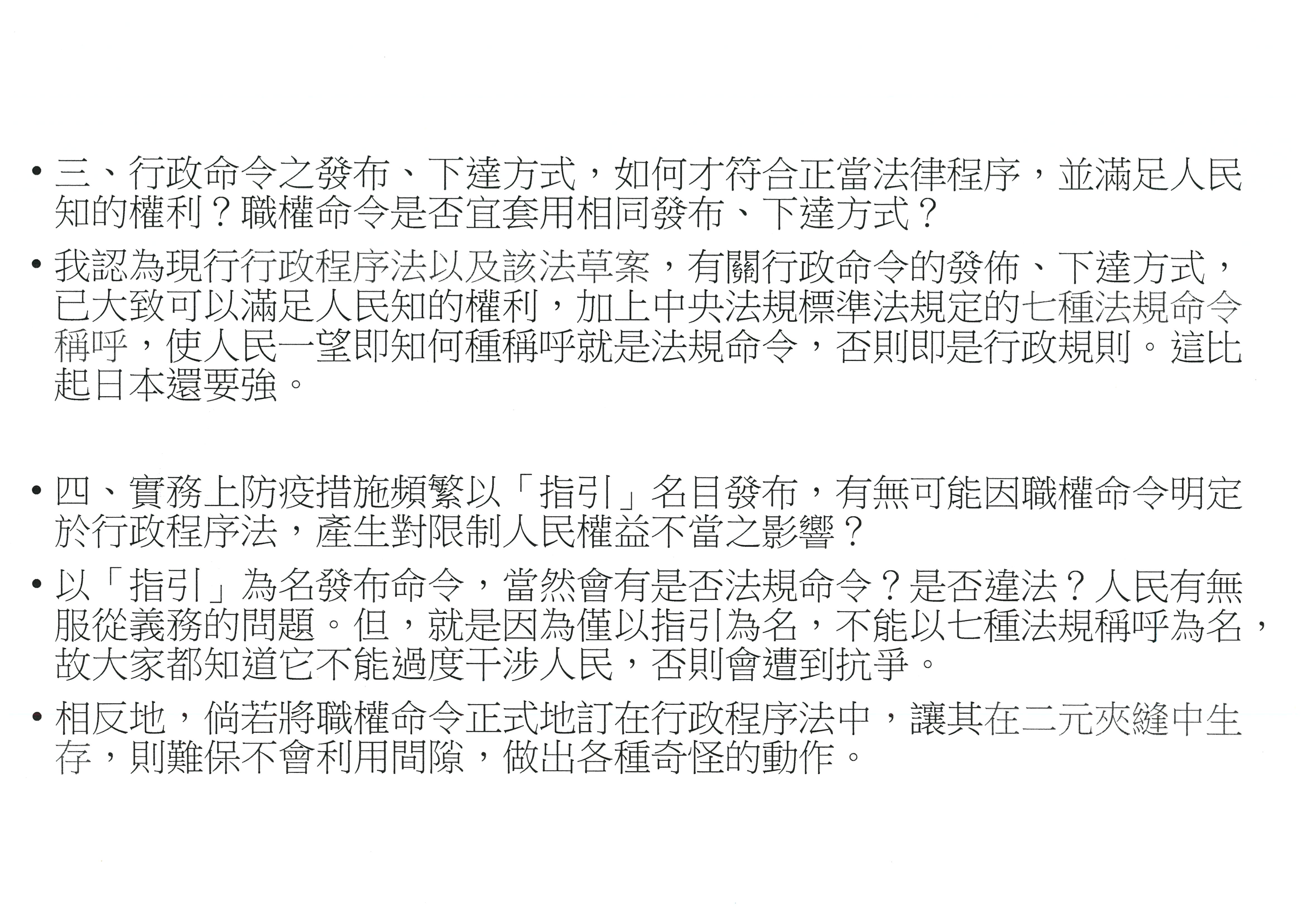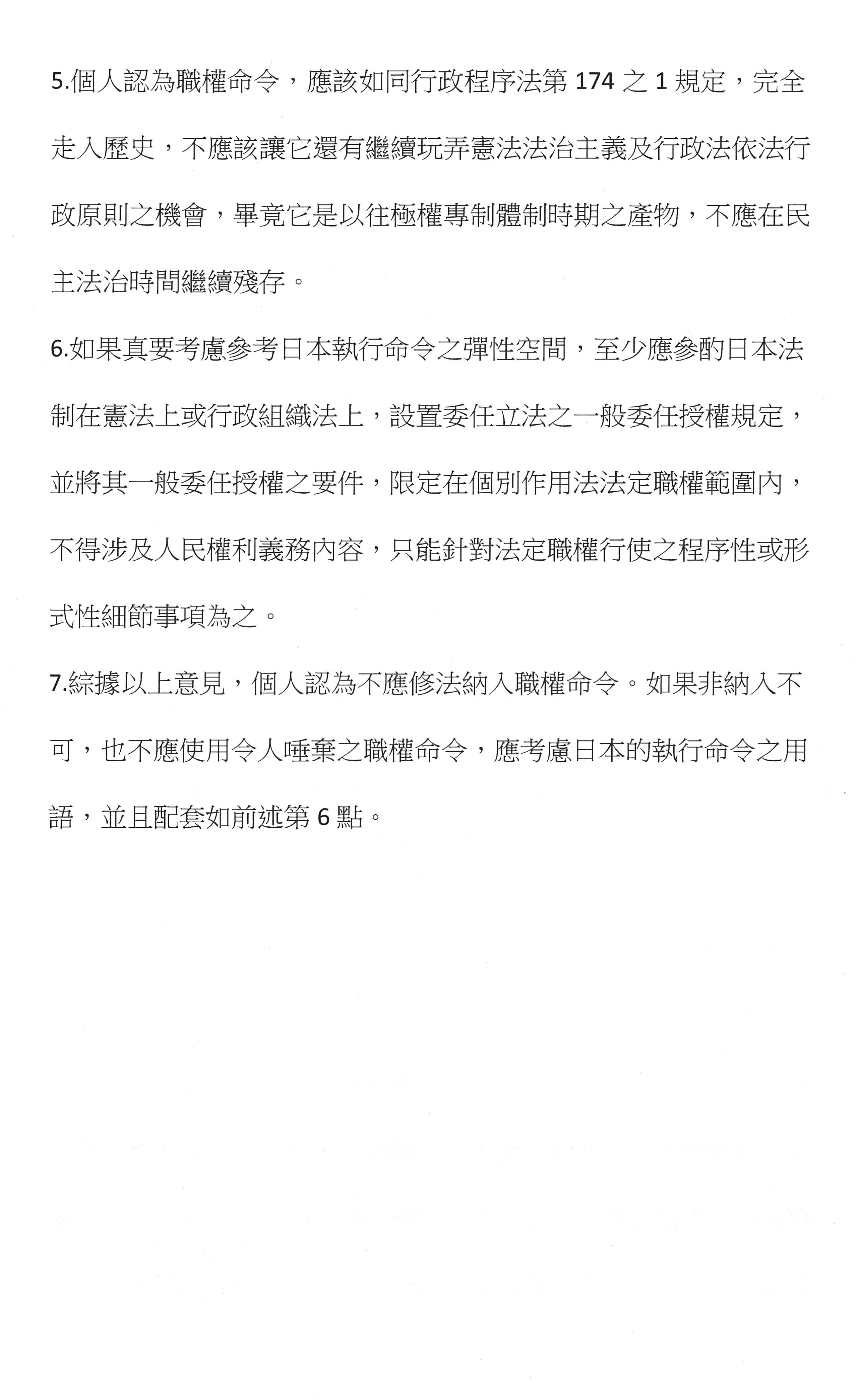 在我今天所附的書面資料裡面,最後的結論還要再修改一下。我今天除了發表個人的意見之外,我的結論還沒說完。陳春生前大法官提到:第一,行政程序法第一百七十四條之一的立法理由就是要確保命令二元化,這是他的書面理由,我可以給各位;第二,他認為行政院這次修法把第570號解釋作為修法的背書,完全是誤解了第570號解釋,用第570號解釋作為職權命令的依據理由是陷大法官於不義(因為第570號解釋是陳春生前大法官參與的),所以在概念上完全沒有必要訂職權命令。就像德國原來很多職權命令都是立法機關逼著行政機關趕快提出法案、取得授權,以此受到國會的監督。