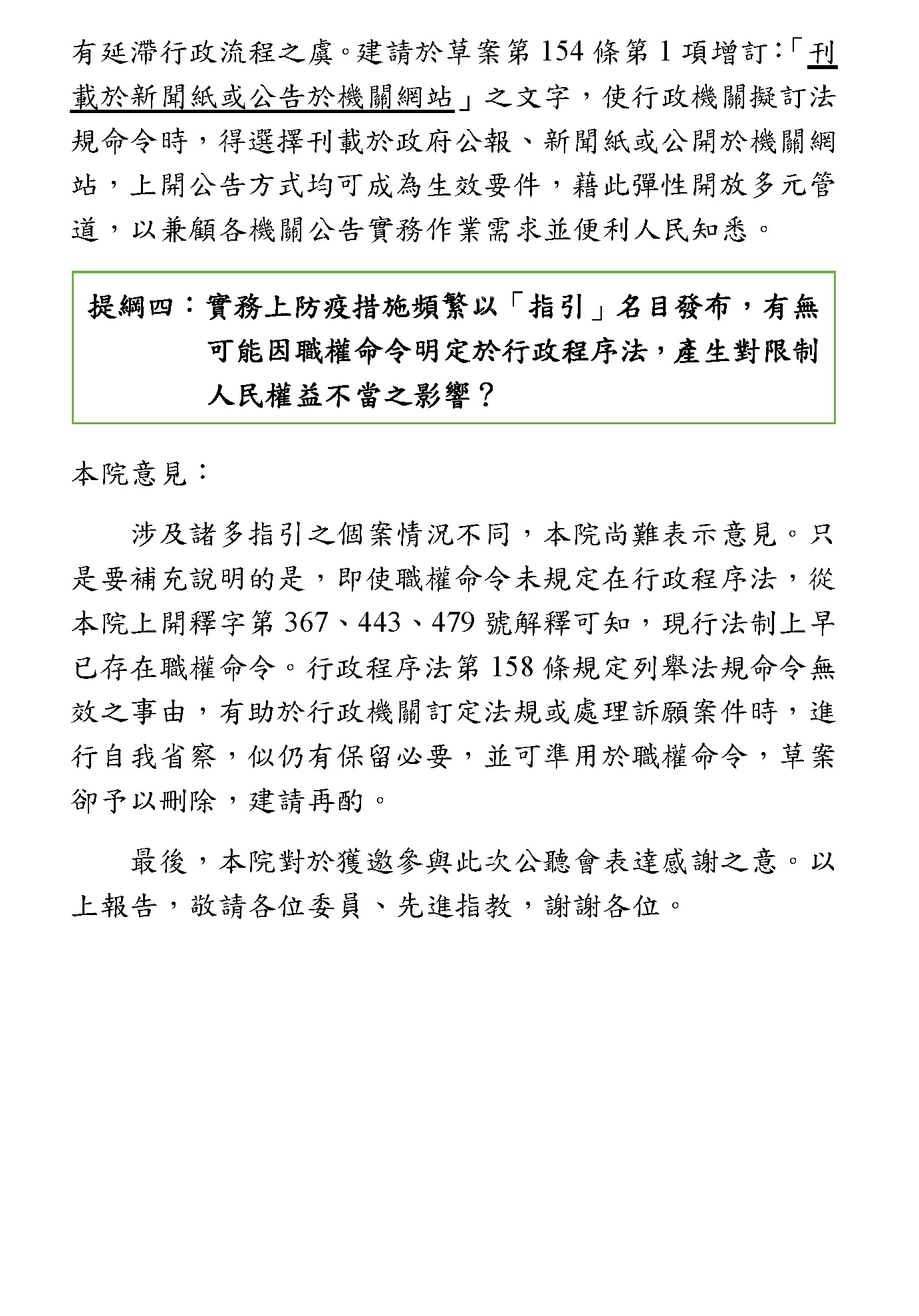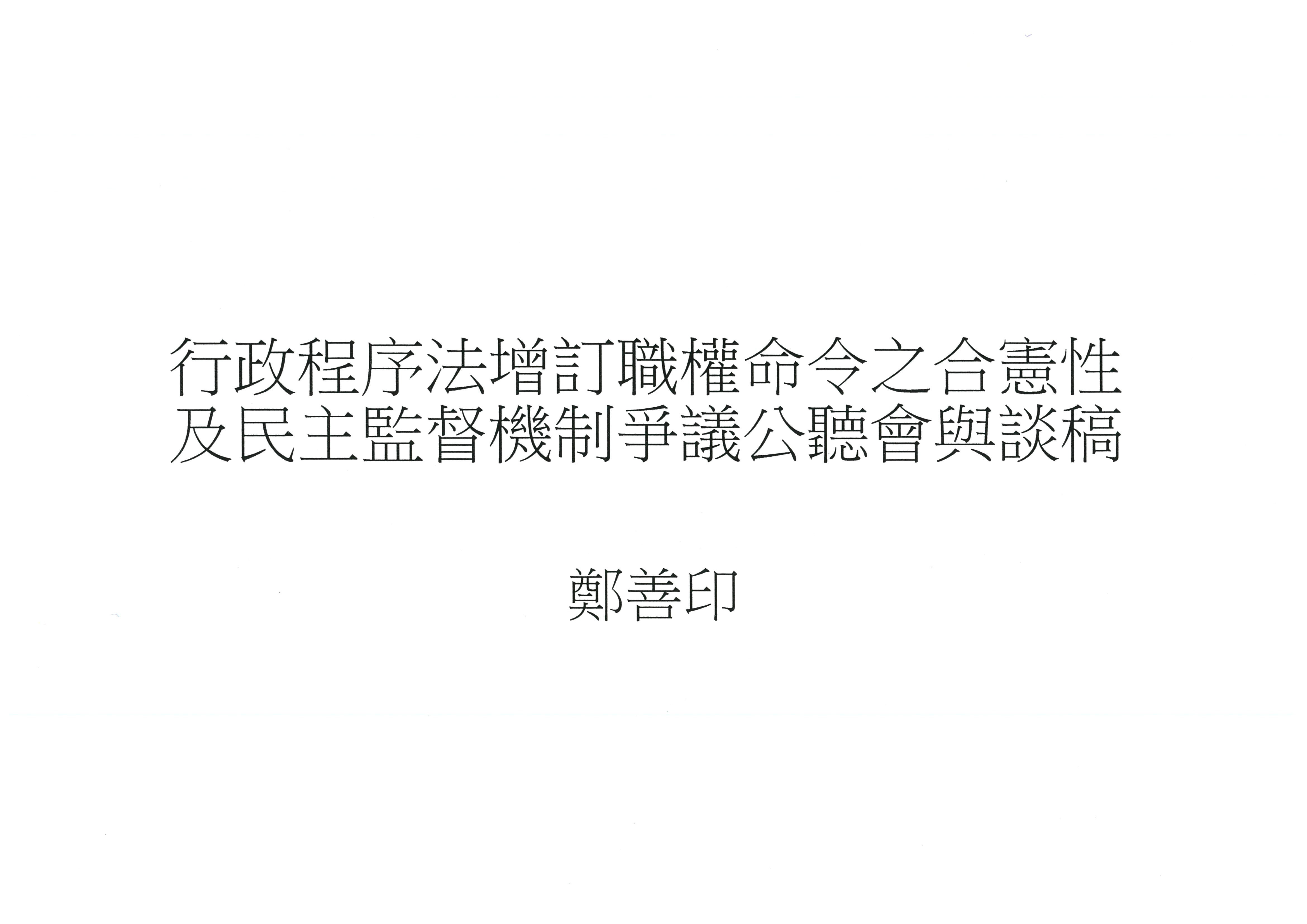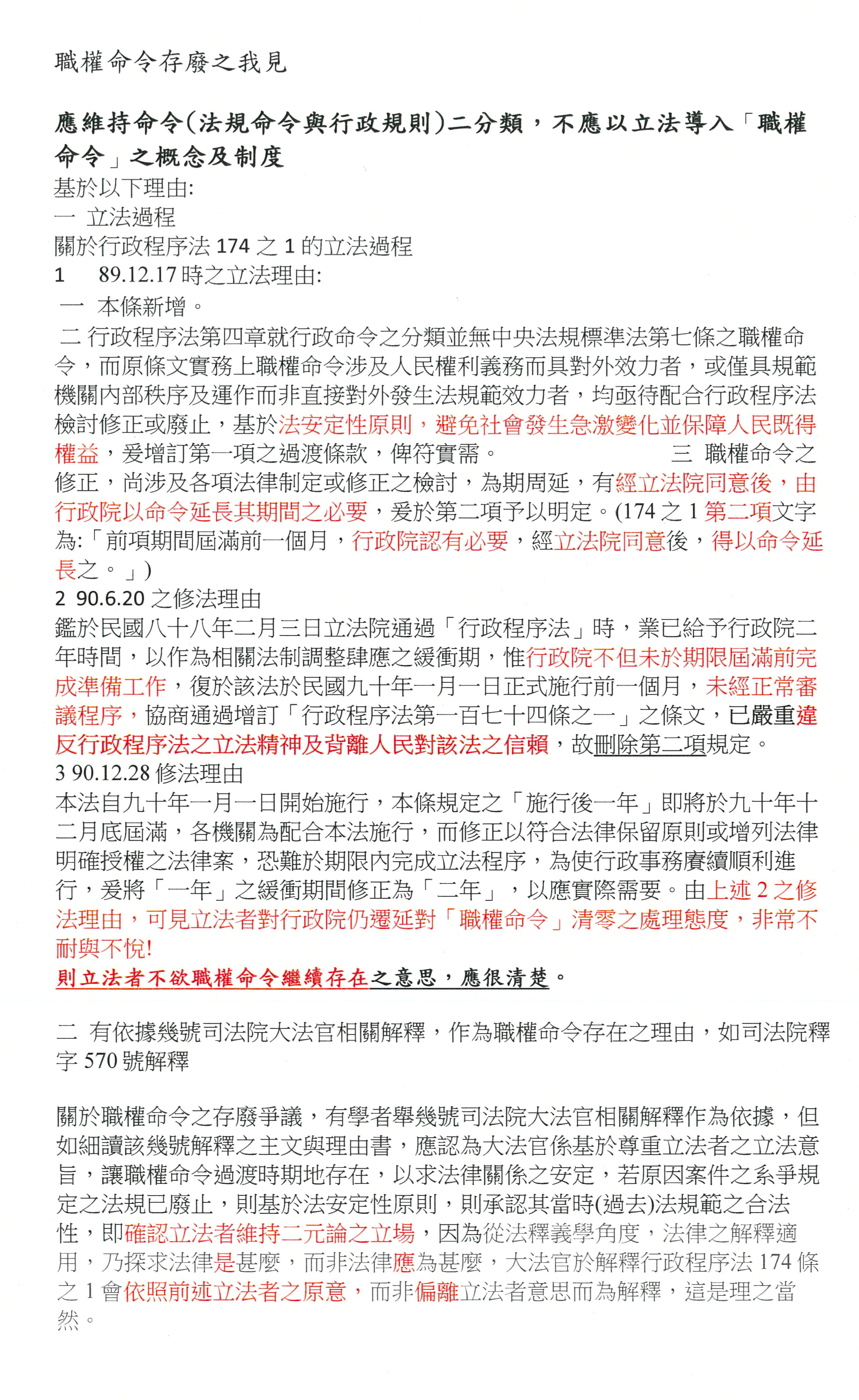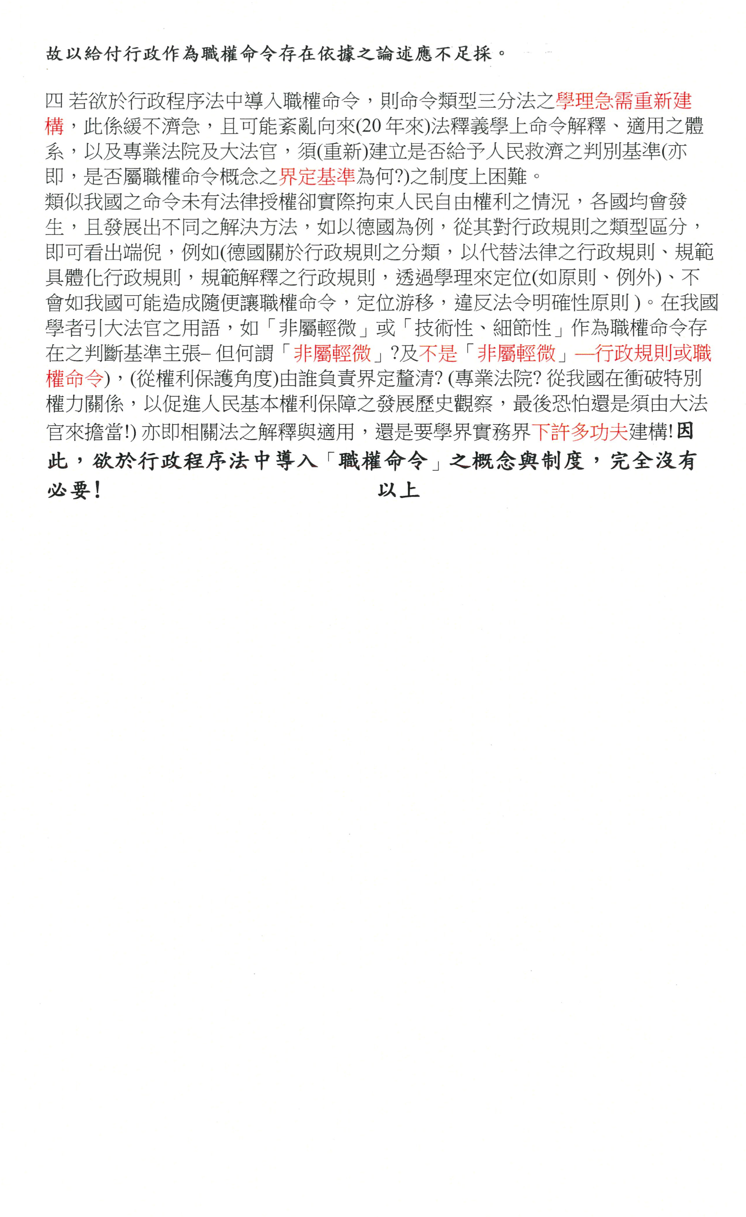 在我今天所附的書面資料裡面,最後的結論還要再修改一下。我今天除了發表個人的意見之外,我的結論還沒說完。陳春生前大法官提到:第一,行政程序法第一百七十四條之一的立法理由就是要確保命令二元化,這是他的書面理由,我可以給各位;第二,他認為行政院這次修法把第570號解釋作為修法的背書,完全是誤解了第570號解釋,用第570號解釋作為職權命令的依據理由是陷大法官於不義(因為第570號解釋是陳春生前大法官參與的),所以在概念上完全沒有必要訂職權命令。就像德國原來很多職權命令都是立法機關逼著行政機關趕快提出法案、取得授權,以此受到國會的監督。