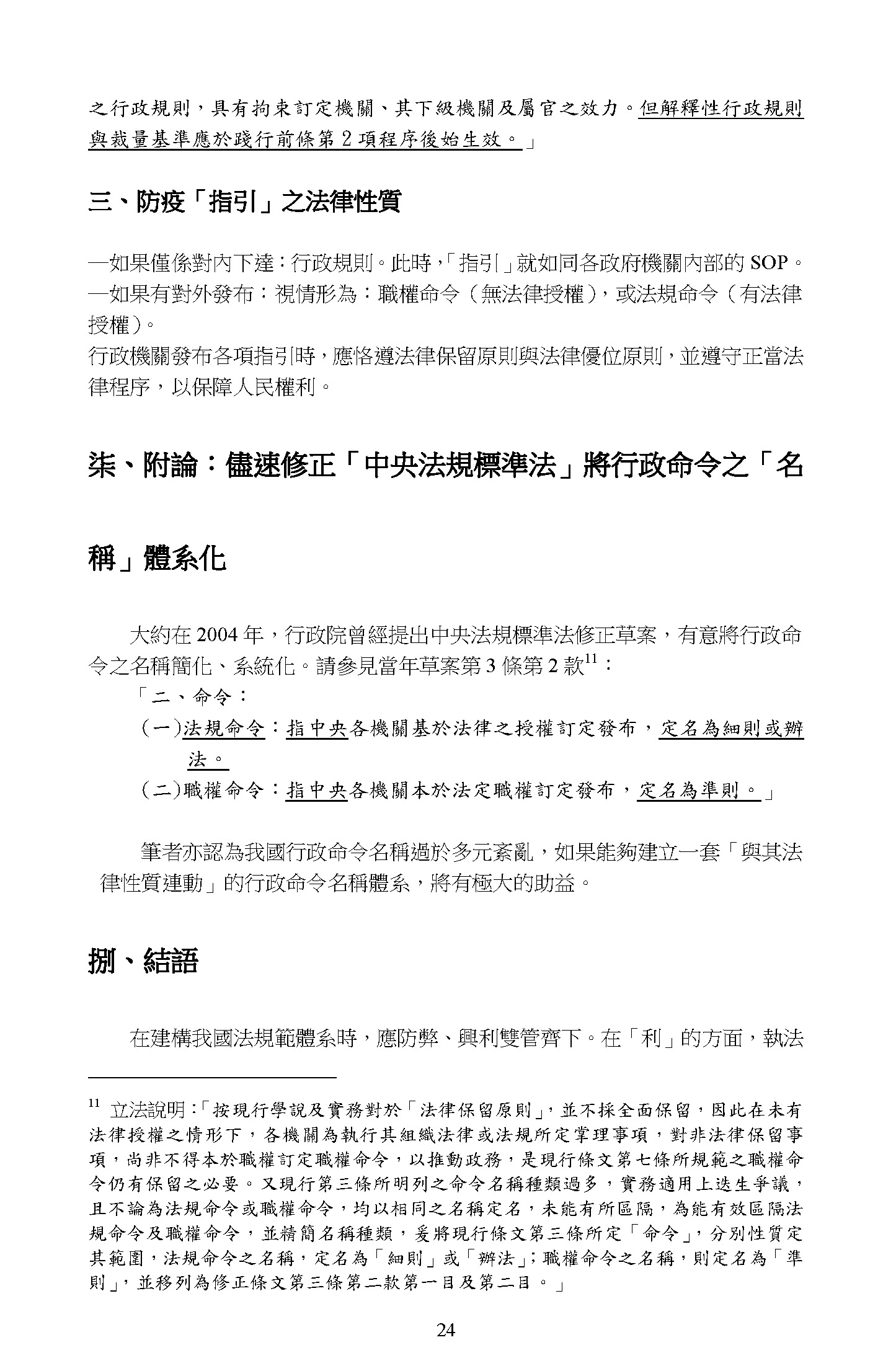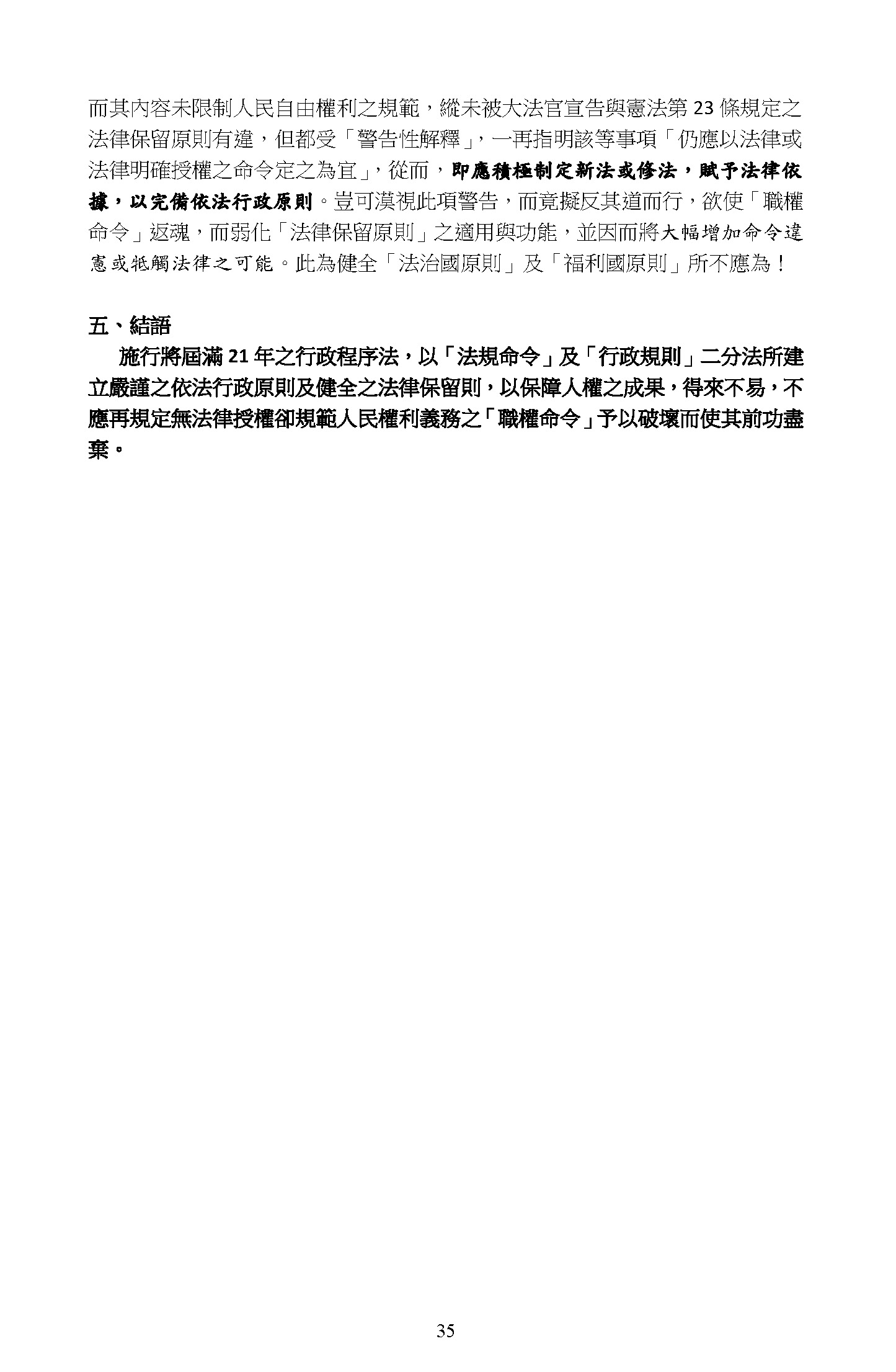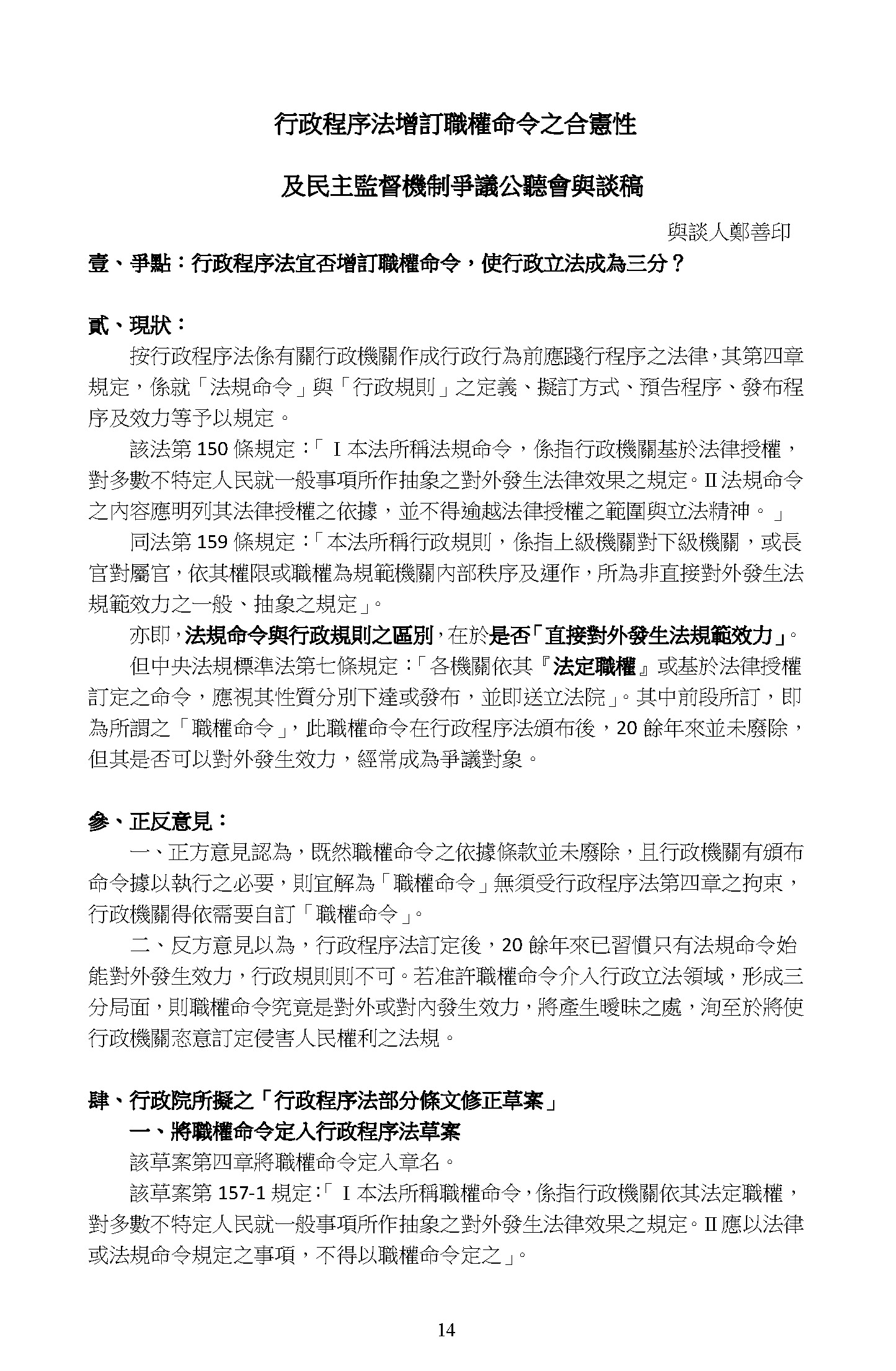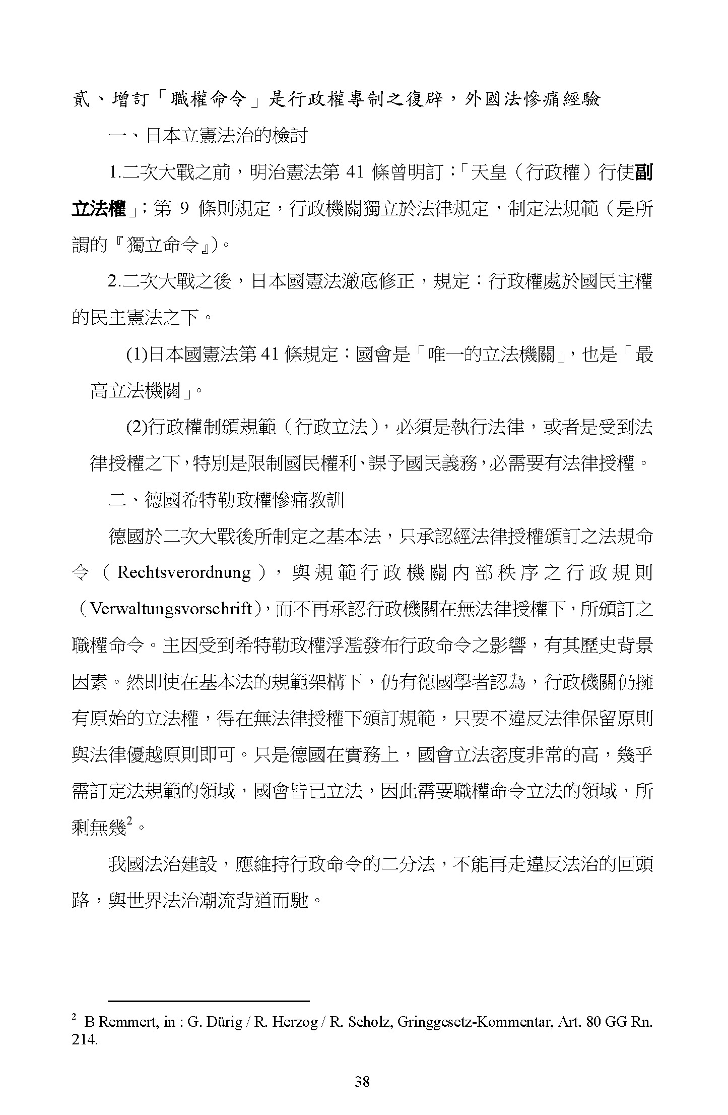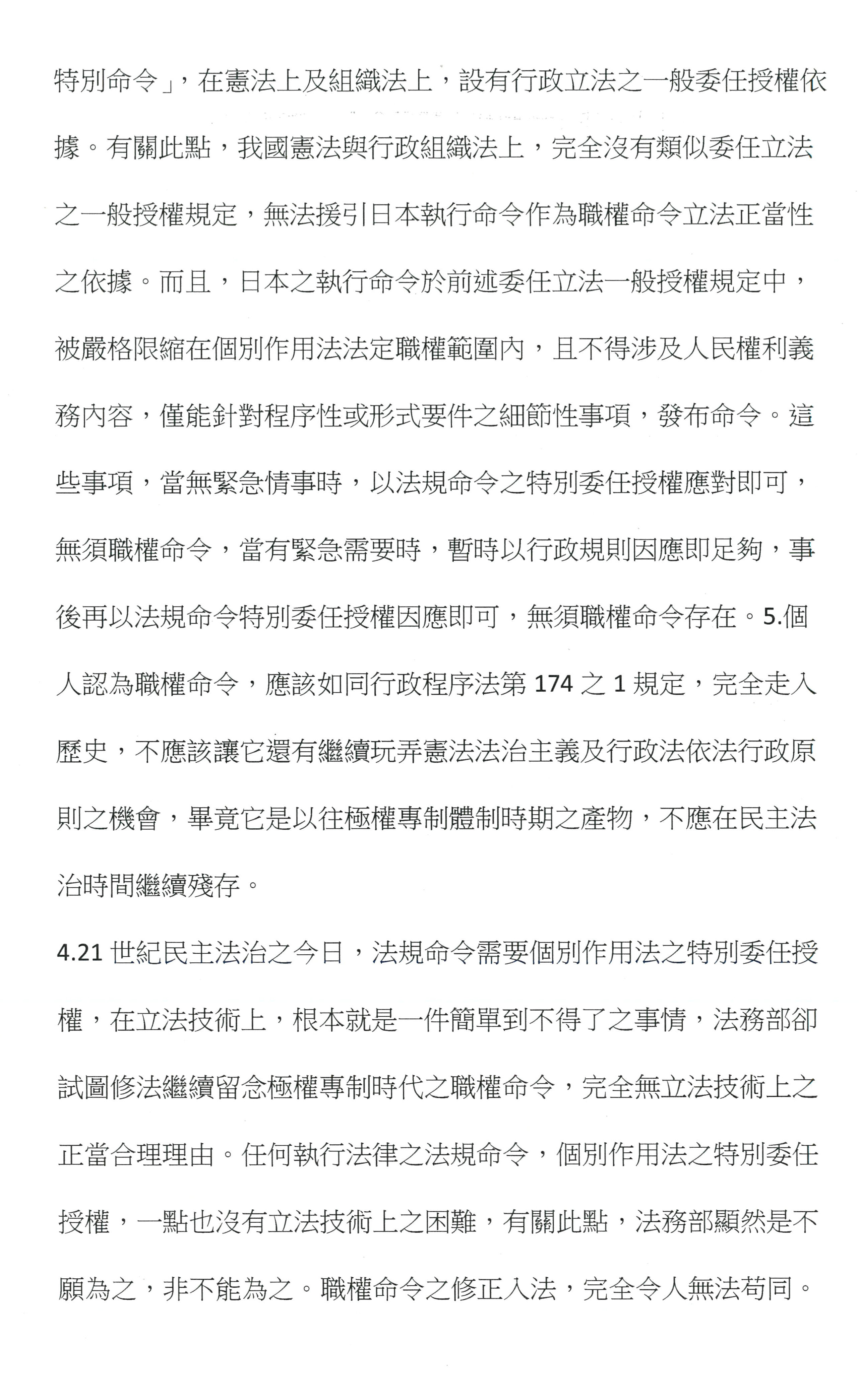 在我今天所附的書面資料裡面,最後的結論還要再修改一下。我今天除了發表個人的意見之外,我的結論還沒說完。陳春生前大法官提到:第一,行政程序法第一百七十四條之一的立法理由就是要確保命令二元化,這是他的書面理由,我可以給各位;第二,他認為行政院這次修法把第570號解釋作為修法的背書,完全是誤解了第570號解釋,用第570號解釋作為職權命令的依據理由是陷大法官於不義(因為第570號解釋是陳春生前大法官參與的),所以在概念上完全沒有必要訂職權命令。就像德國原來很多職權命令都是立法機關逼著行政機關趕快提出法案、取得授權,以此受到國會的監督。