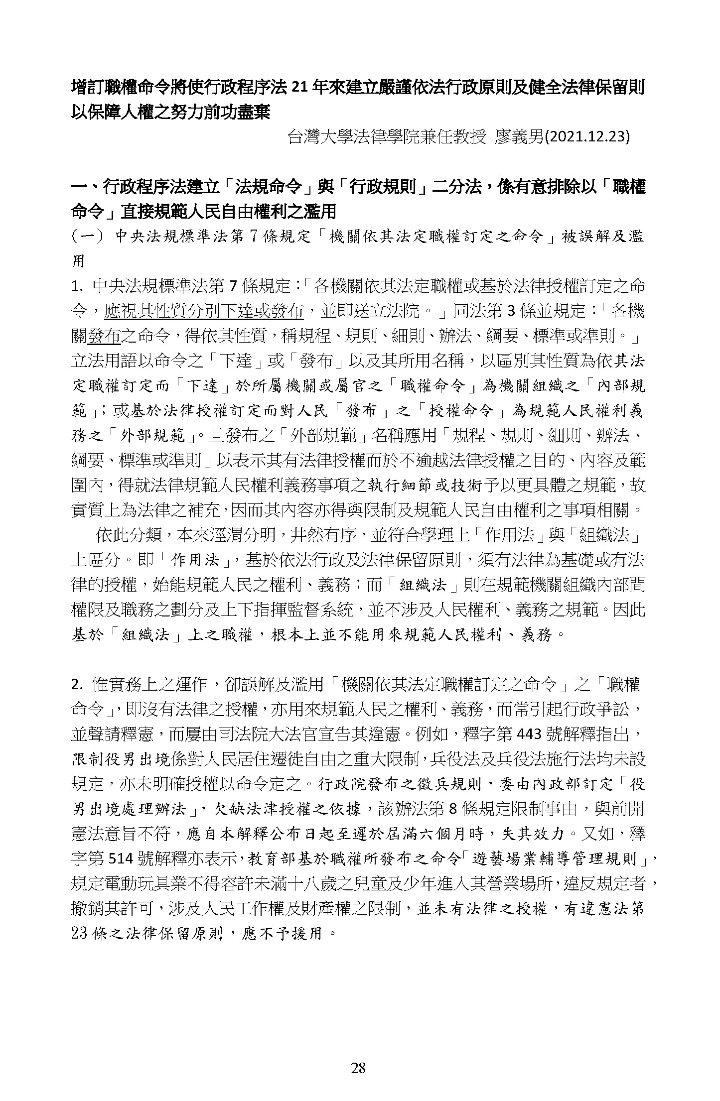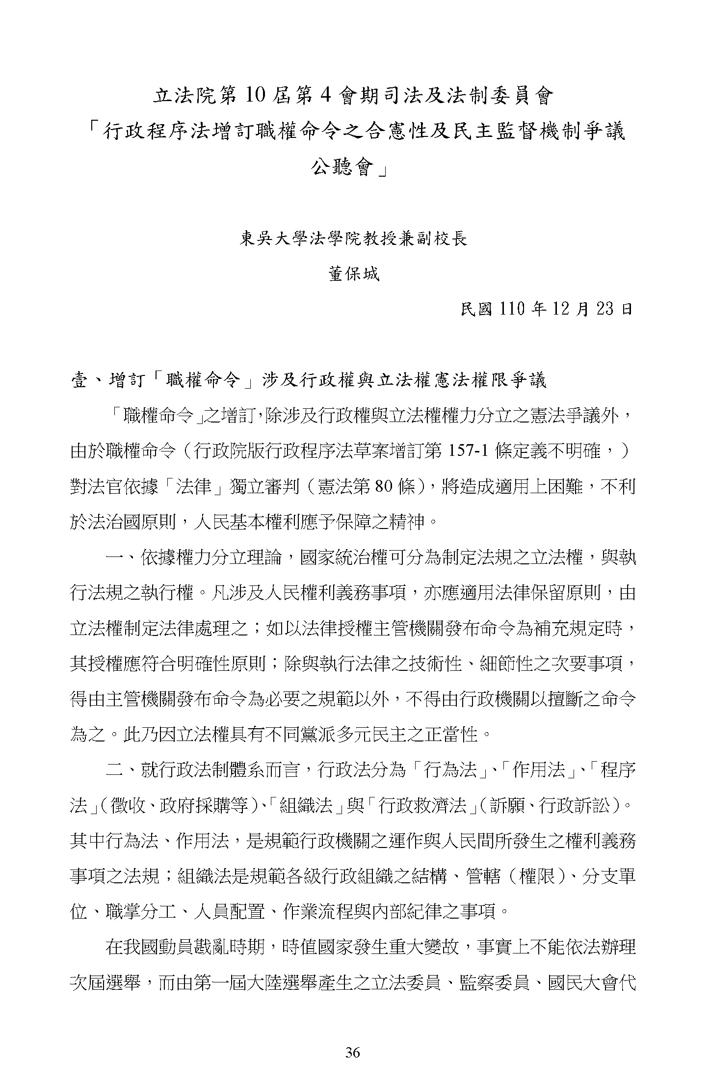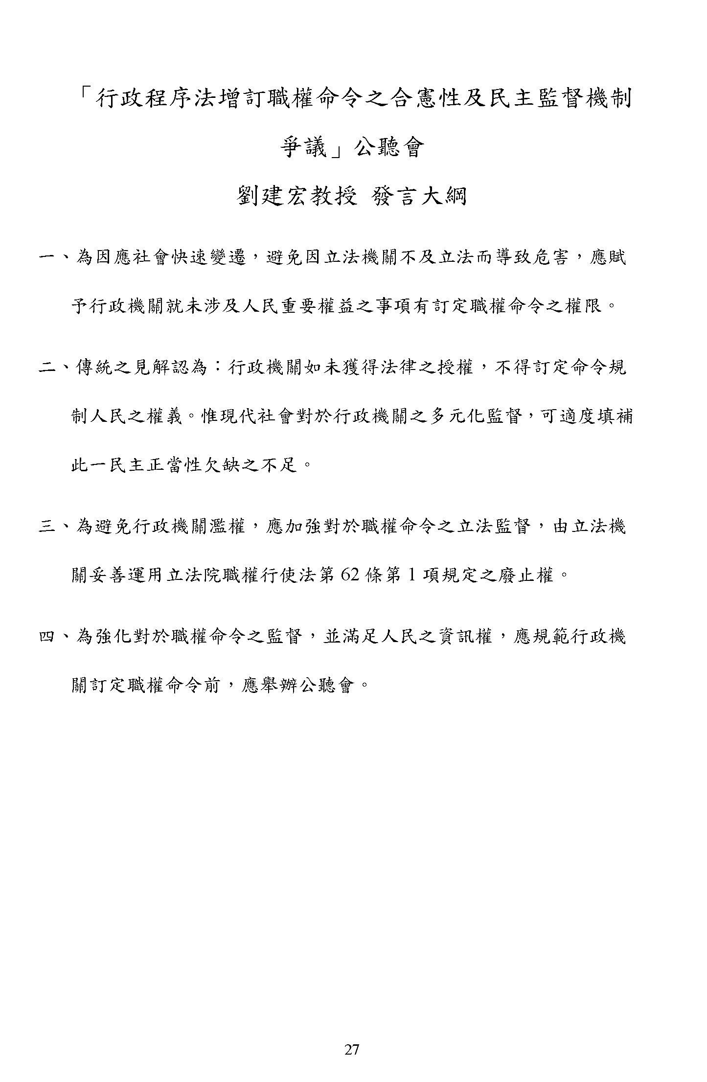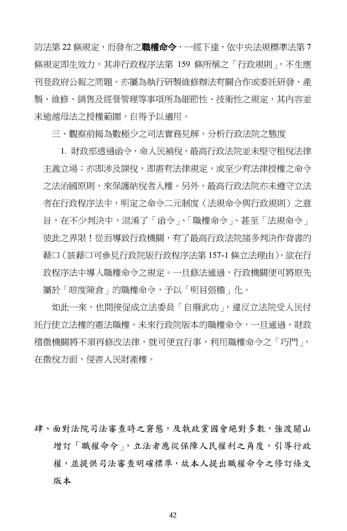 在我今天所附的書面資料裡面,最後的結論還要再修改一下。我今天除了發表個人的意見之外,我的結論還沒說完。陳春生前大法官提到:第一,行政程序法第一百七十四條之一的立法理由就是要確保命令二元化,這是他的書面理由,我可以給各位;第二,他認為行政院這次修法把第570號解釋作為修法的背書,完全是誤解了第570號解釋,用第570號解釋作為職權命令的依據理由是陷大法官於不義(因為第570號解釋是陳春生前大法官參與的),所以在概念上完全沒有必要訂職權命令。就像德國原來很多職權命令都是立法機關逼著行政機關趕快提出法案、取得授權,以此受到國會的監督。