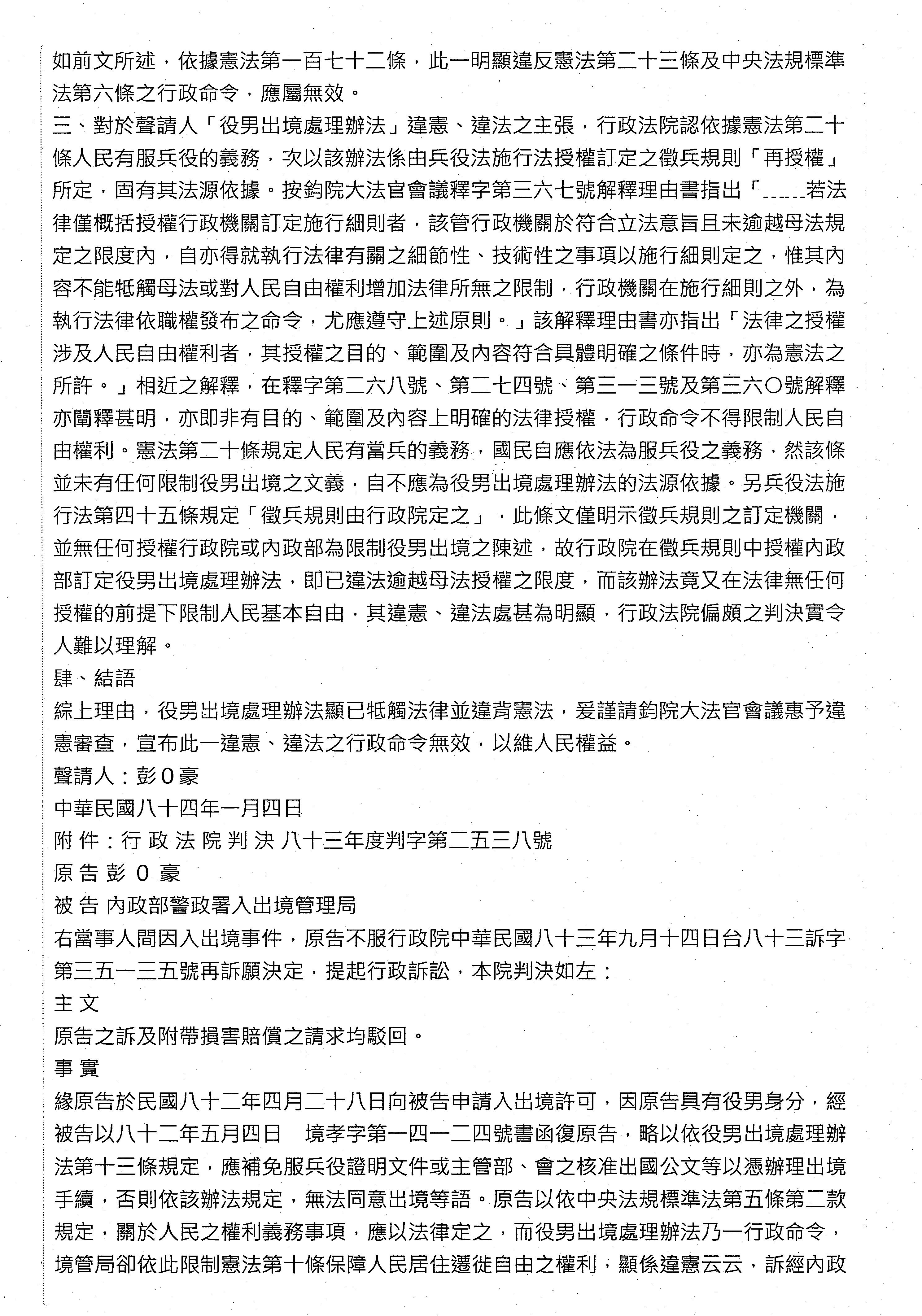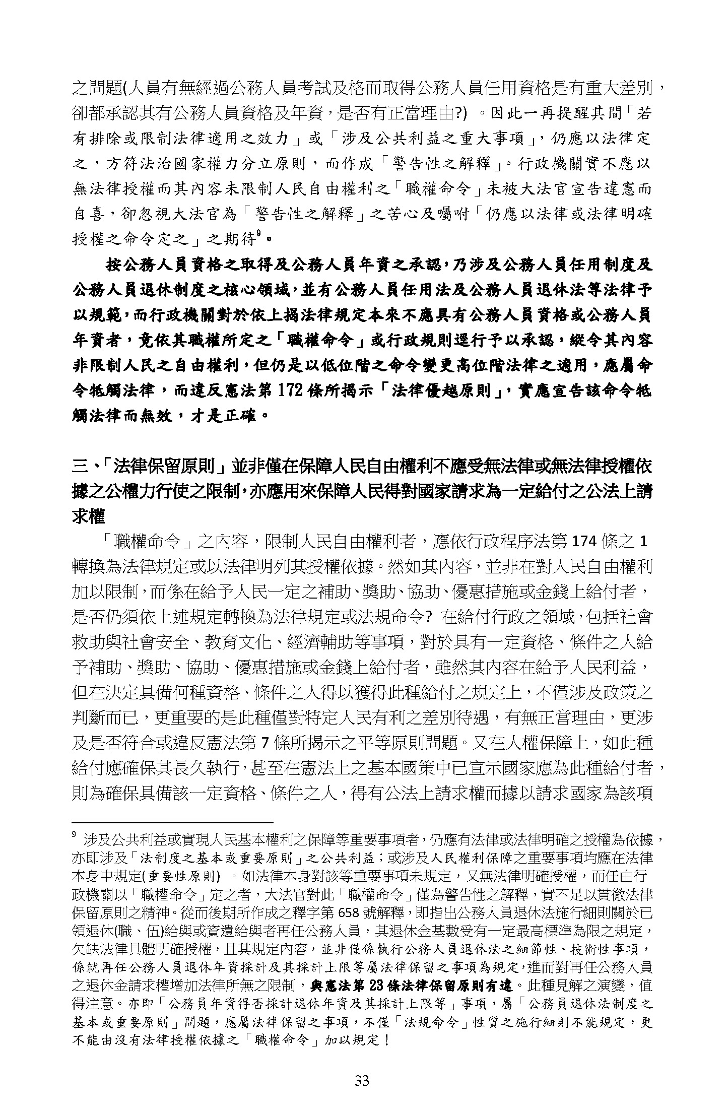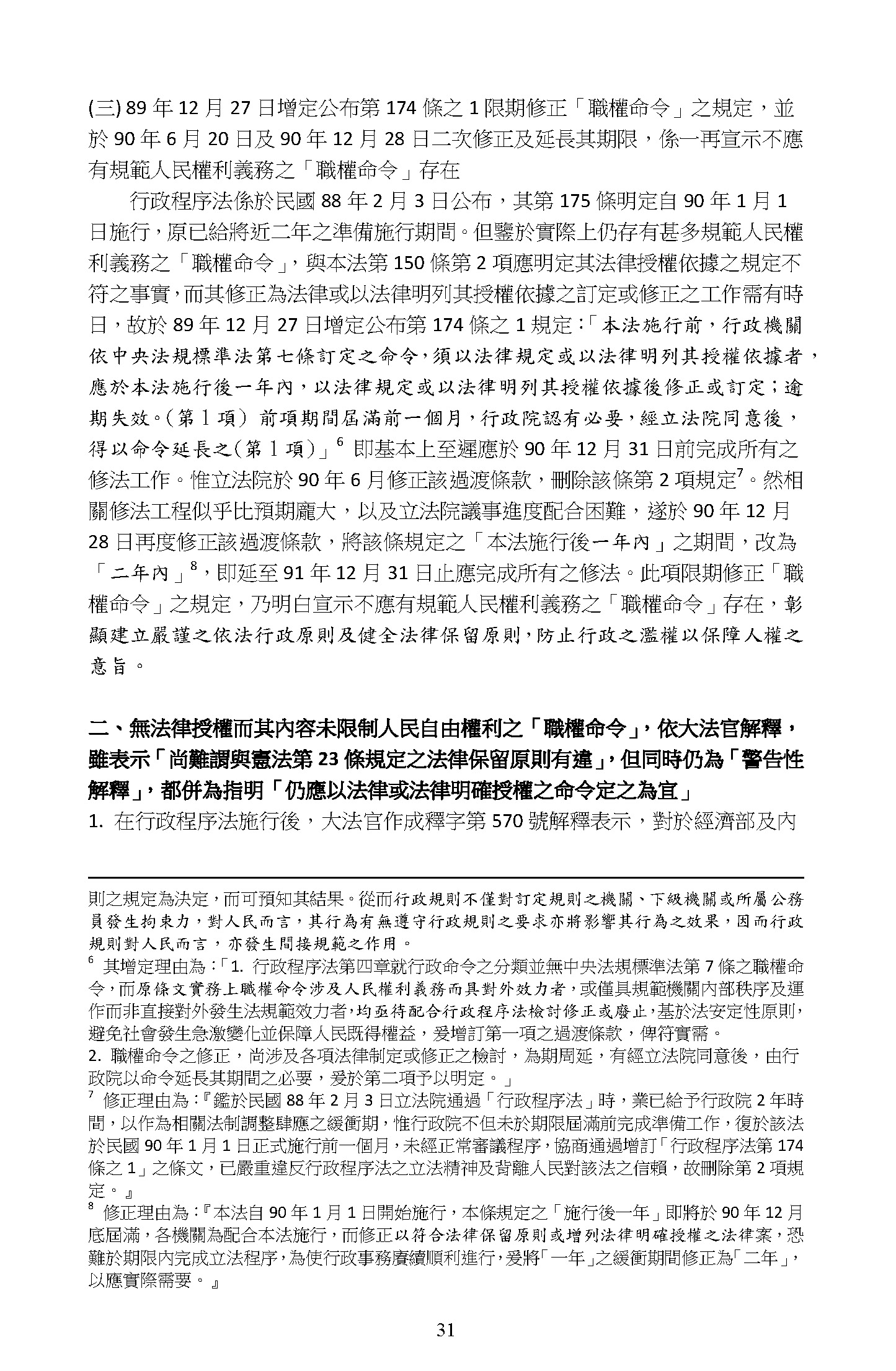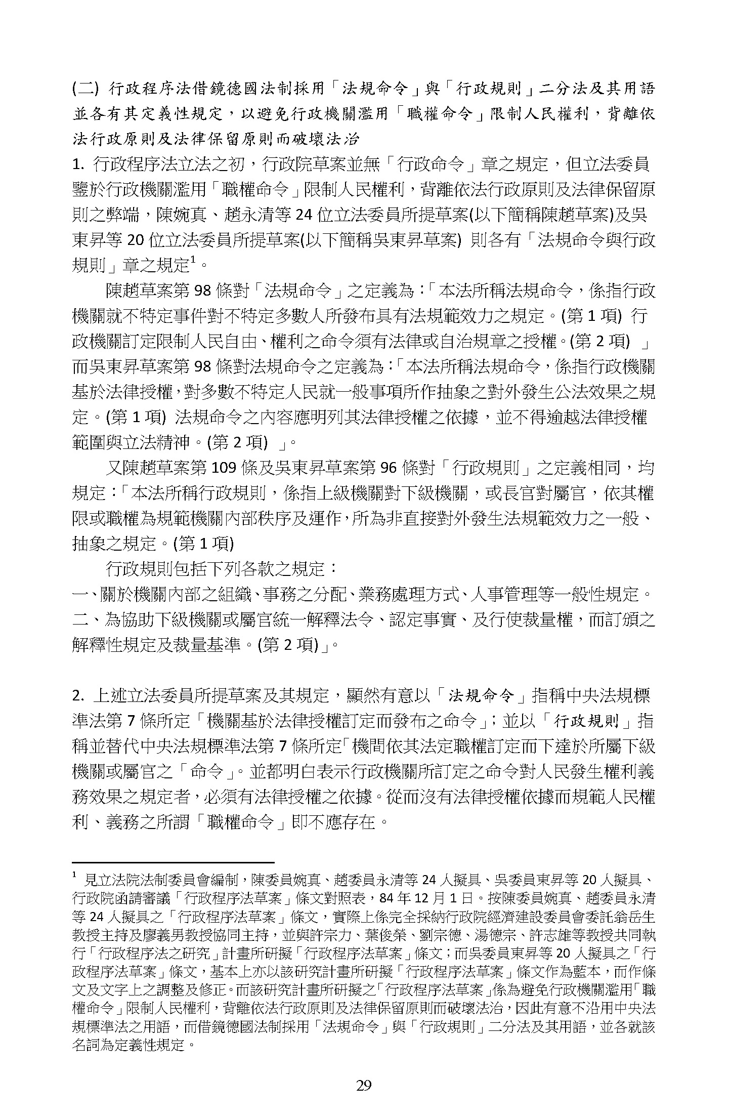 在我今天所附的書面資料裡面,最後的結論還要再修改一下。我今天除了發表個人的意見之外,我的結論還沒說完。陳春生前大法官提到:第一,行政程序法第一百七十四條之一的立法理由就是要確保命令二元化,這是他的書面理由,我可以給各位;第二,他認為行政院這次修法把第570號解釋作為修法的背書,完全是誤解了第570號解釋,用第570號解釋作為職權命令的依據理由是陷大法官於不義(因為第570號解釋是陳春生前大法官參與的),所以在概念上完全沒有必要訂職權命令。就像德國原來很多職權命令都是立法機關逼著行政機關趕快提出法案、取得授權,以此受到國會的監督。